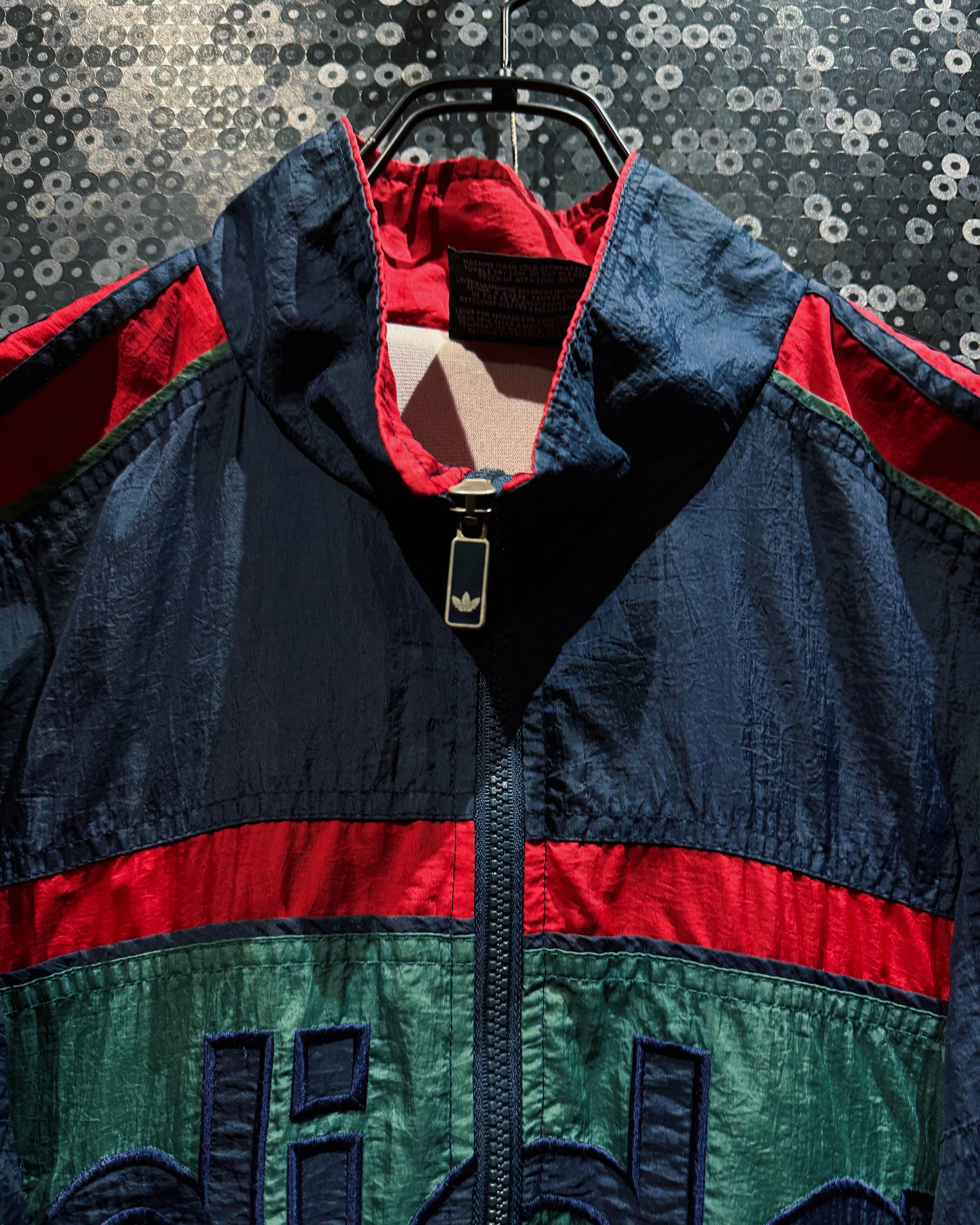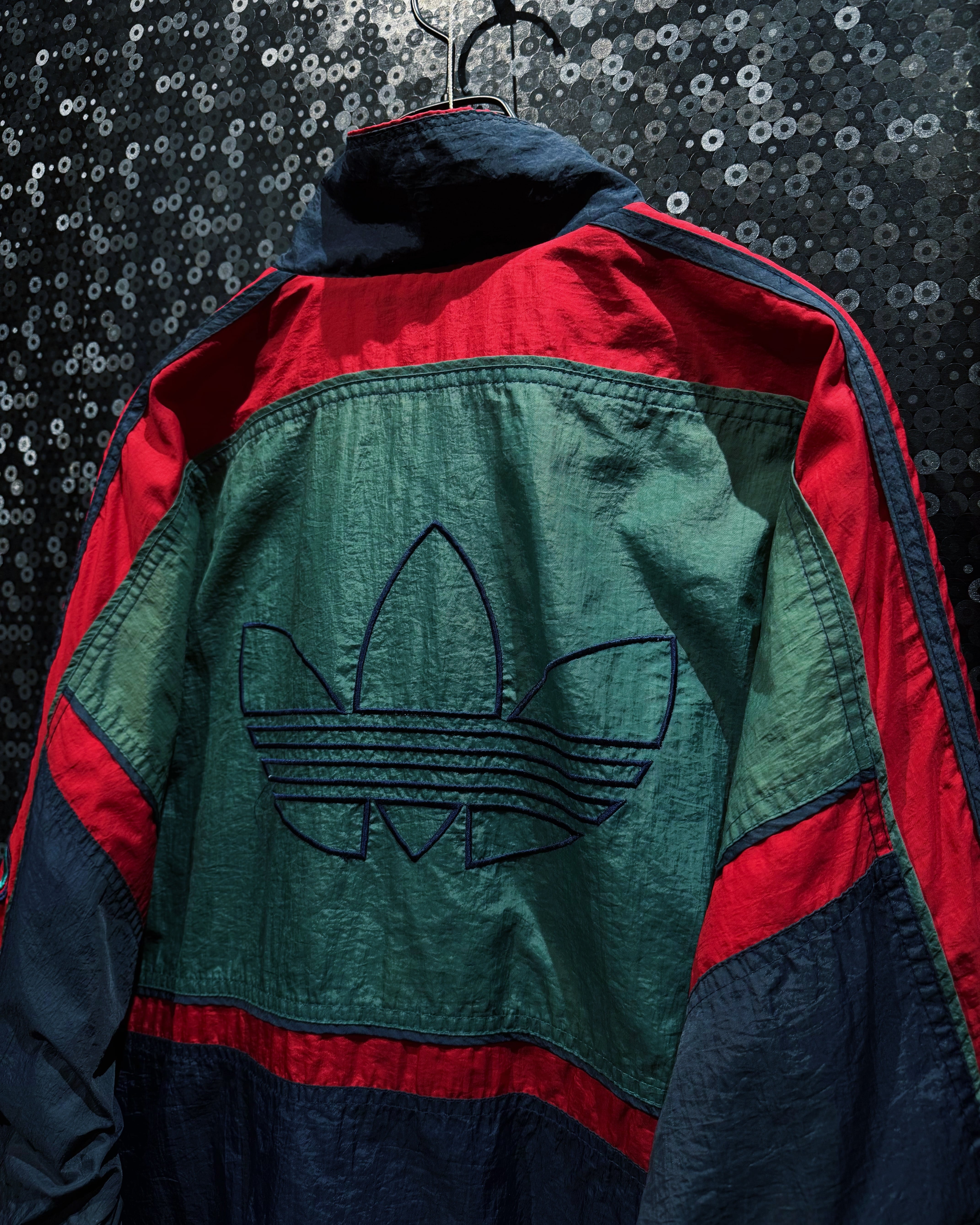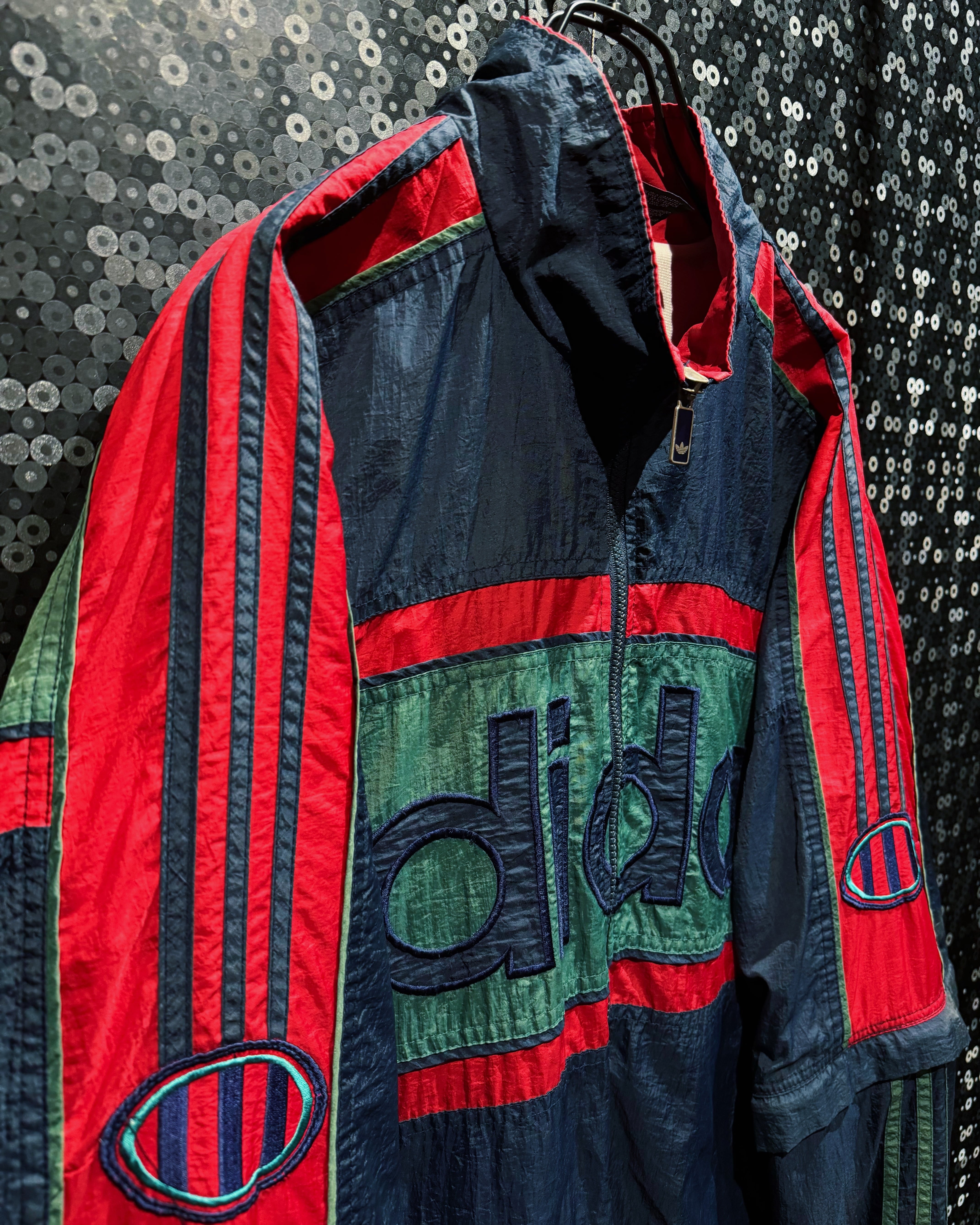 ネイビーを土台に、レッド×ダークグリーンの大胆なパネル切替を叩き込んだ、90sアディダスオリジナルスの中でも圧倒的インパクトを誇る“オーバーサイズロゴ仕様”のヴィンテージナイロンジャケット。胸には巨大な“adidas”刺繍が横断し、袖には同色の3ストライプと楕円ワッペン、背面には特大トレフォイル刺繍がドンと入る、まさに“90年代アディダスの暴れ馬”のような圧のあるデザインが魅力。
