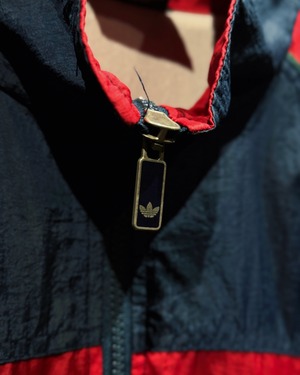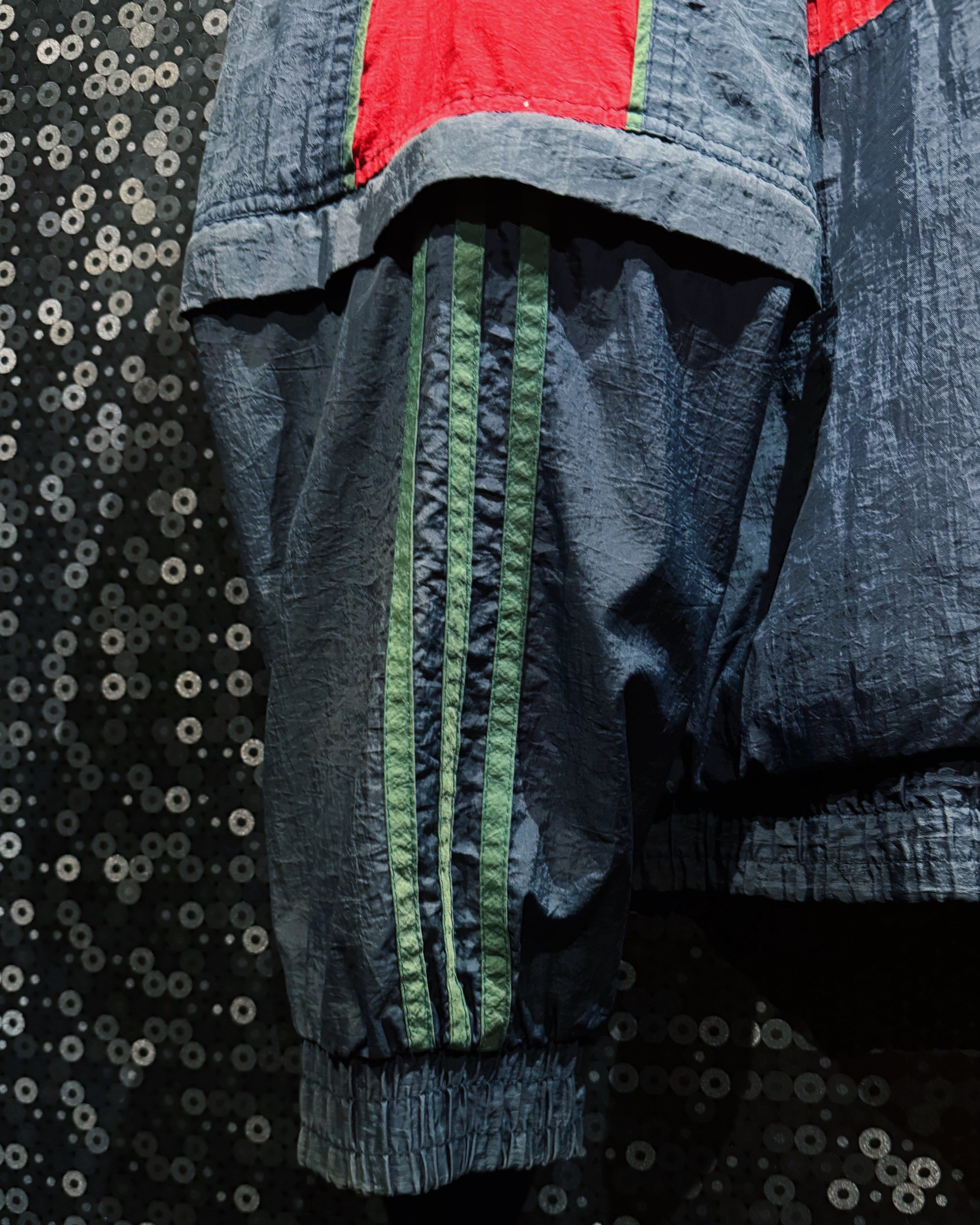 フロント・バックともに巨大ロゴを採用するモデルは現存数が極めて少なく、特にこのネイビー×レッド×グリーンのヨーロッパ系カラーリングは、EU製アディダスの中でも人気の高い配色。袖の立体的なシェブロンステッチや太めの3ラインが腕に沿って落ちることで、着た時のシルエットにも存在感が宿る一本。