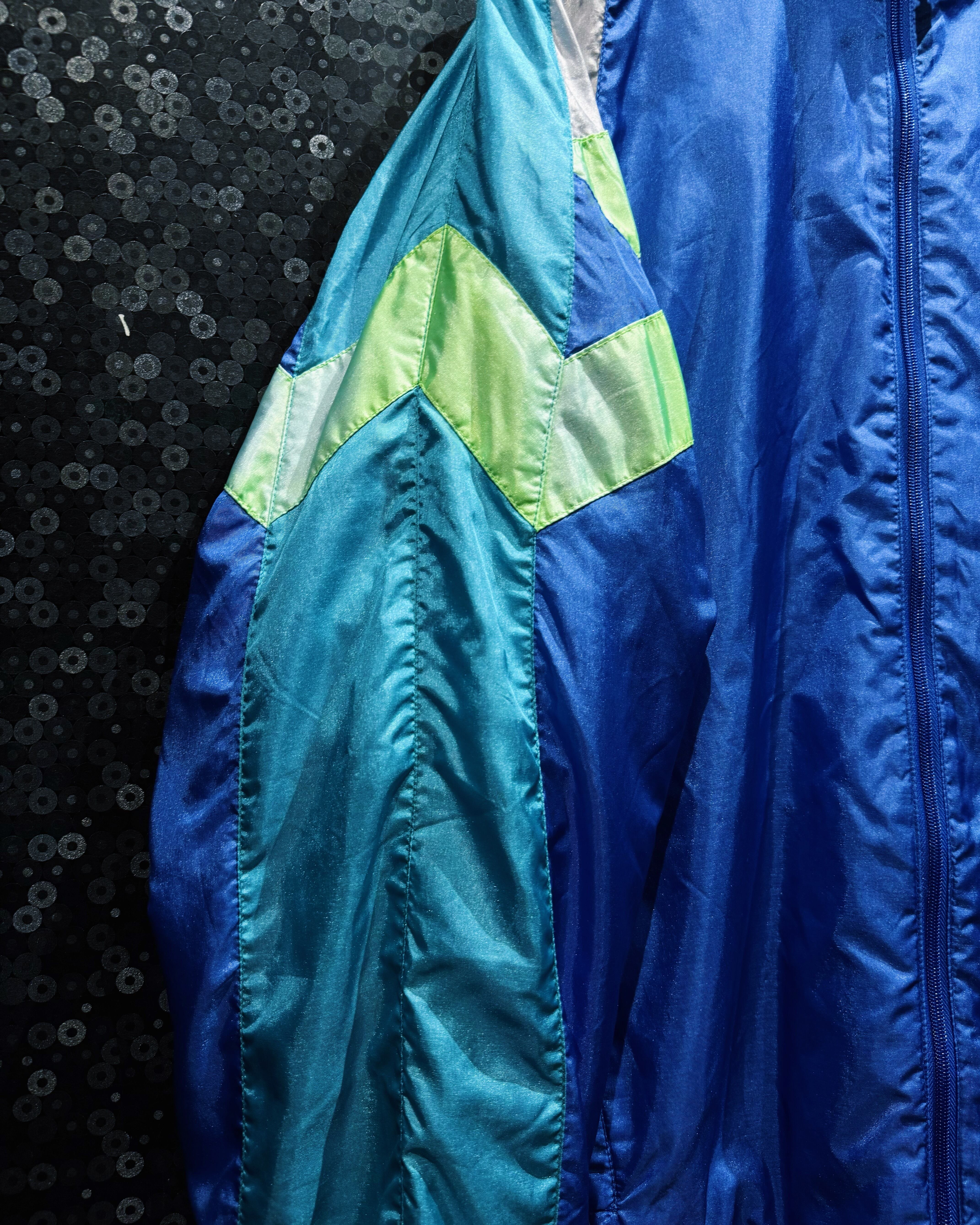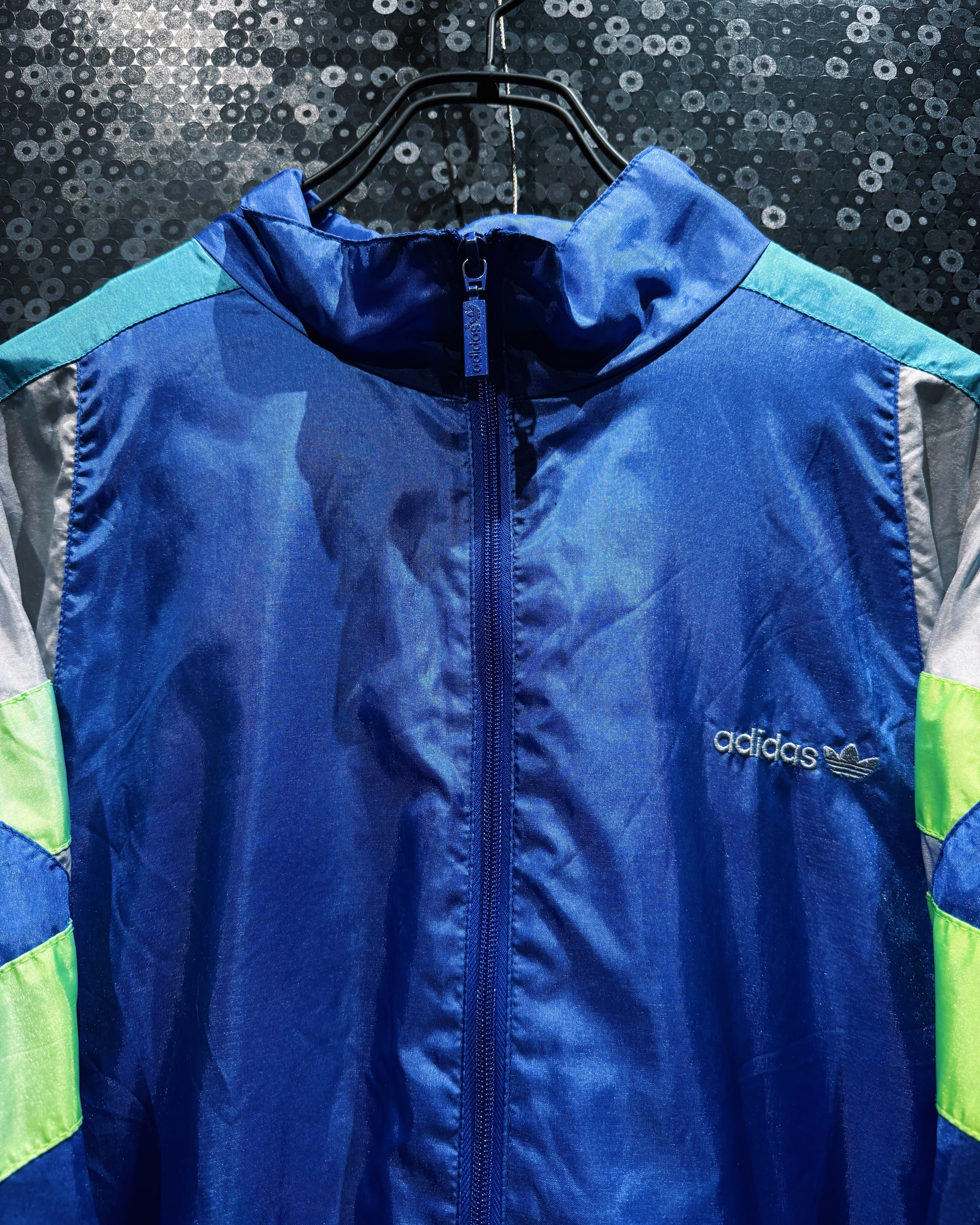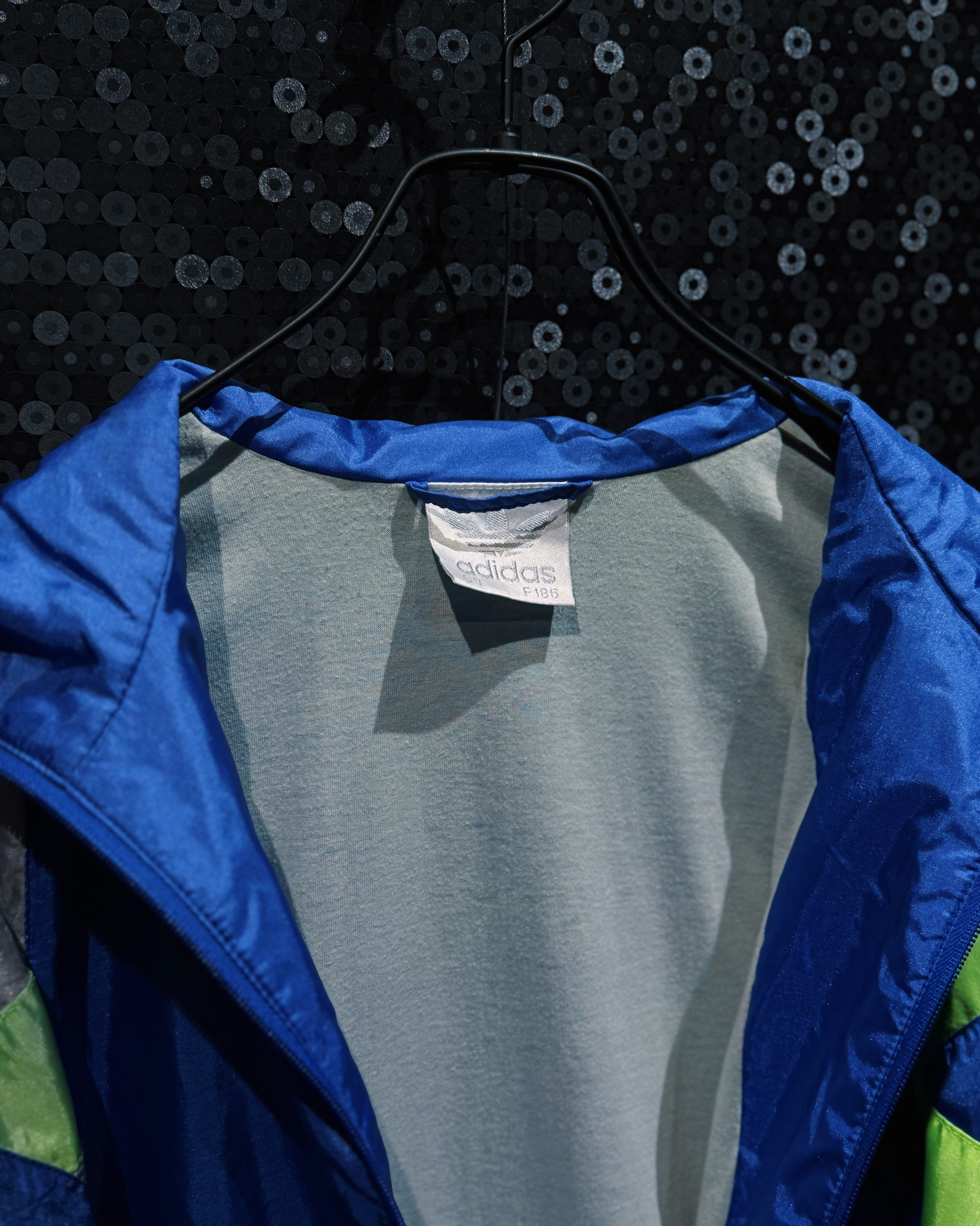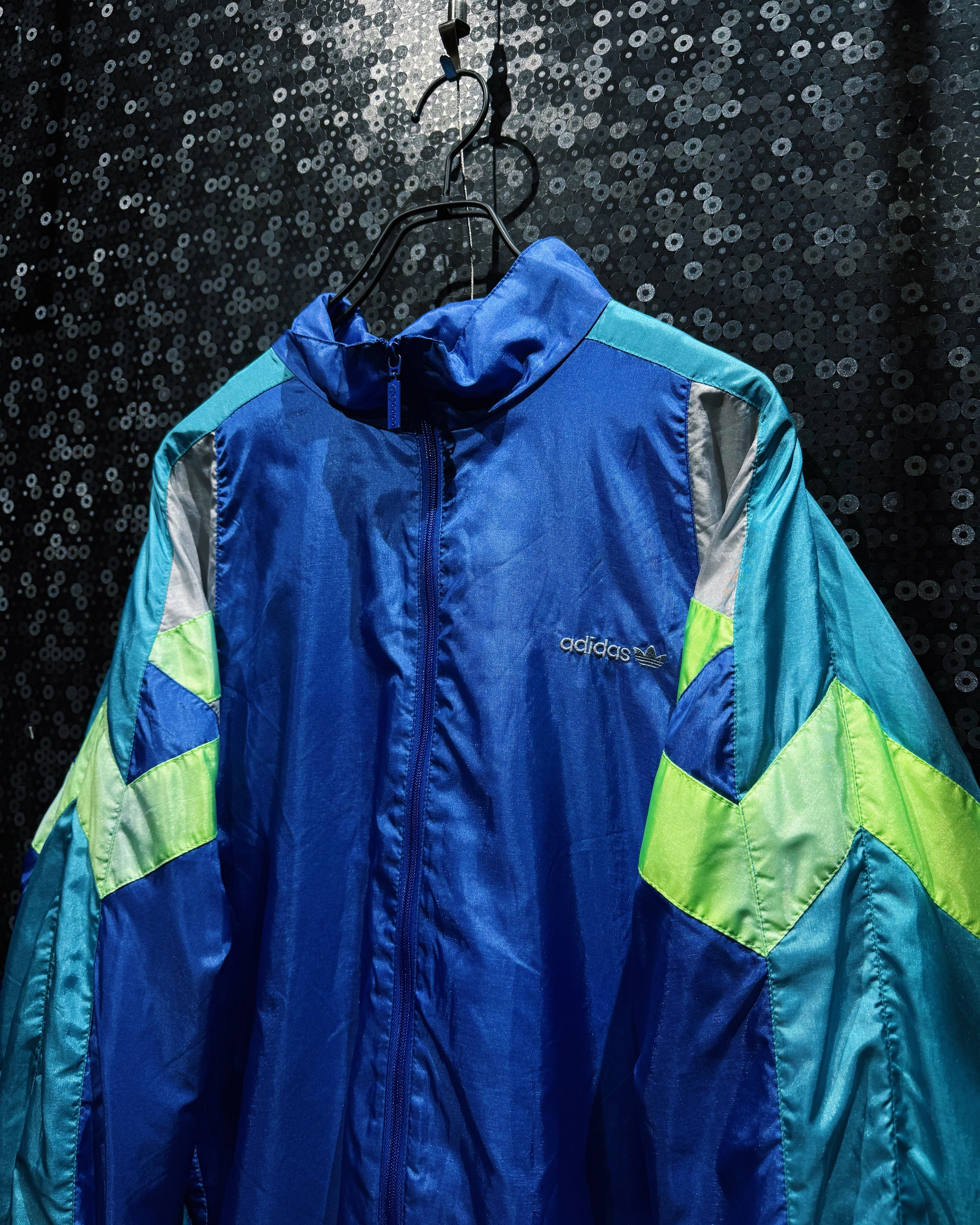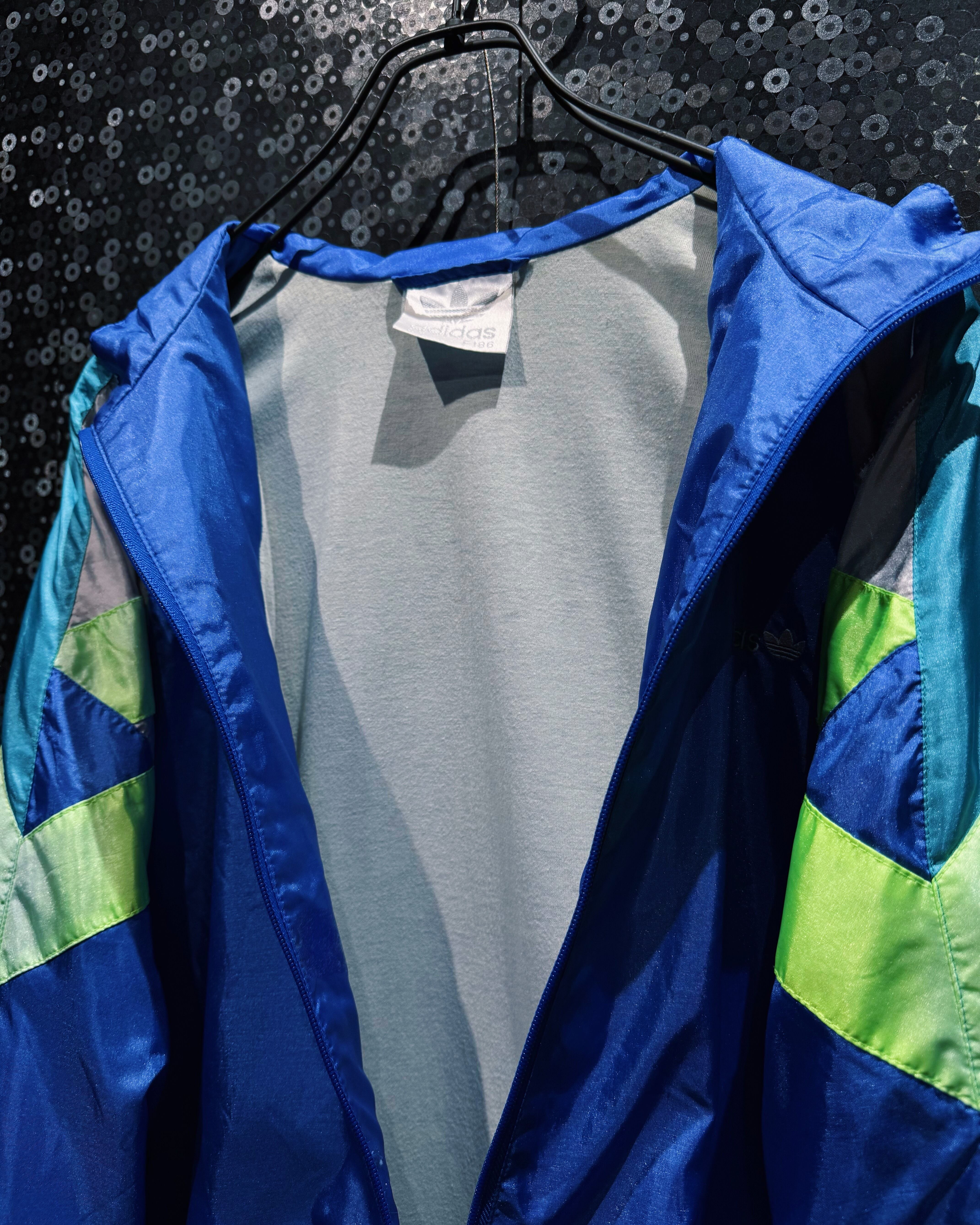 鮮やかなロイヤルブルーをベースに、ターコイズ・ライムグリーン・シルバーを大胆に切り替えた、90年代アディダスオリジナルス特有の“光るような配色”が魅力のヴィンテージナイロンジャケット。胸にはシルバーのトレフォイル刺繍、袖には大きなシェブロン(矢印)状のパネル切替が走り、見る角度によって色が跳ねるようなレトロスポーツの空気が全開に宿っている。