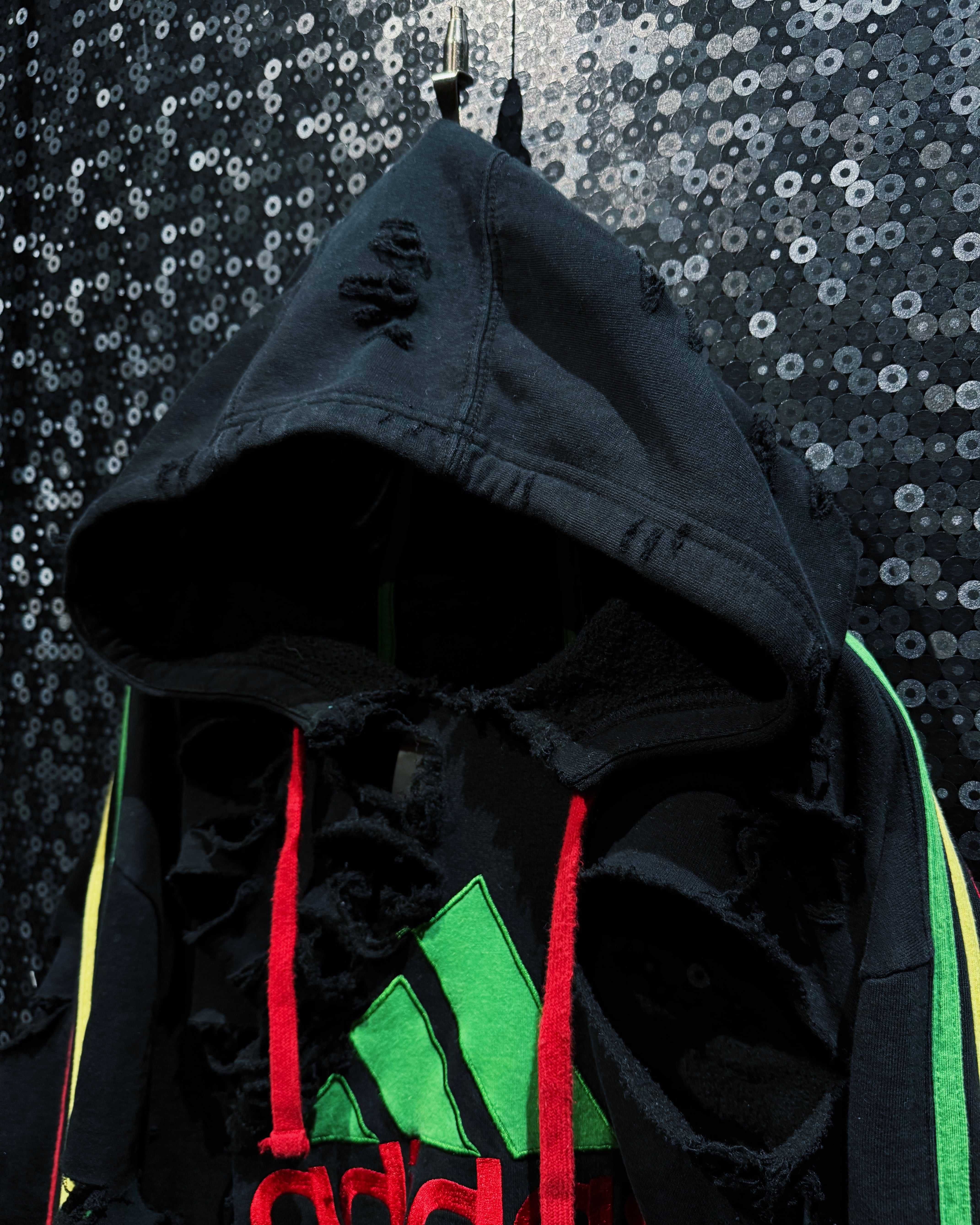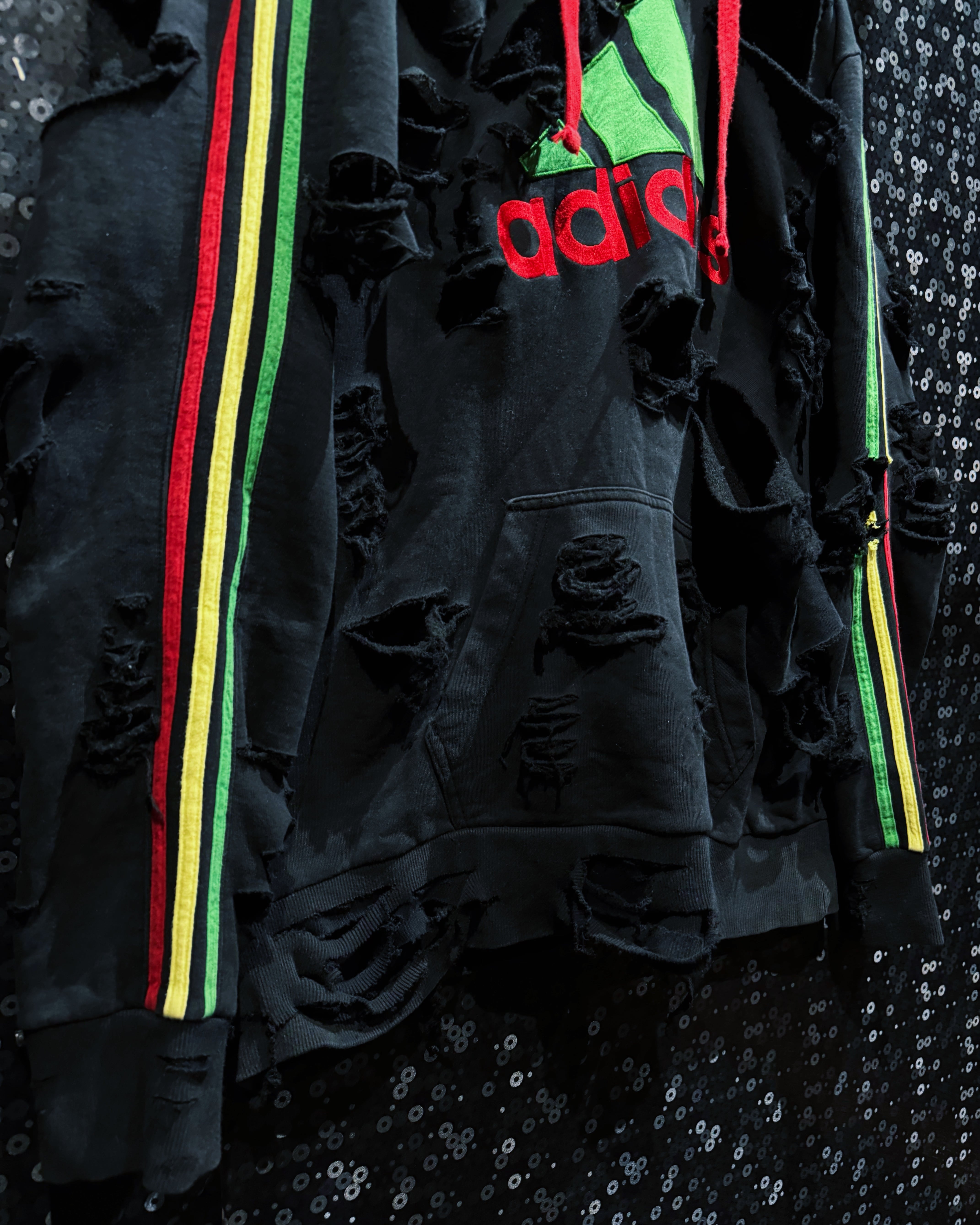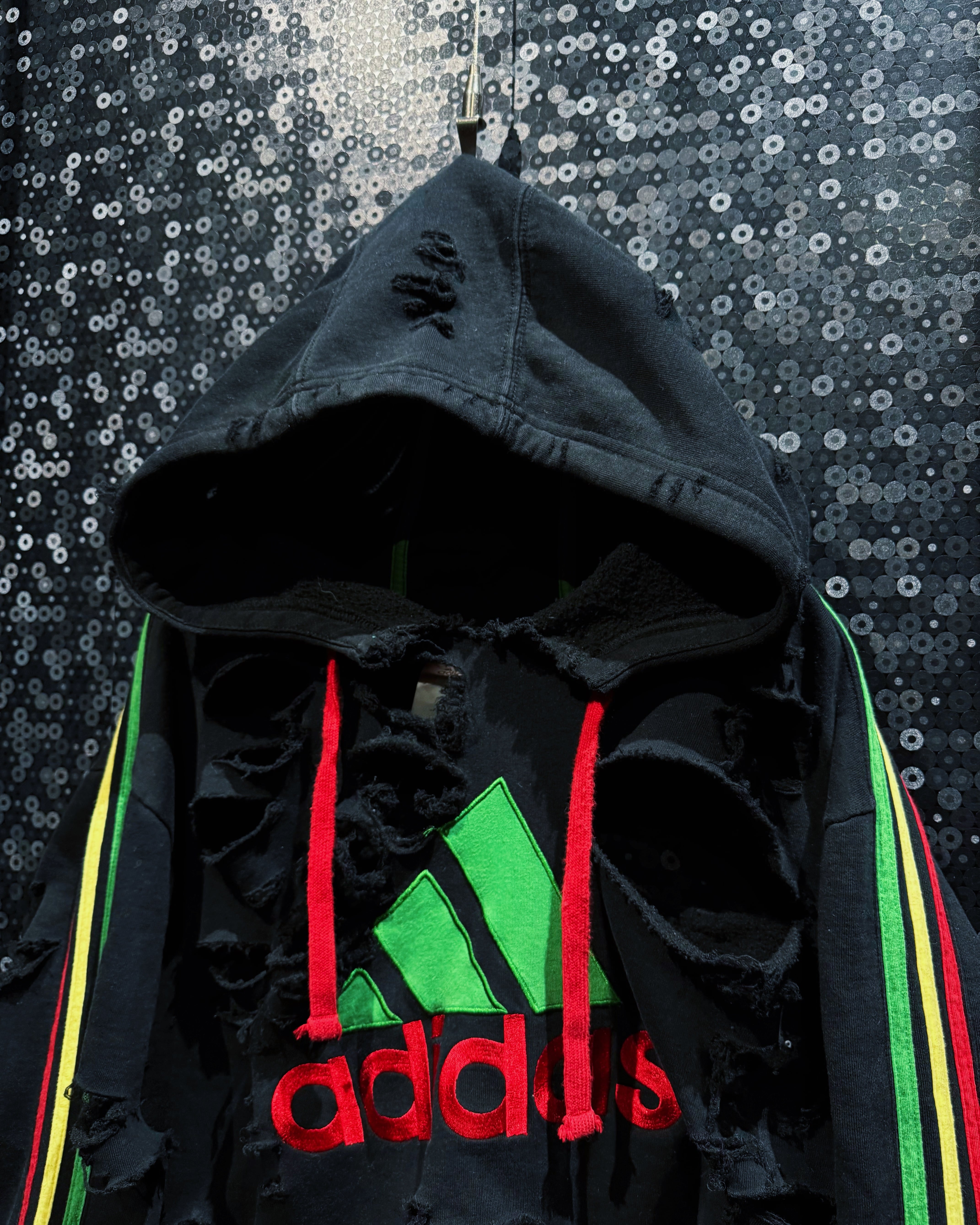 フロントの太刺繍ロゴ、赤いドローコード、深く作り込んだクラッシュホールの質感まで、すべてが一点物仕様。アディダスのパフォーマンスアイコンとラスタカラーを掛け合わせたレアすぎるリメイクフーディーで、インパクト・個性・存在感すべてが段違いのスペシャル。