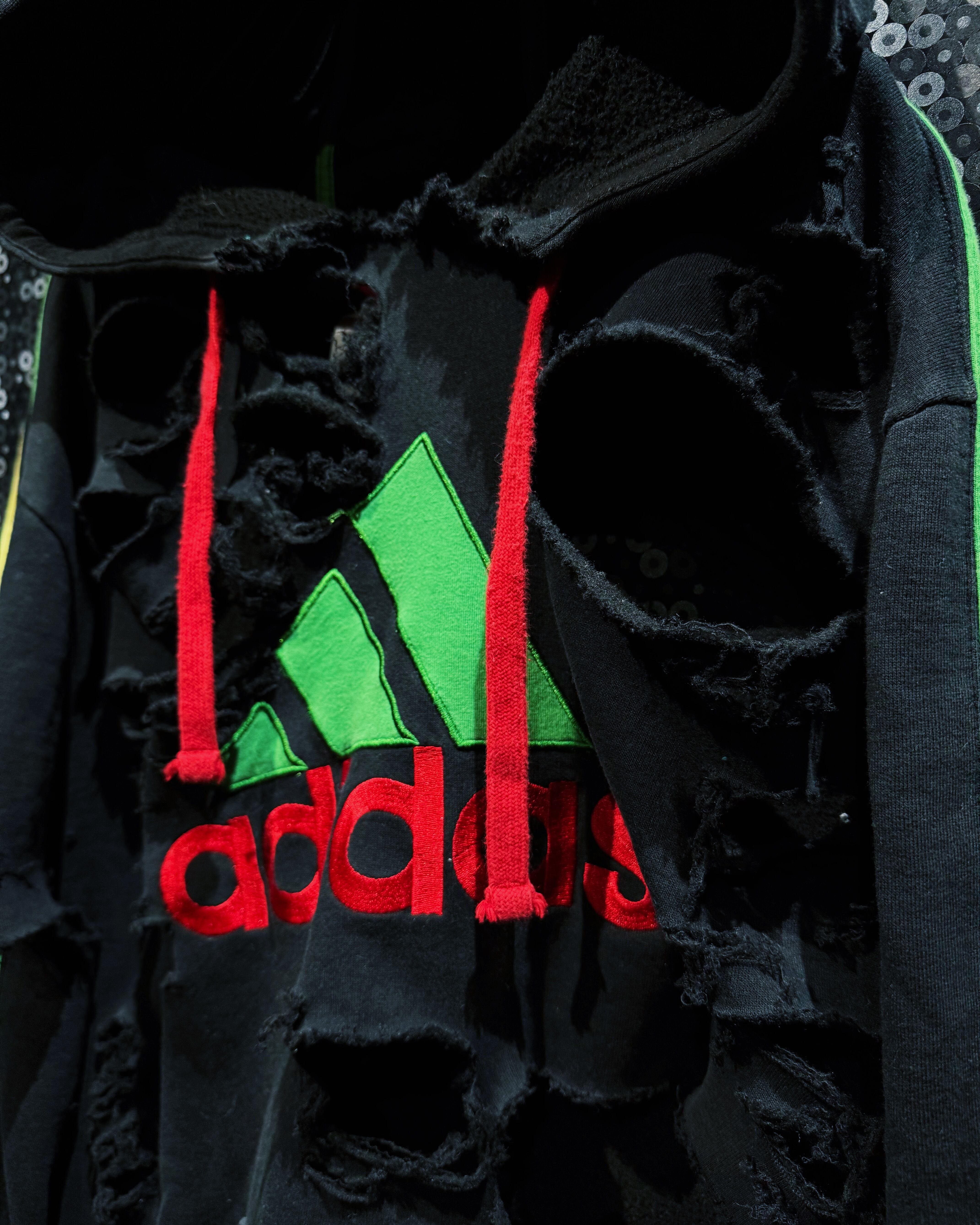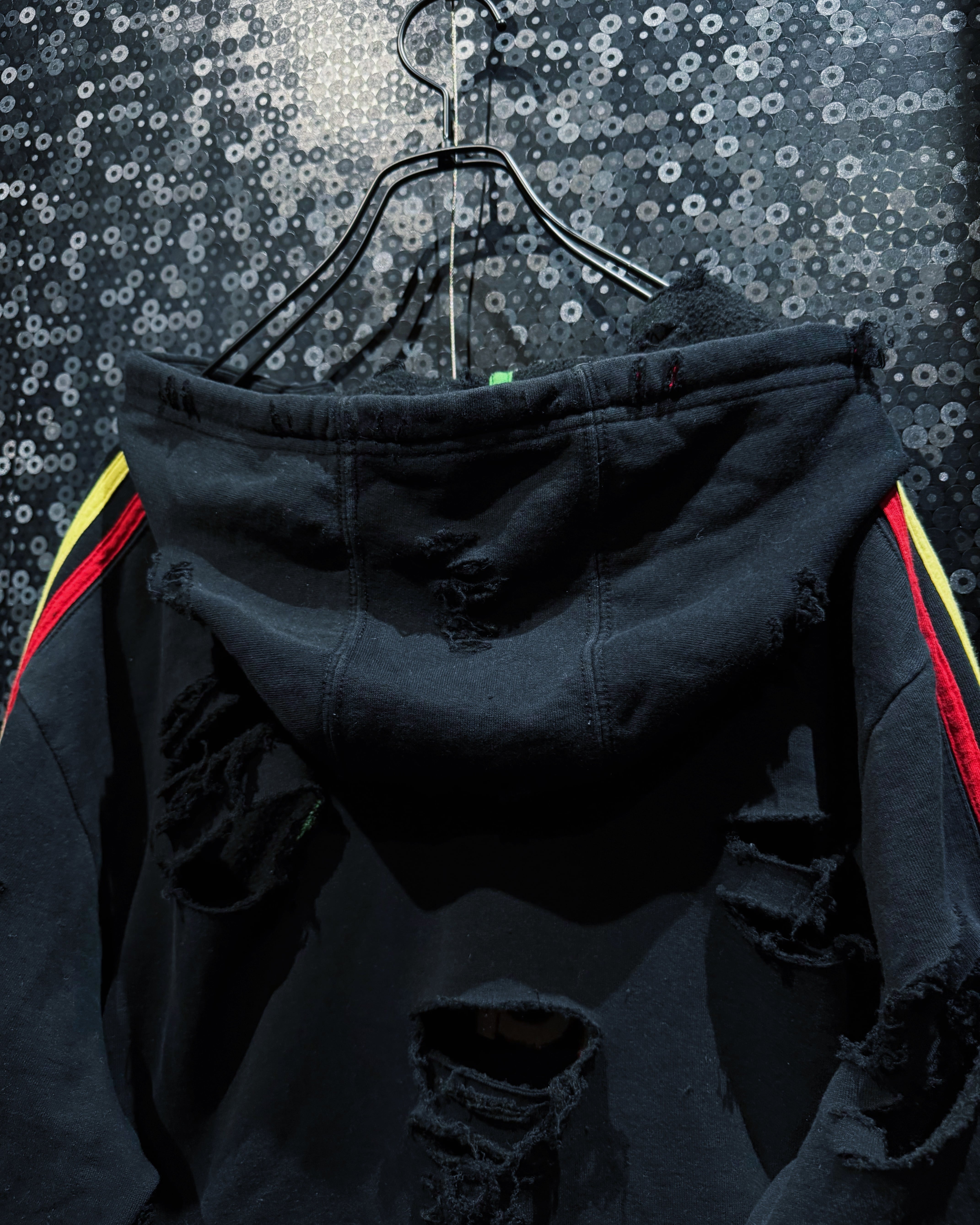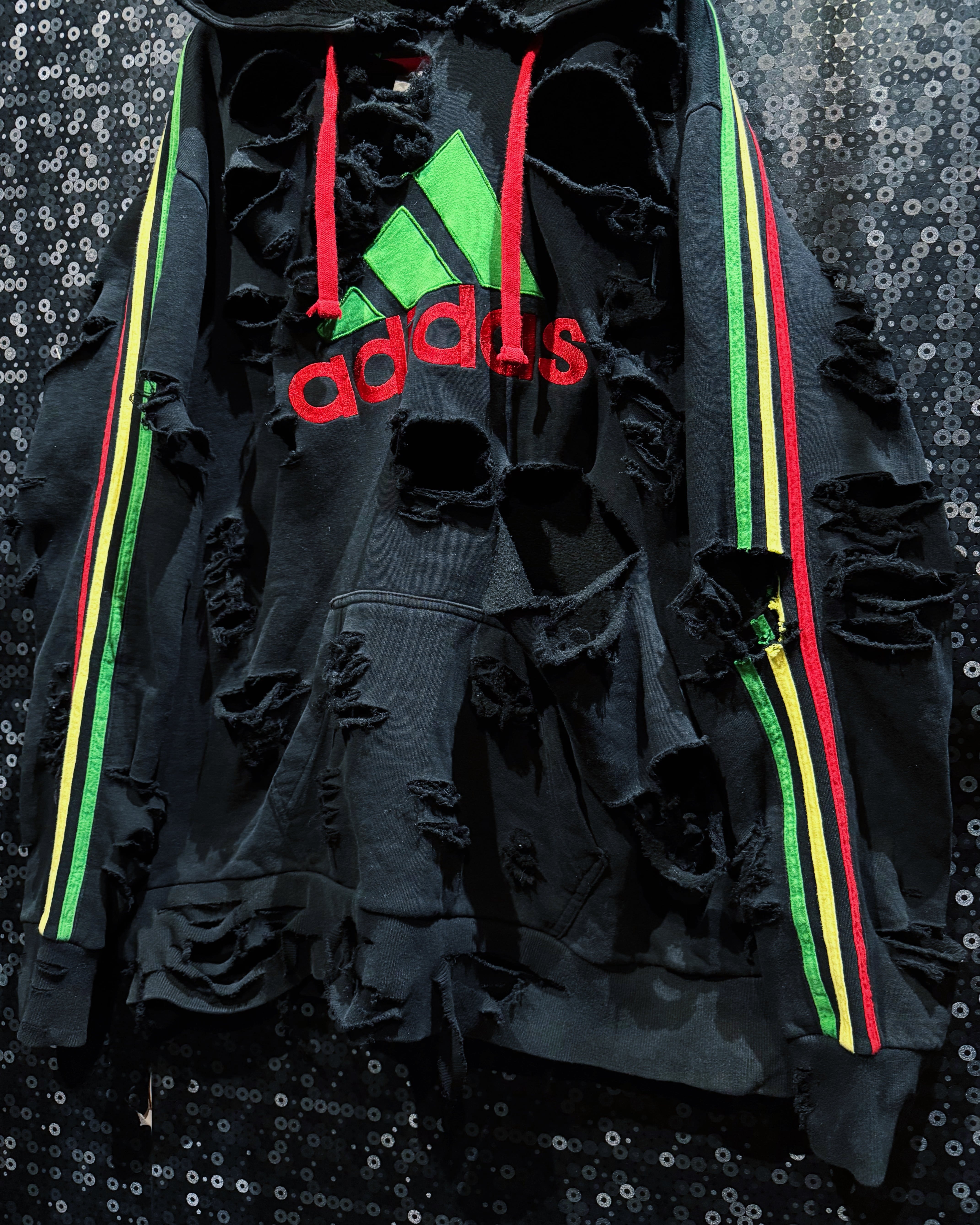 フロントの太刺繍ロゴ、赤いドローコード、深く作り込んだクラッシュホールの質感まで、すべてが一点物仕様。アディダスのパフォーマンスアイコンとラスタカラーを掛け合わせたレアすぎるリメイクフーディーで、インパクト・個性・存在感すべてが段違いのスペシャル。