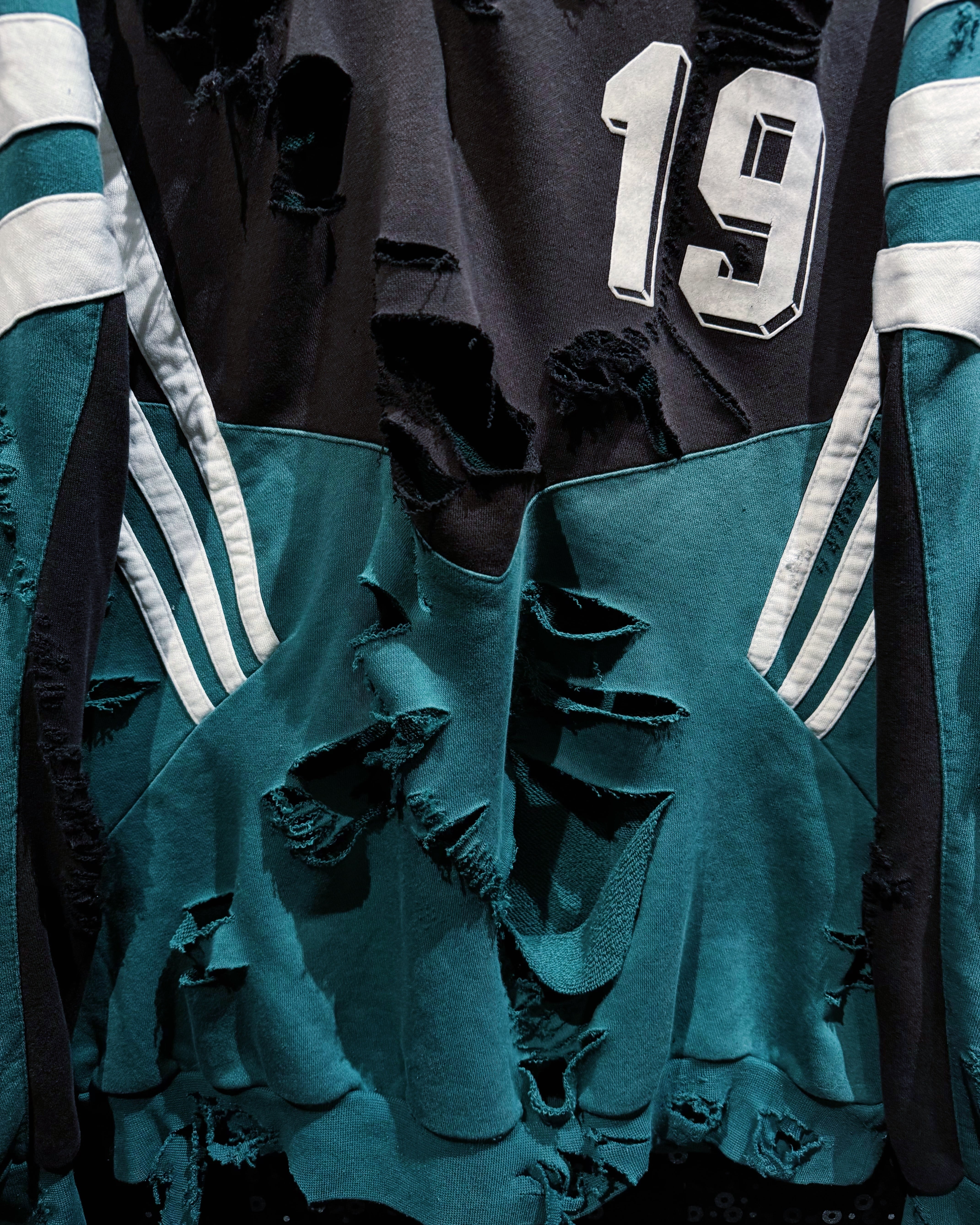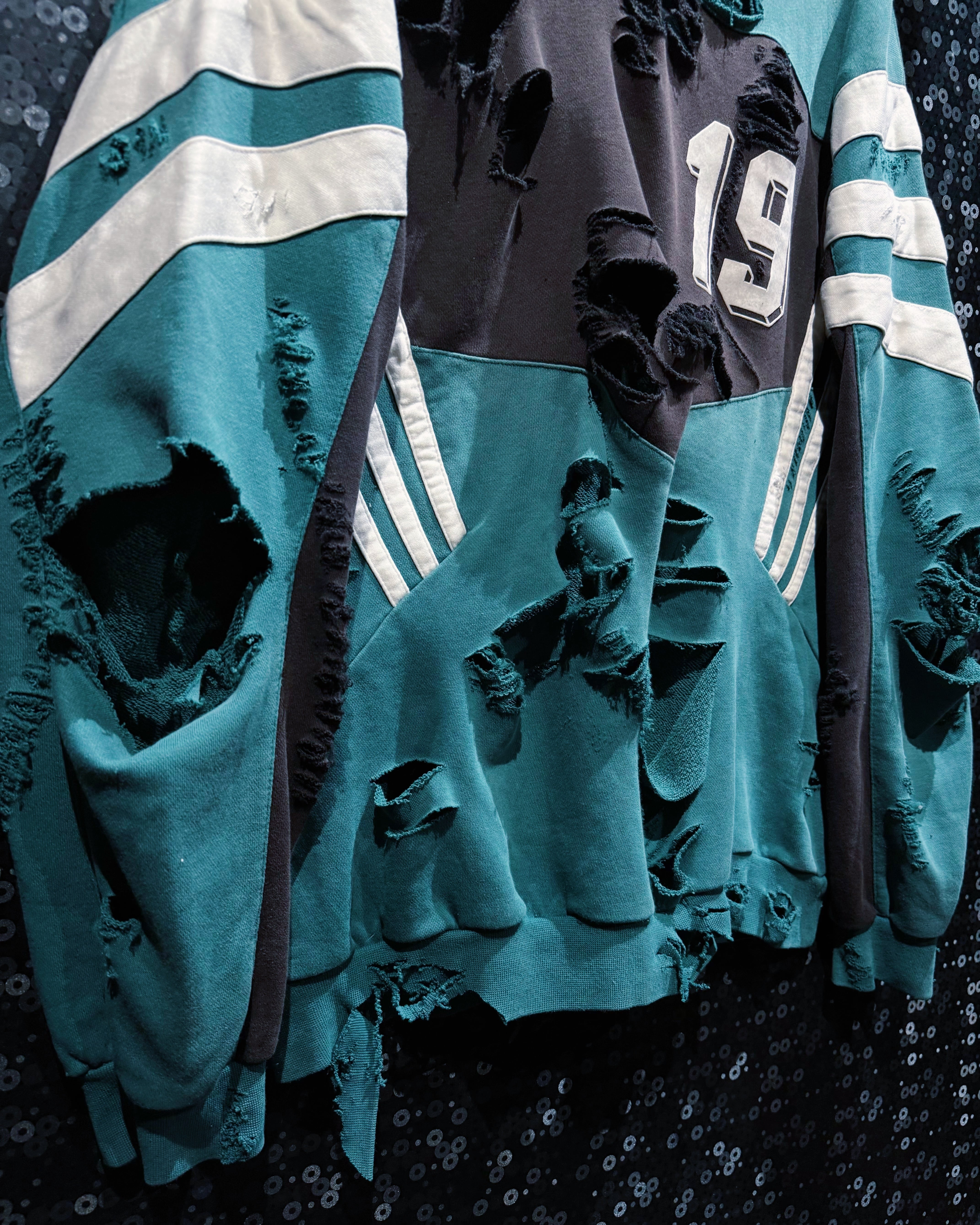 袖の3ラインを含め、切り替え部分と繋がるように配置されたダメージは完全にハンドメイド。ランダムに穴が空いているのではなく、動きや立体感が出るよう計算された“芸術的な崩し方”が特徴で、着るだけでシルエットに陰影が生まれるレベルの完成度。裾や袖のほつれや裂き加工もすべて一点物で、元のスポーツスウェットを完全に新しい表情へと変貌させている。