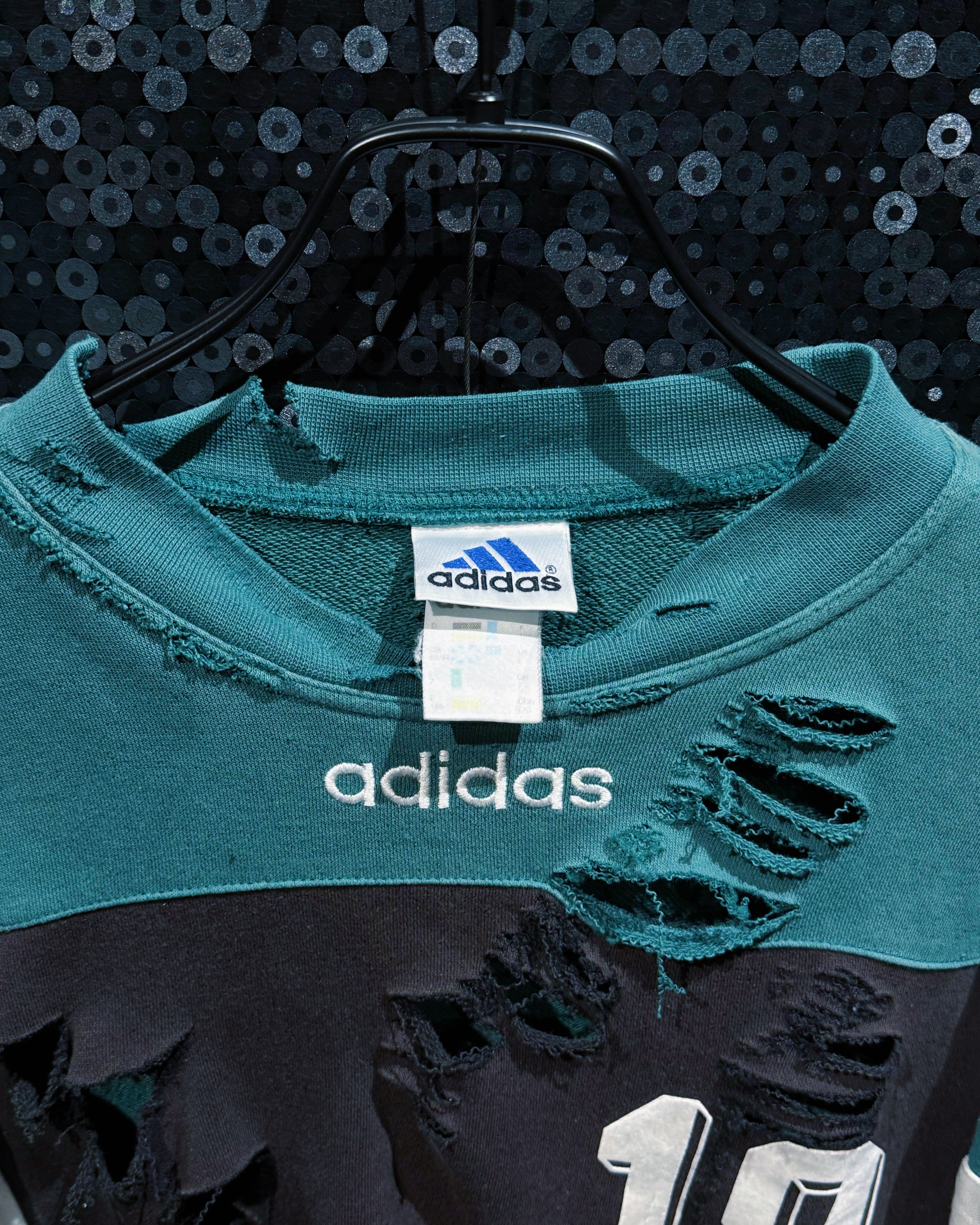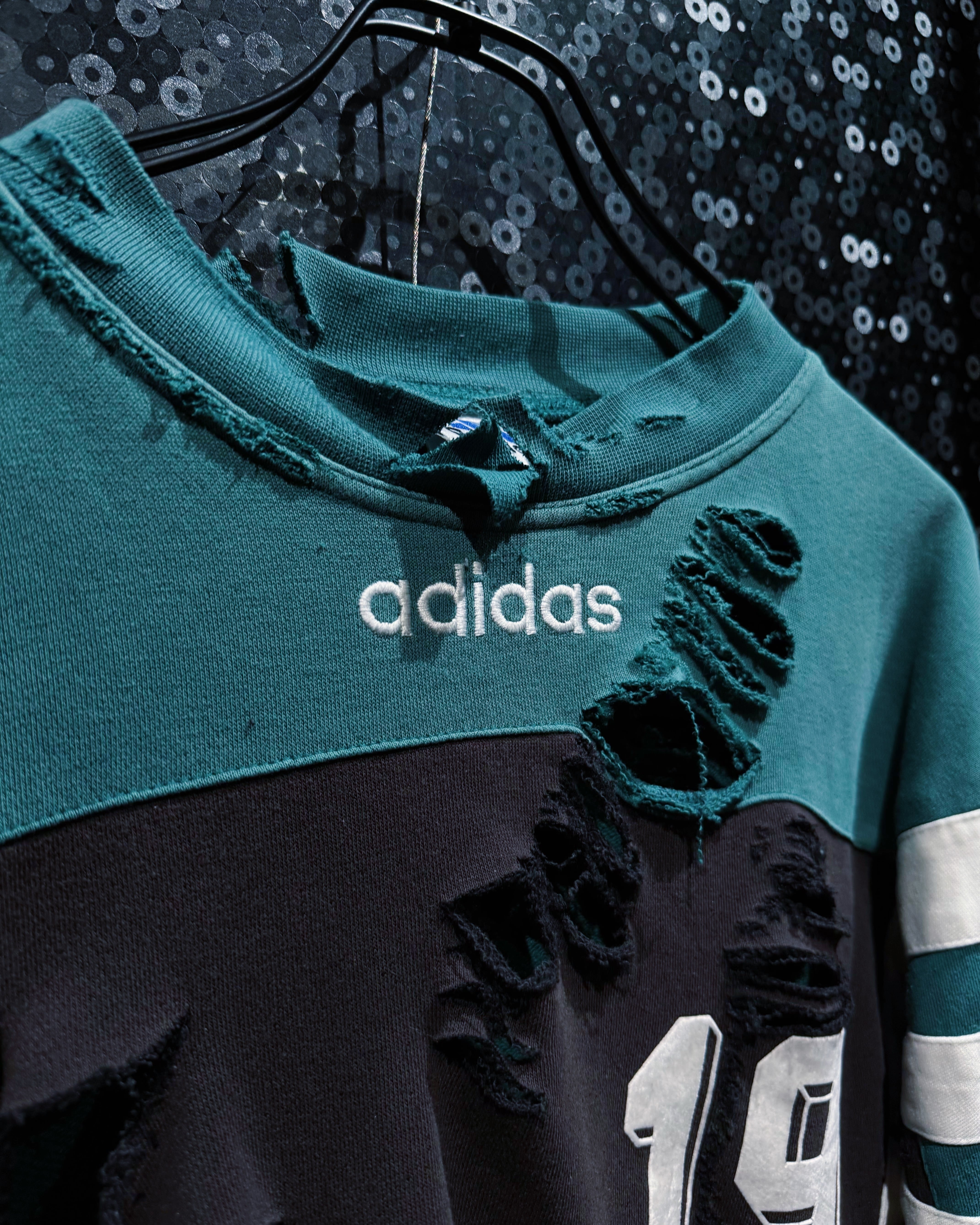 深いグリーン×ブラック×オフホワイトの3色切り替えをベースに、AEIEM独自の“ボロ”アートを落とし込んだオリジナルリメイクスウェット。胸元にはクラシックな adidas 刺繍、センターには「19」のナンバリングが入り、スポーツヴィンテージらしい空気感を残しつつ、全体にわたって大胆すぎるほどのクラッシュ加工を加えた一着。