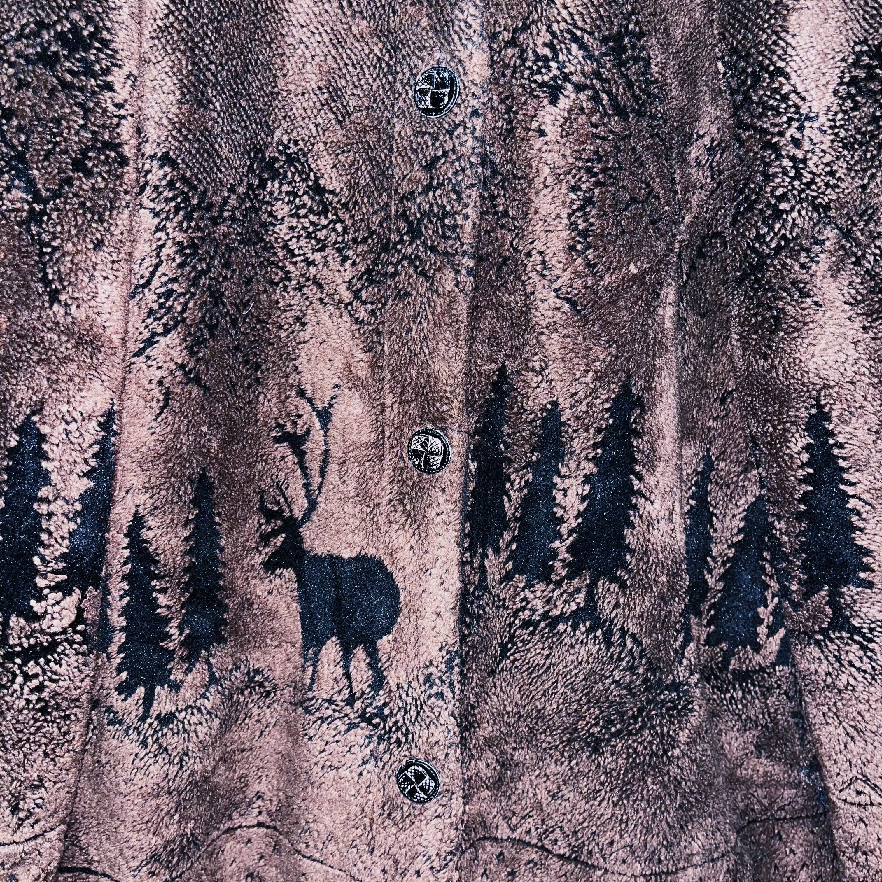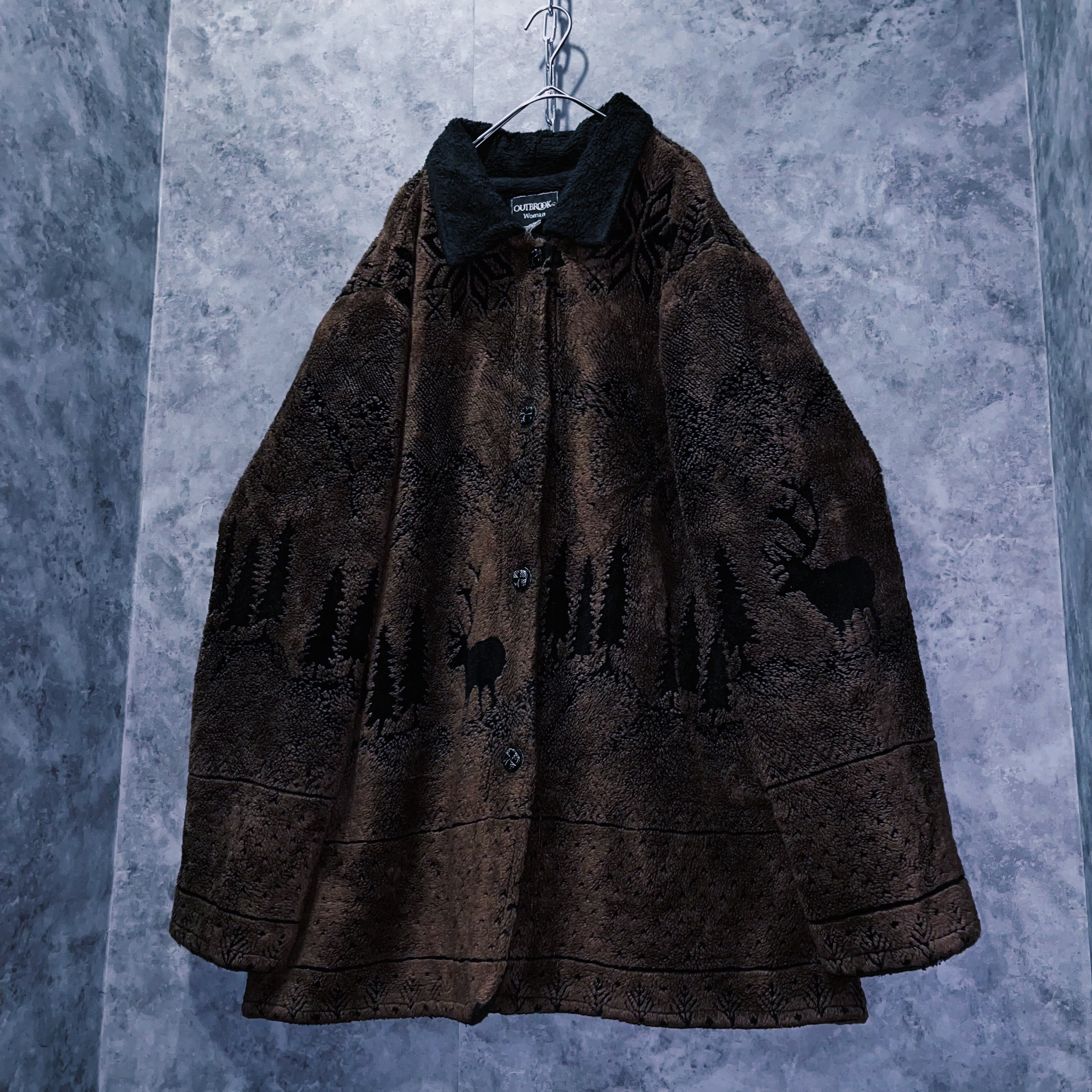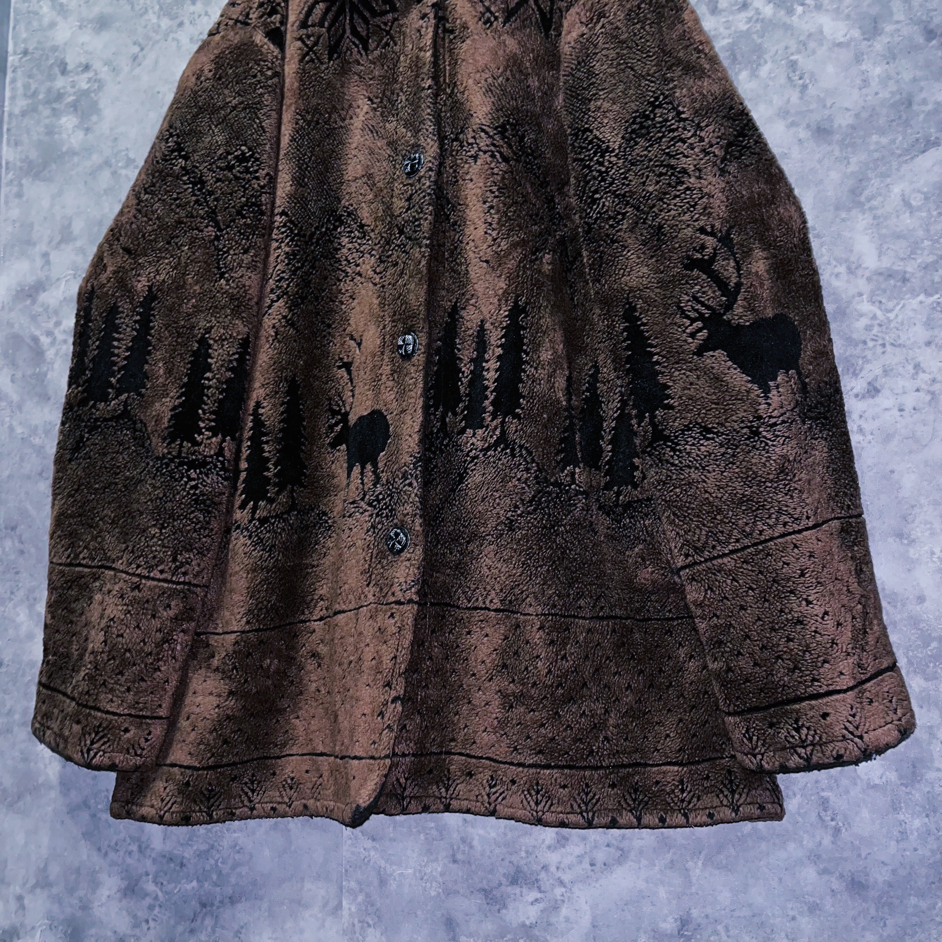 ヴィンテージ風景画×シカデザイン彫刻ボタンボアジャケット