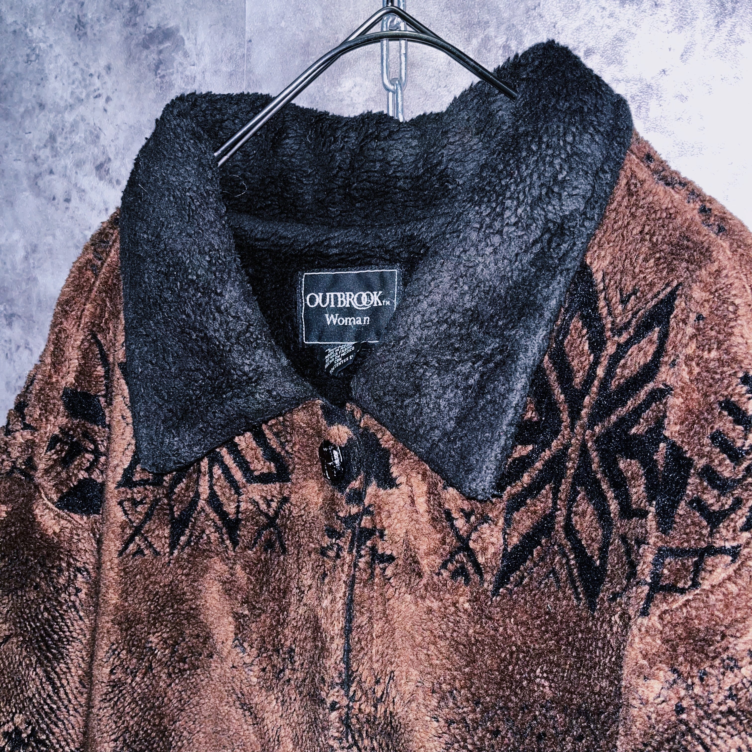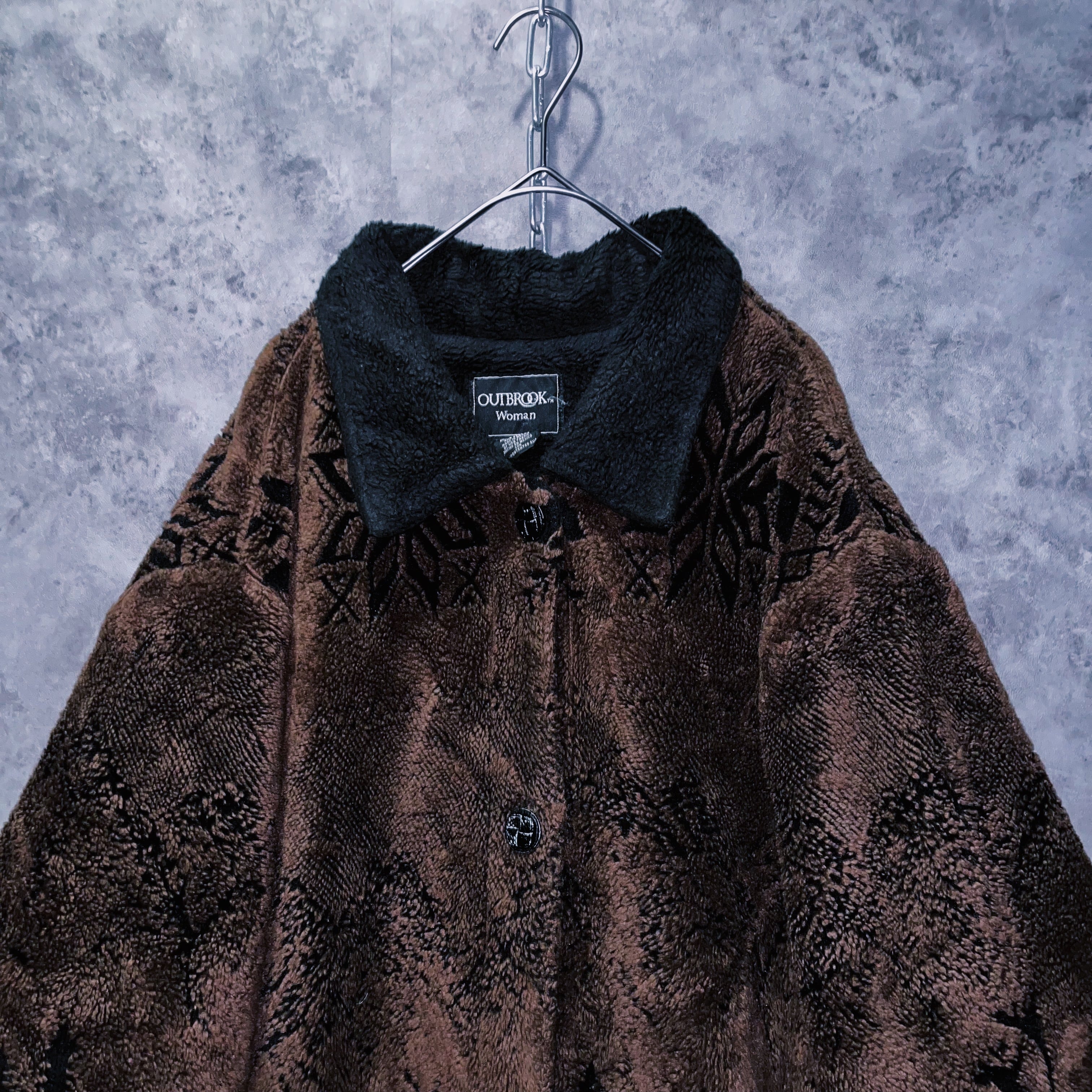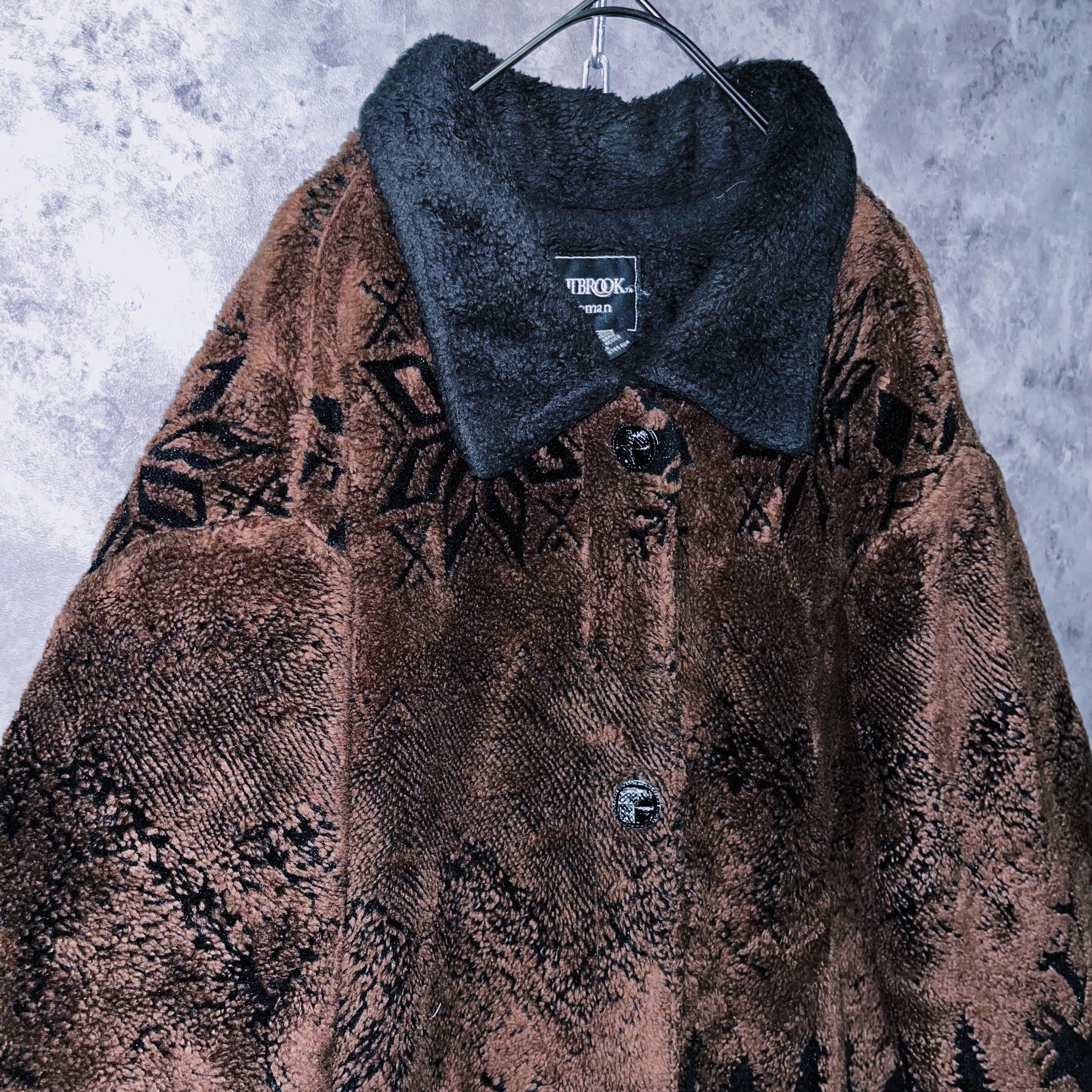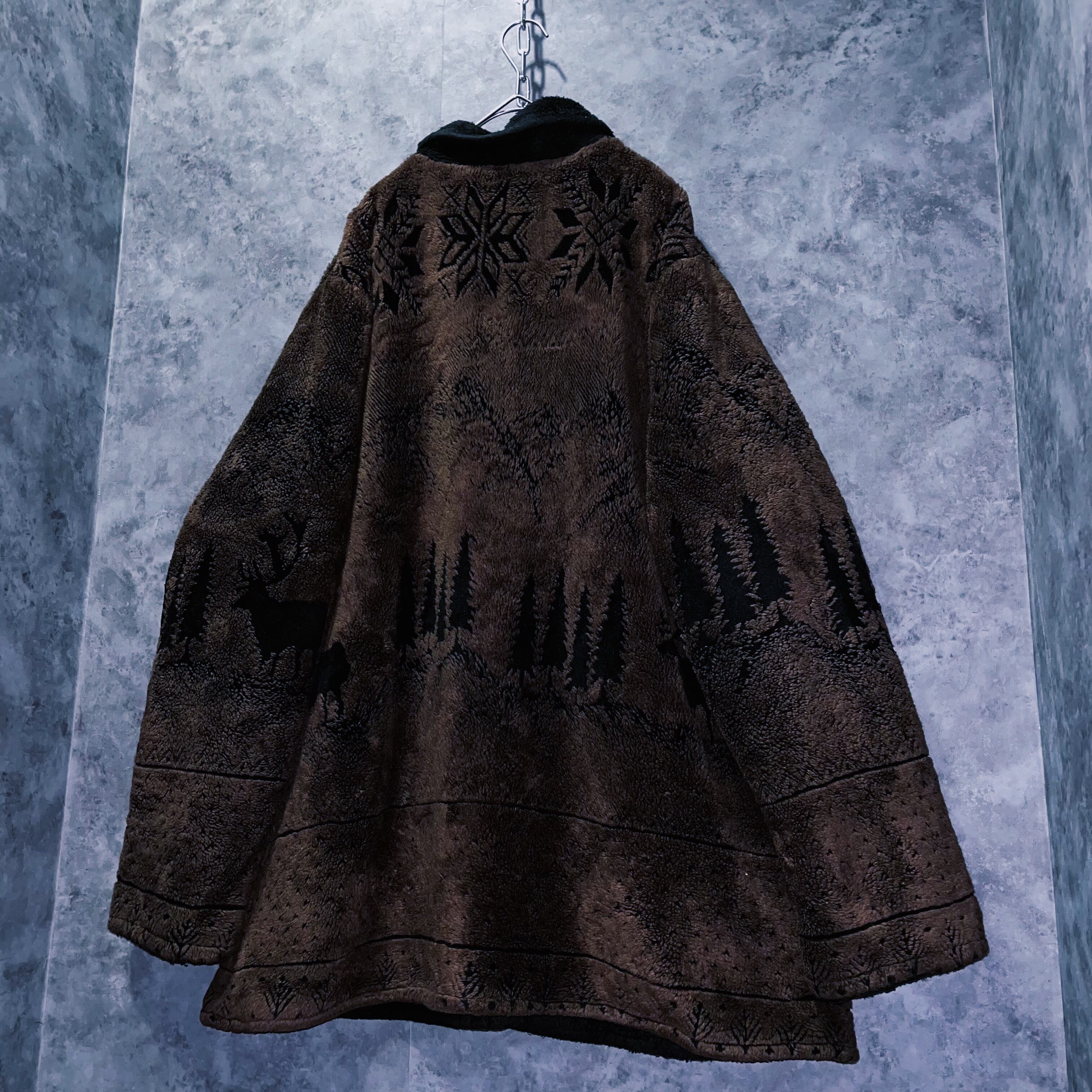 ヴィンテージ風景画×シカデザイン彫刻ボタンボアジャケット