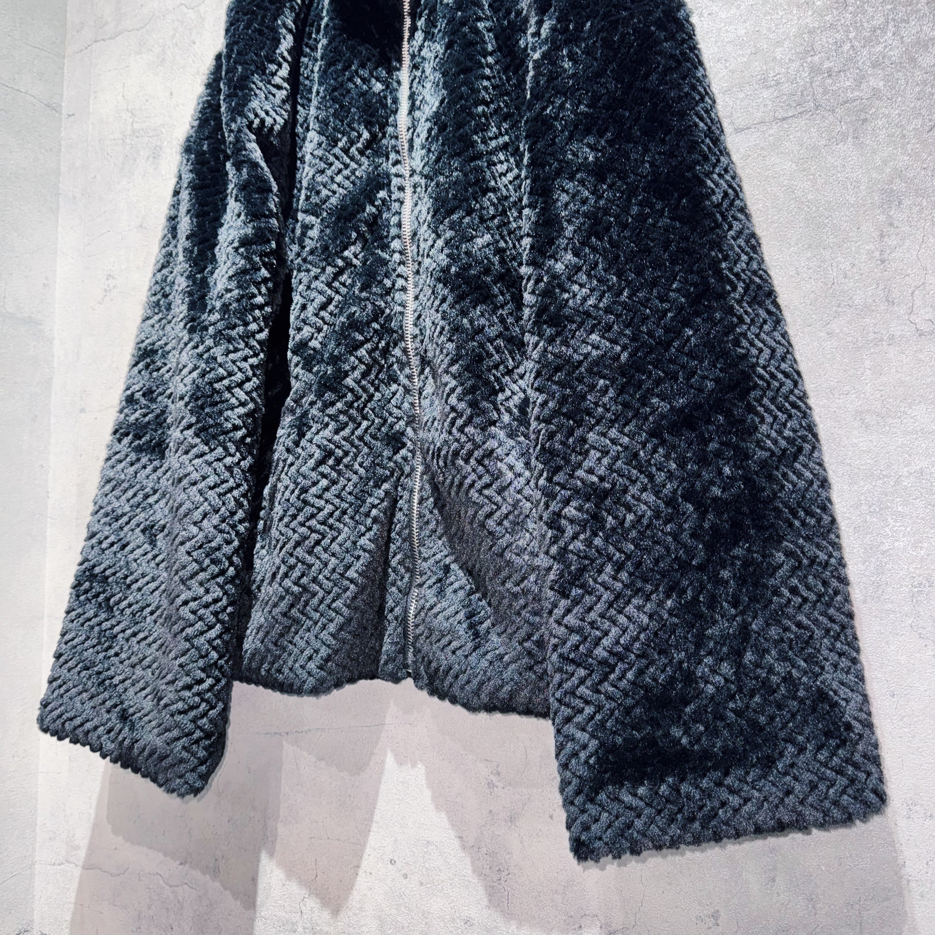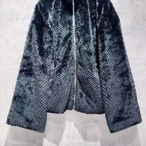 フェイクファーマテリアルシャドウブラックカラージップスタンドネックジャケット