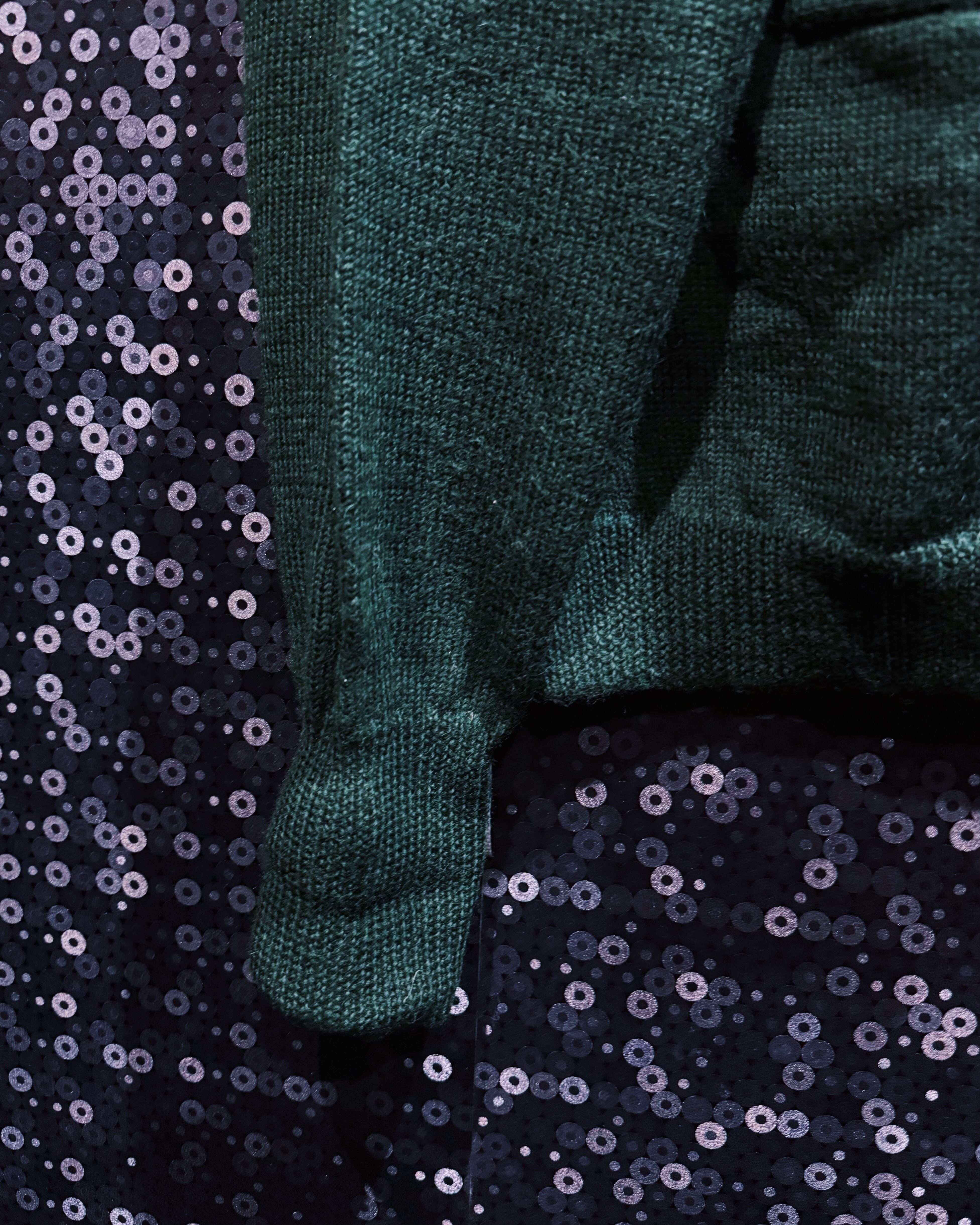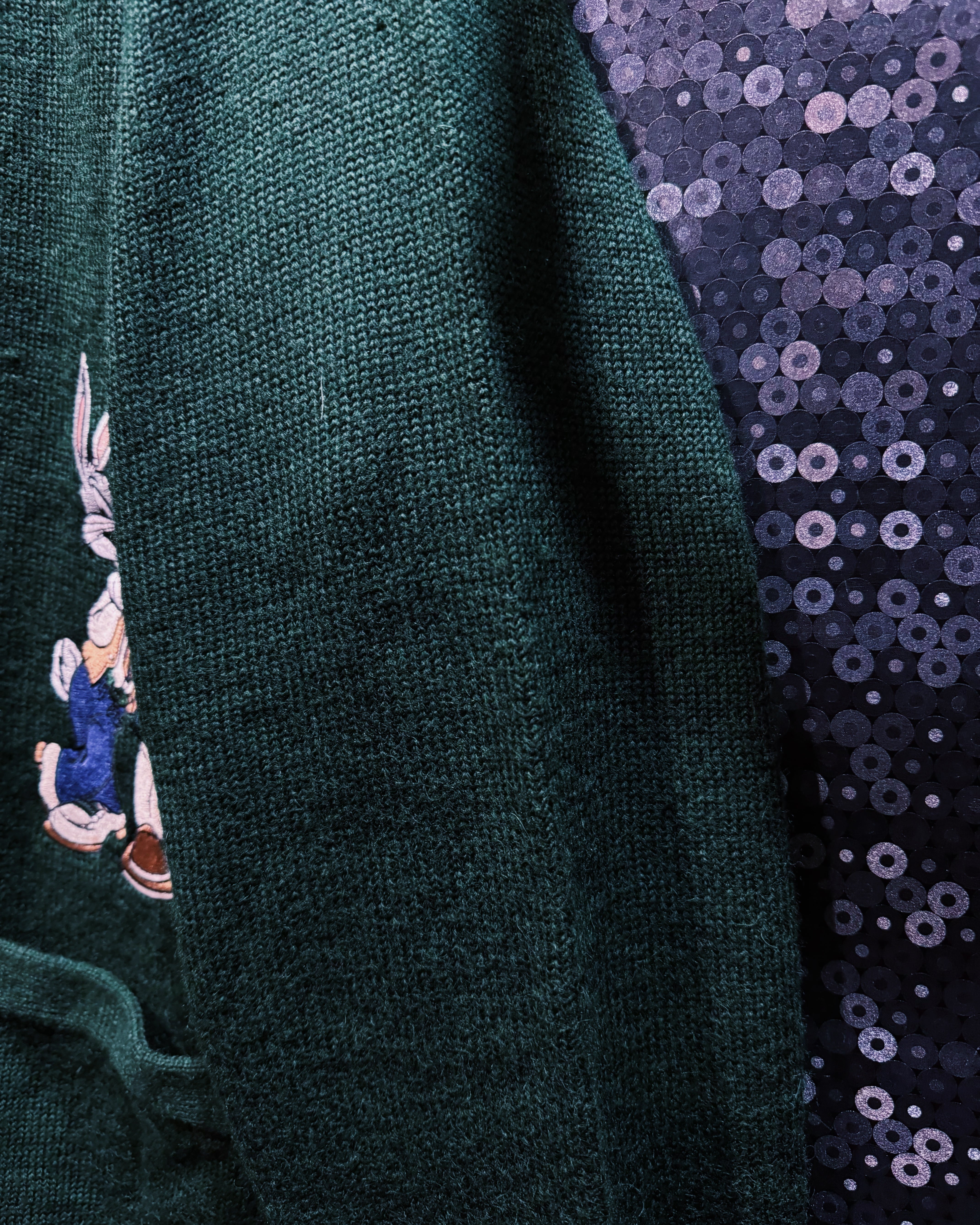 深いダークグリーンのボディに、右裾へ大きく刺繍されたバックス・バニーが存在感抜群で、当時のアニメ公式アイテム特有の温かみある風合いがしっかり残っている。