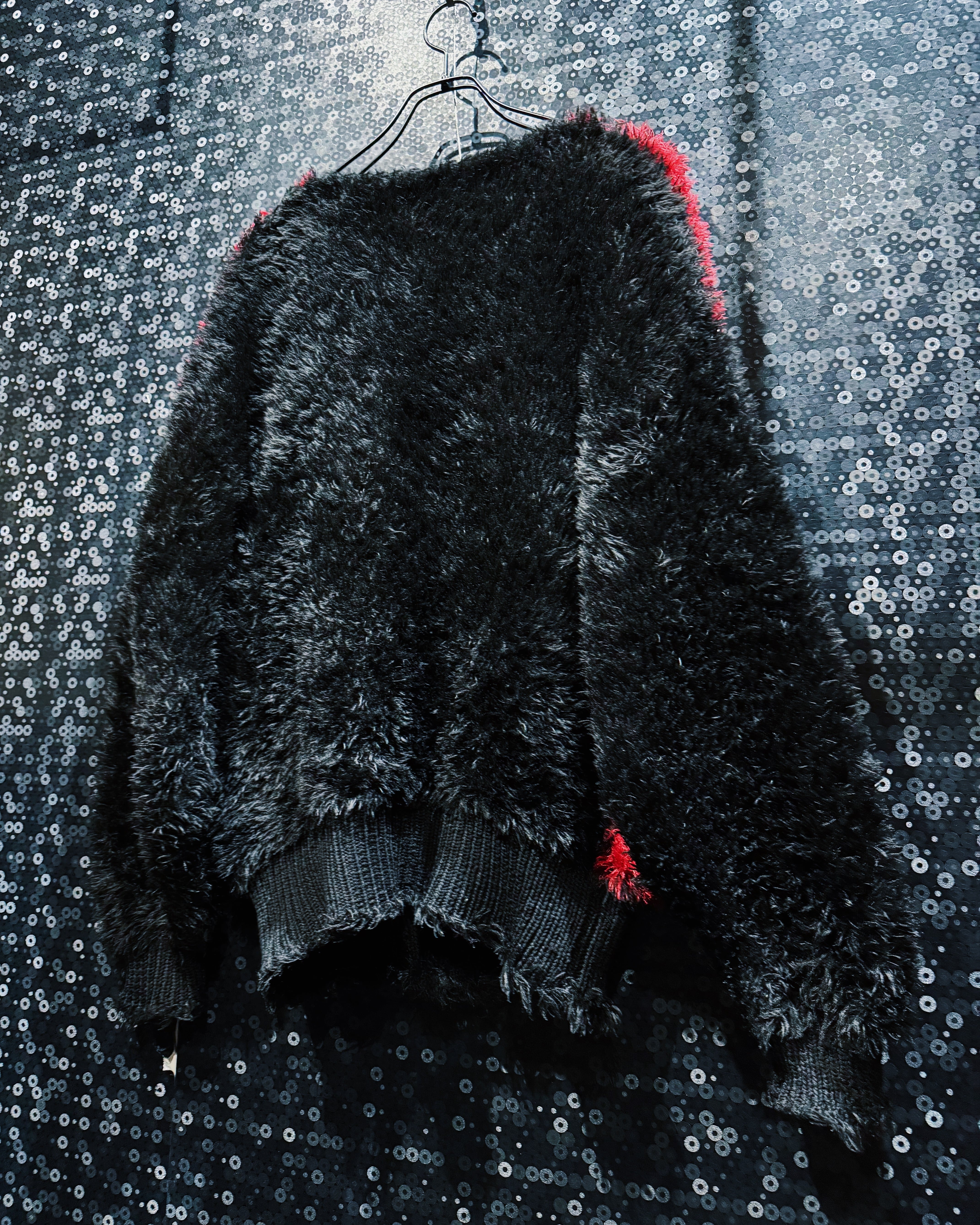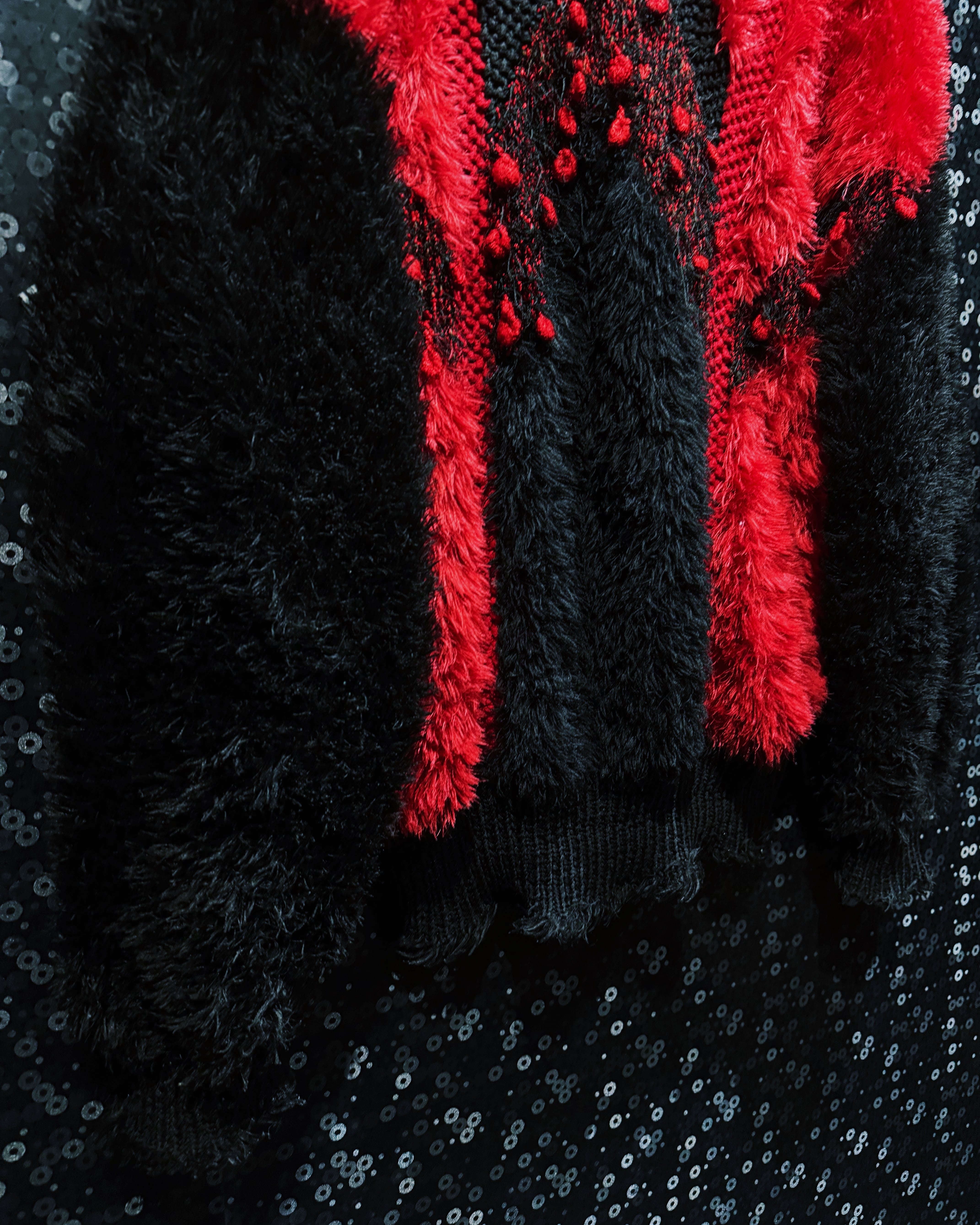 レッドとブラックを大胆に切り替えた、圧倒的な存在感のシャギーニットプルオーバー。毛足の長いシャギー素材と、ザックリとしたローゲージ編みを組み合わせた独特の構築デザインが特徴で、フロント中央に広がる赤のアーチ形パターンが視線を一気に引き寄せる仕上がり。