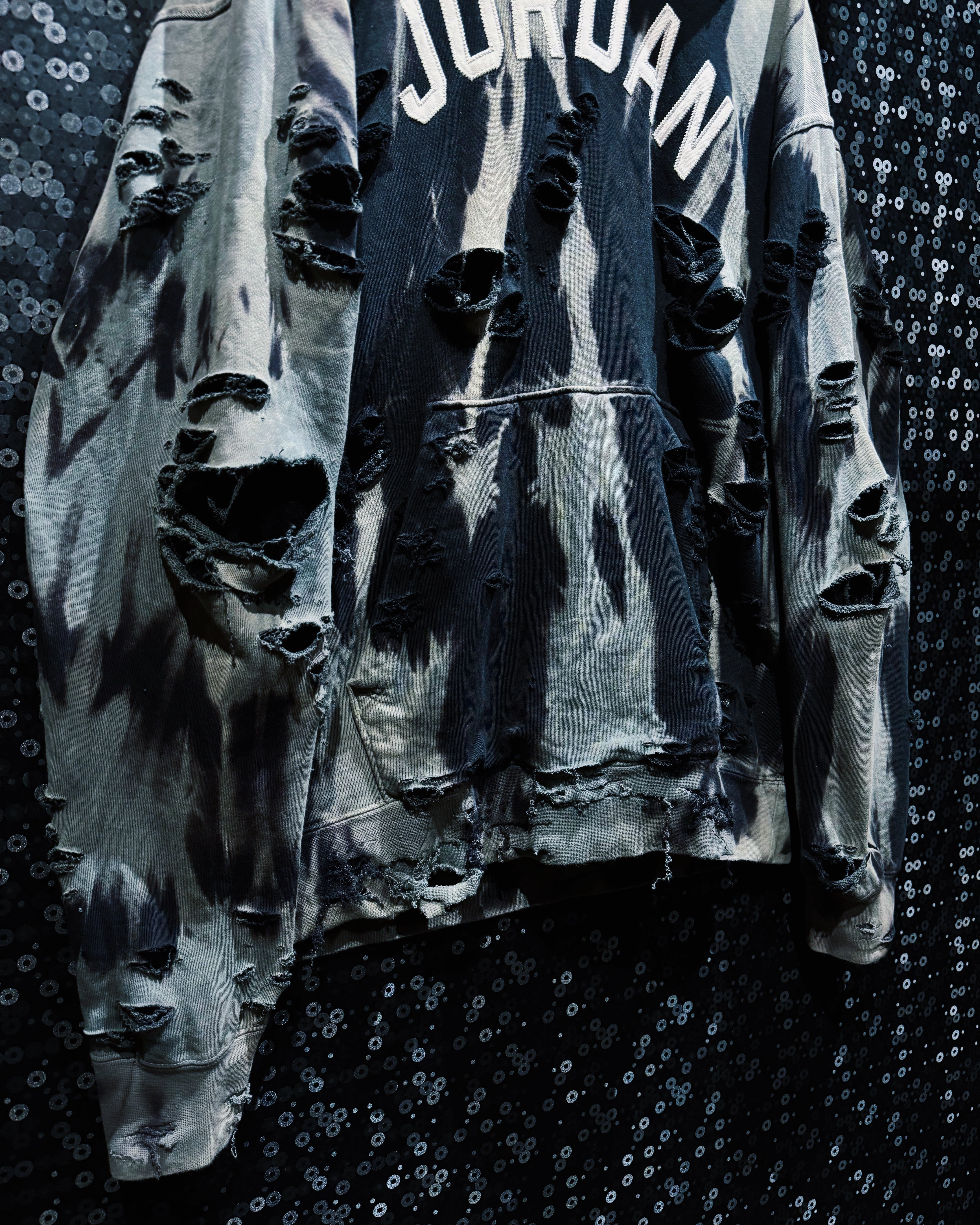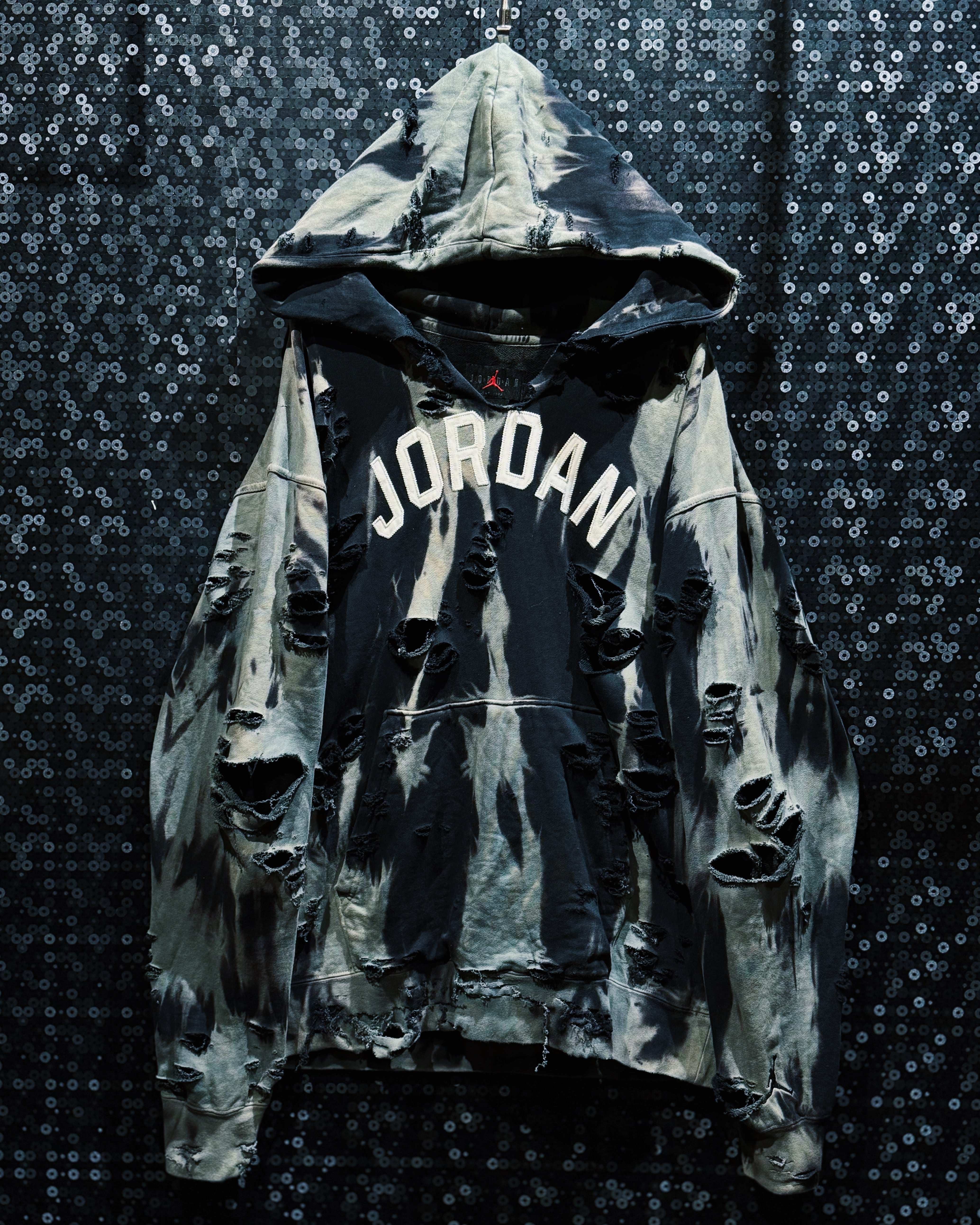 裾や袖口にまで入った解れと裂けは、着用時のシルエットに動きを生み、ストリートでも舞台でも主役を張れる圧倒的インパクト。完全一点物、唯一無二の雰囲気を放つ至高のJordanリメイクフーディー。