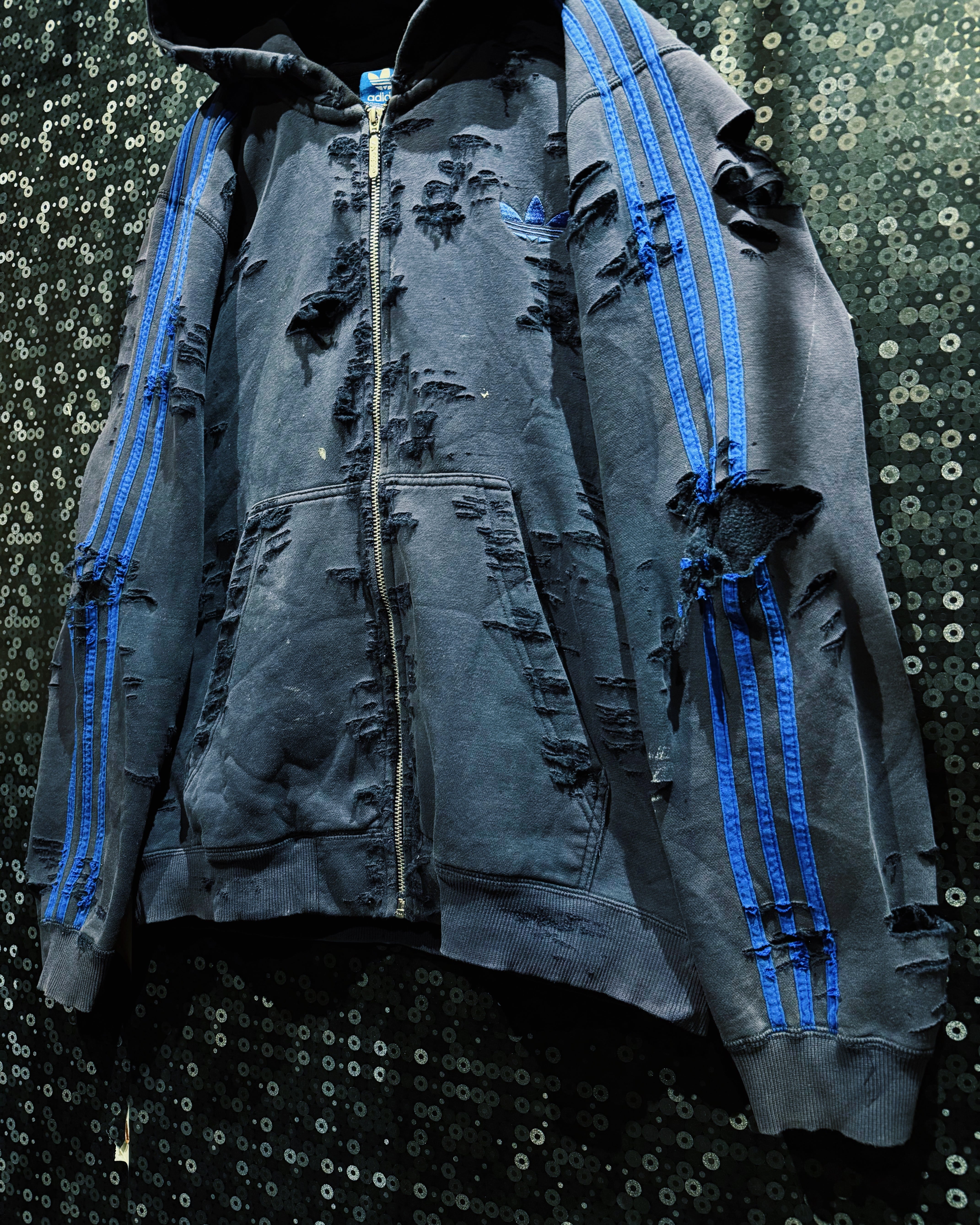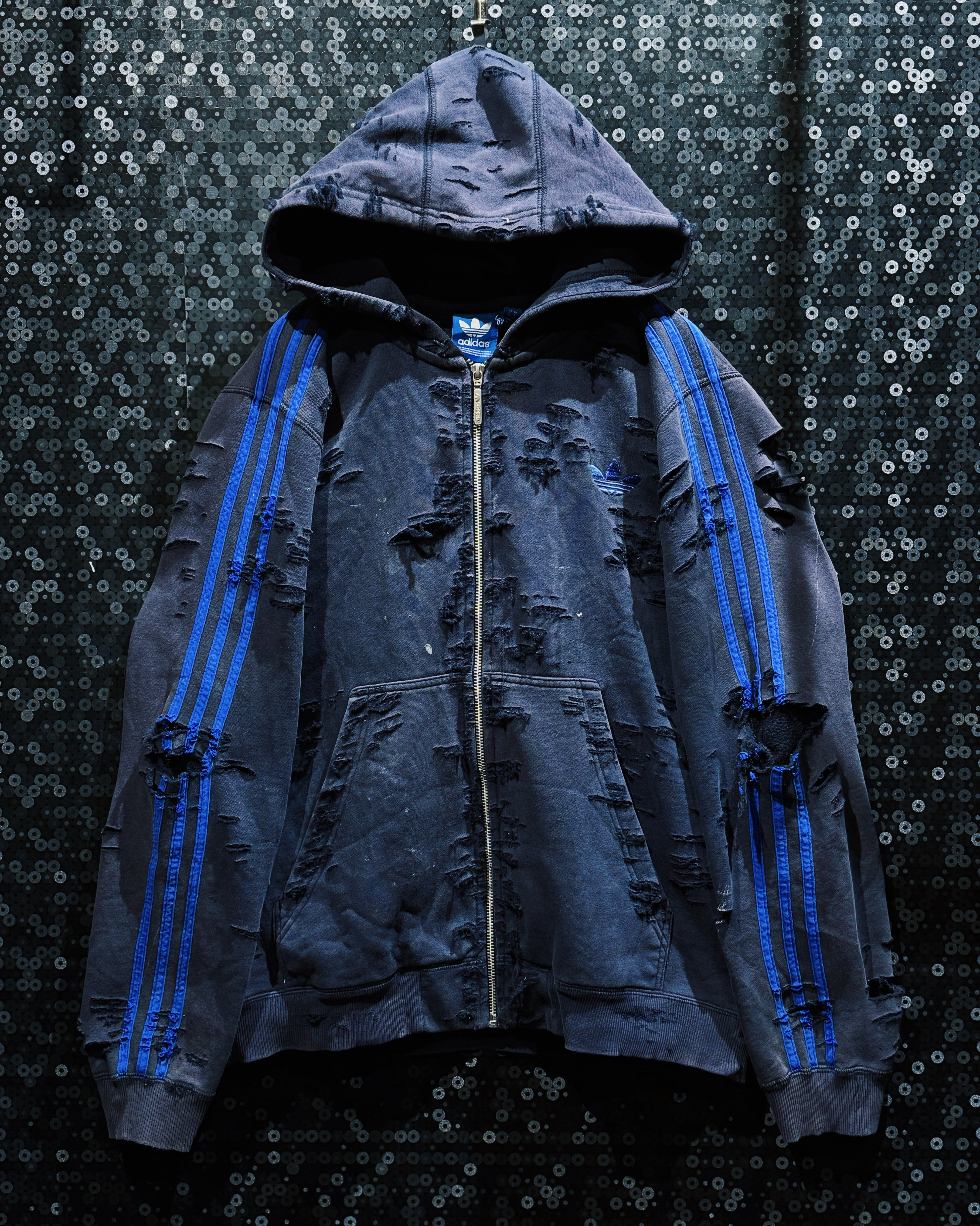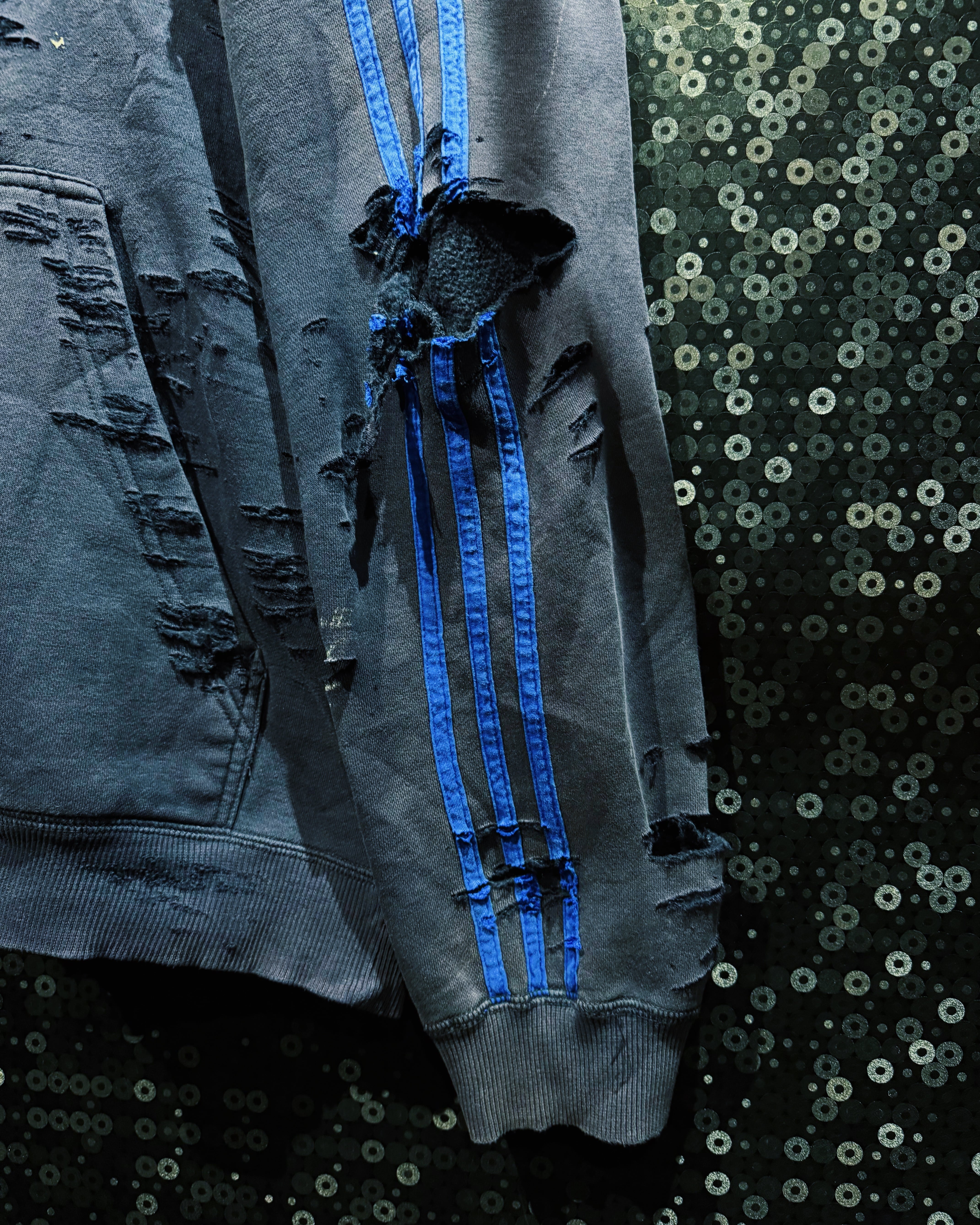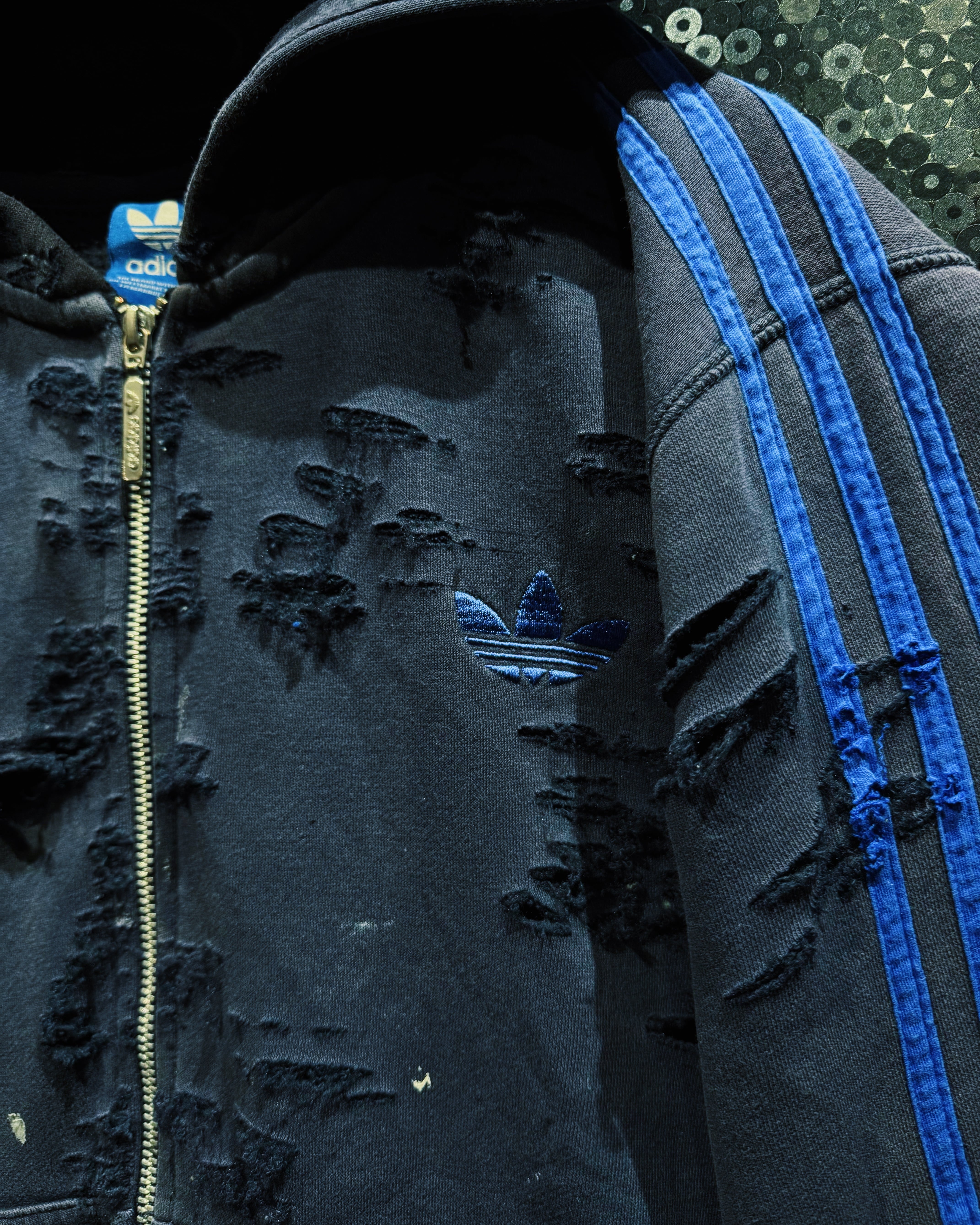 ボディ全体に施された深いダメージは、単なる擦れではなく一点ずつ手加工で入れられた“芸術的な破れ”で、黒ボディに青のトレフォイル刺繍&スリーストライプが妖しく浮かび上がる仕上がり。