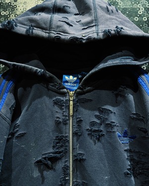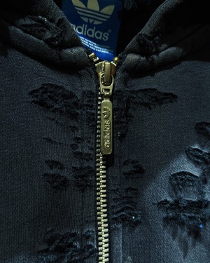 袖のストライプはオリジナルのまま生かしつつ、ダメージとのコントラストでより立体的に見えるよう計算された加工が魅力。ジップには当時のadidas刻印入りメタルジッパーが使用され、ヴィンテージらしい重厚感をさらに強調。Y2Kの空気感とボロの荒々しさを掛け合わせた、まさに“唯一無二”の存在感を放つフルジップフーディー。