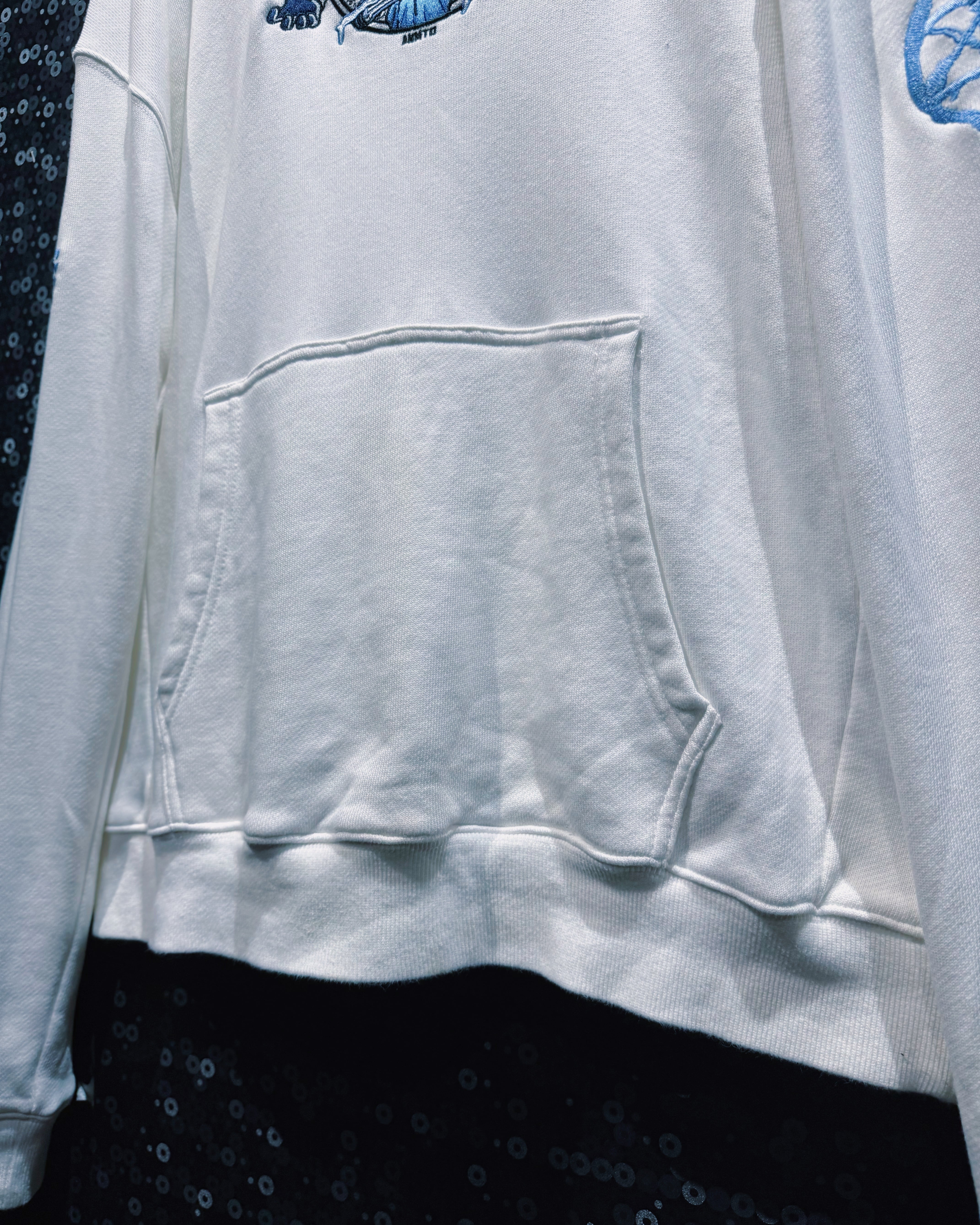 ボディは100%コットンのヘビーウェイト生地で、柔らかな着心地としっかりした厚みを両立。ホワイトボディにブルーの刺繍が映え、クリーンでありながら存在感を放つ。アニマートらしい高精度刺繍とアート性の高いデザインバランスが際立った、コレクションピースとしても楽しめる1着。ファンはもちろん、グラフィック重視のストリートスタイルにも完璧にハマる。