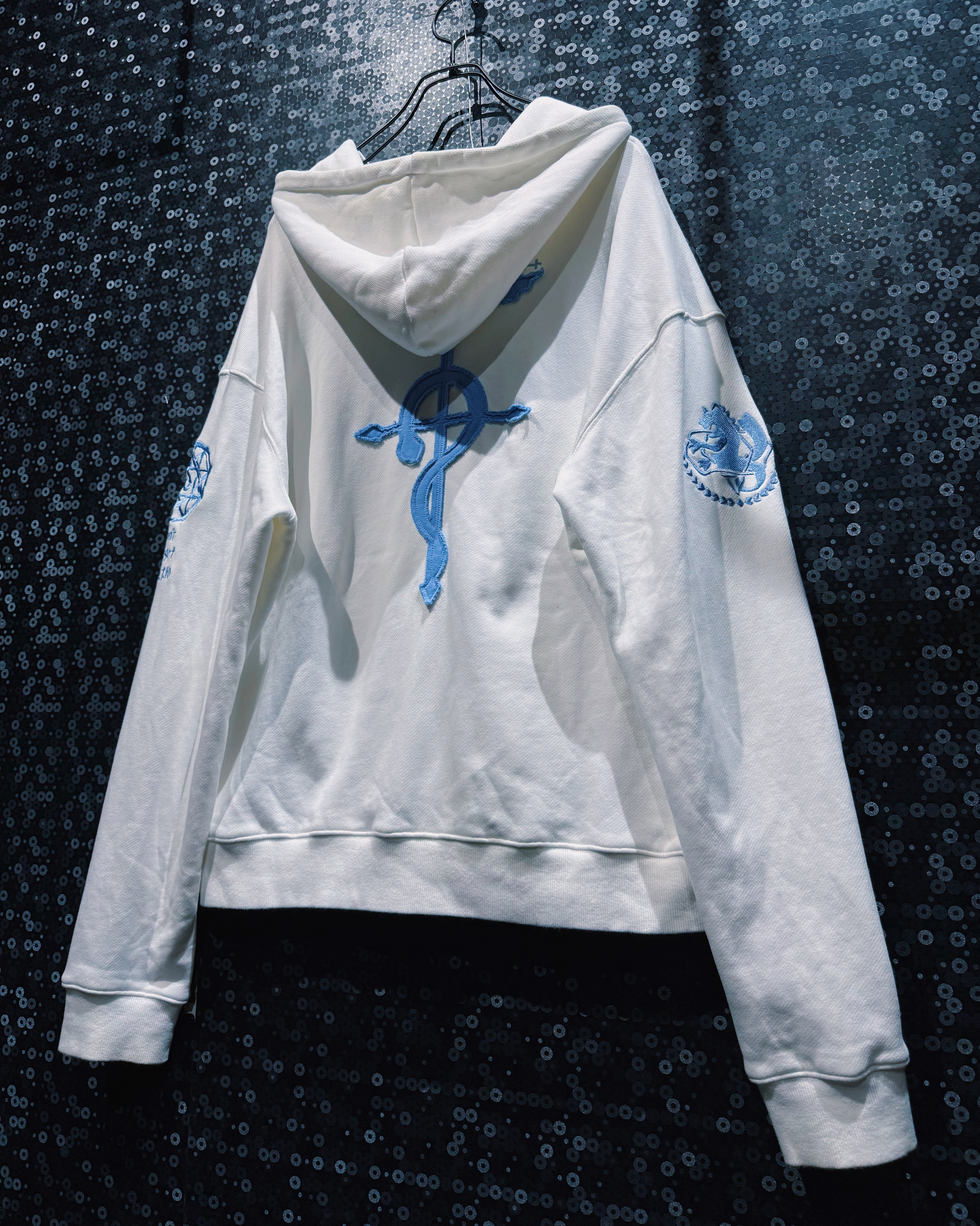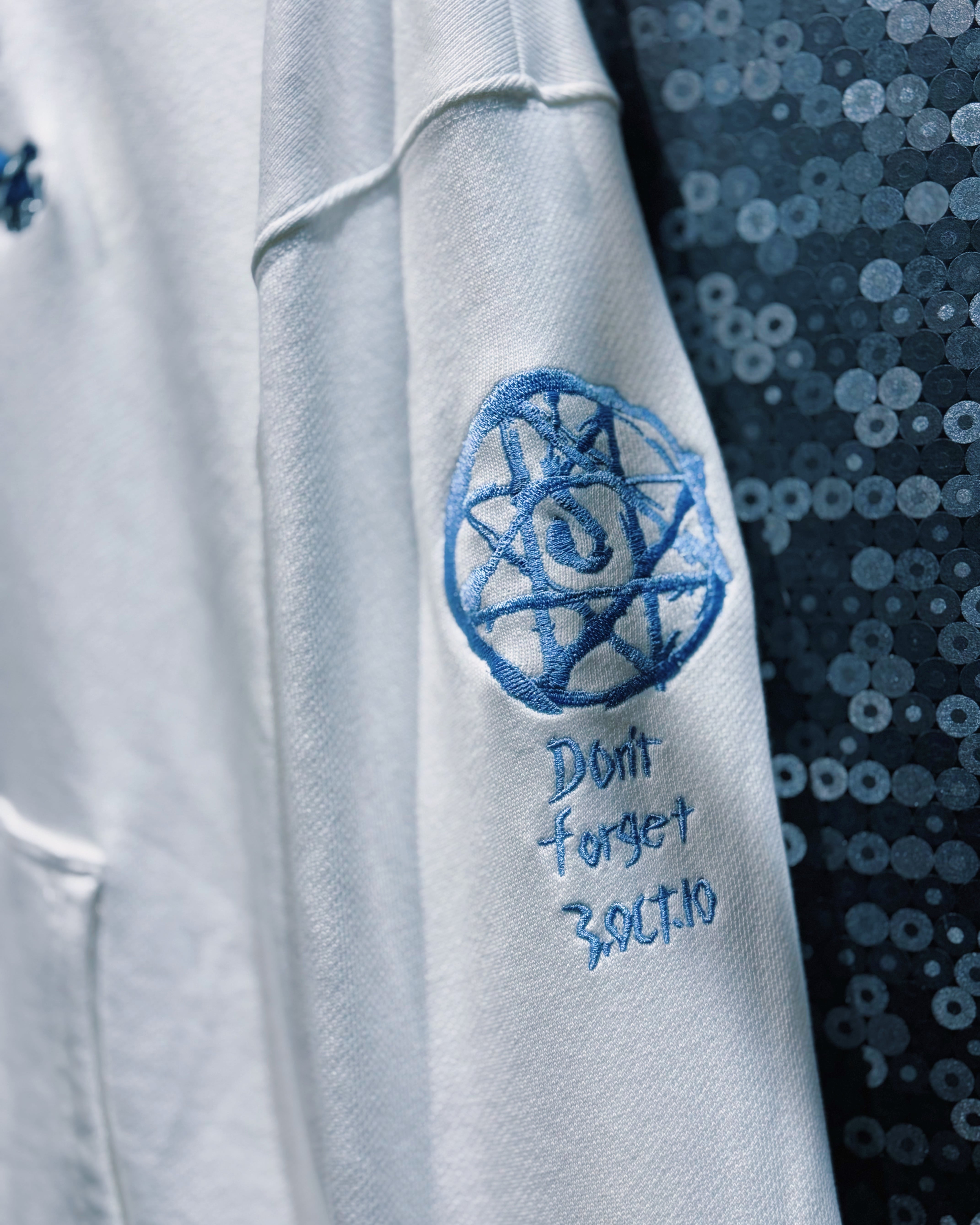 両袖には異なる錬金術モチーフや紋章が丁寧に刺繍され、作品世界をそのまま纏うような没入感を演出。