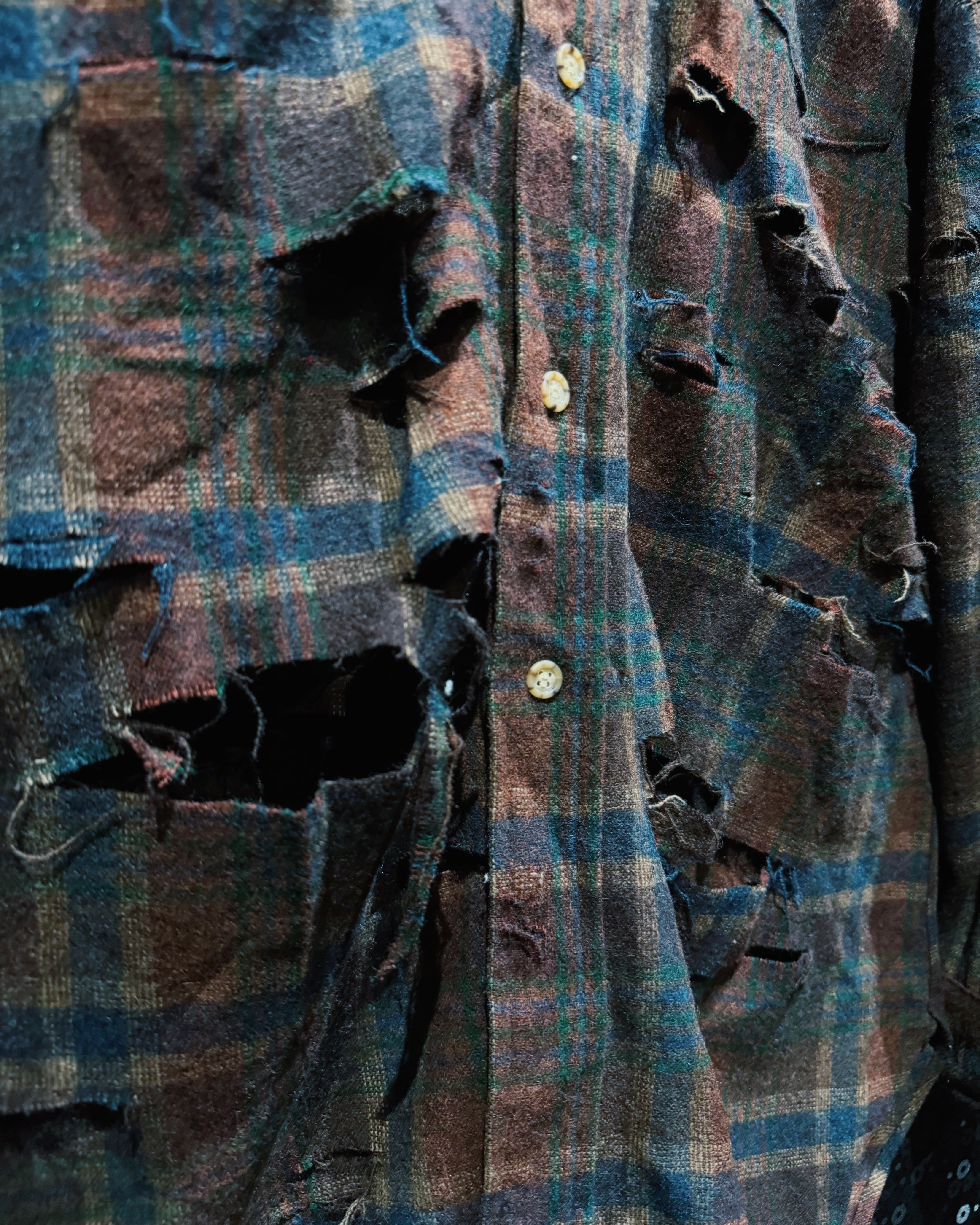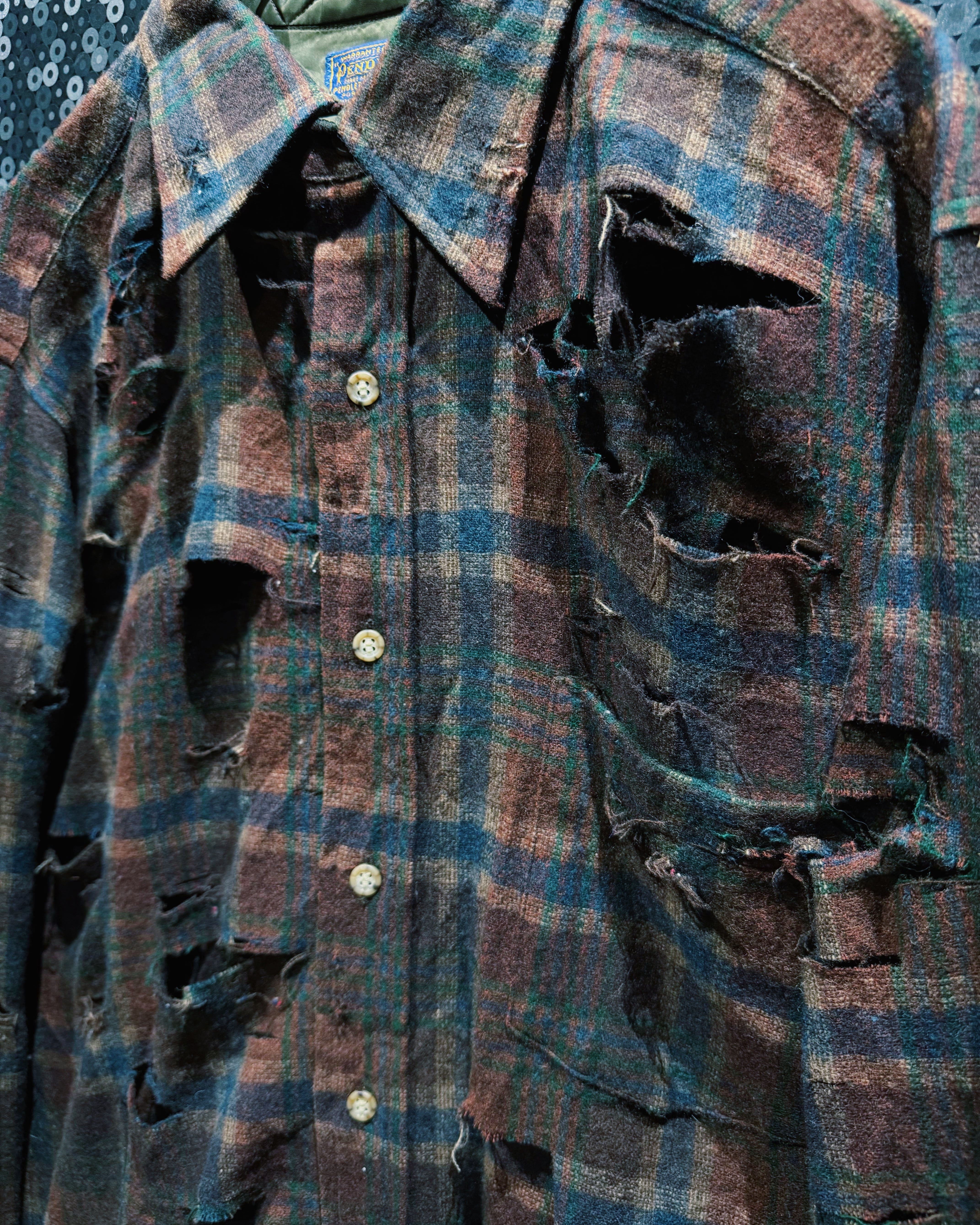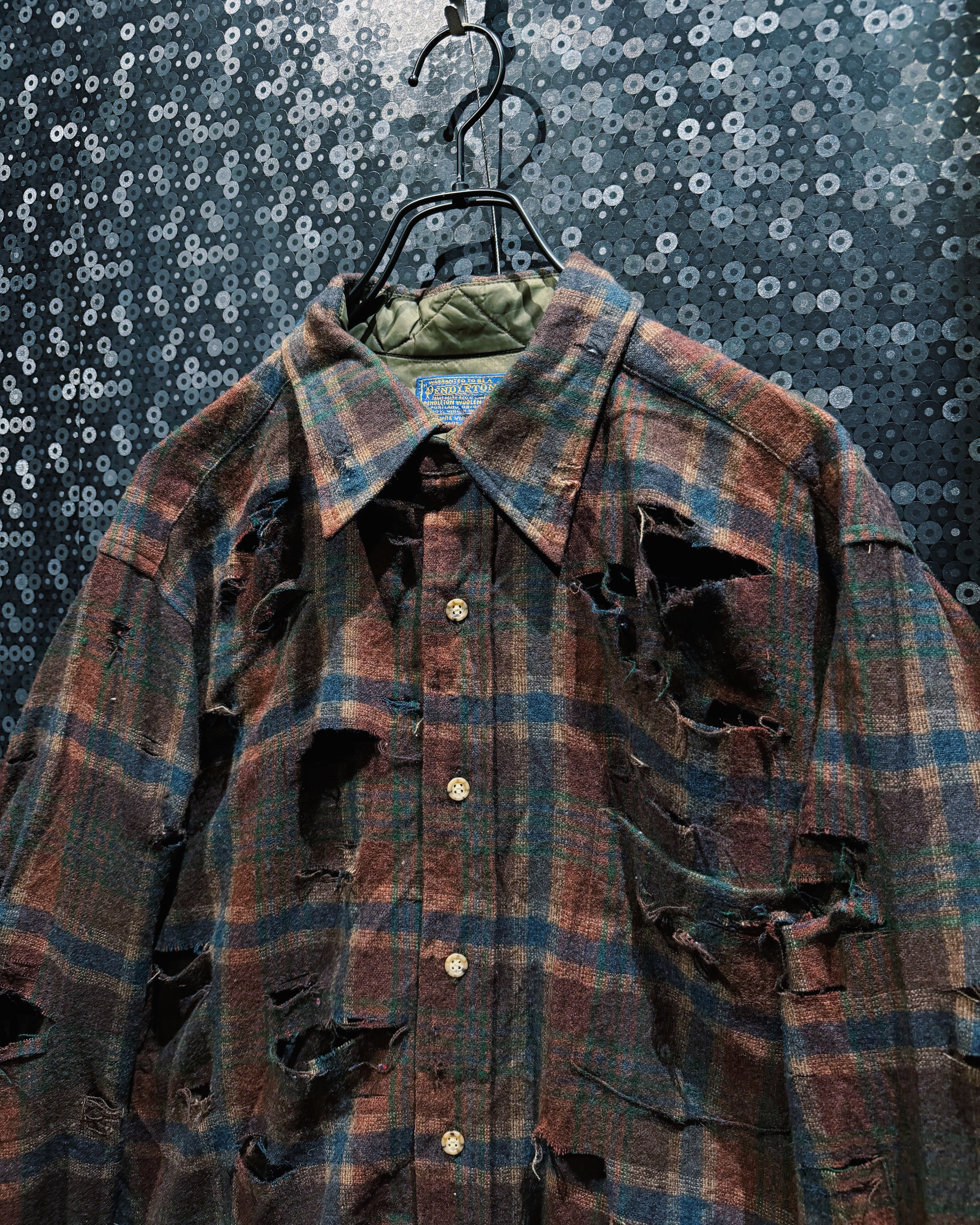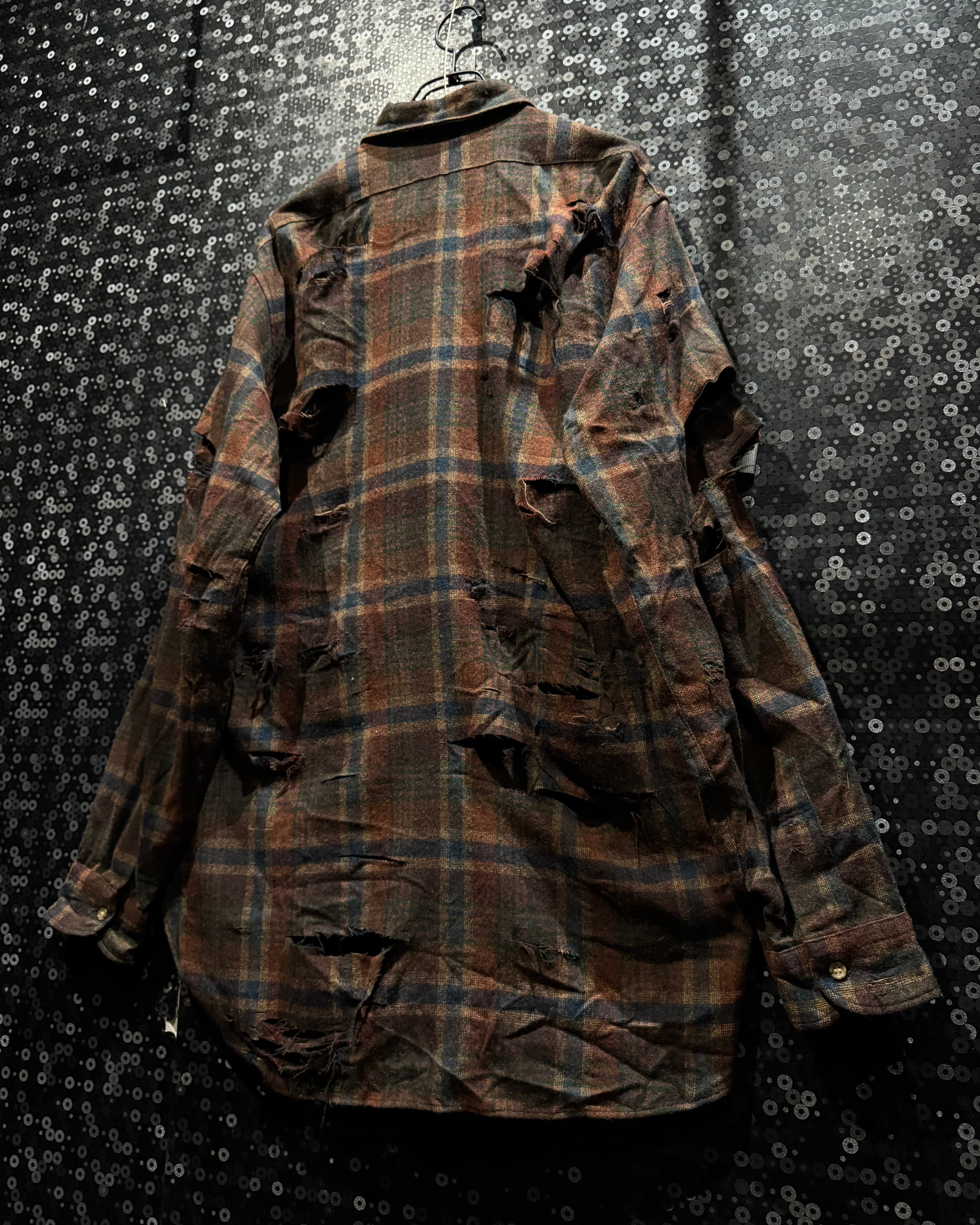 アメリカ老舗〈Pendleton/ペンドルトン〉の100%ヴァージンウールシャツをベースに、ÆIEM独自の“boro”リメイクで再構築したスペシャルピース。クラシックなブラウン×ネイビーのチェック柄に対し、全面へ施した大胆なクラッシュ加工が圧倒的な存在感を放つ。