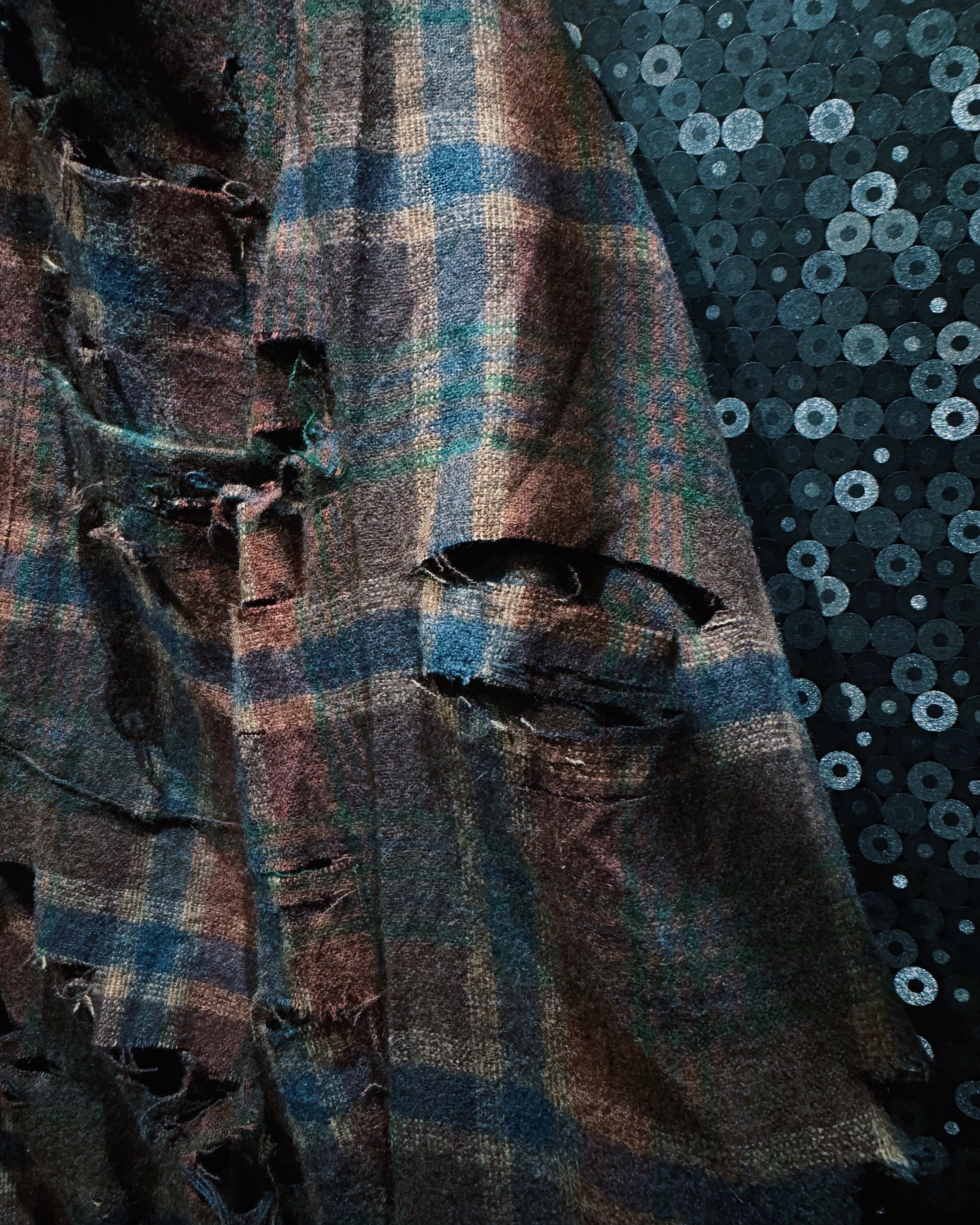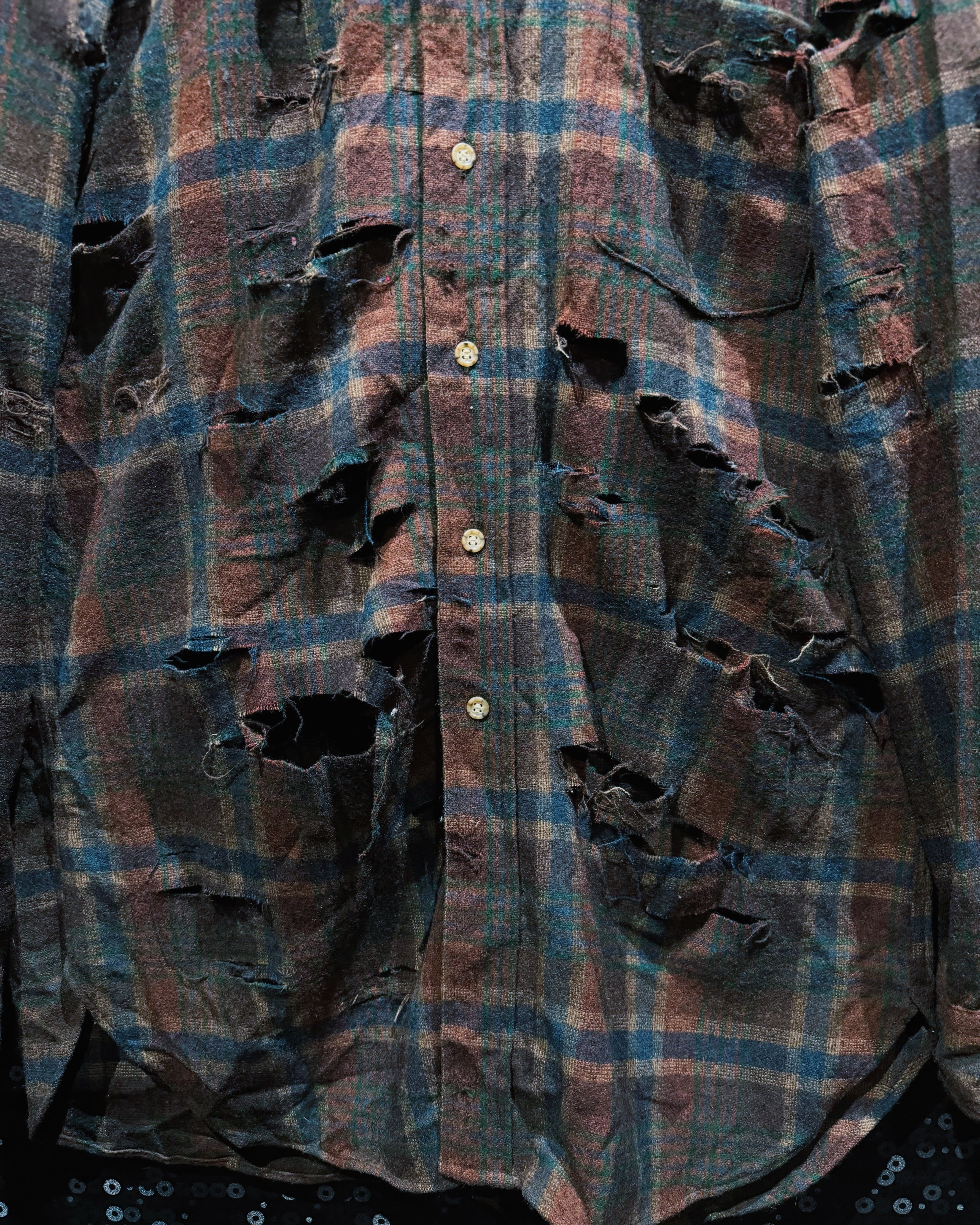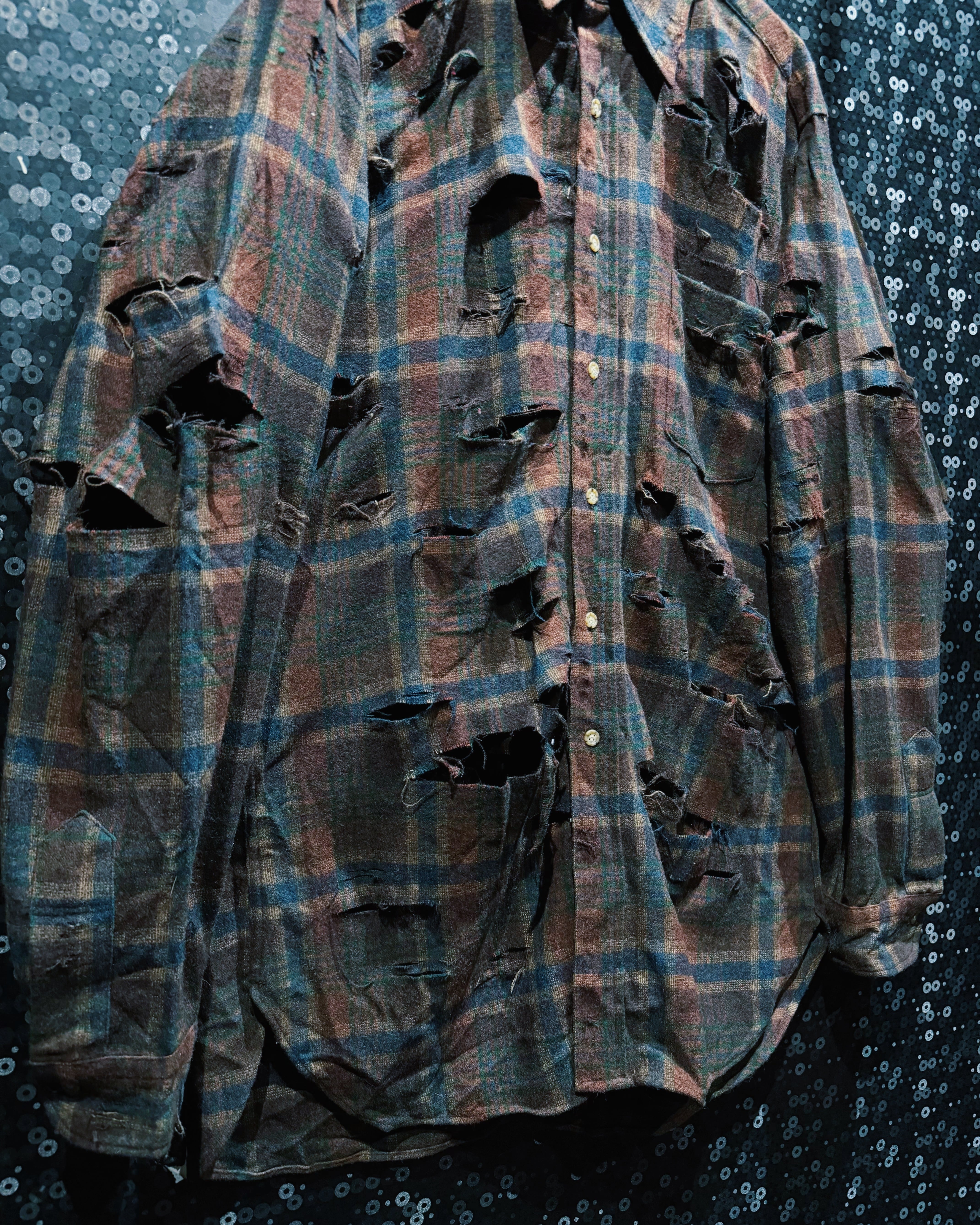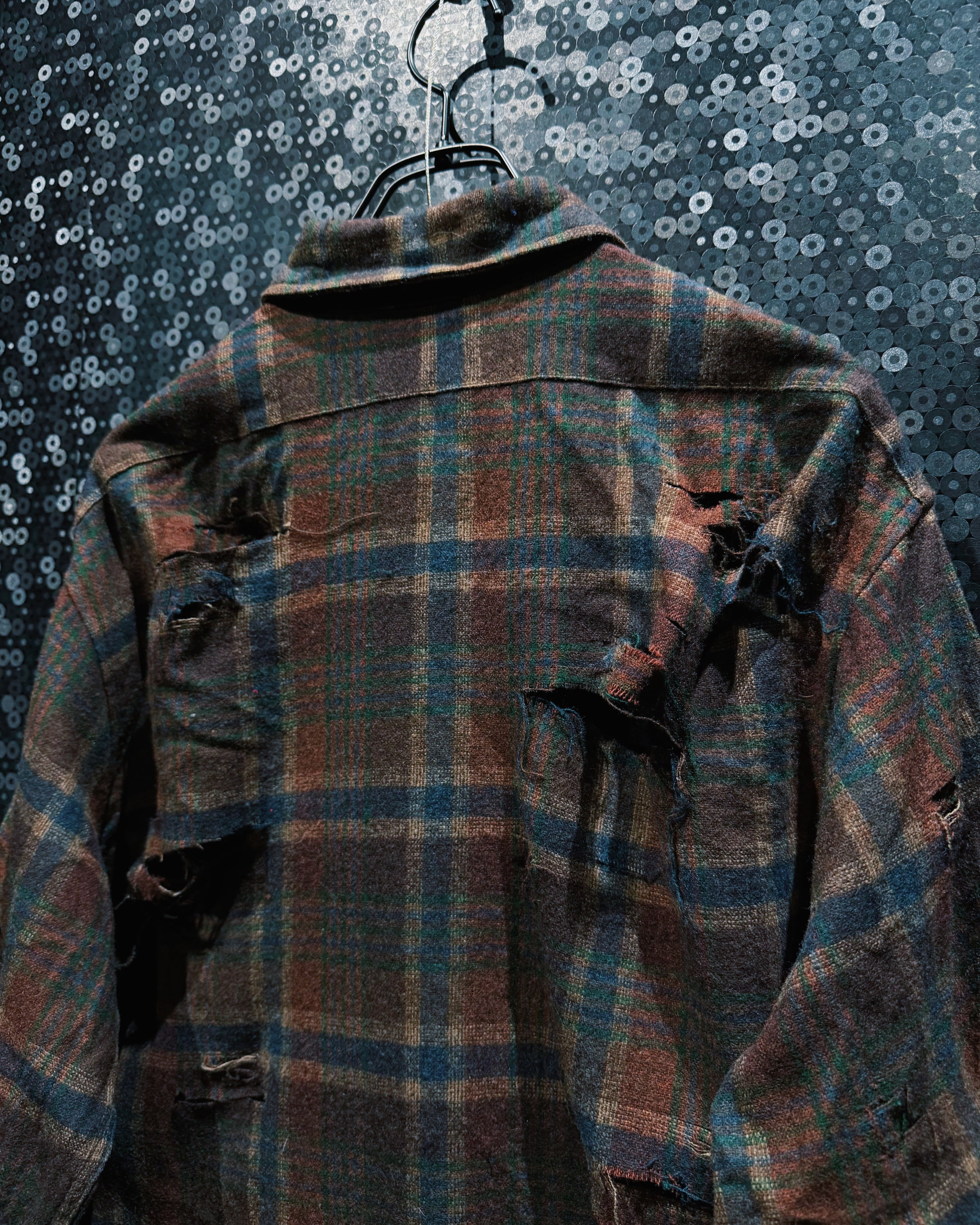 アメリカ老舗〈Pendleton/ペンドルトン〉の100%ヴァージンウールシャツをベースに、ÆIEM独自の“boro”リメイクで再構築したスペシャルピース。クラシックなブラウン×ネイビーのチェック柄に対し、全面へ施した大胆なクラッシュ加工が圧倒的な存在感を放つ。