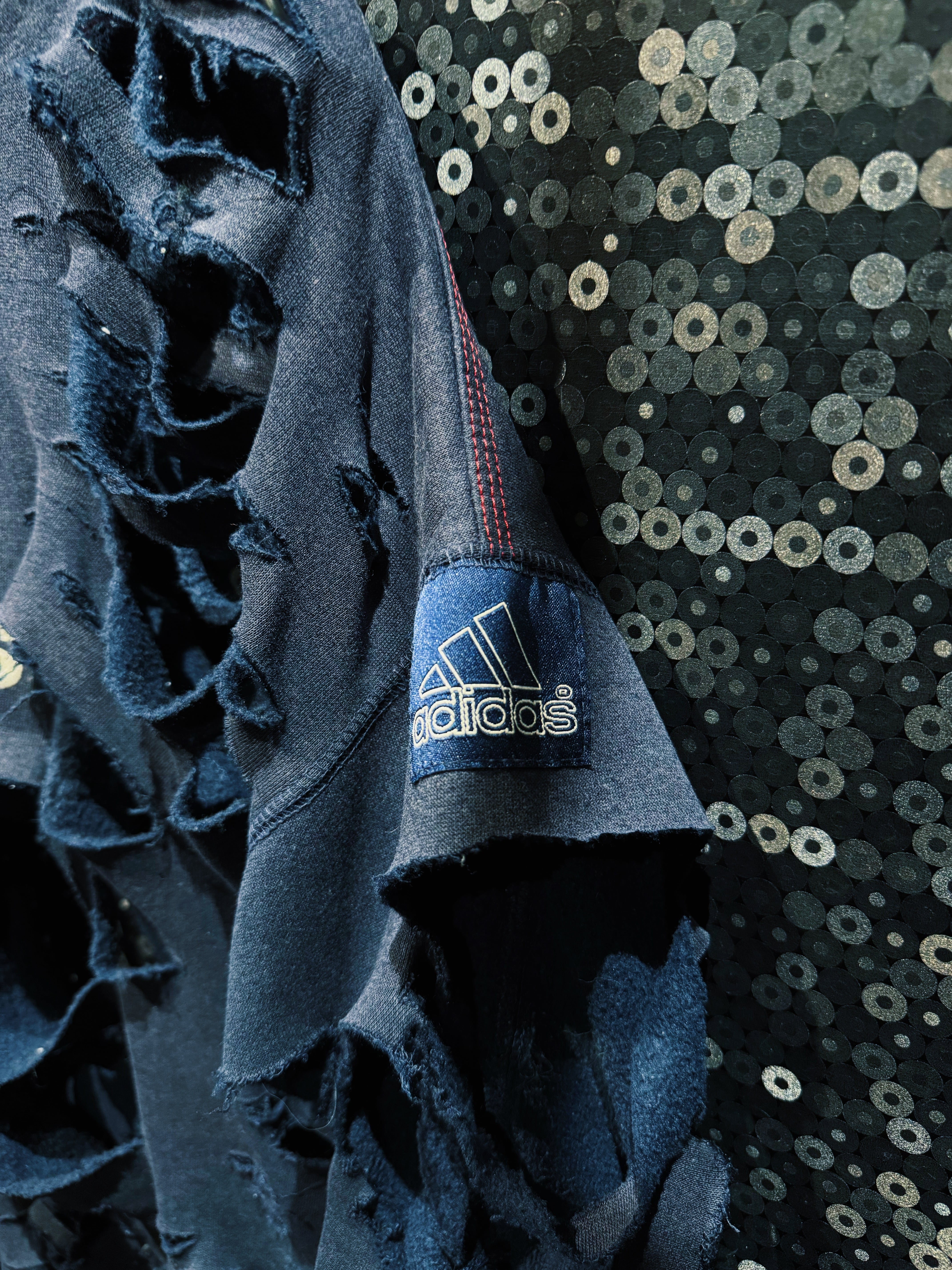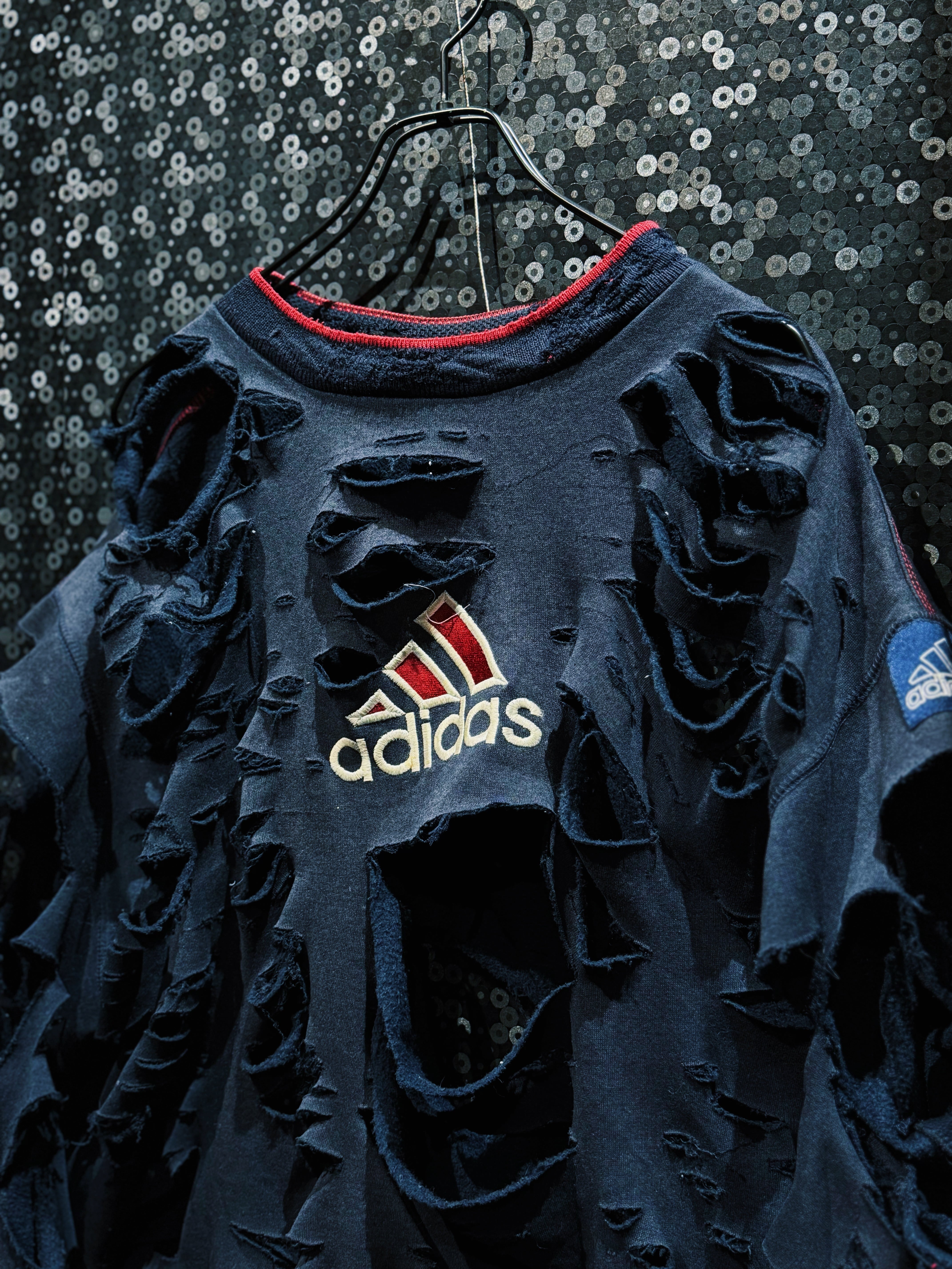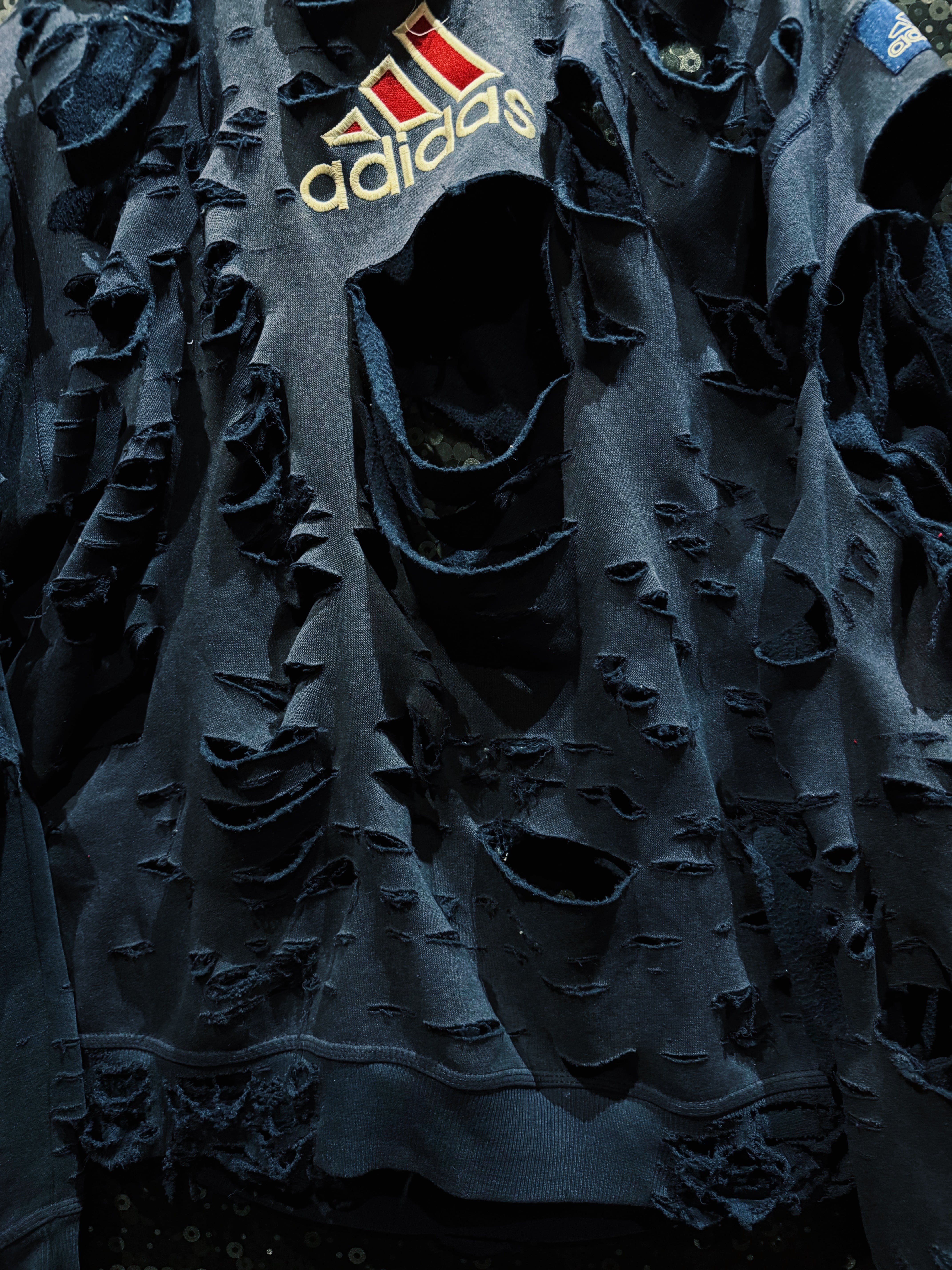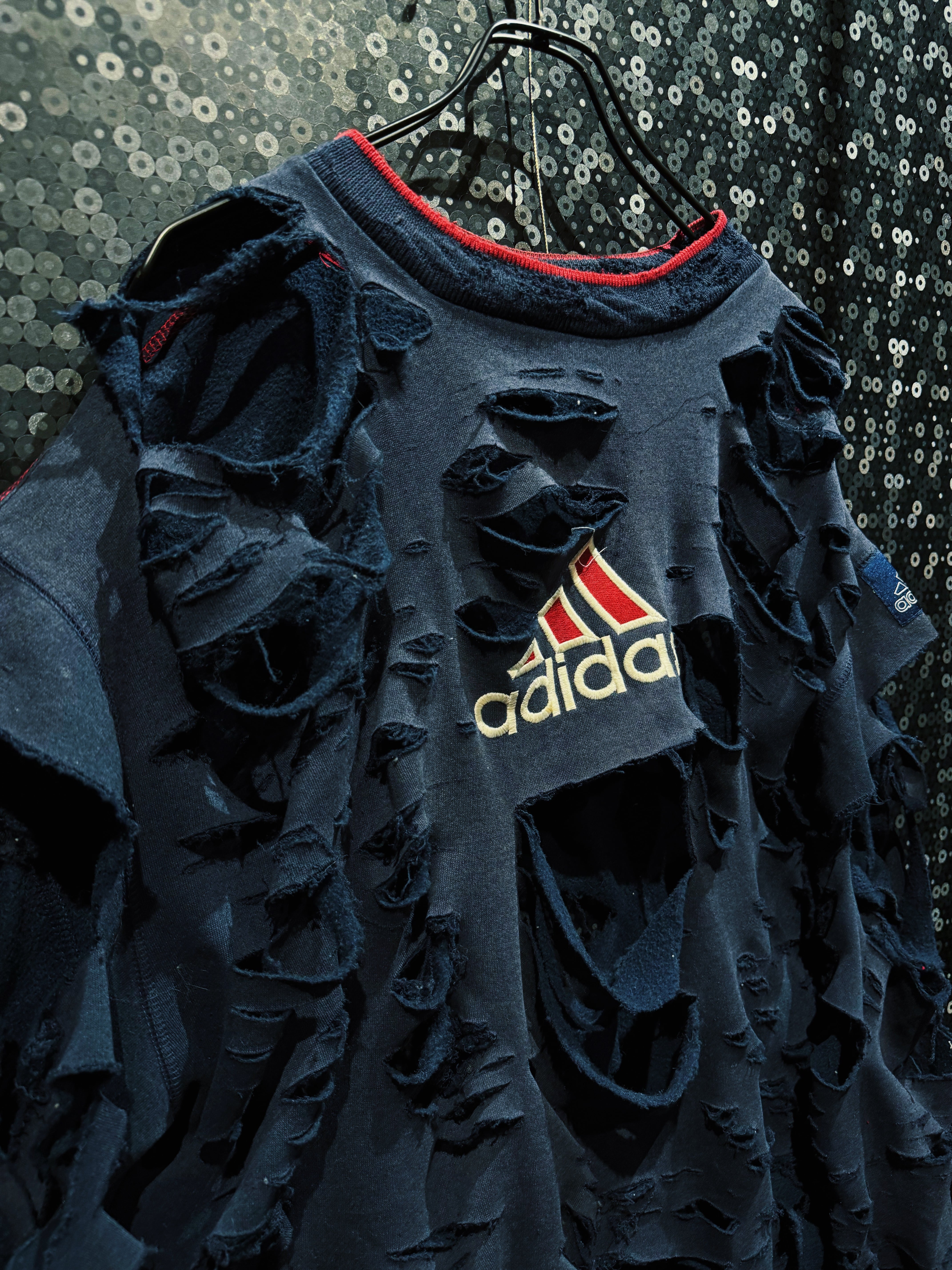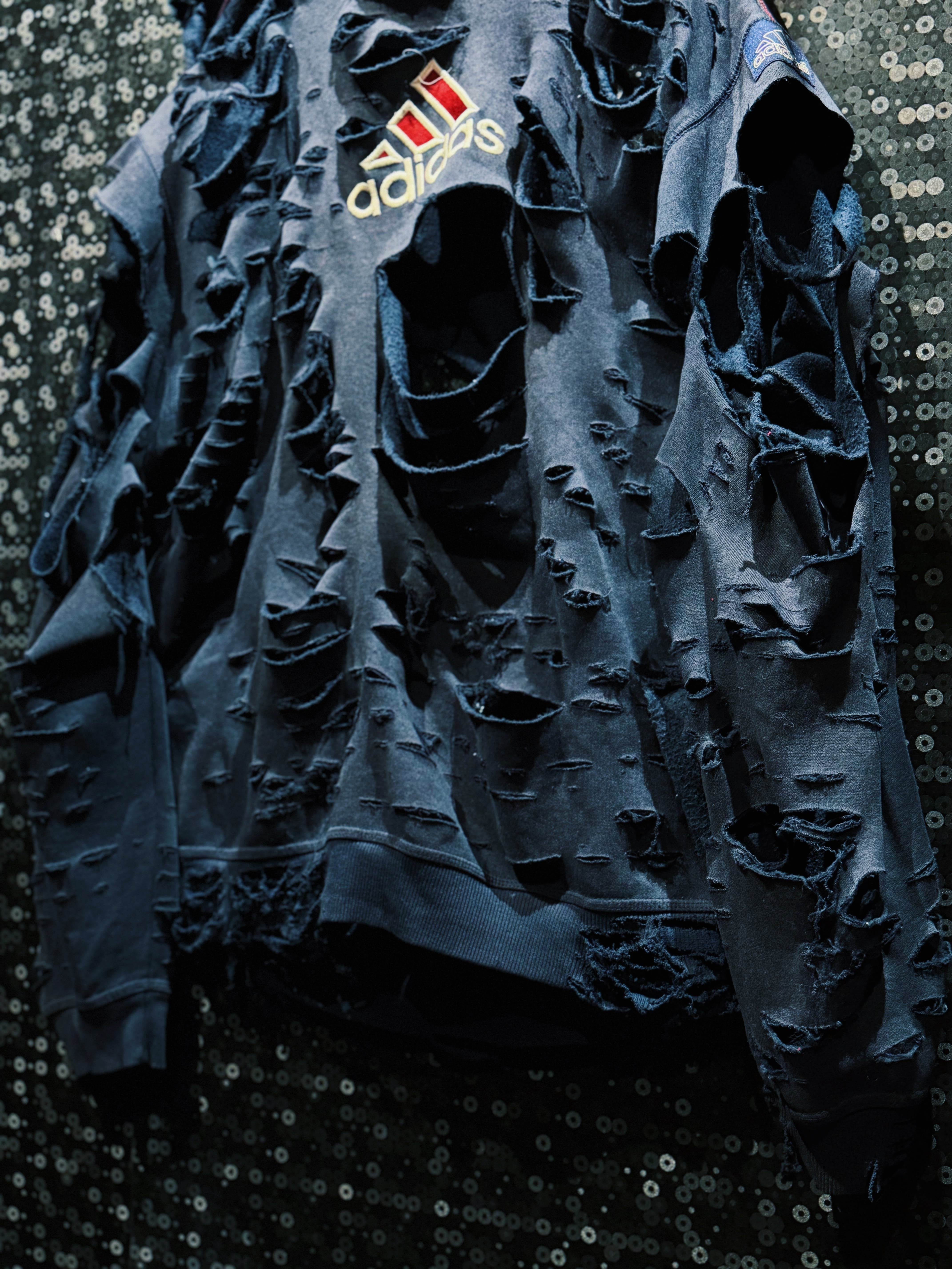 ÆIEM独自の“boro”リメイクを施した、adidasヴィンテージ・モックネックスウェットのスペシャルピース。ネイビーボディに象徴的なレッド×ホワイトのパフォーマンスロゴが映えるクラシックな一着を、全体へ徹底的なクラッシュ加工を施すことで再構築。大小さまざまな破れがレイヤー状に刻まれ、まるで長年の使用と戦いの痕跡が刻まれたような立体的テクスチャーが生まれている。