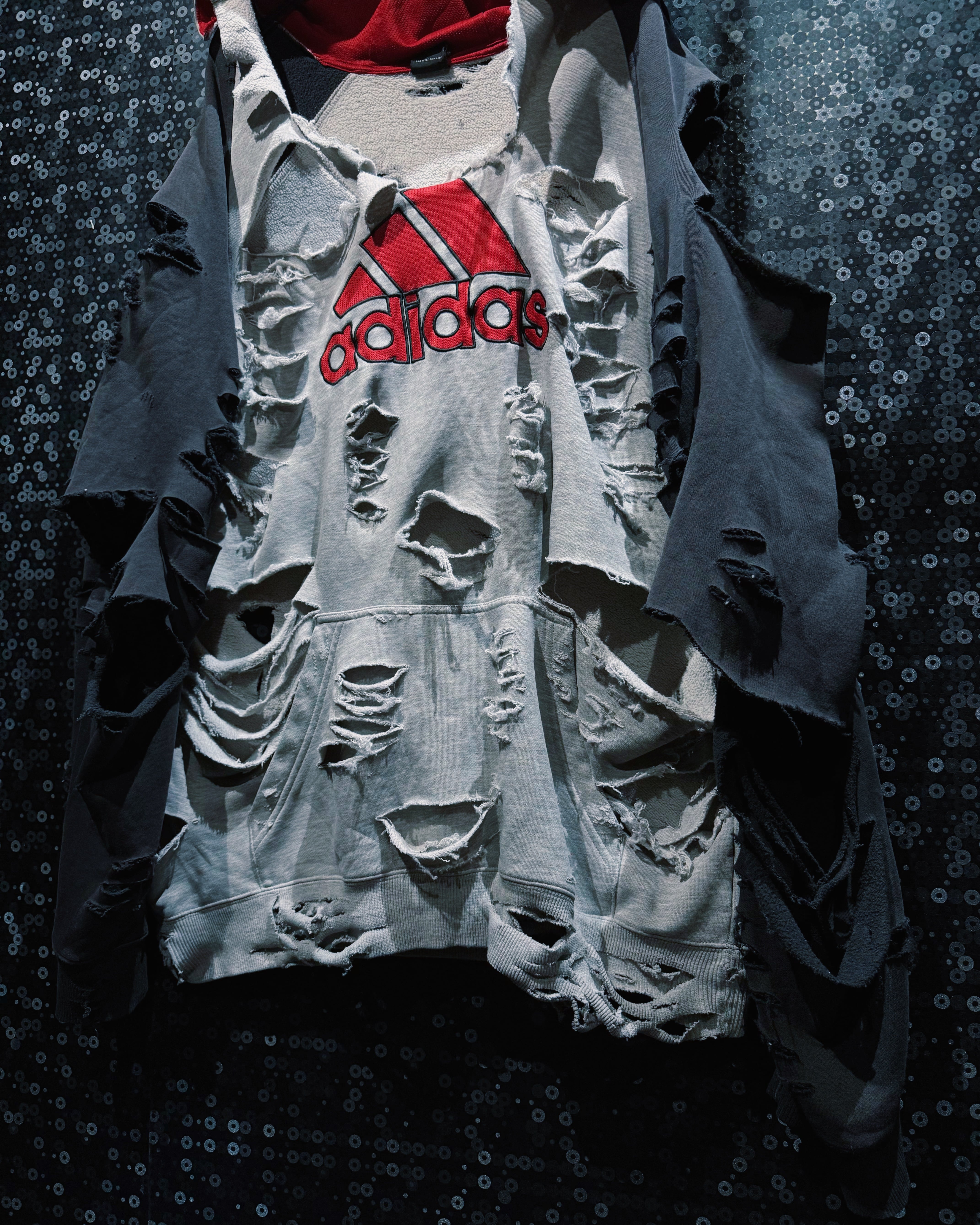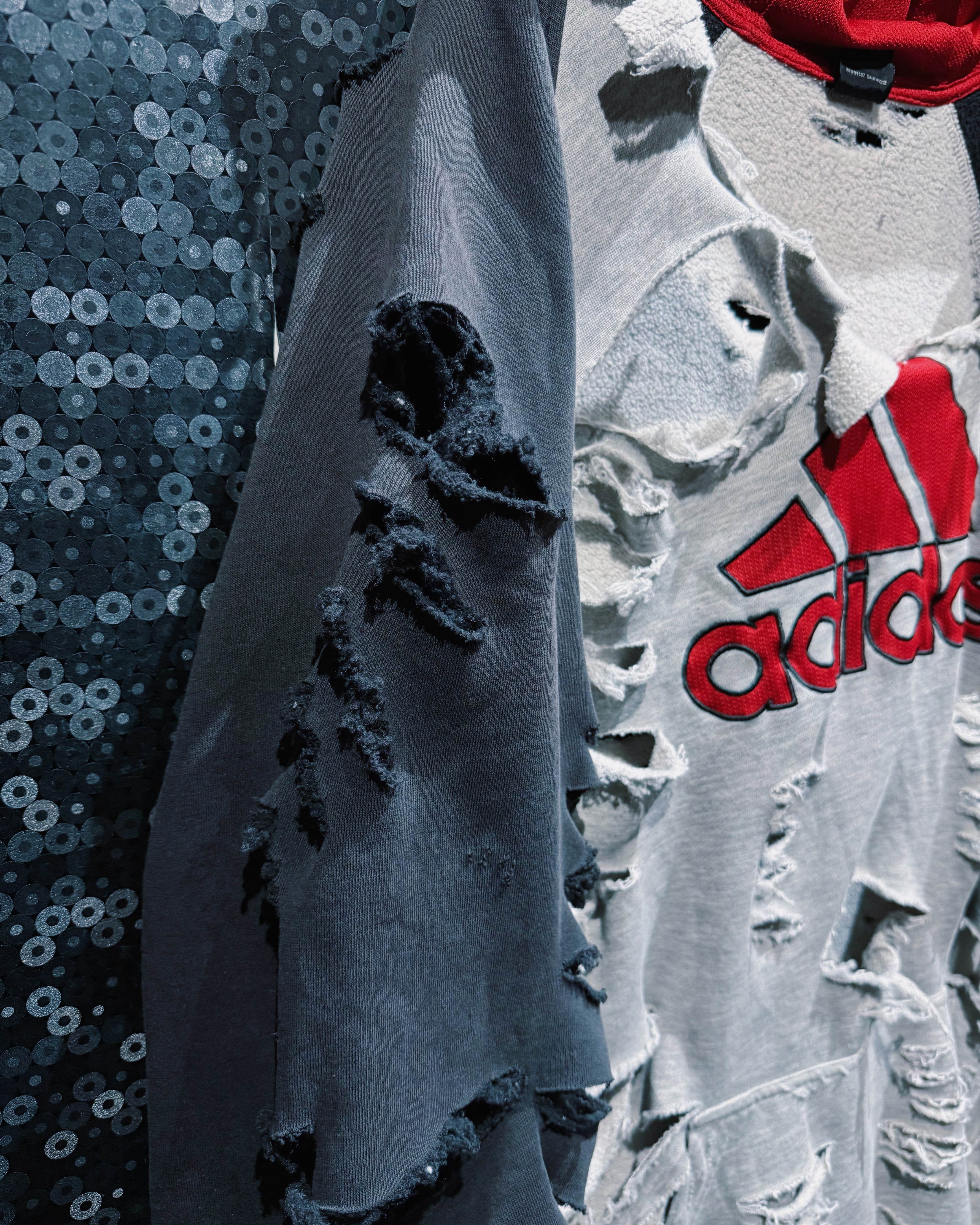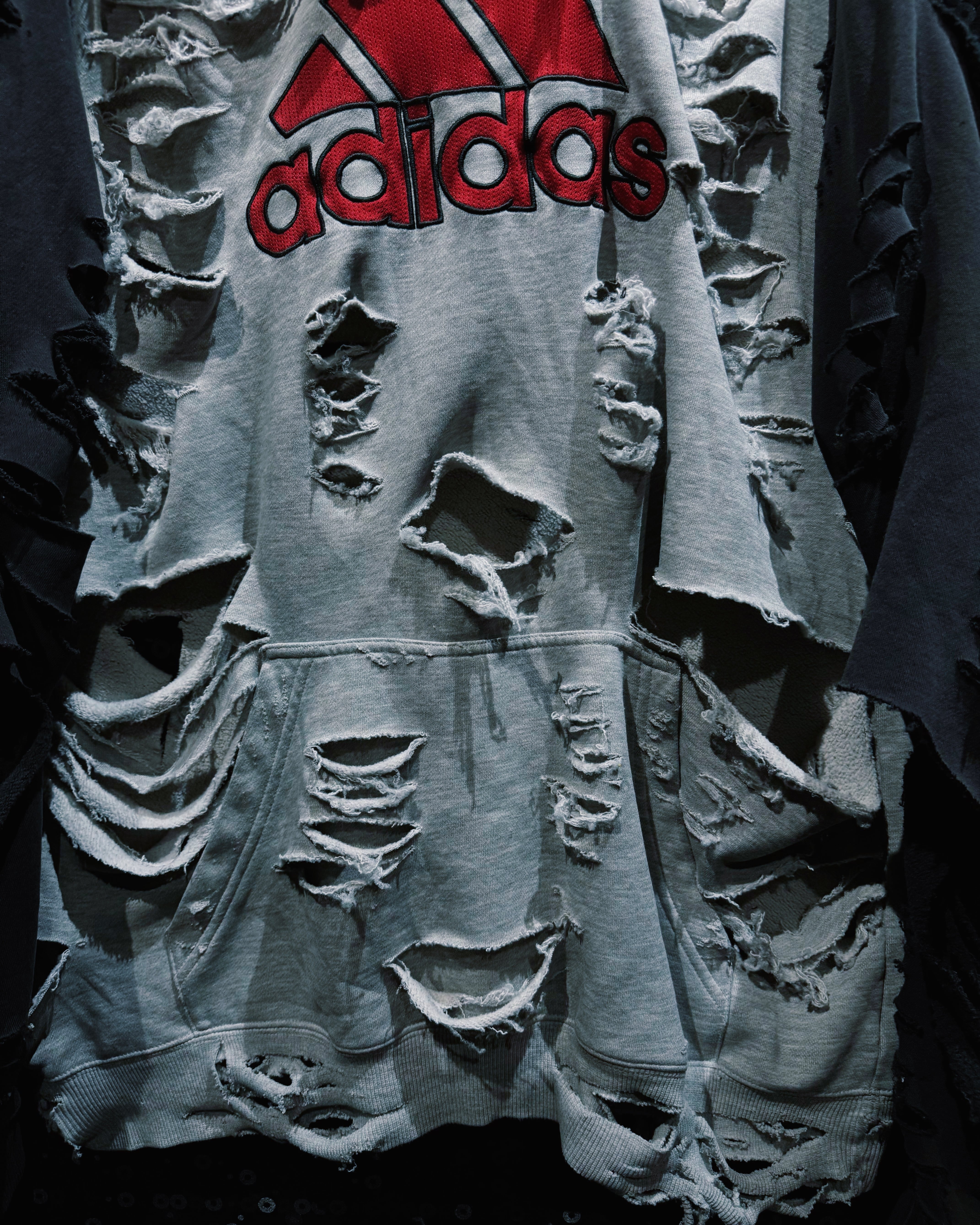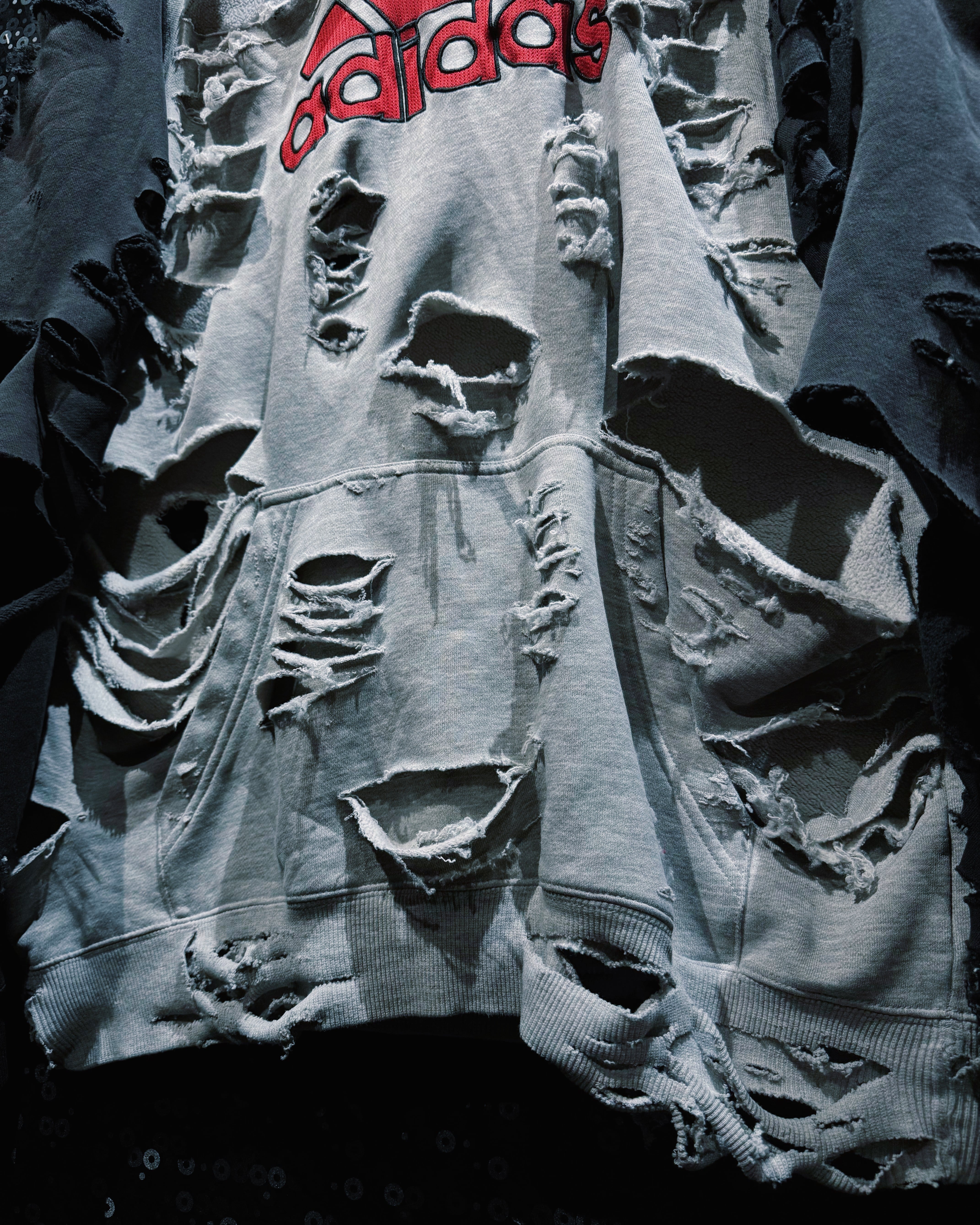 インナーの赤いフードがアウターのグレーから覗くデザインは、スポーツ×グランジ×Y2Kの要素を同時に感じさせるÆIEMならではの独自解釈。ボロ加工は浅い削りから深い破れまで丁寧に積み重ねられ、1点ずつ異なる立体的な表情を形成。袖にも徹底的にクラッシュを施し、全体がまるで彫刻のような“破壊と再生”の質感に仕上がっている。