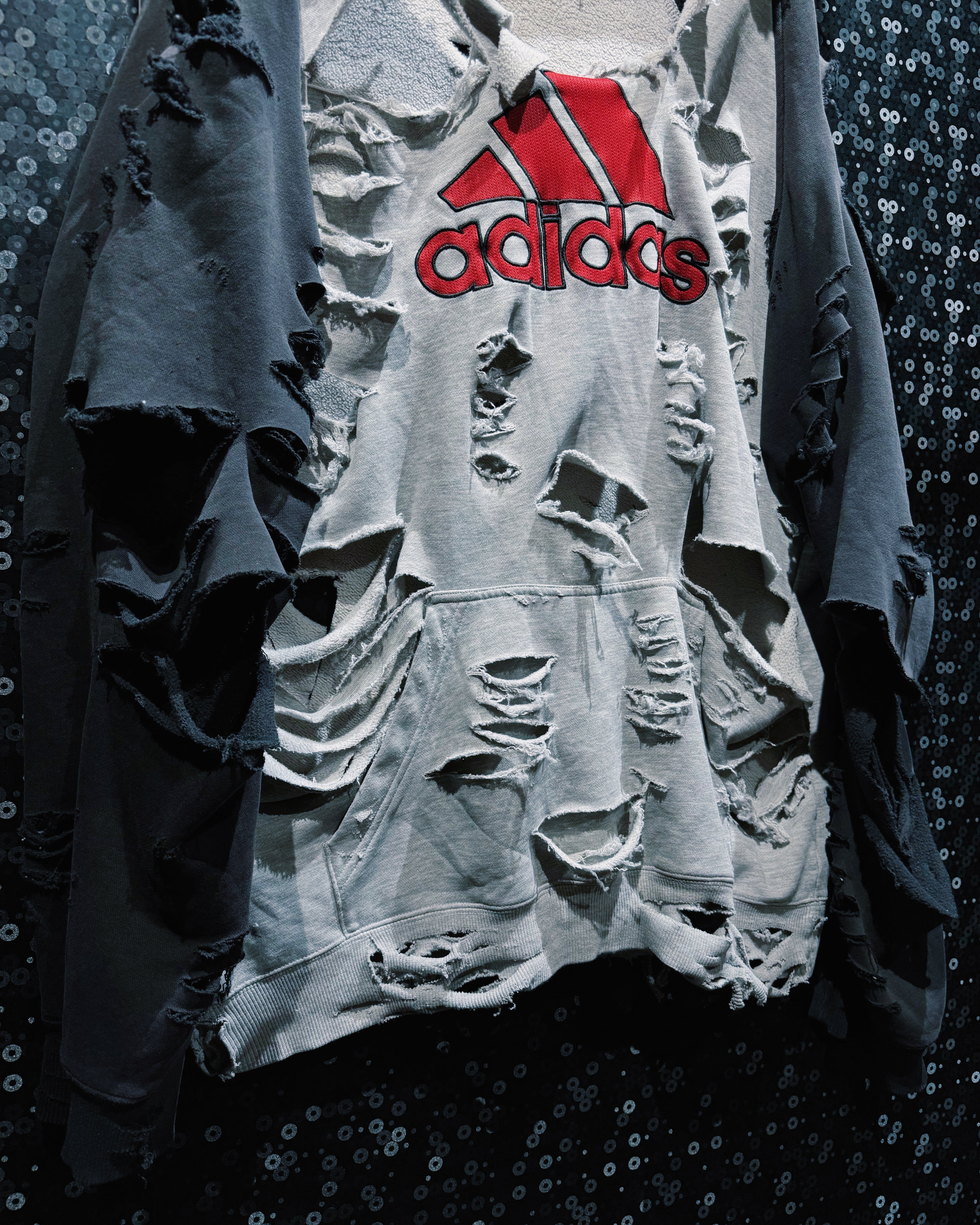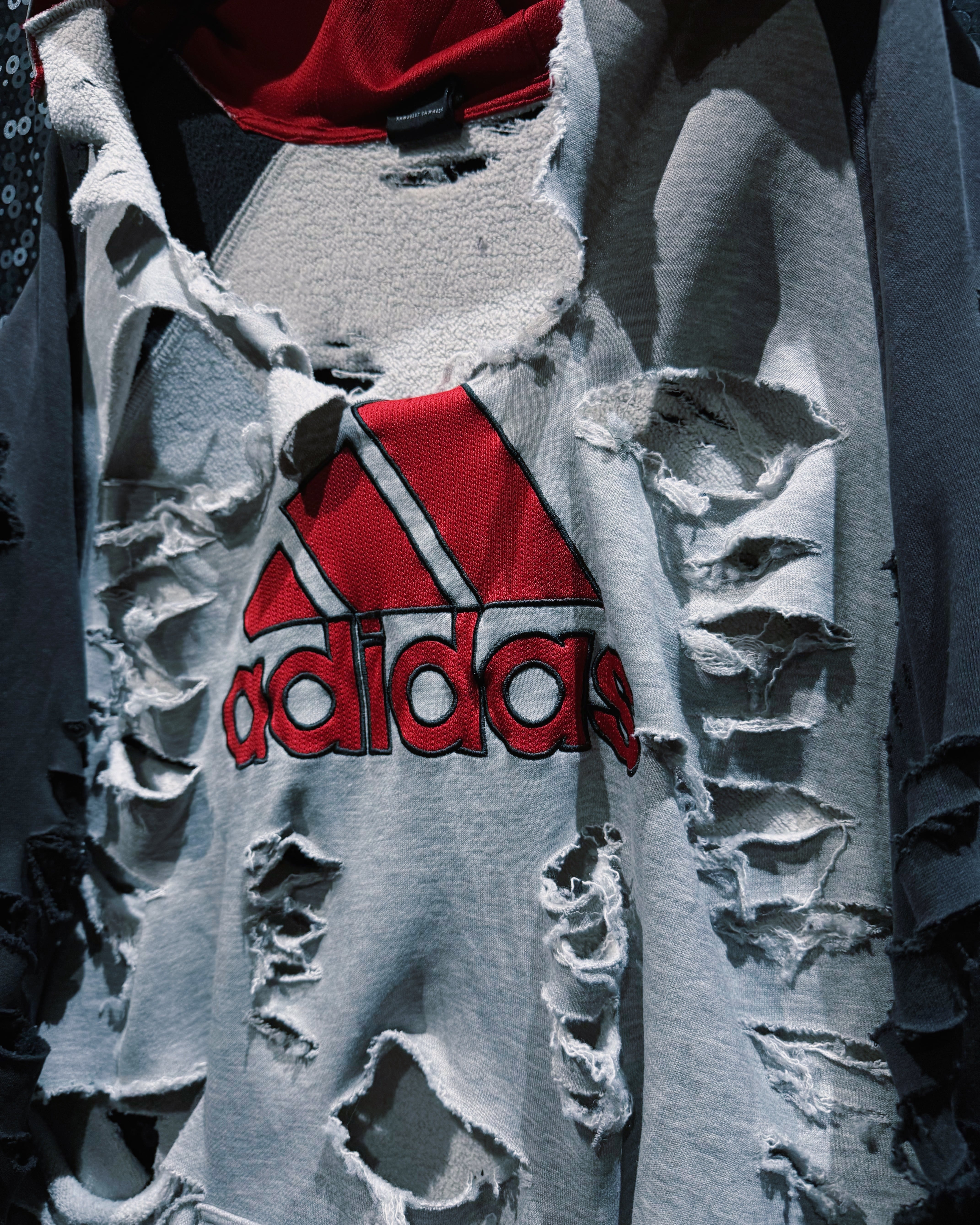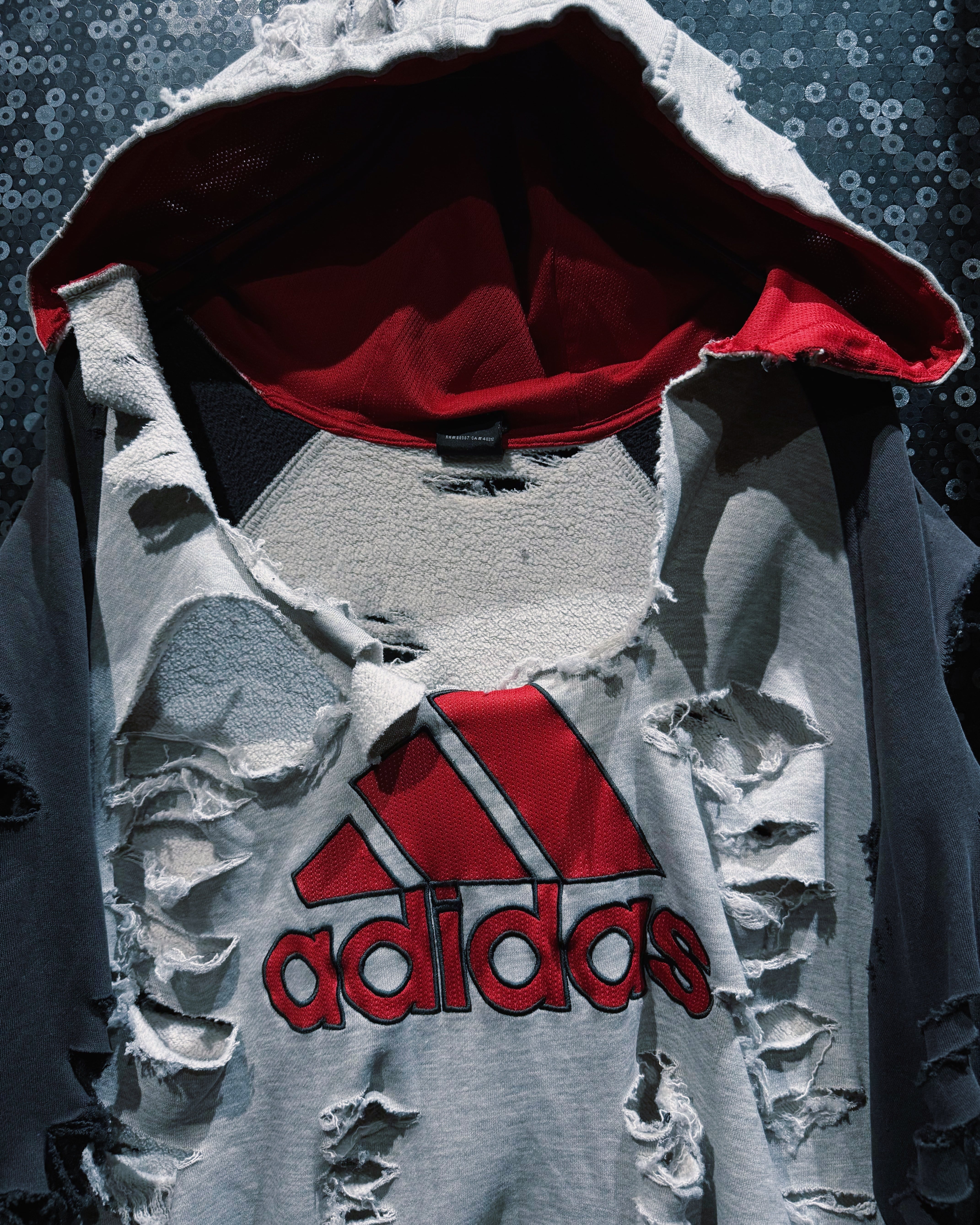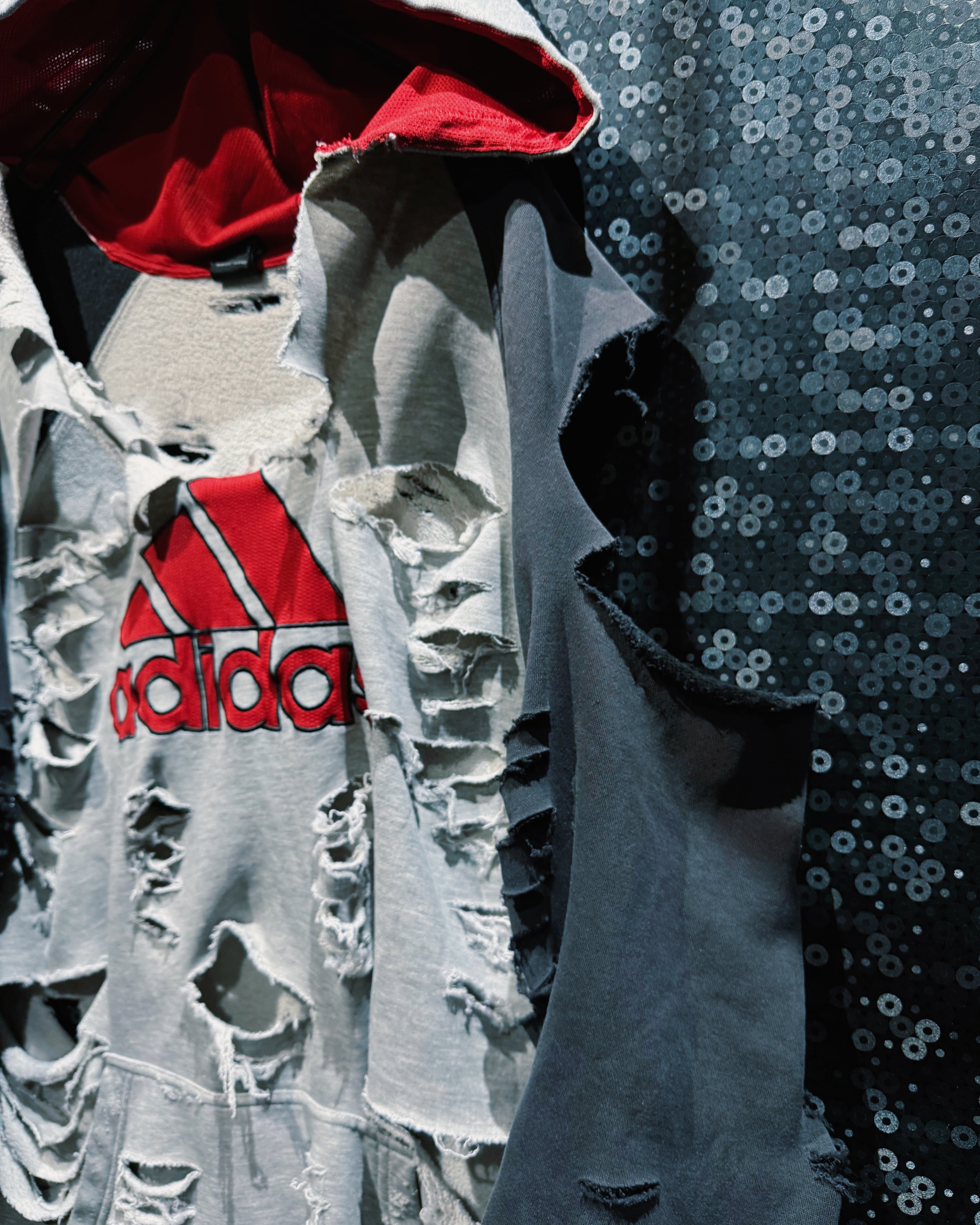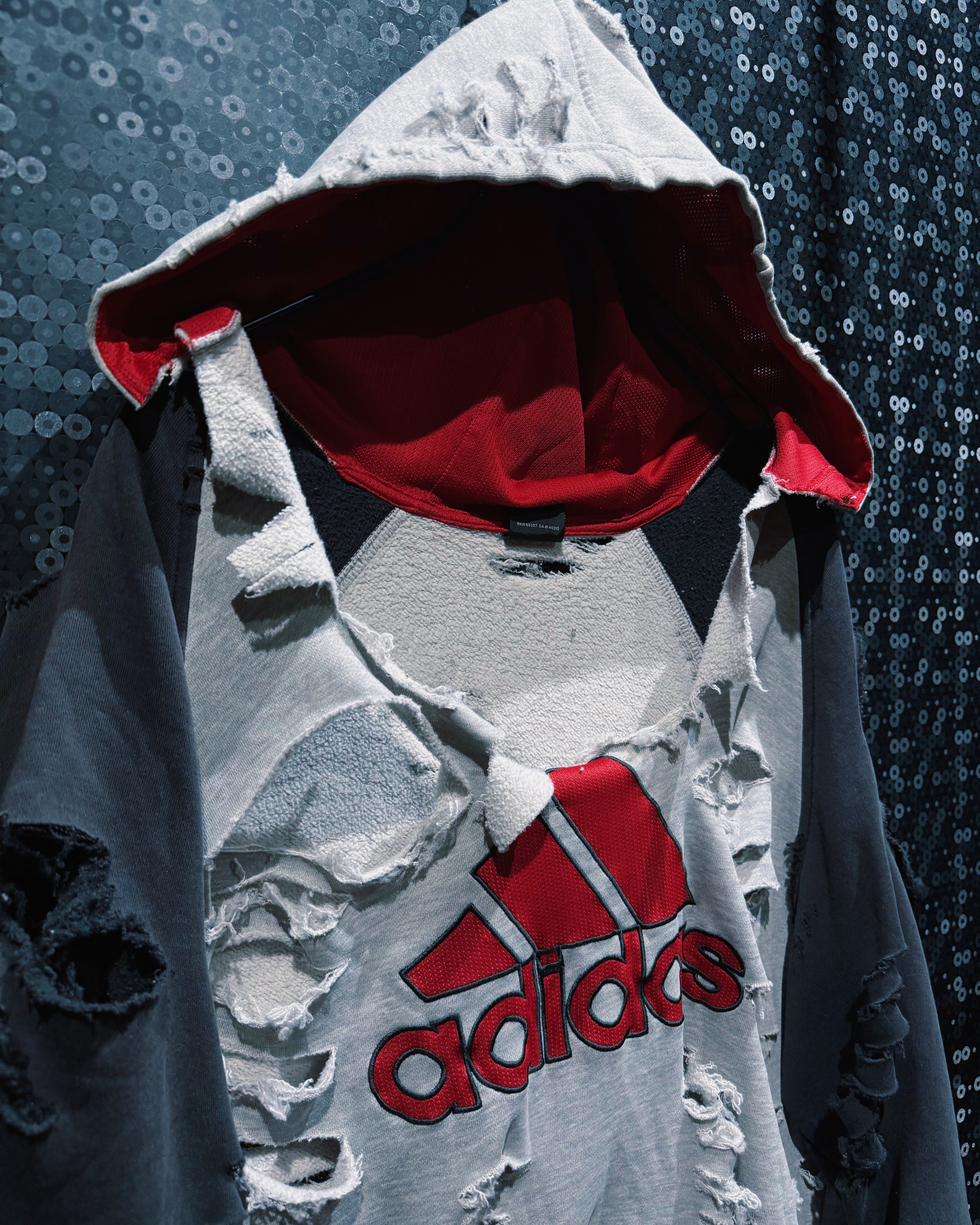 ÆIEM独自の“boro”リメイクを施した、adidasヴィンテージ・パフォーマンスロゴ期のスイッチングフーディープルオーバー。フロントには象徴的なレッドのパフォーマンスロゴを配したグレーボディ、その外側にブラックのフーディーを重ねるように再構築した二重構造が特徴。まるで“皮膚がめくれた”ように見える大胆なクラッシュ加工が全体に走り、レイヤーの奥から覗く赤と黒のコントラストが圧巻の存在感を生み出す。