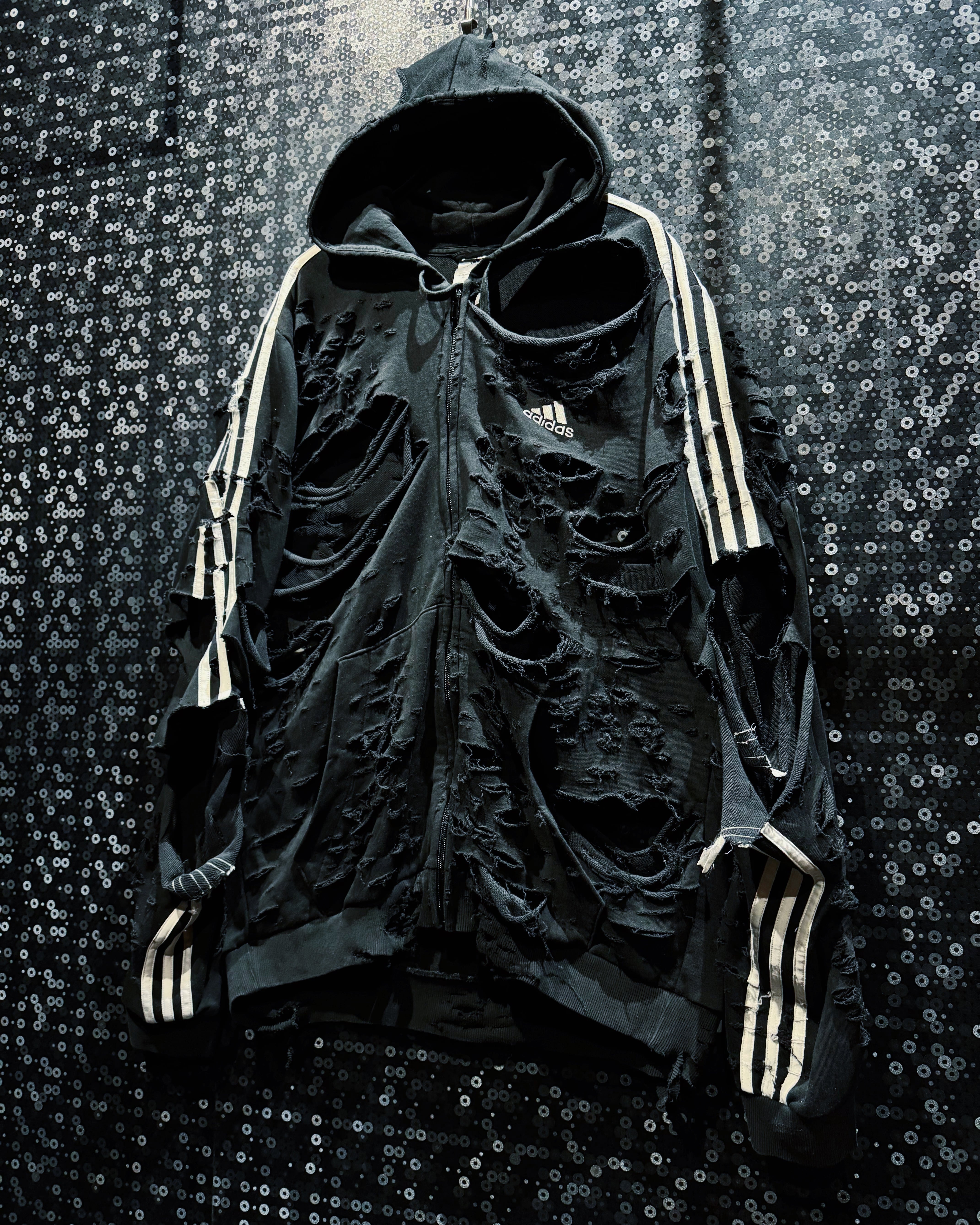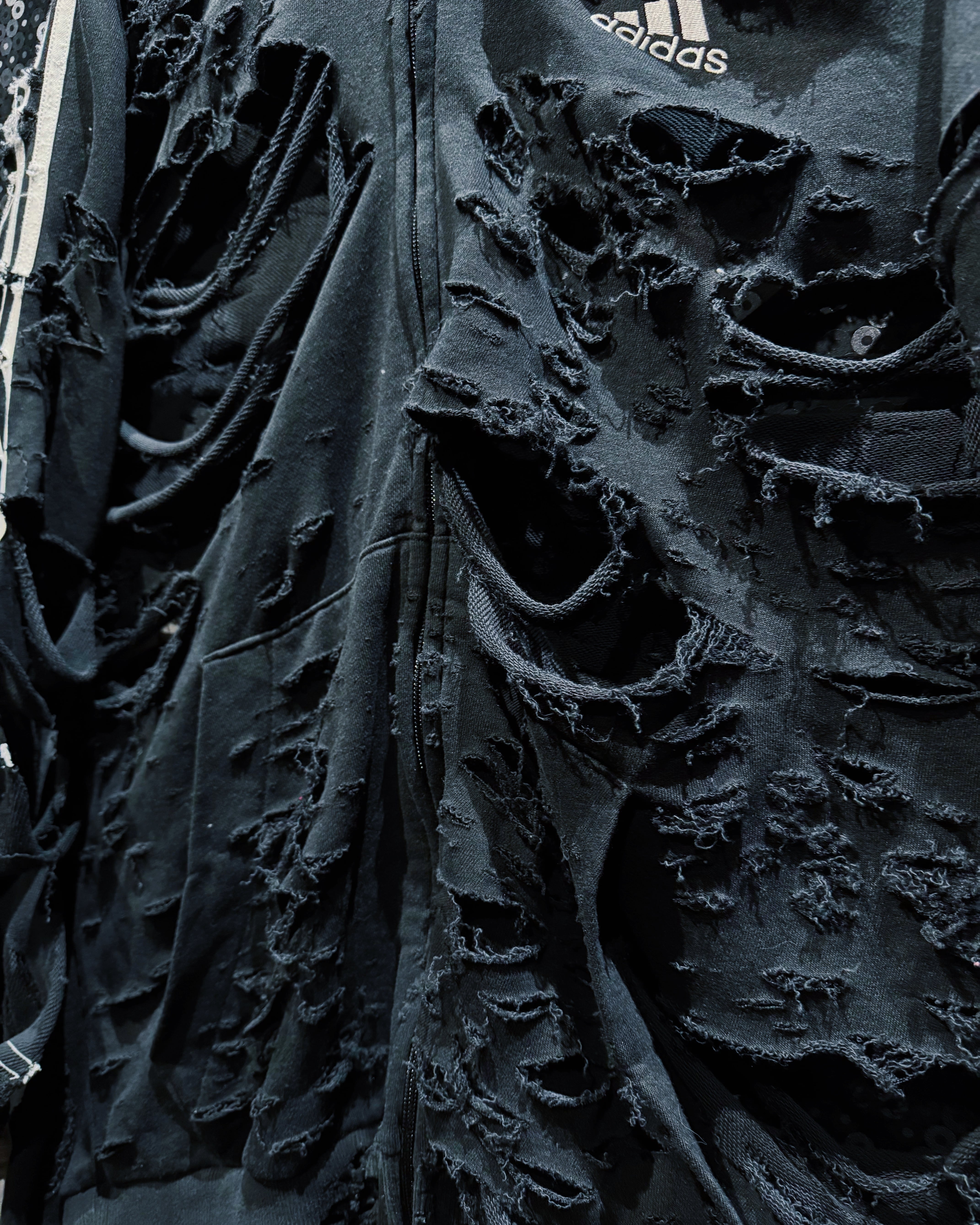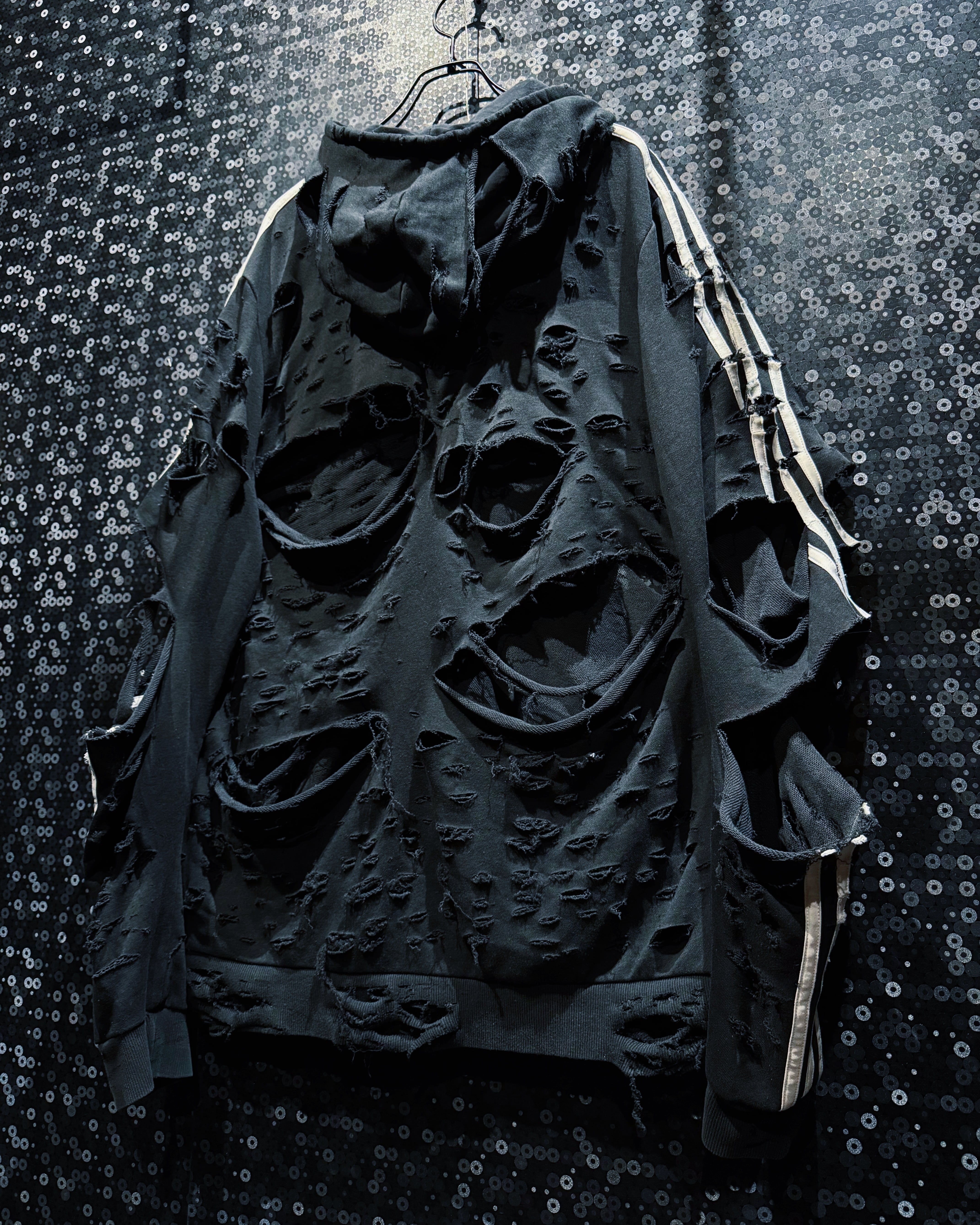 ダメージの入り方、裂け目の深さ、ほつれの表情まで計算された“アートとしてのボロ”。全体のシルエットは崩さずに、攻撃的なビジュアルと着やすさを両立させたÆIEMらしい再構築。まさに一点モノの迫力を纏える、圧倒的存在感のフルジップフーディー。