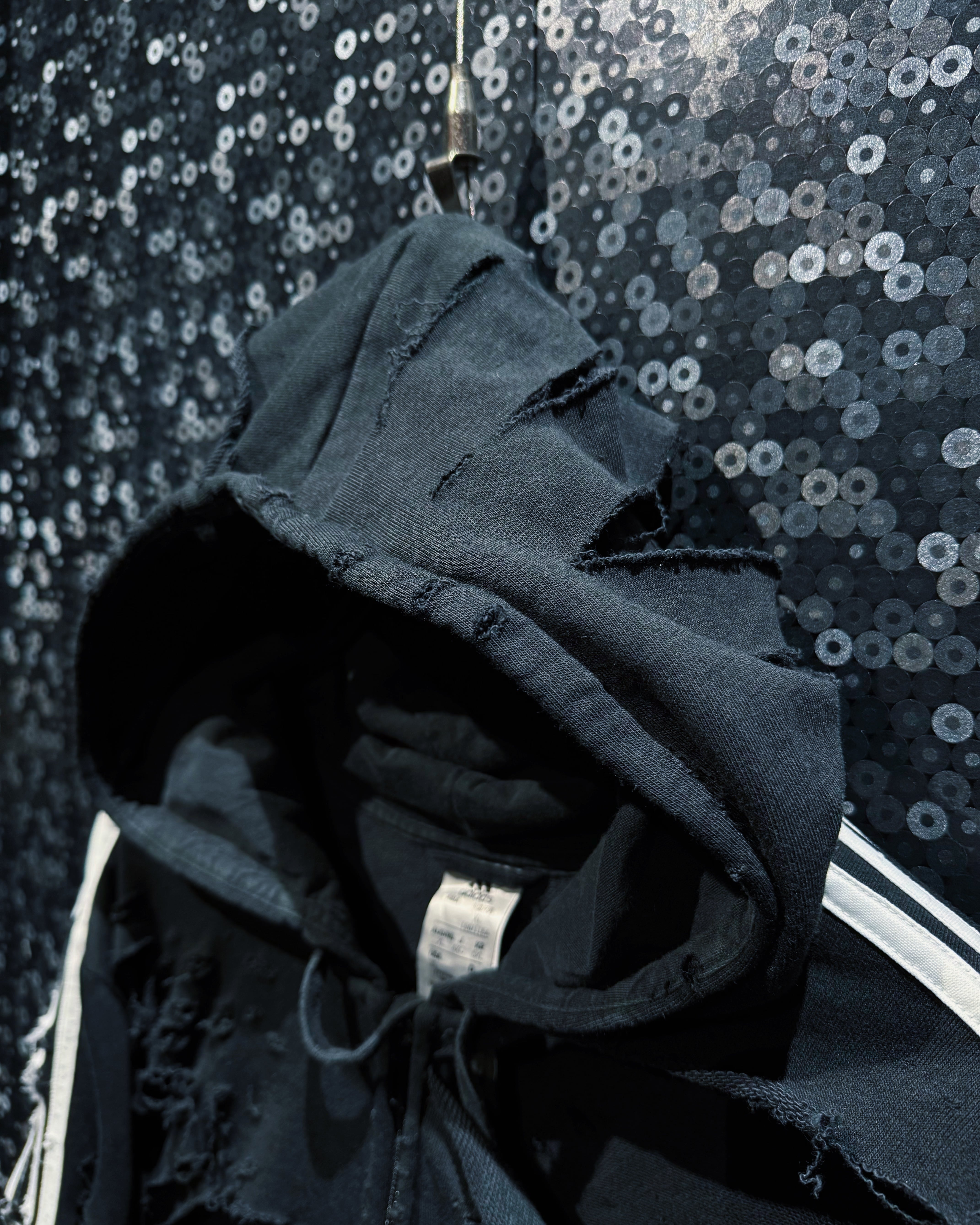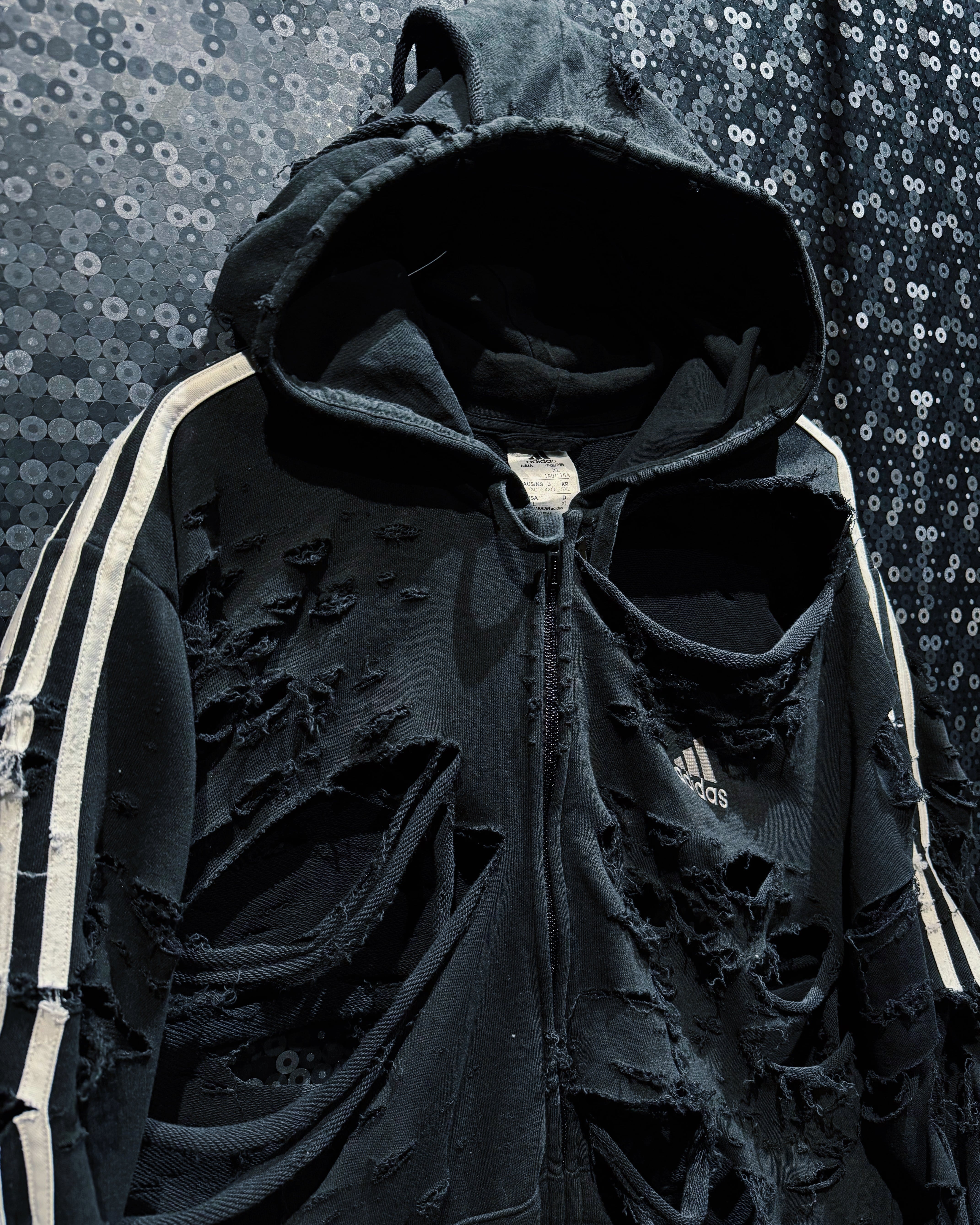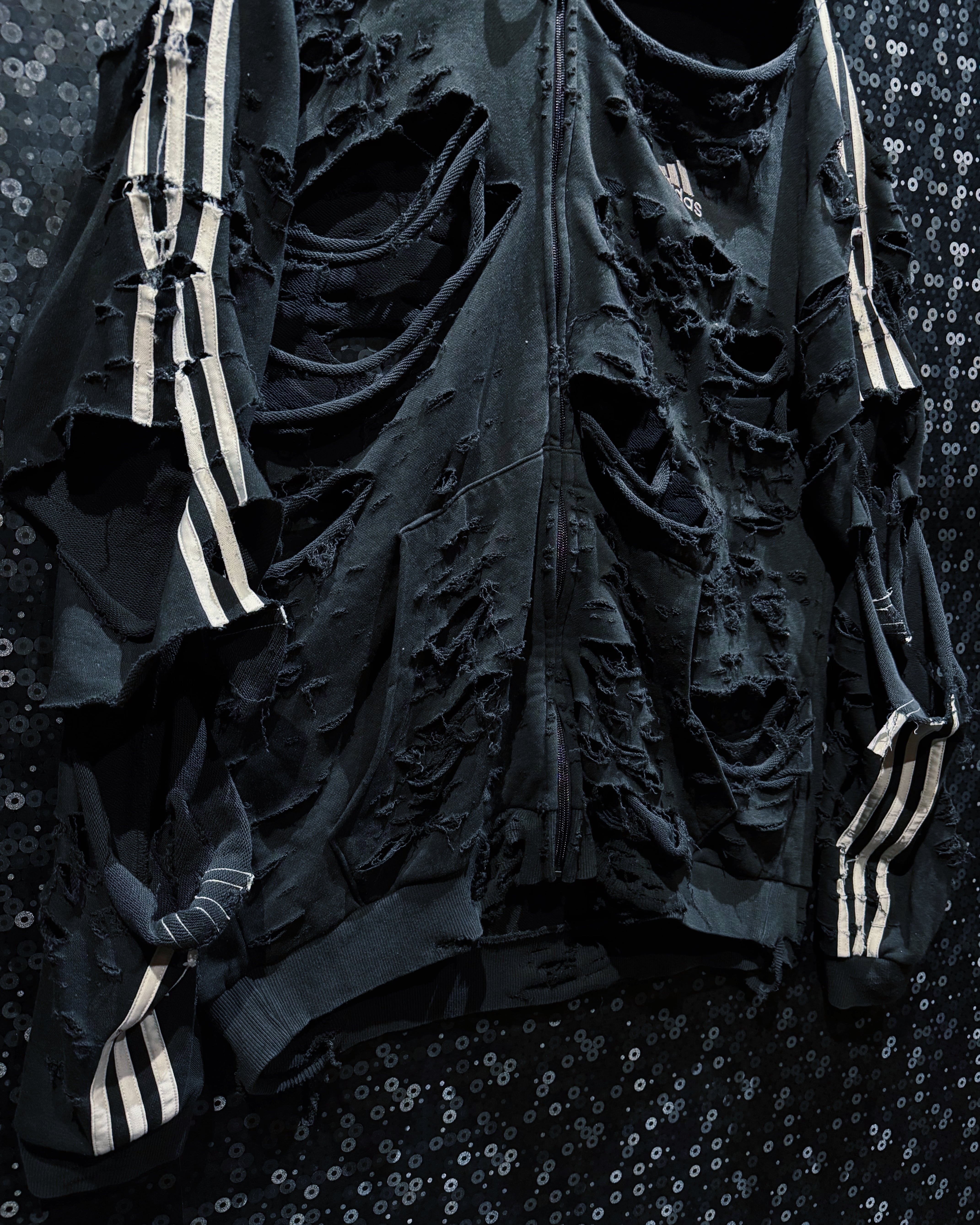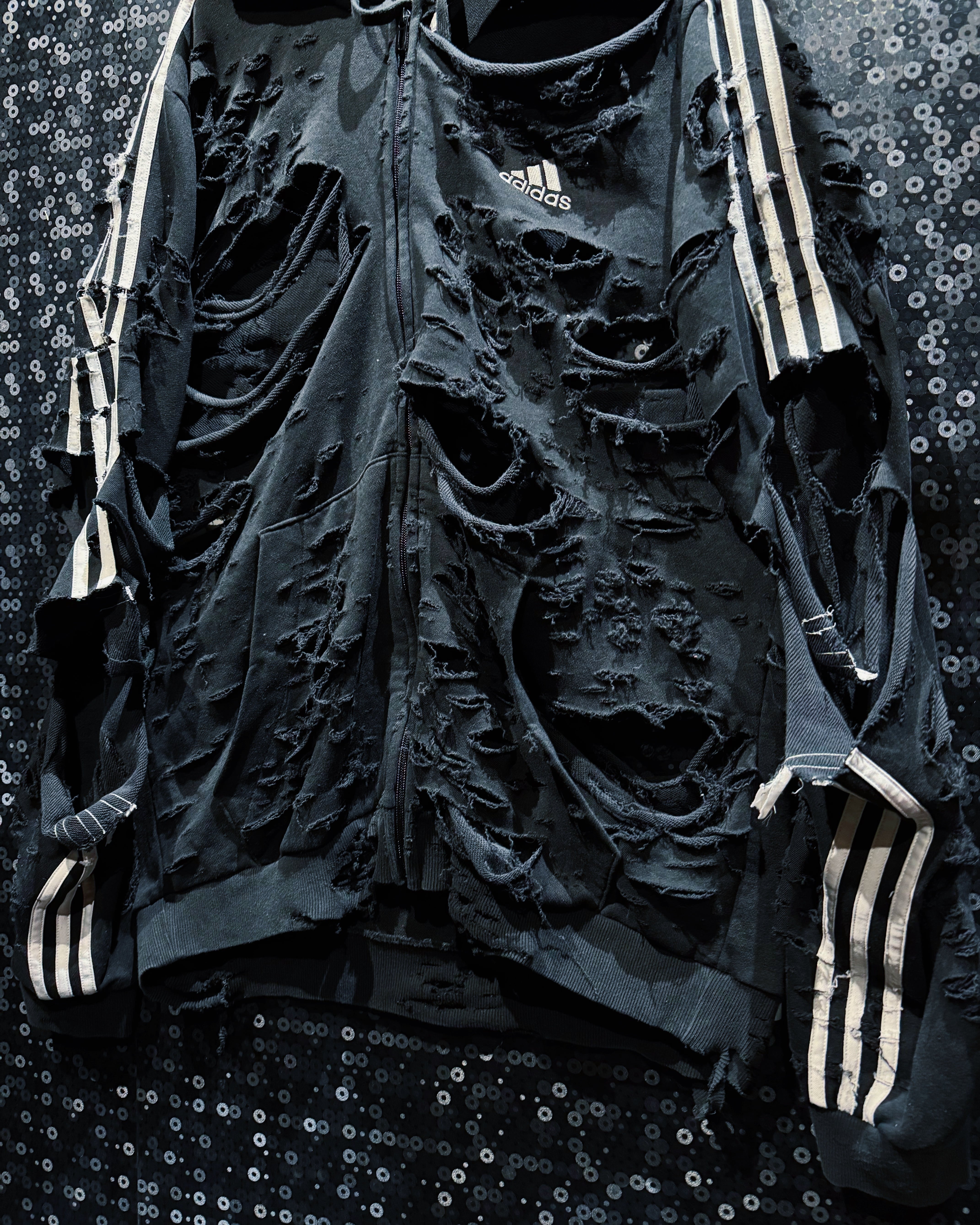 ダメージの入り方、裂け目の深さ、ほつれの表情まで計算された“アートとしてのボロ”。全体のシルエットは崩さずに、攻撃的なビジュアルと着やすさを両立させたÆIEMらしい再構築。まさに一点モノの迫力を纏える、圧倒的存在感のフルジップフーディー。