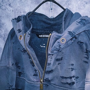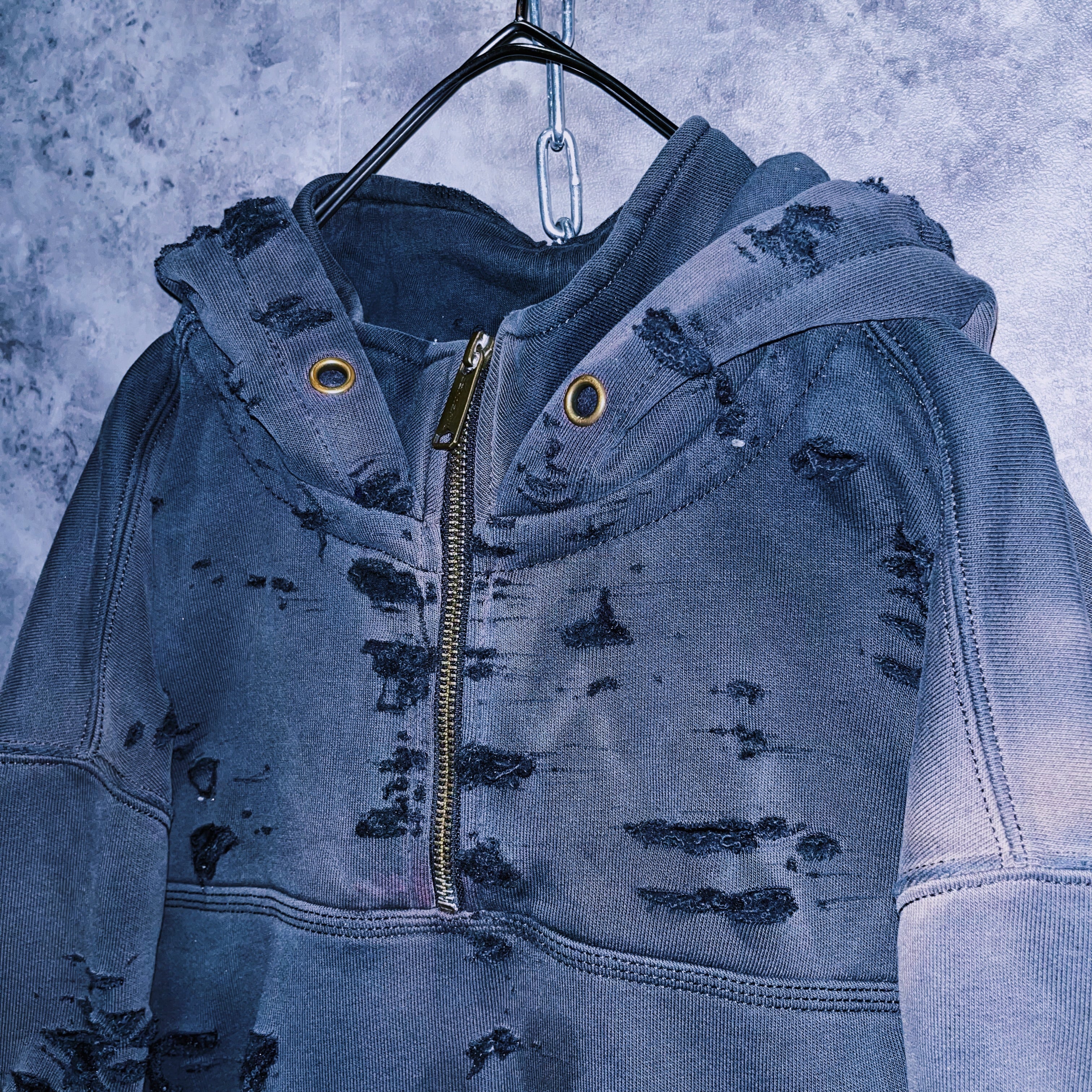 ネック部分のハーフジップは口元が隠れるほどの絶妙な高さでミステリアスな雰囲気。そこに当店自慢のボロカスタムを施したことでよりダーク感が加速しています。