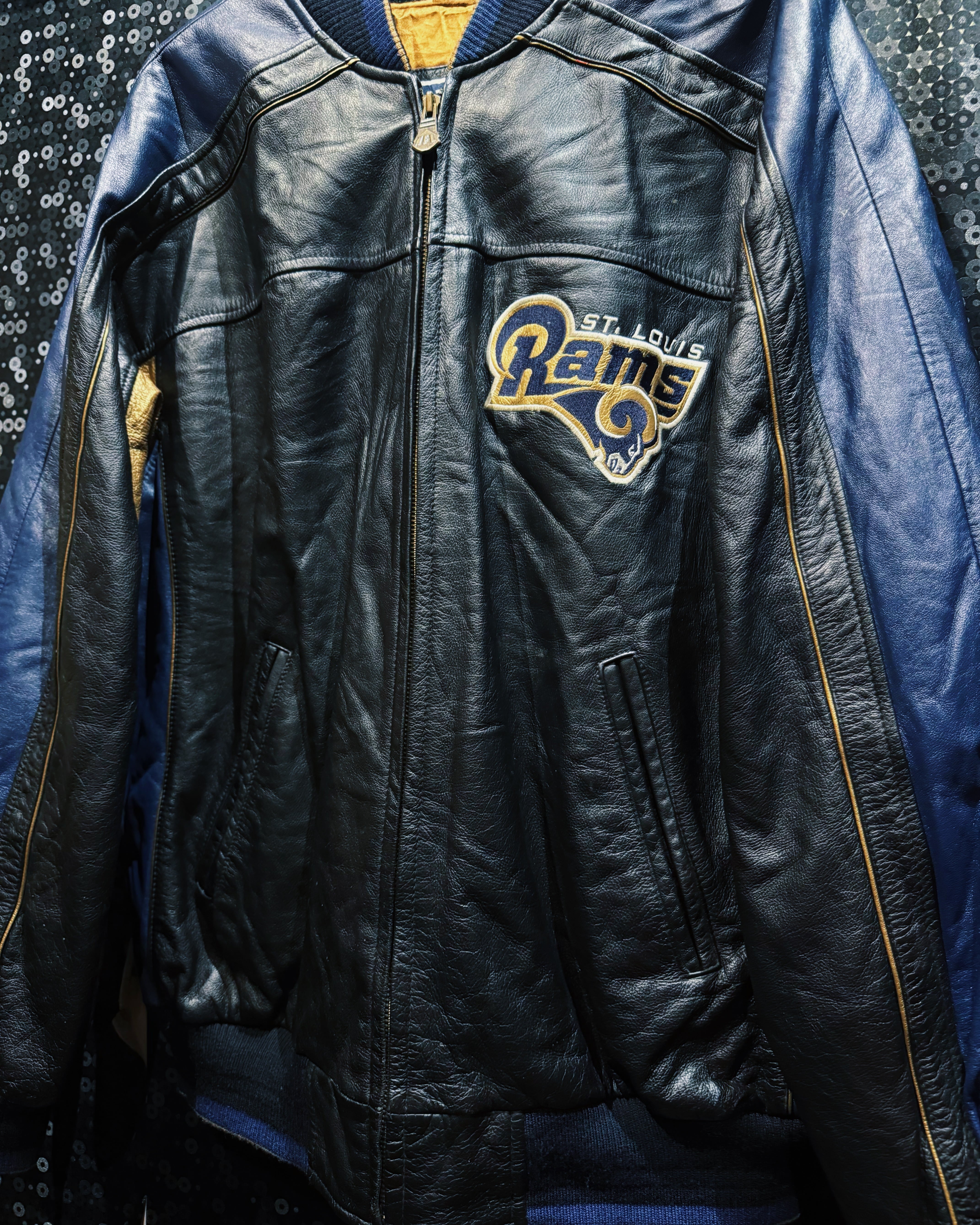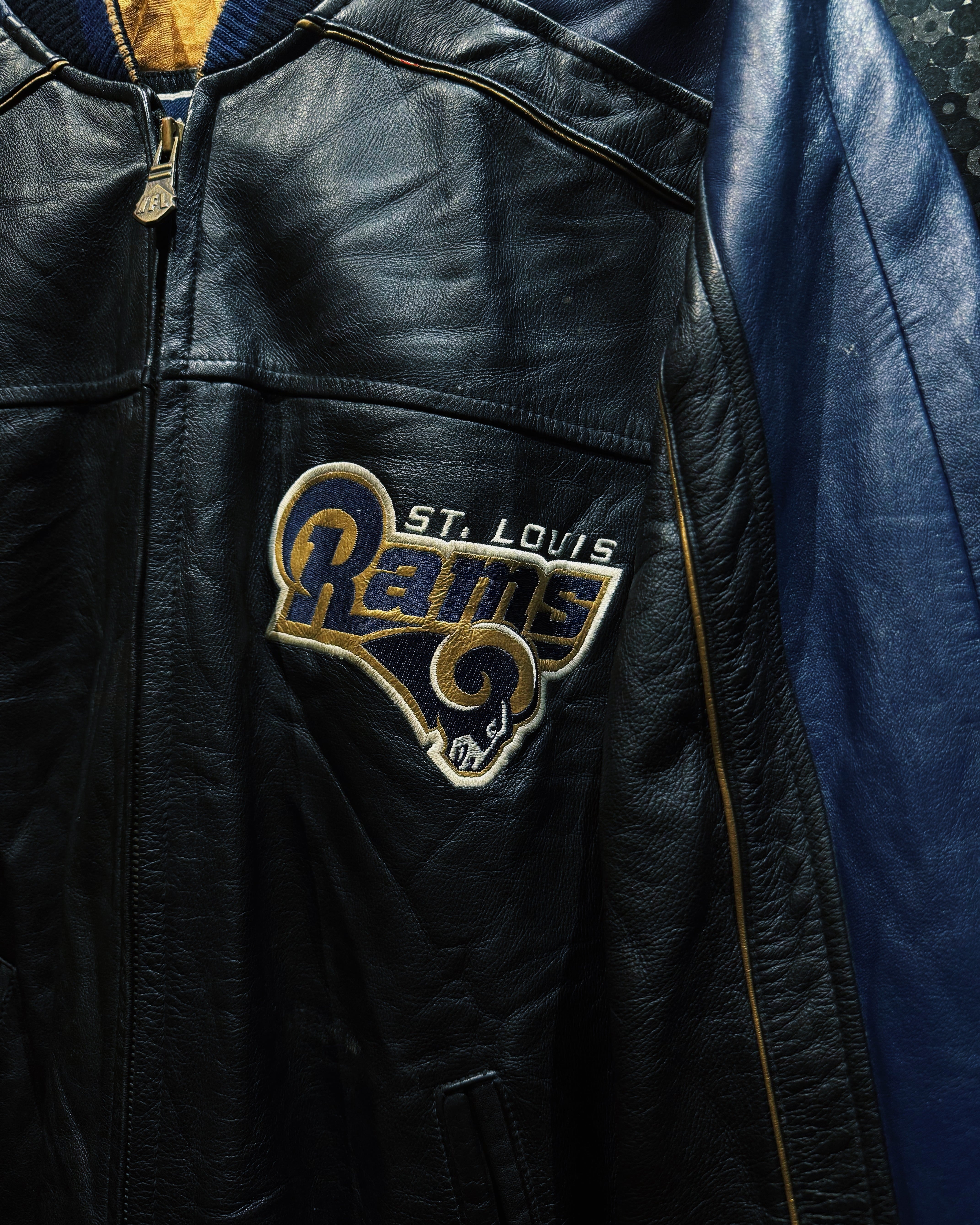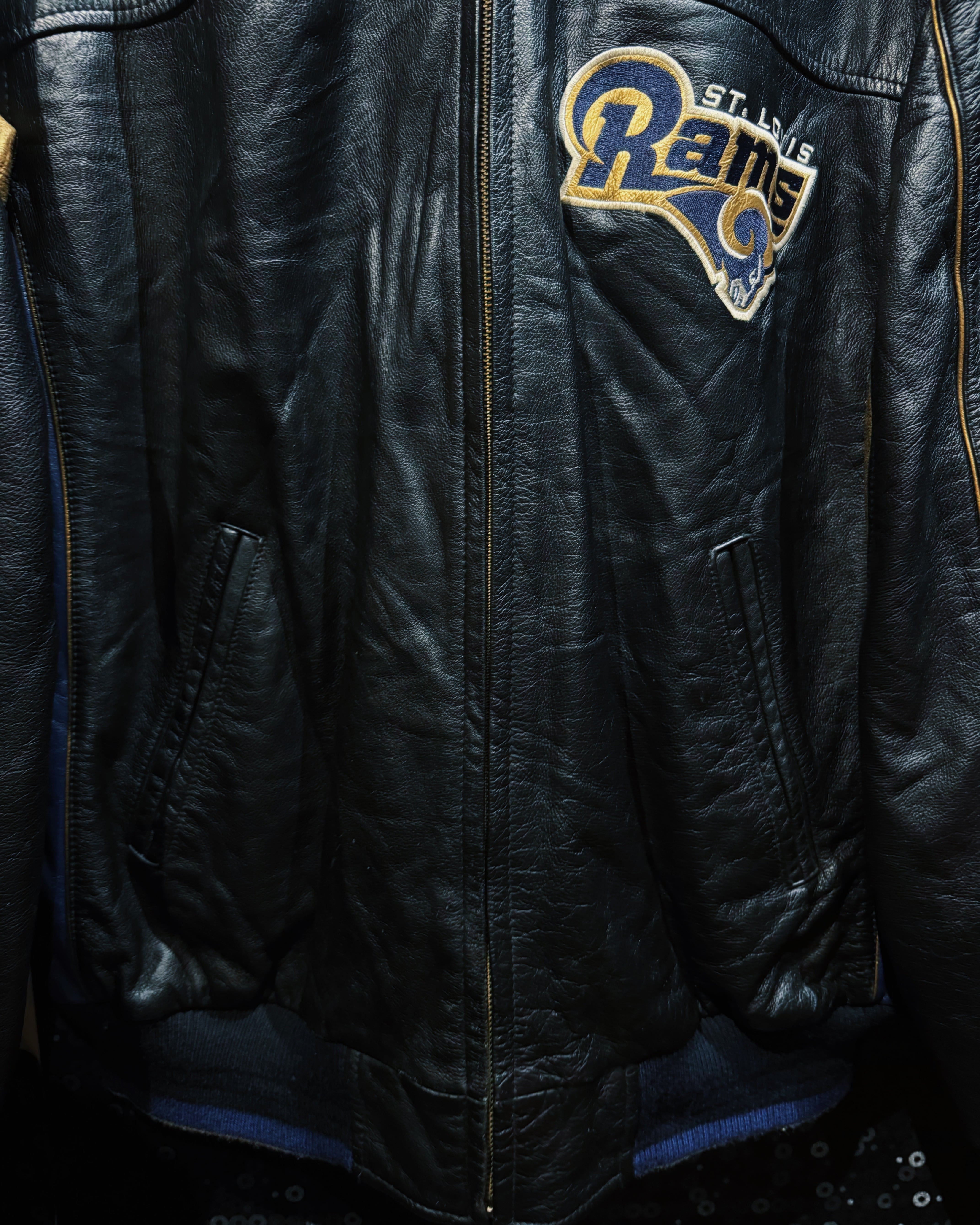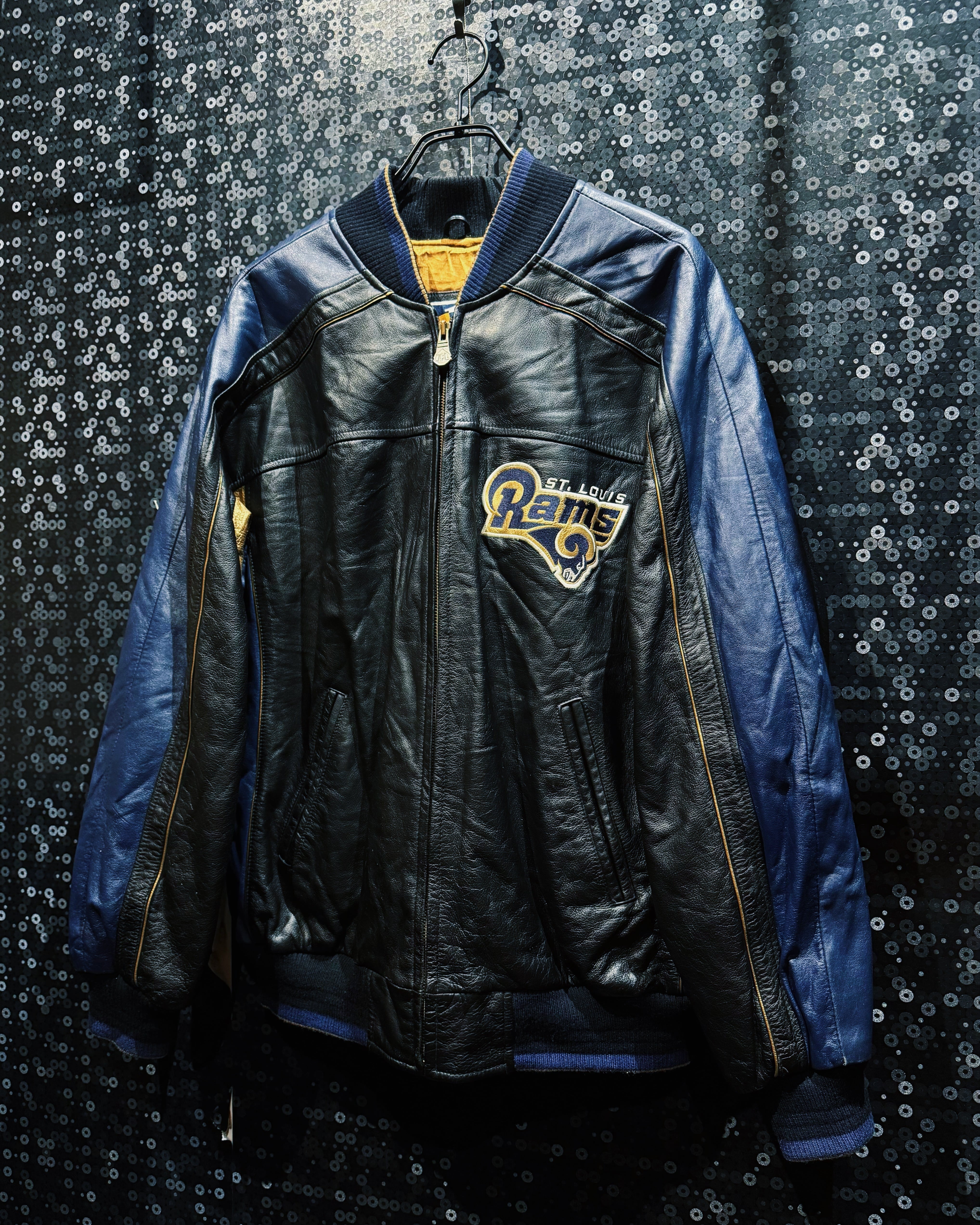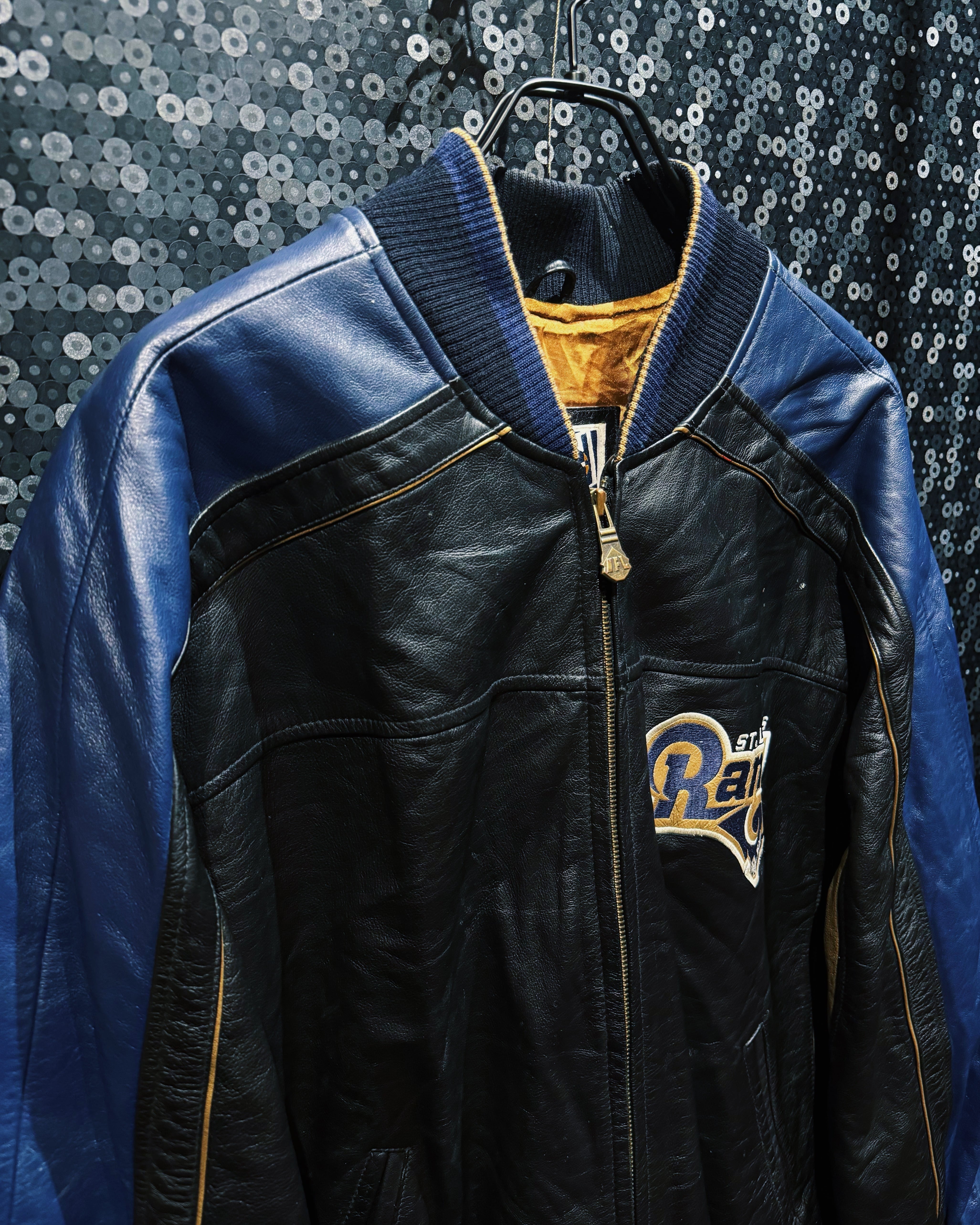 NFL公式ライセンスの希少なレザーボンバージャケット。St.Louis Rams(現 LA Rams)時代のデザインで、ブラック×ネイビーのツートーンレザーが男らしい重厚感を演出している。