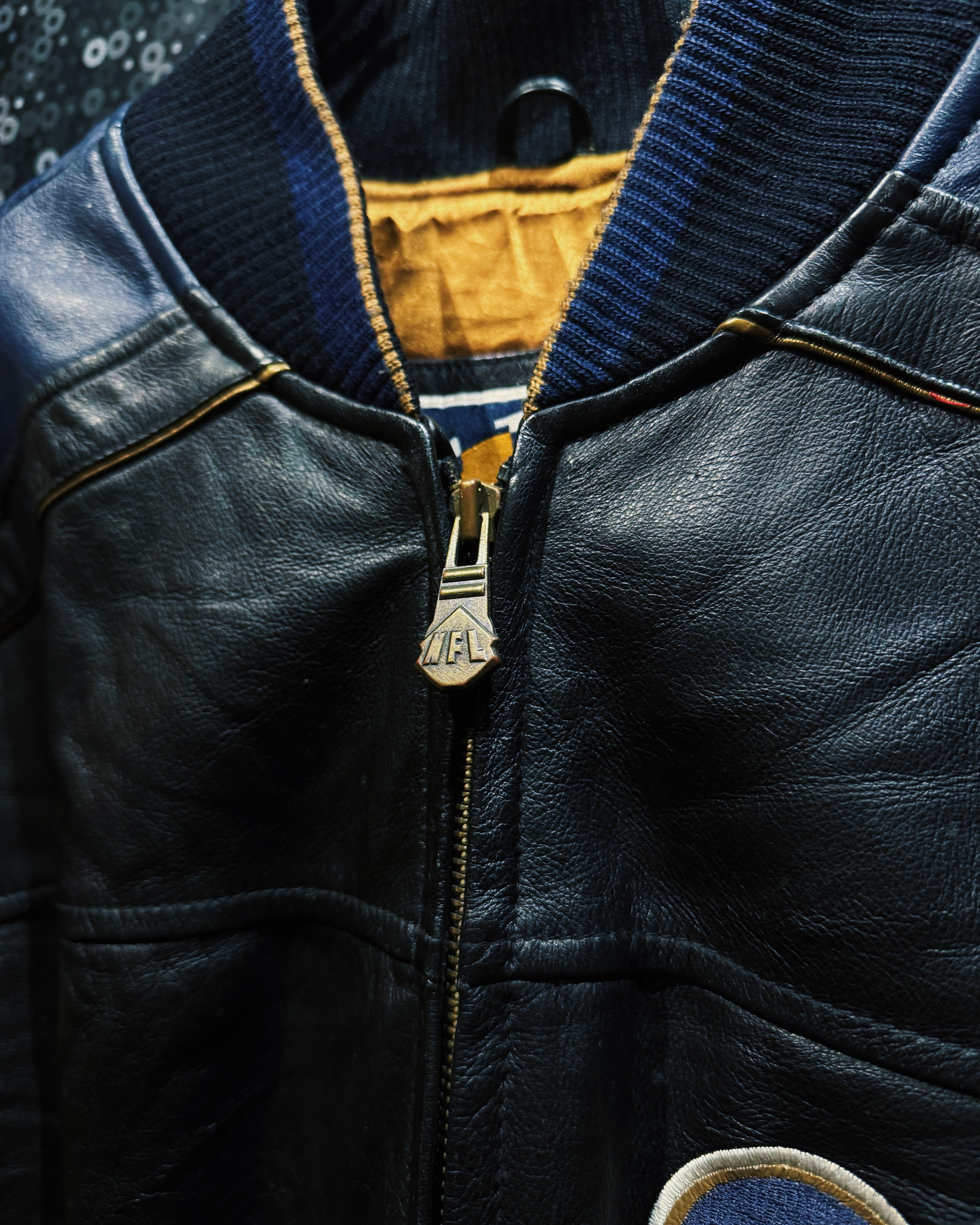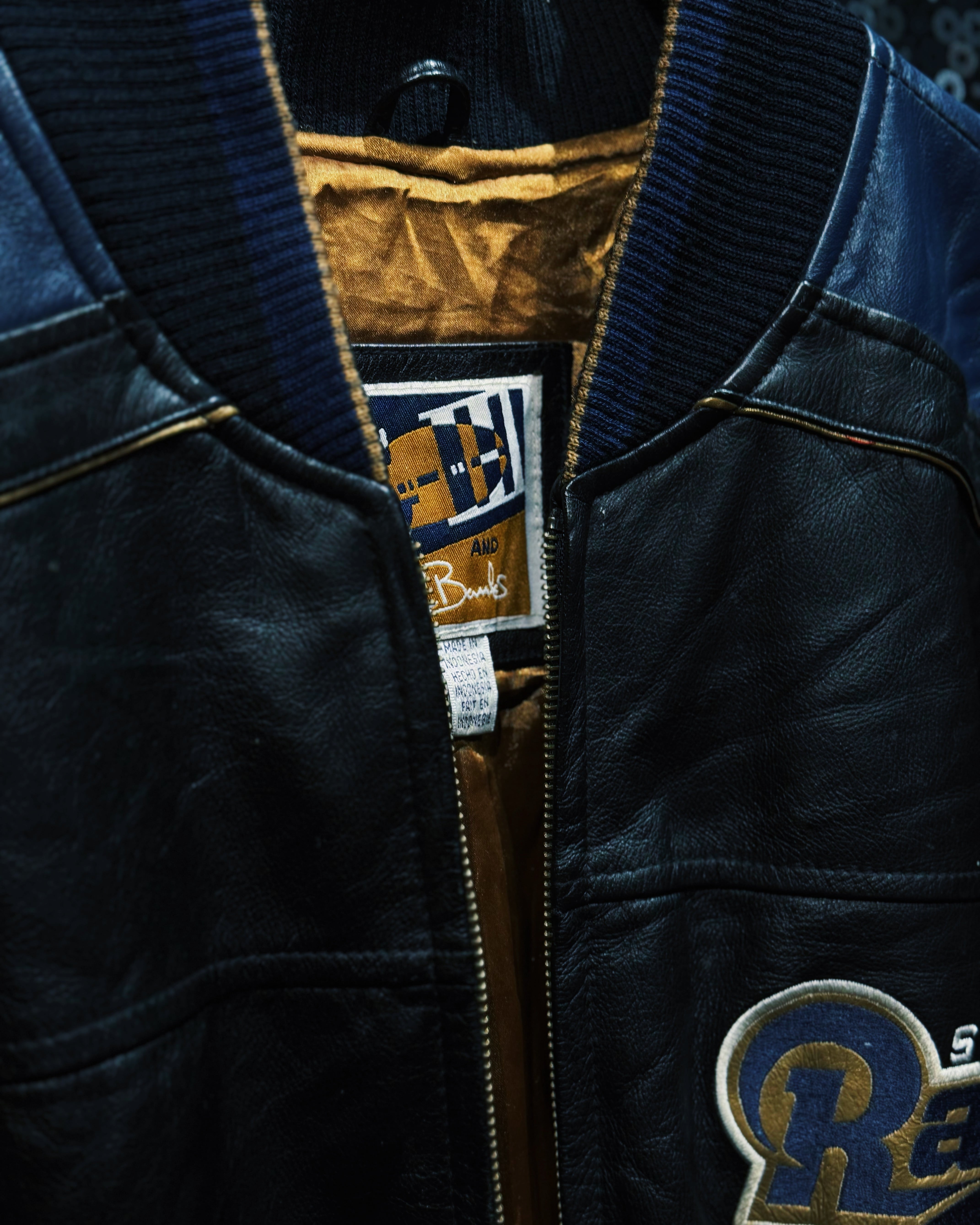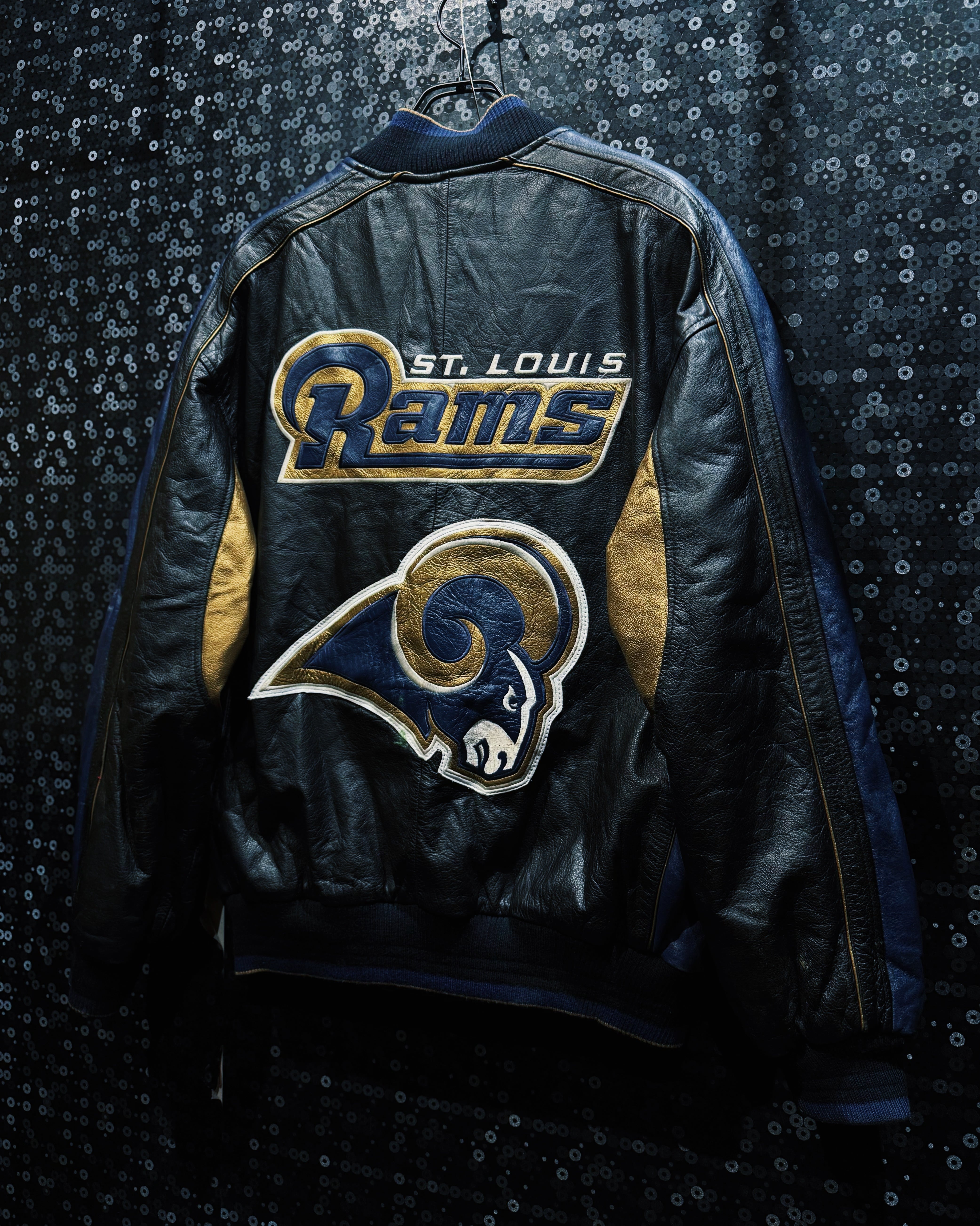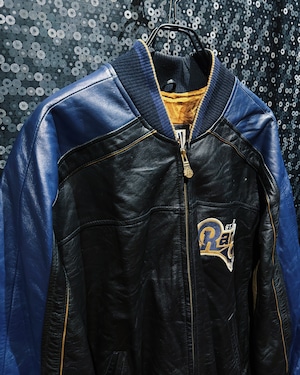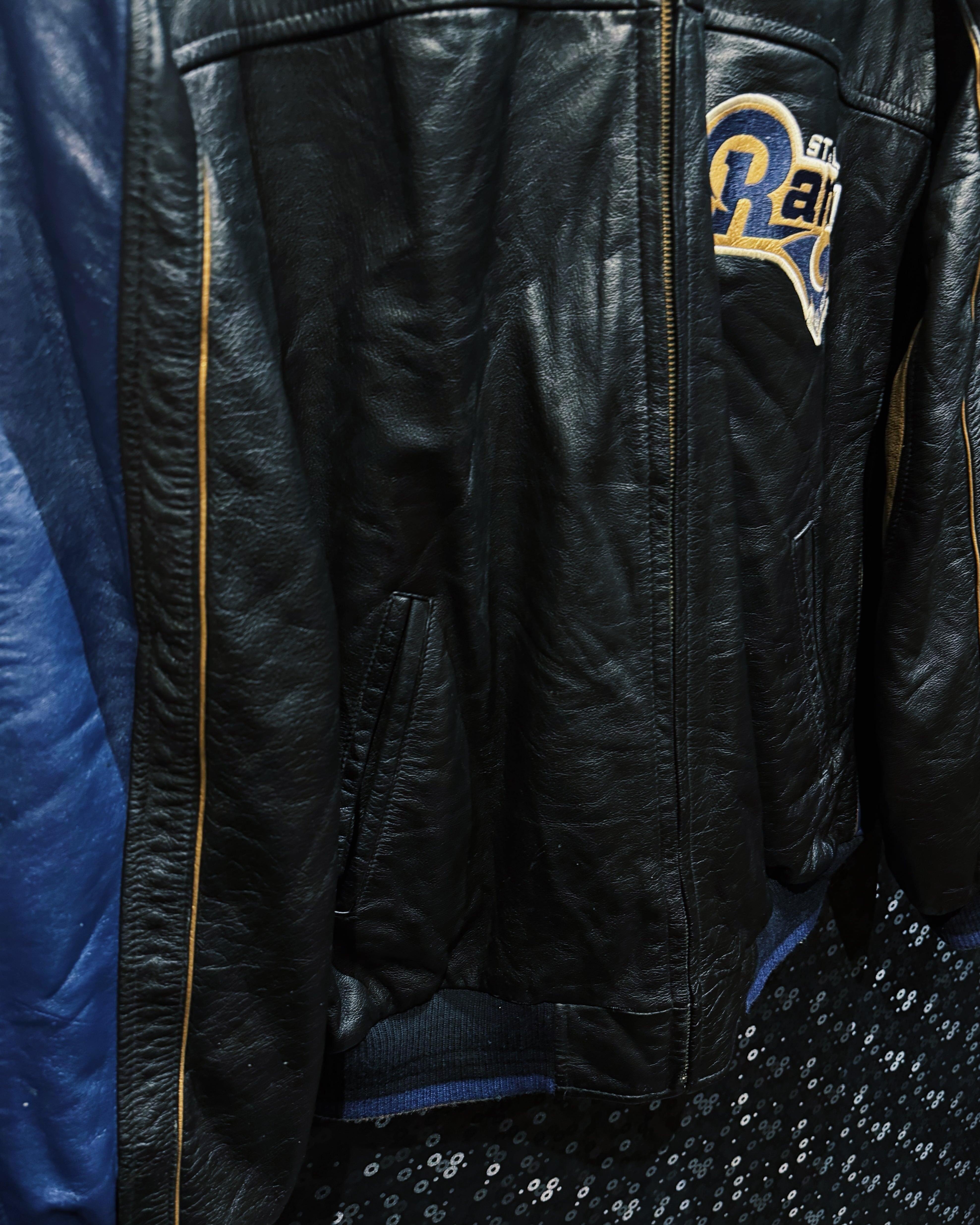 NFL公式ライセンスの希少なレザーボンバージャケット。St.Louis Rams(現 LA Rams)時代のデザインで、ブラック×ネイビーのツートーンレザーが男らしい重厚感を演出している。