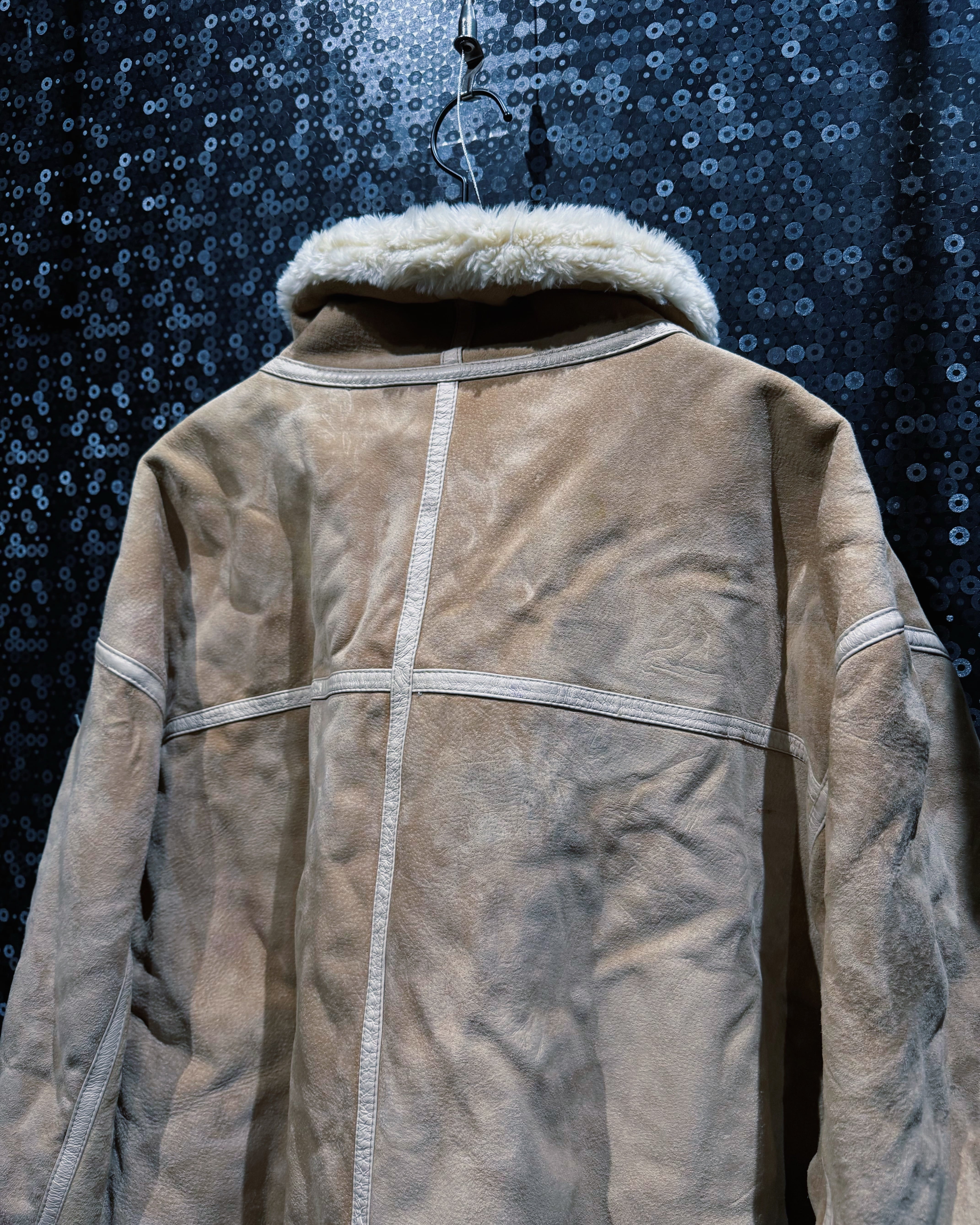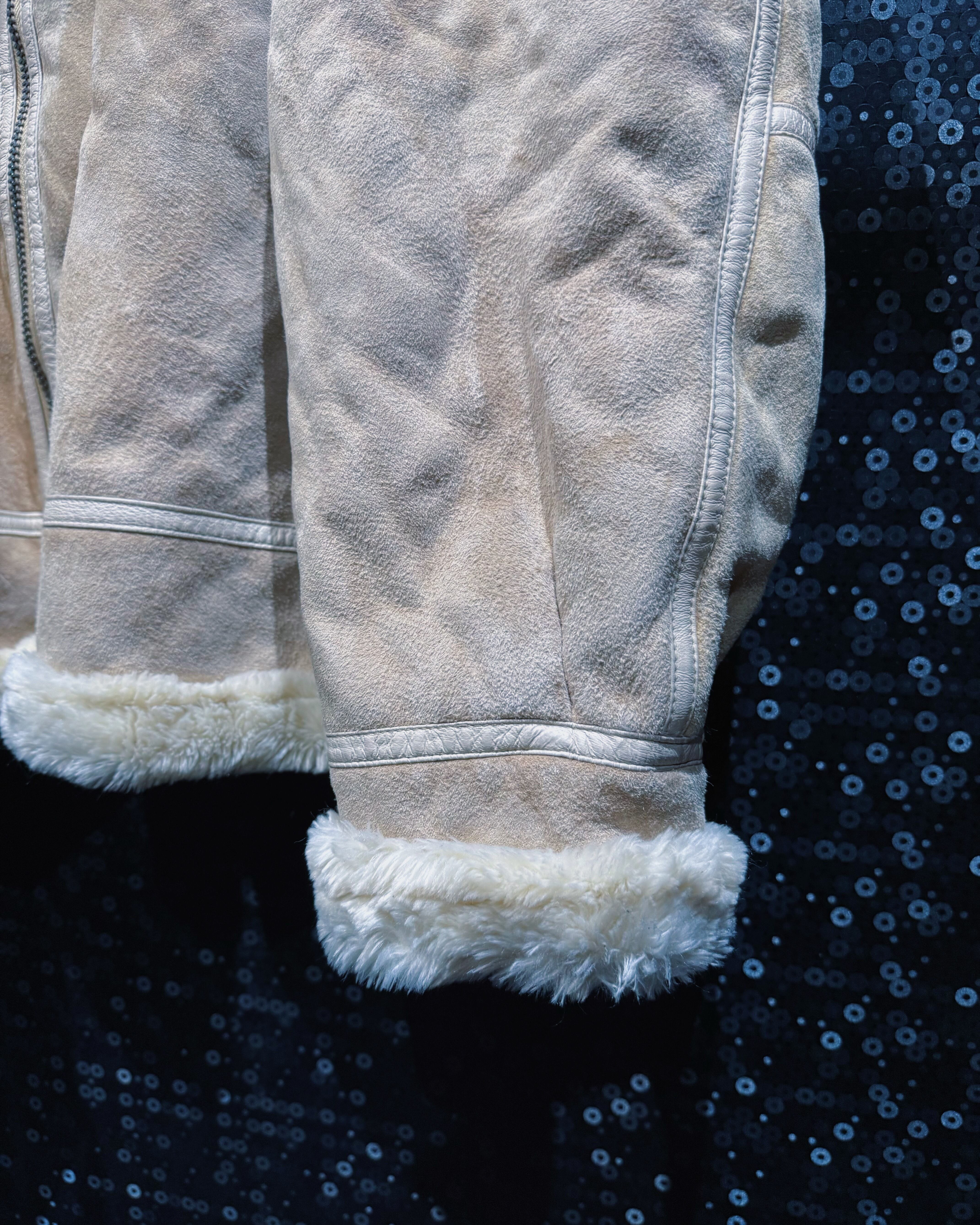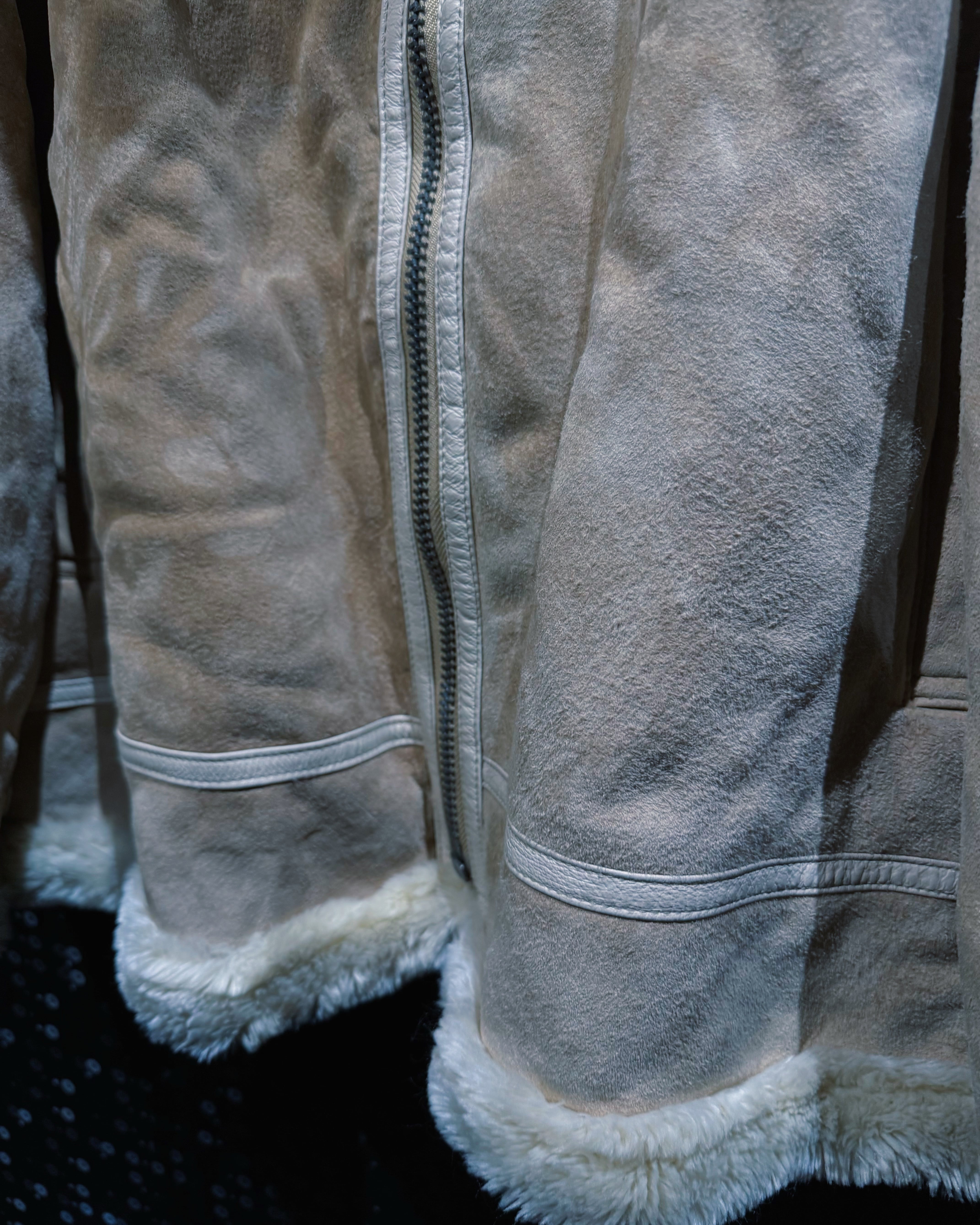 ベージュのフェイクスエードは長年の着用により生まれた自然なエイジングが魅力で、現行の新品には出せない深い陰影が刻まれている。ライニングには厚手のシェアリング(ボア)を採用し、真冬でも安心の保温性を確保。