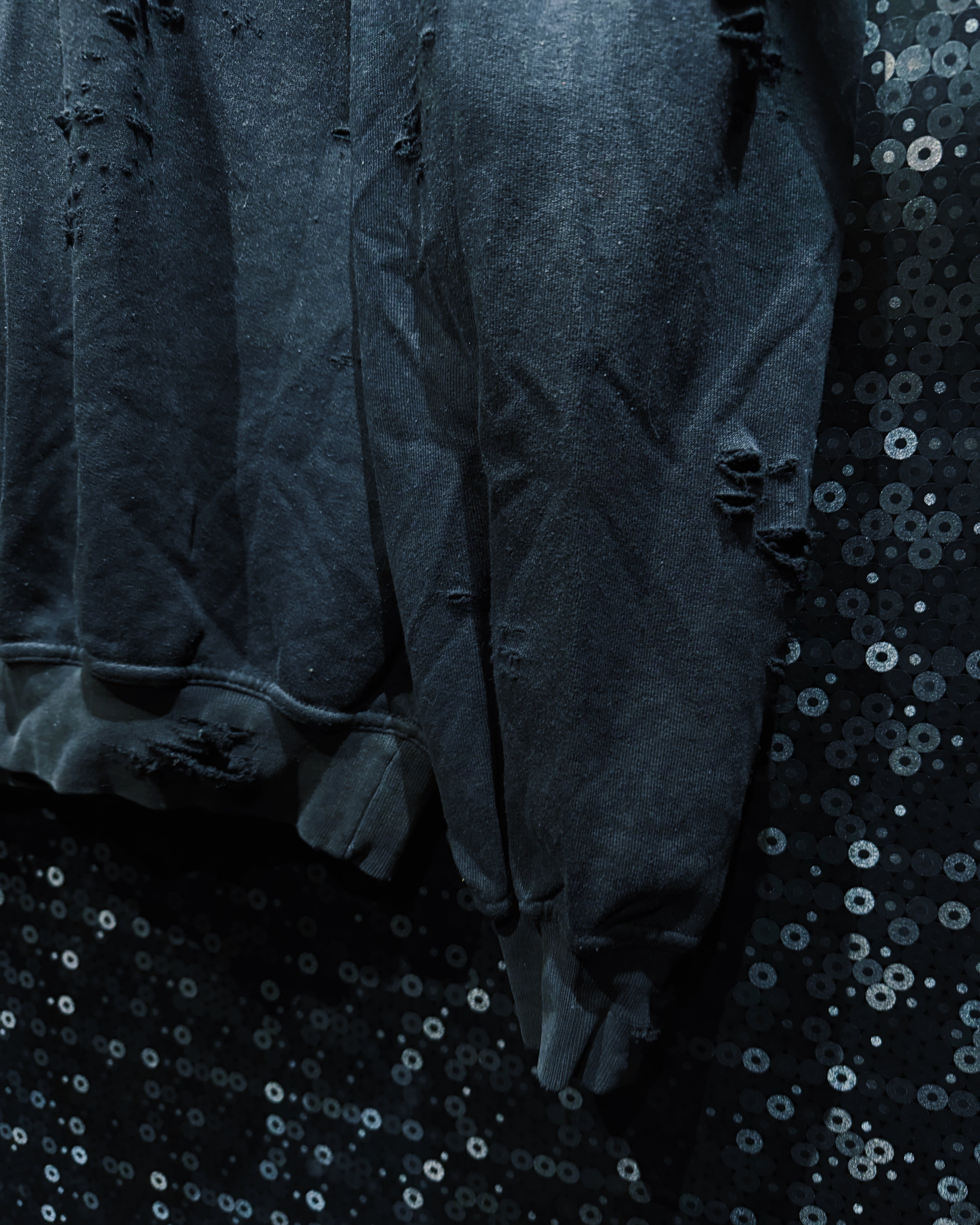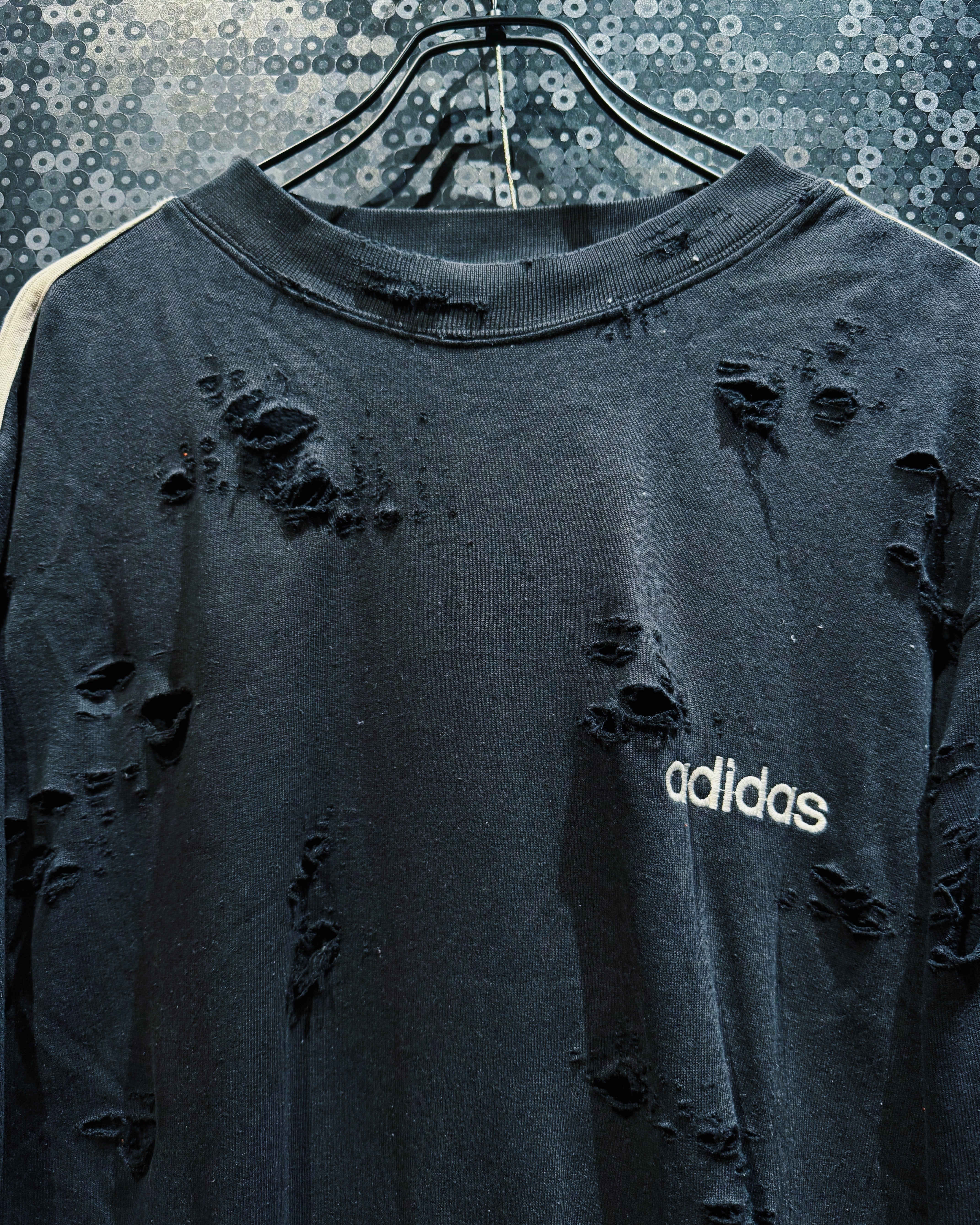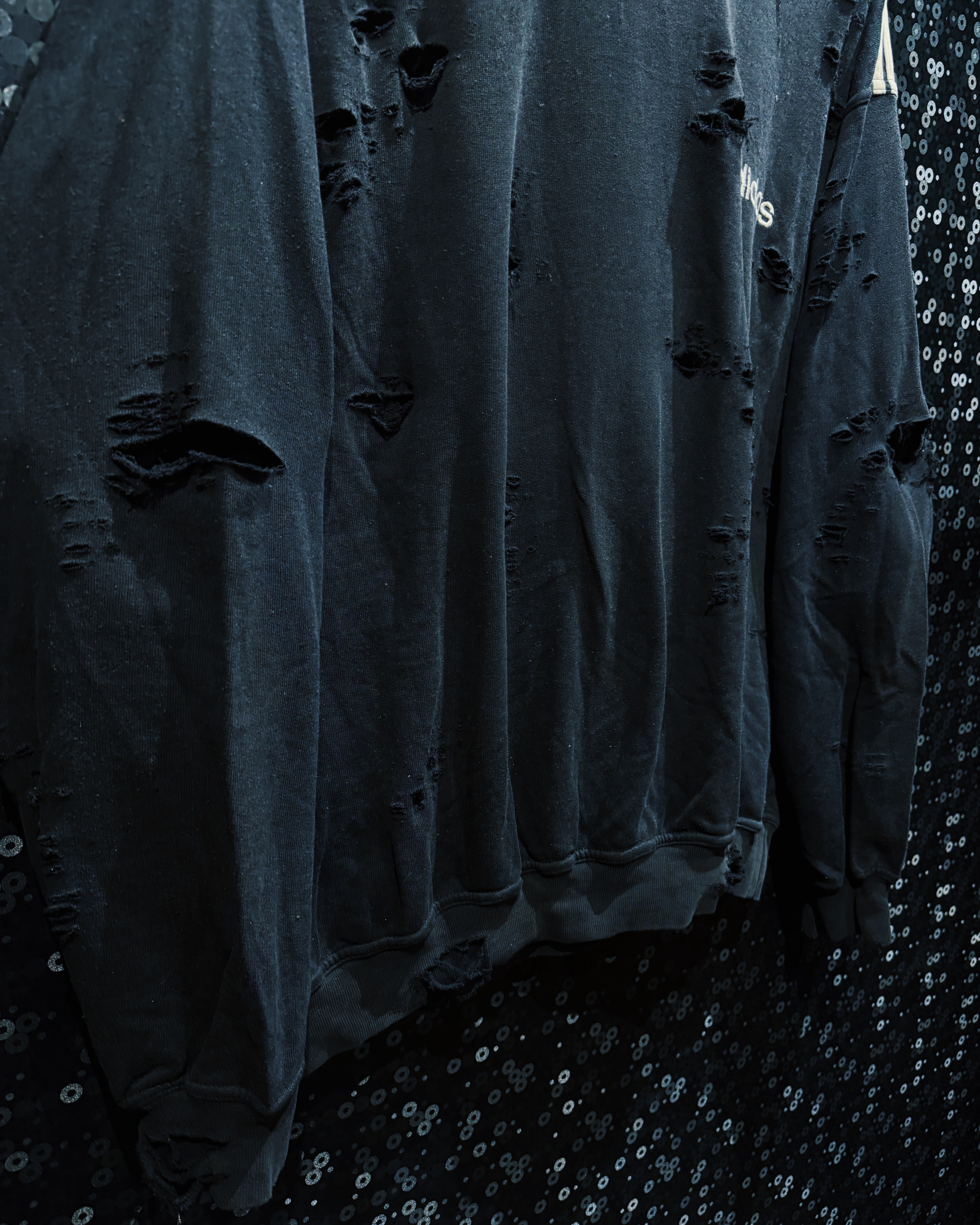 胸元の小さな“adidas”刺繍は控えめでありながら、破れの中で確固たる存在感を示し、ブランドの象徴が静かに光る。ダメージの入り方は絶妙で、派手ではないのに迫力がある。そのバランス感覚がこのスウェットを“ただの黒”では終わらせない。