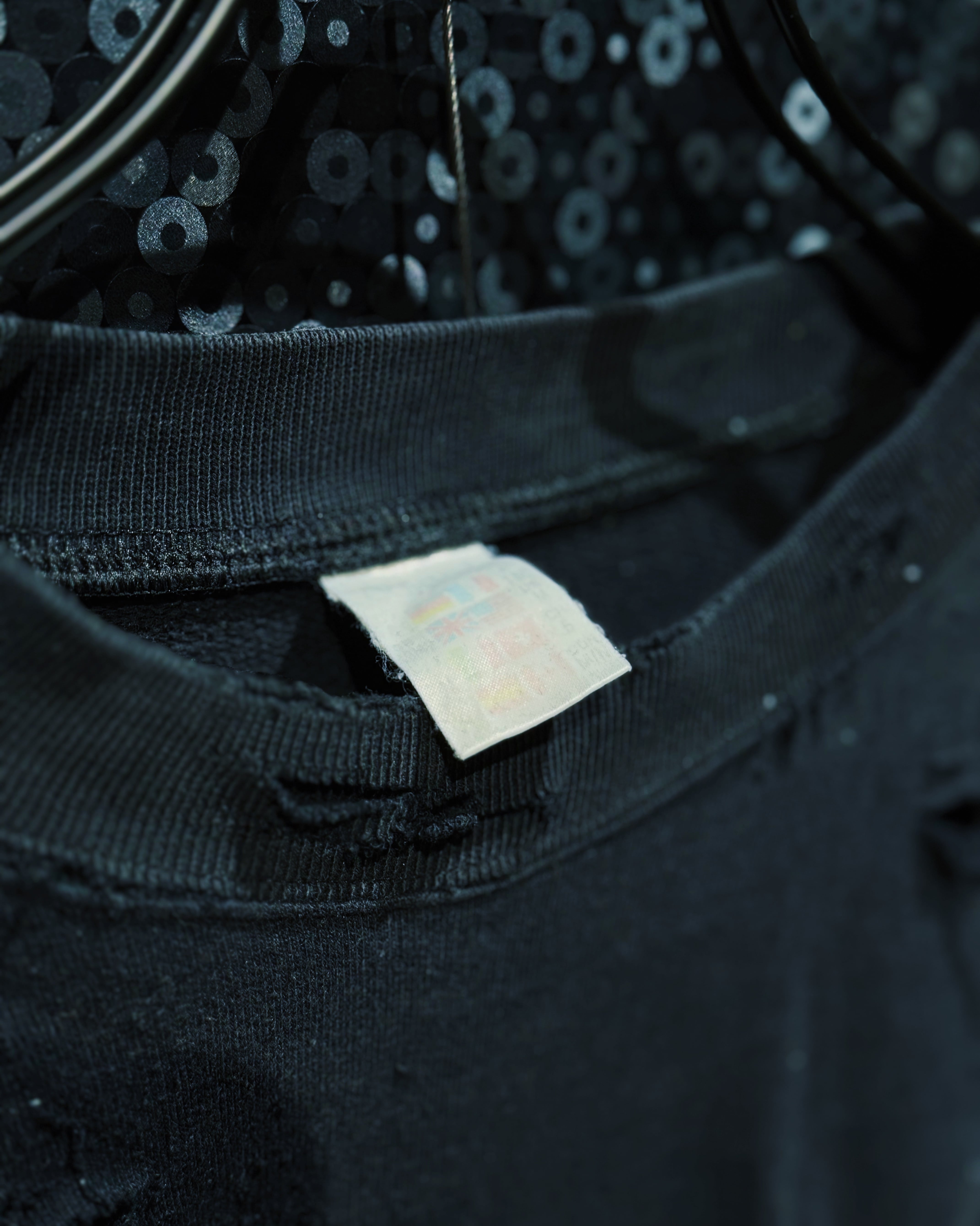 ミニマルなデザインの美しさとは、“足すのではなく削ることで成立する美”。このスウェットは、その最小限のデザイン性に対し、最大限のボロ加工を重ねることで、ミニマルと破壊の強烈なコントラストを描いた逸品。クリーム色のトリプルストライプはどこかレトロで温かみがあり、ブラックボディのフェードと組み合わさることで、静かな深みを生み出す。