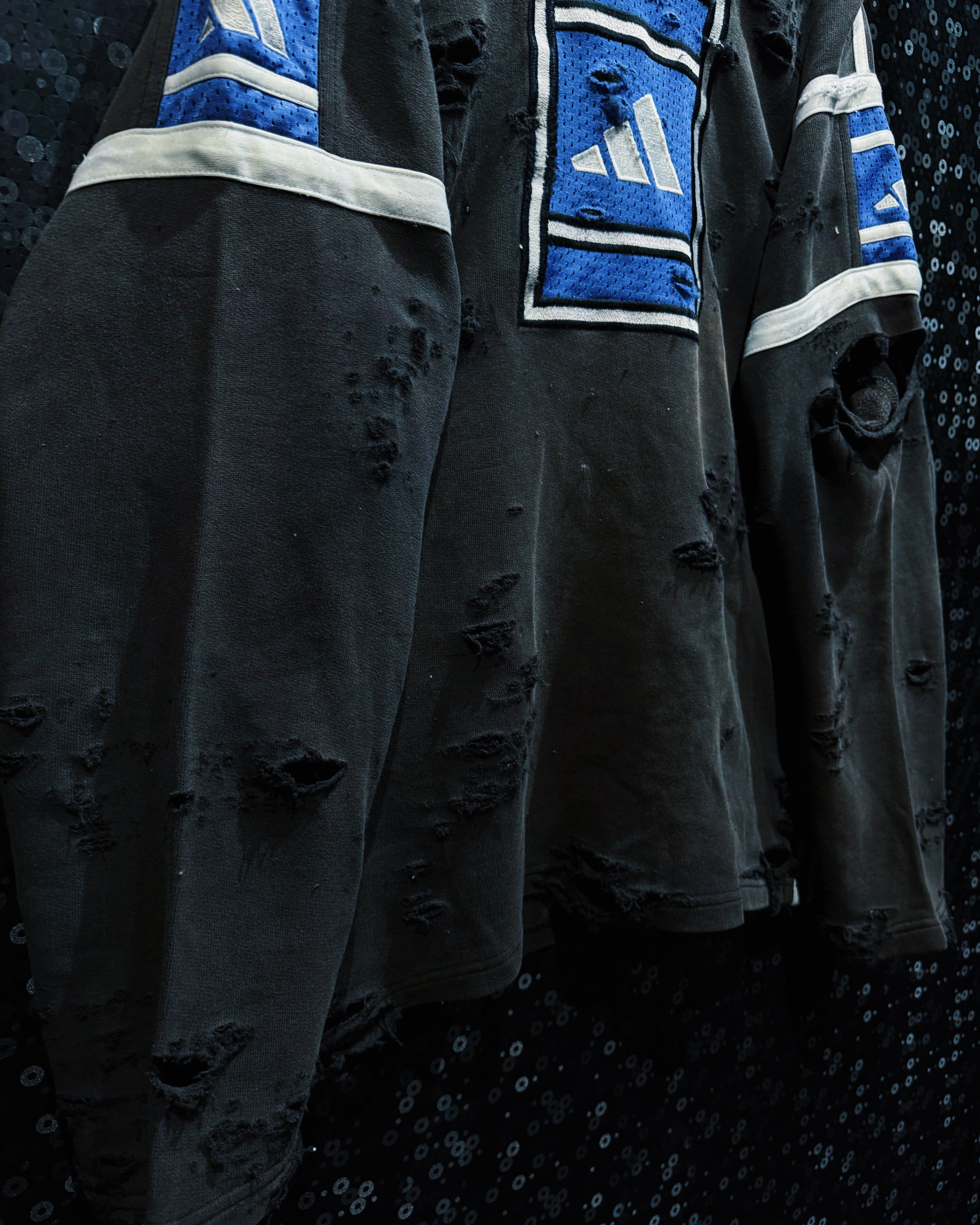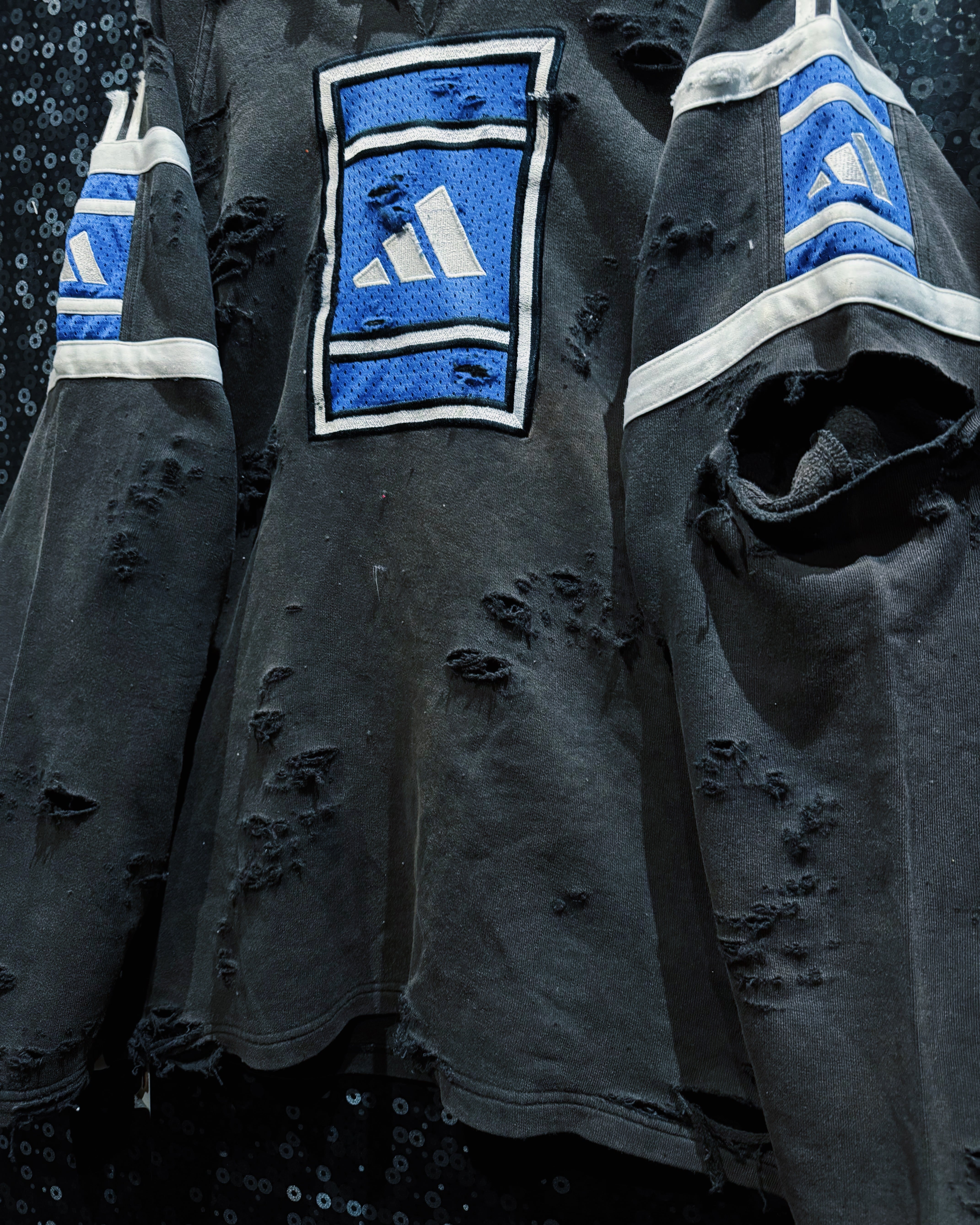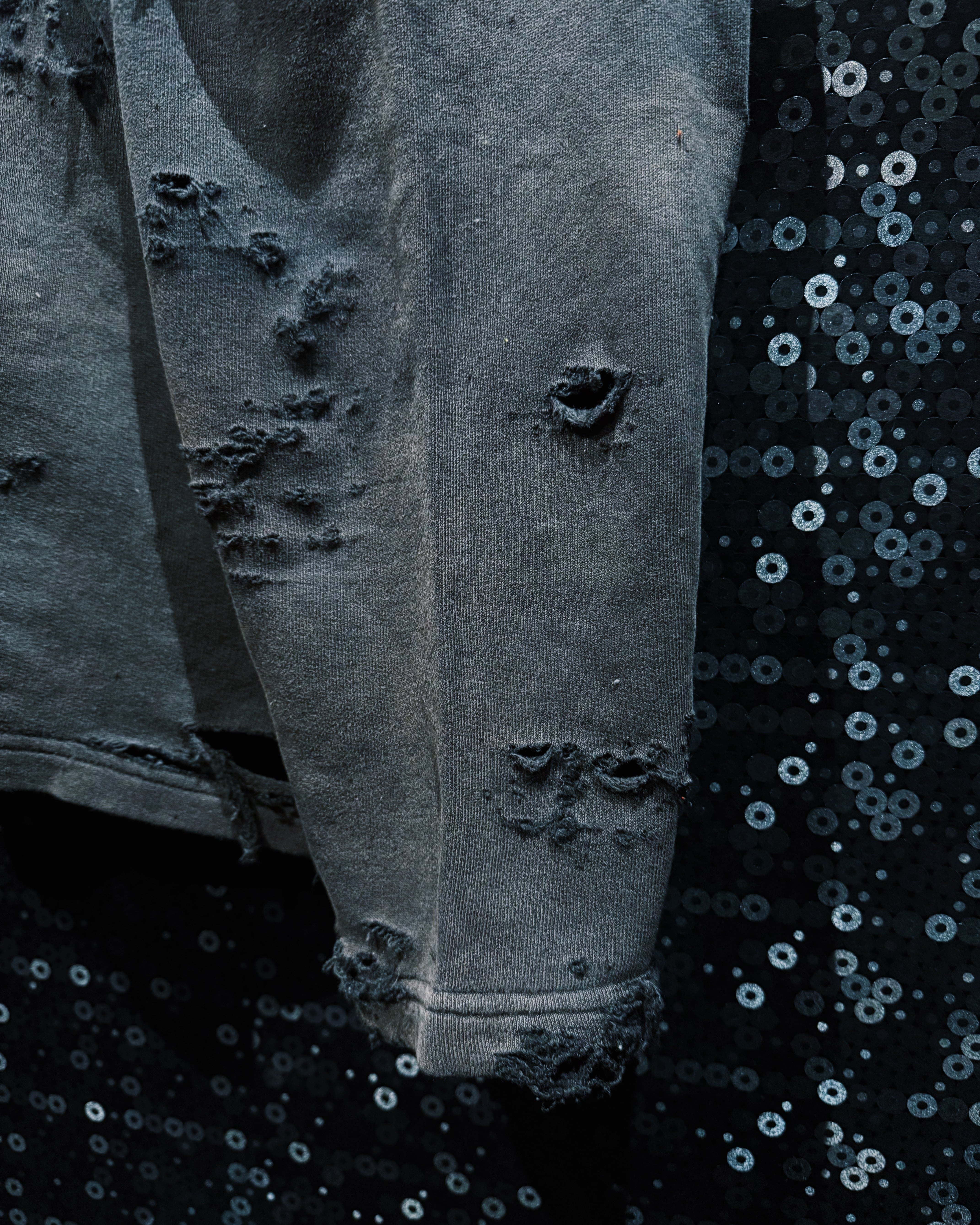 袖の切り替えにもブルーパネルが施され、全体のバランスがよりダイナミックに。激しいダメージは乱雑に見えて計算されており、“破壊の中の秩序”がしっかり成立している。視覚的なインパクトだけでなく、着た瞬間に空気を支配する力があり、1枚でスタイリングを完結させるほどのエネルギーを持つ。