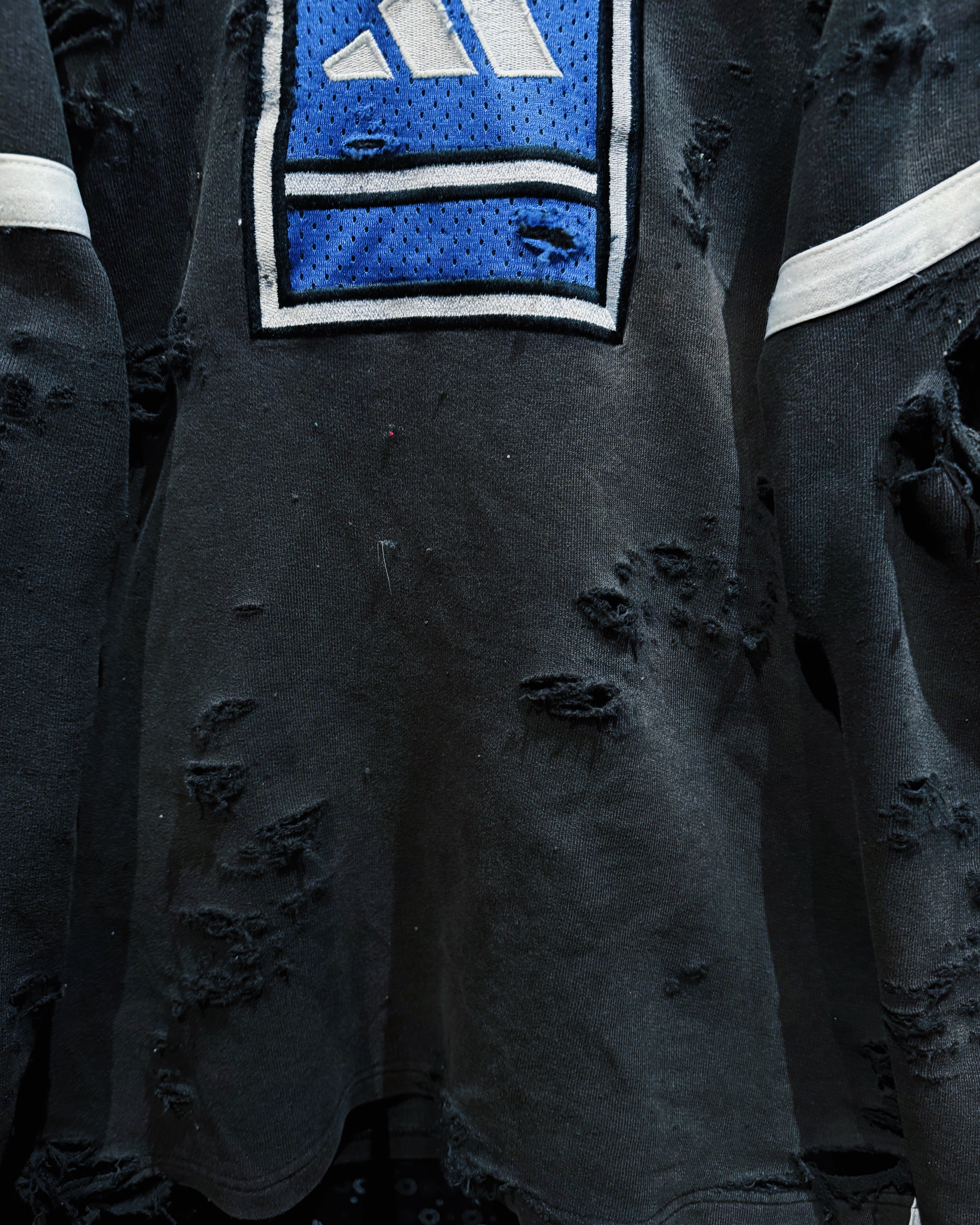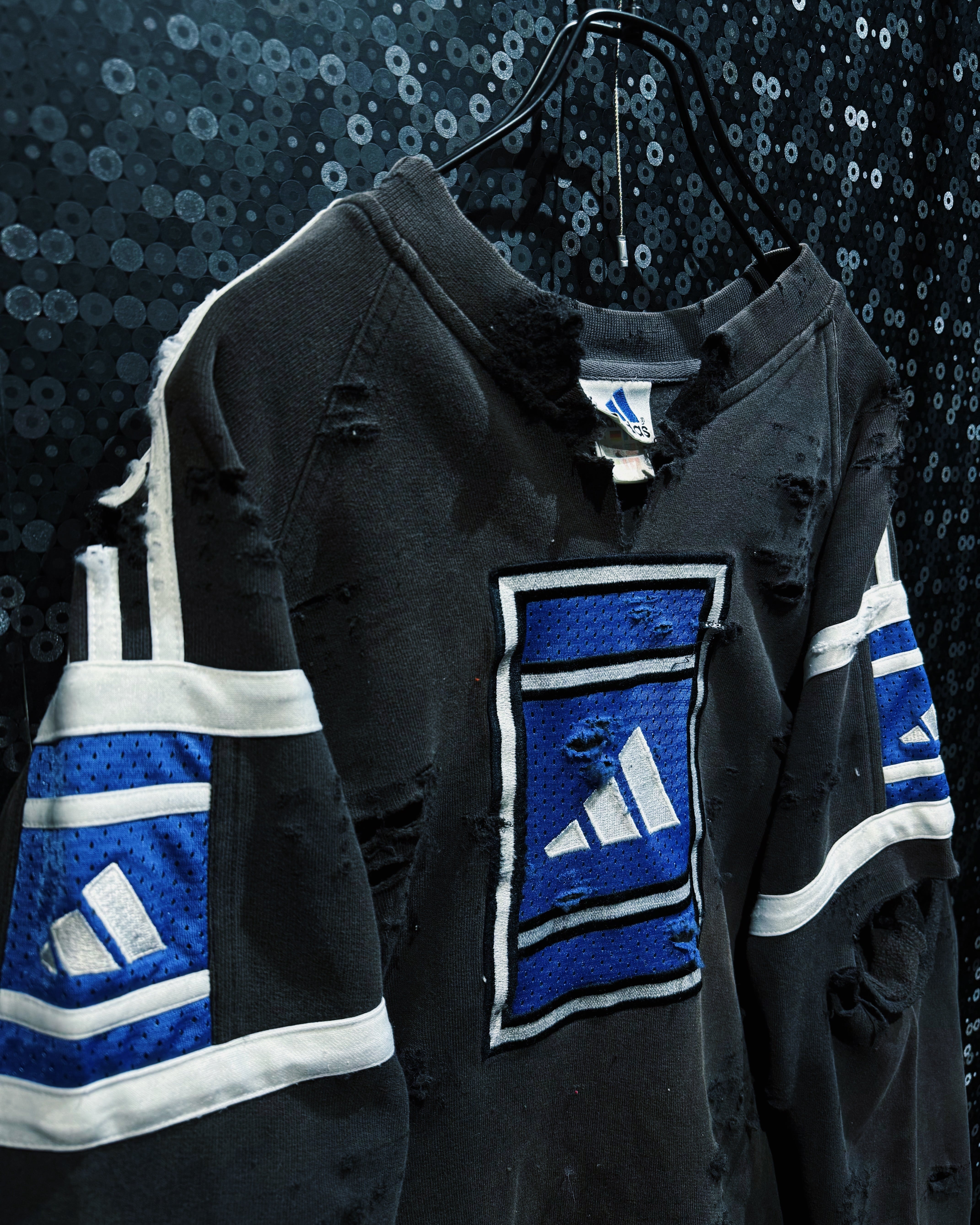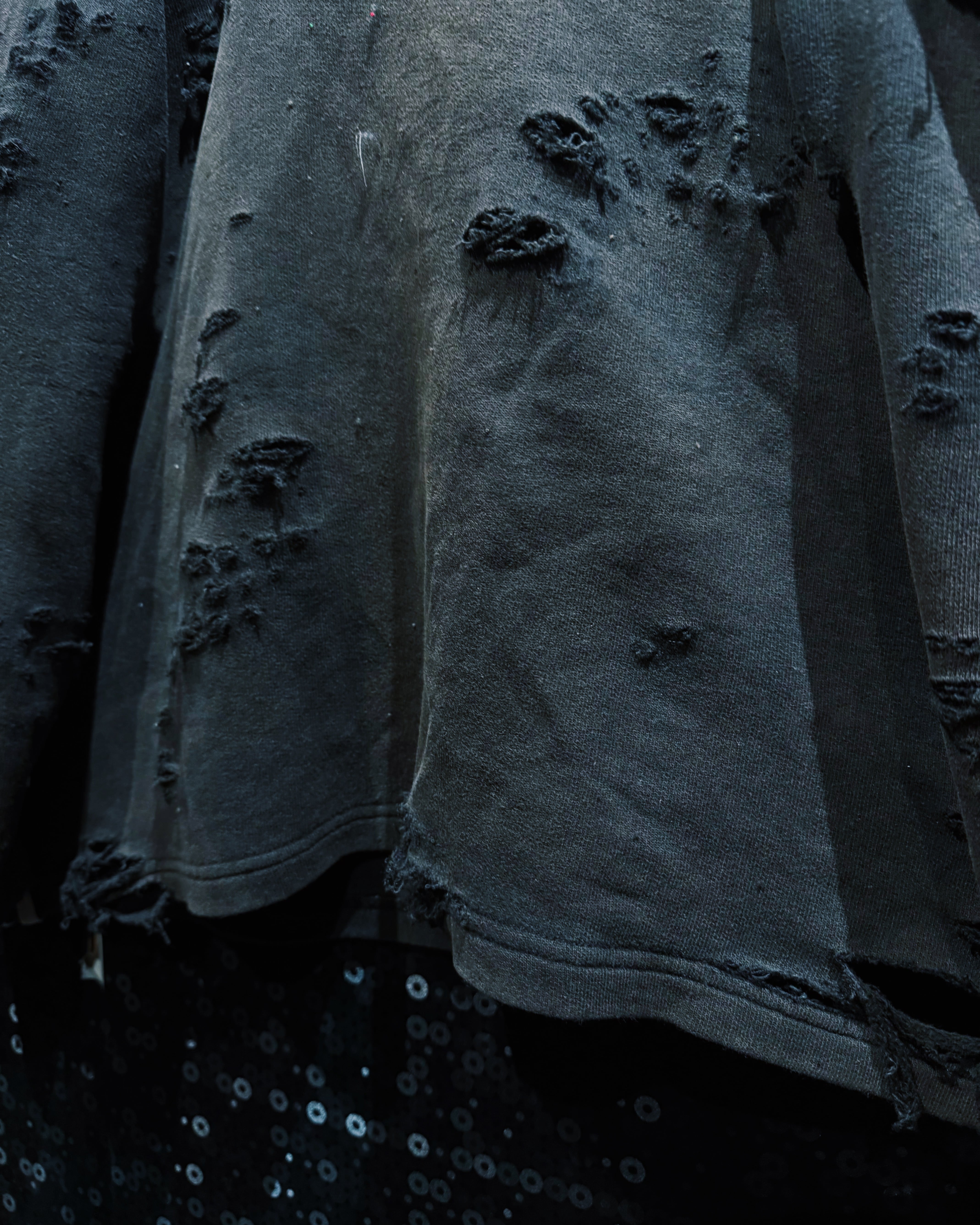 袖の切り替えにもブルーパネルが施され、全体のバランスがよりダイナミックに。激しいダメージは乱雑に見えて計算されており、“破壊の中の秩序”がしっかり成立している。視覚的なインパクトだけでなく、着た瞬間に空気を支配する力があり、1枚でスタイリングを完結させるほどのエネルギーを持つ。