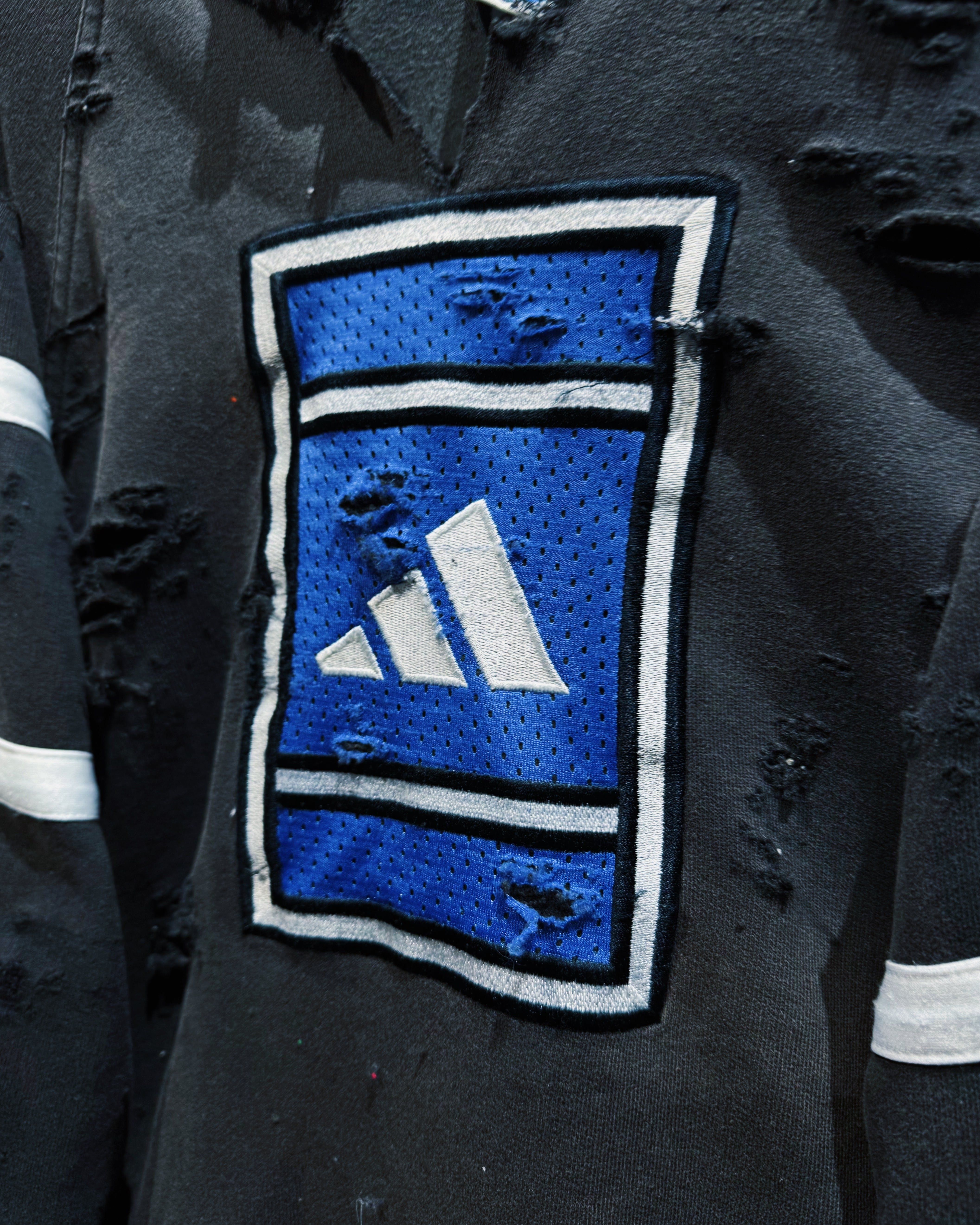 アメフトジャージのような存在感を持つブルーパッチは、ただ貼られただけではなく、ボロ加工によって縁がほつれ、立体的な影を生み出す。パッチの青が黒ボディの上で鮮烈に浮かび上がり、スポーツウェアの機能性とアートピースの造形美がひとつに統合されている。