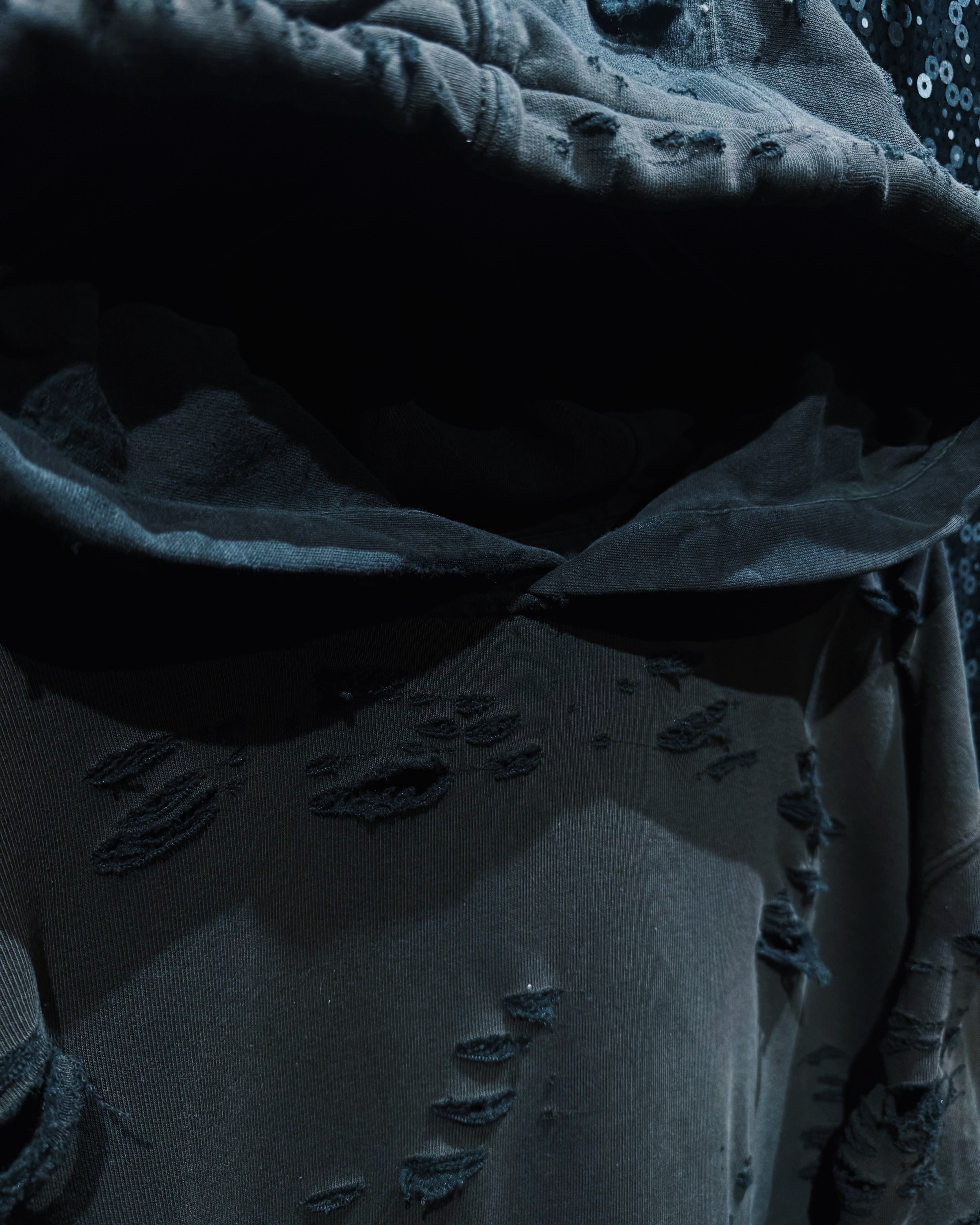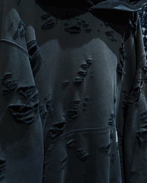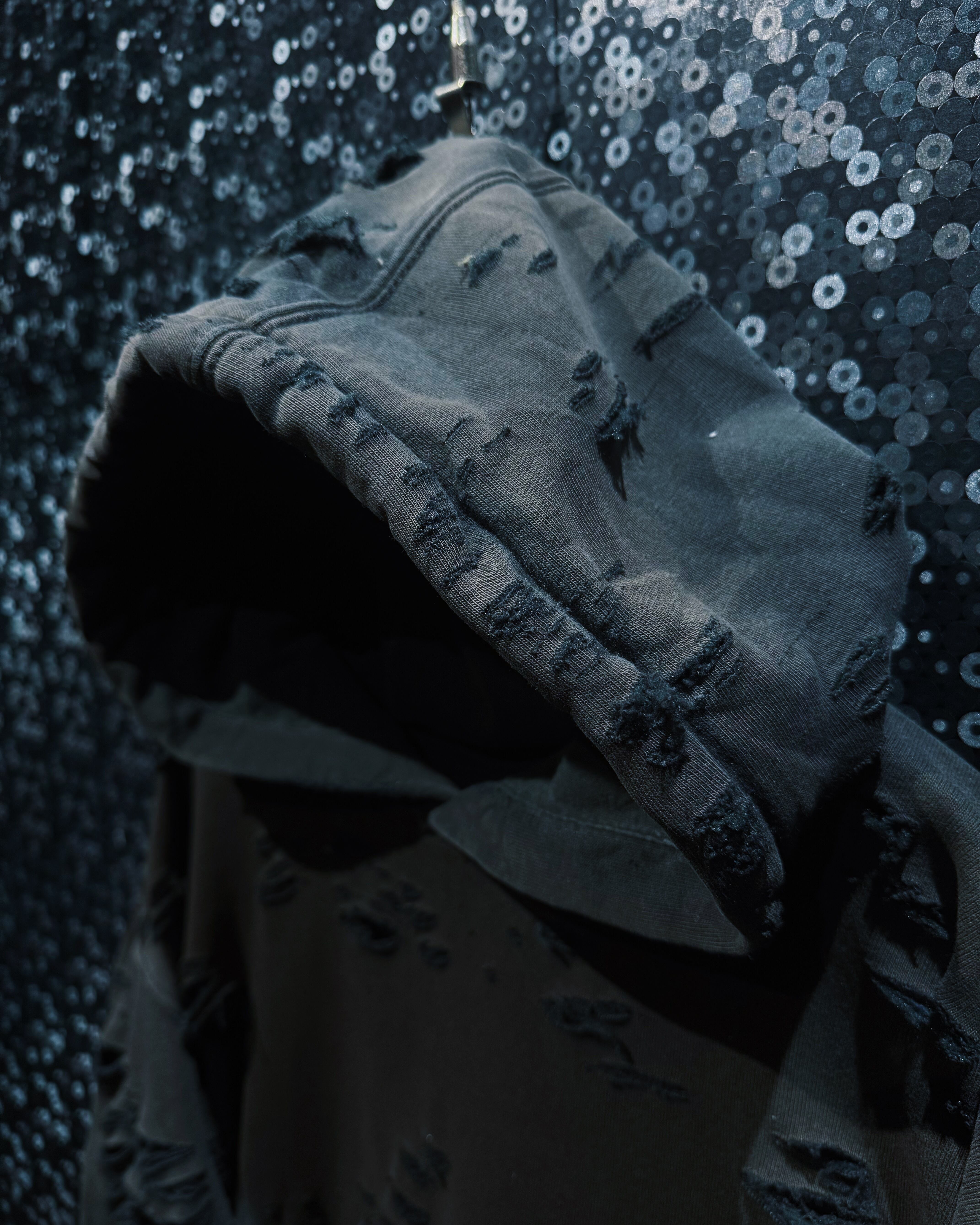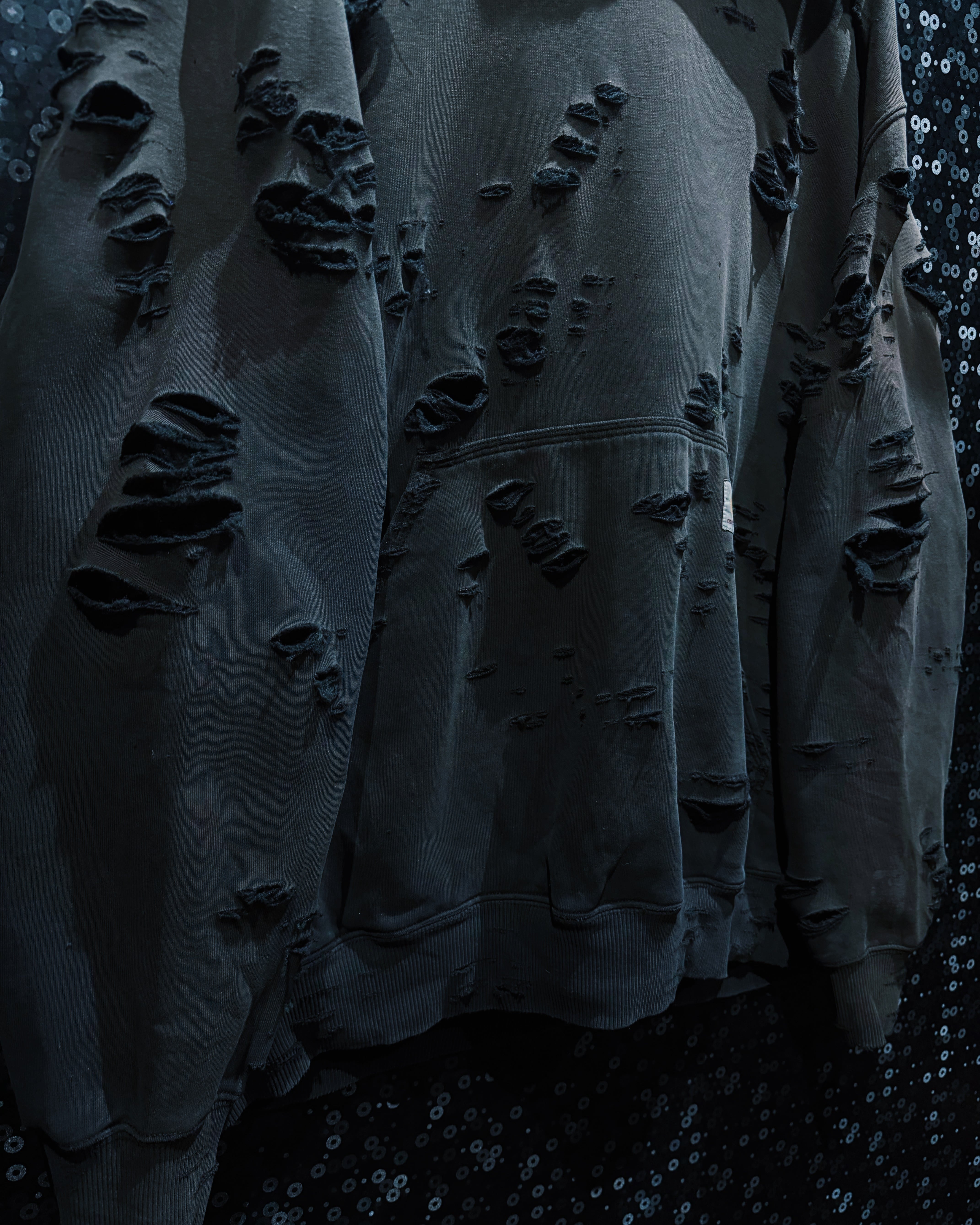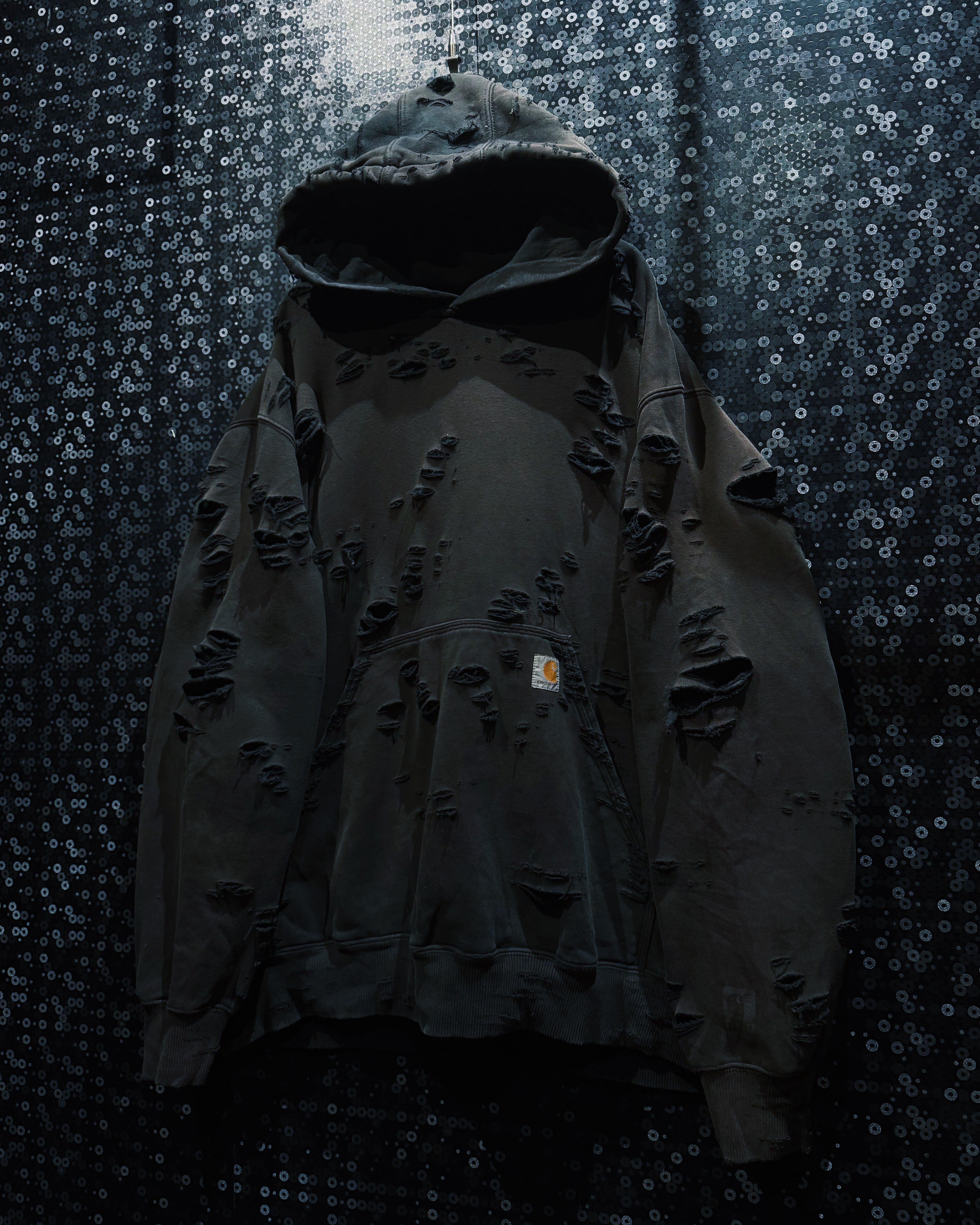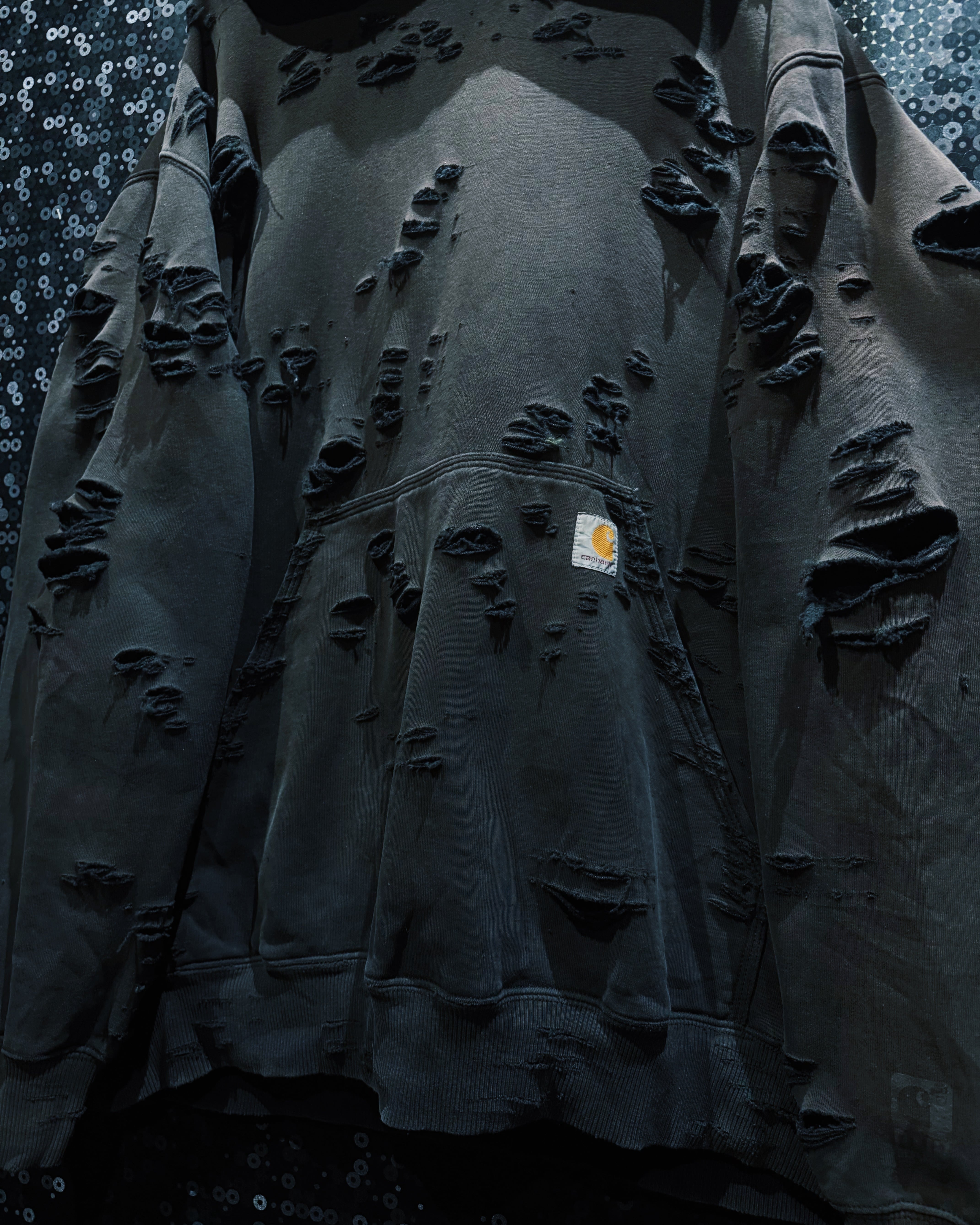 カーハートのヘビーオンスボディは、他のどのブランドにも出せない“質量”を感じさせる。このフーディーは、その重厚さを最大限活かし、深くえぐれたようなダメージを全身に刻むことで、ワークウェアが本来持つ“タフさ”を美しさへと転換した一着。表情の異なる破れ方がランダムに散り、陰影が増幅することで、まるで石造建築のような質感すら感じさせる。