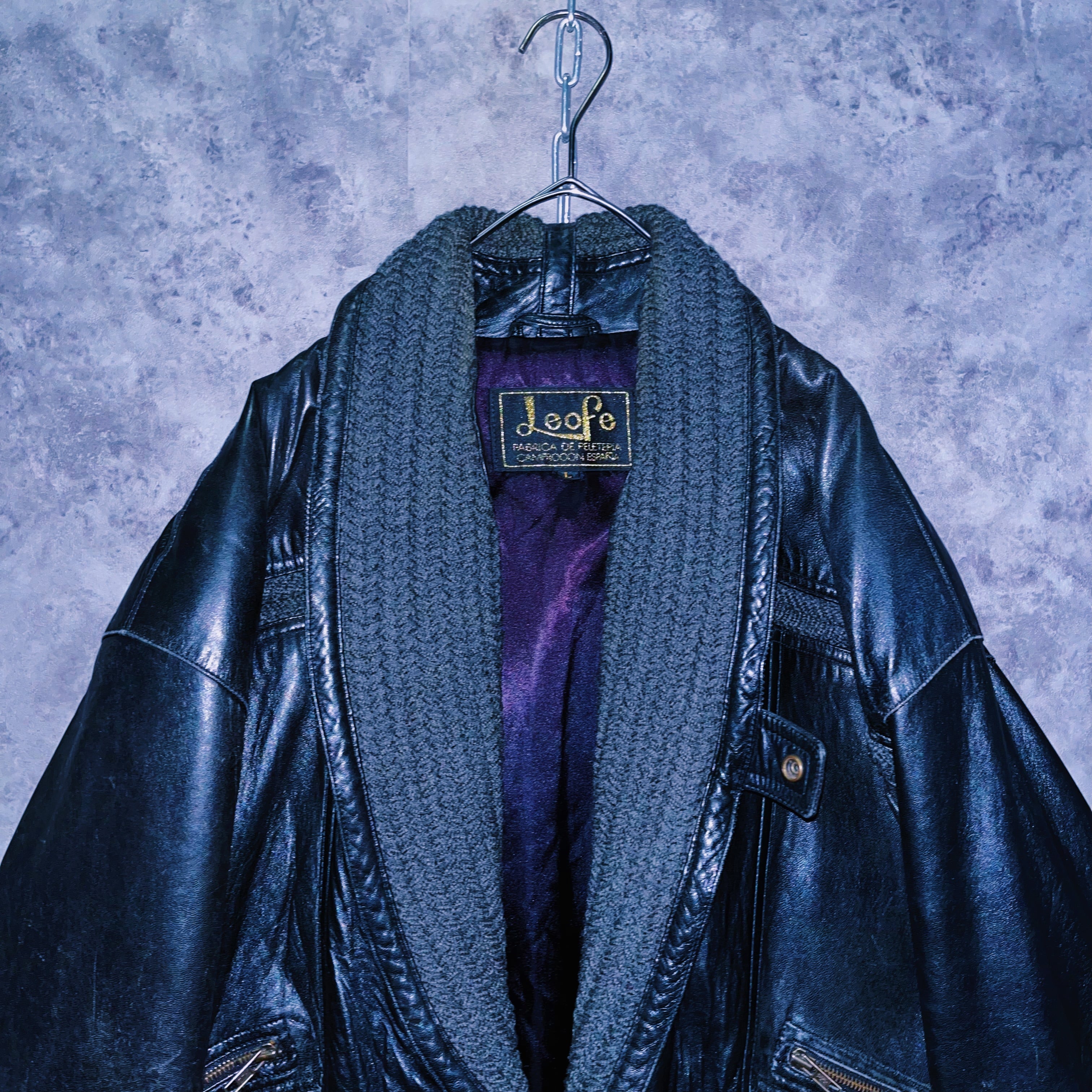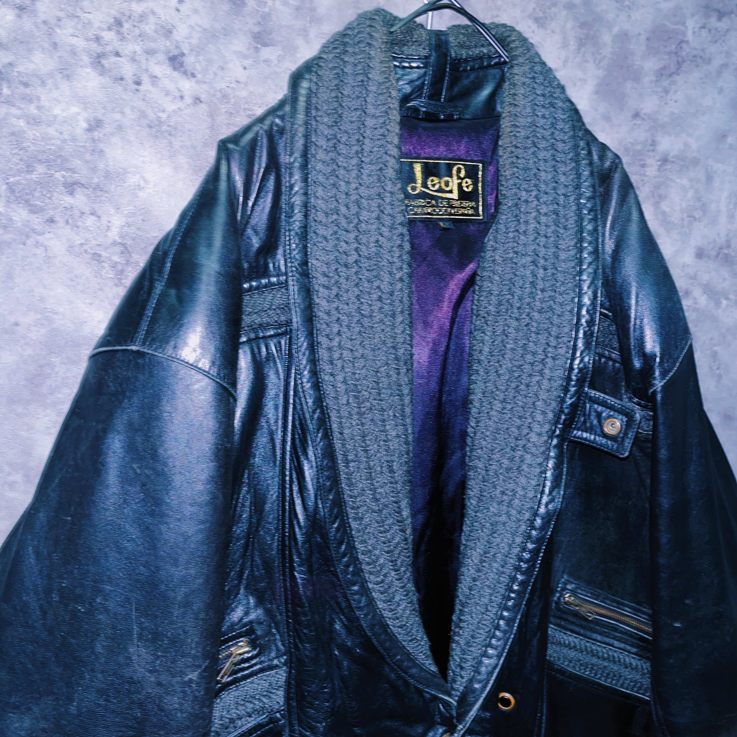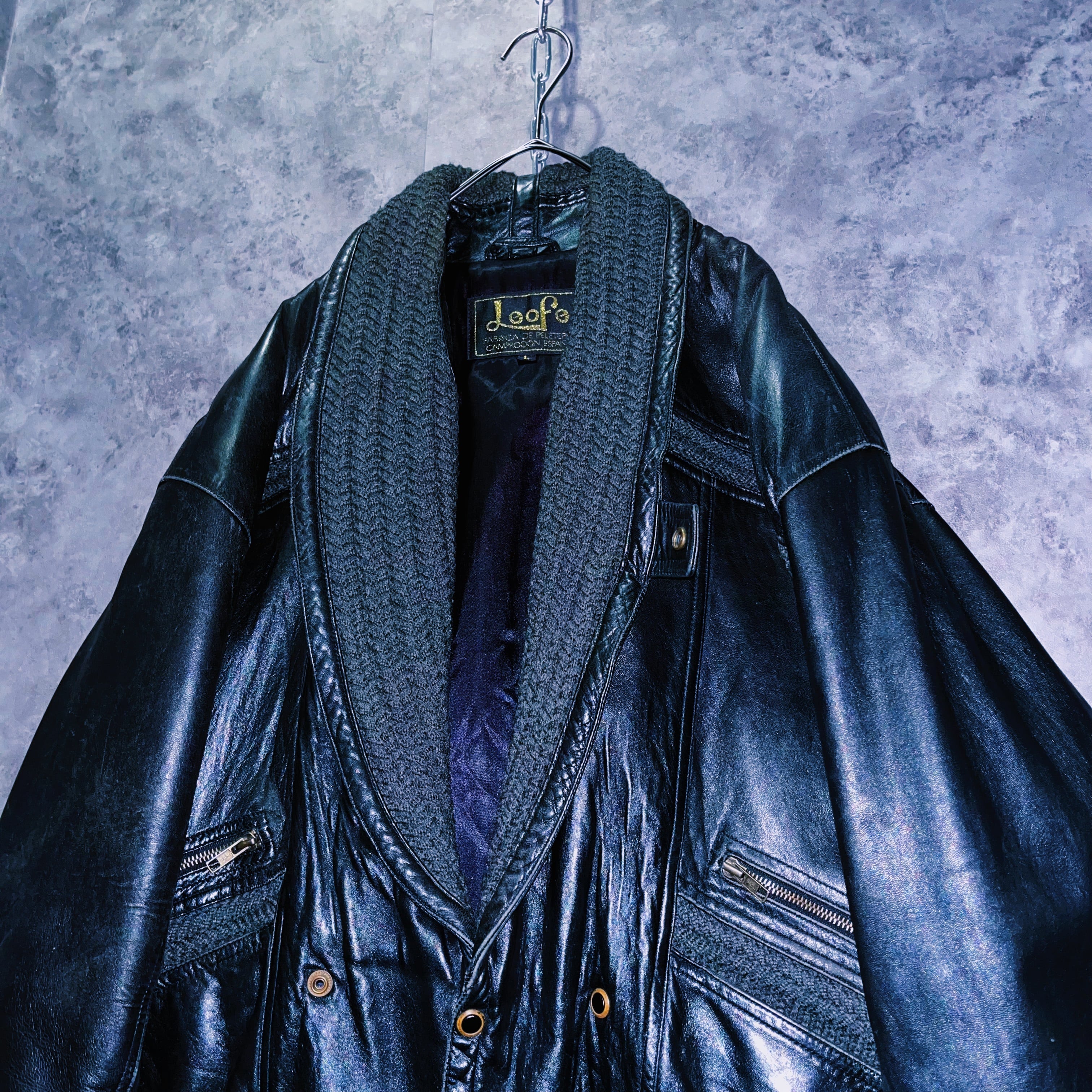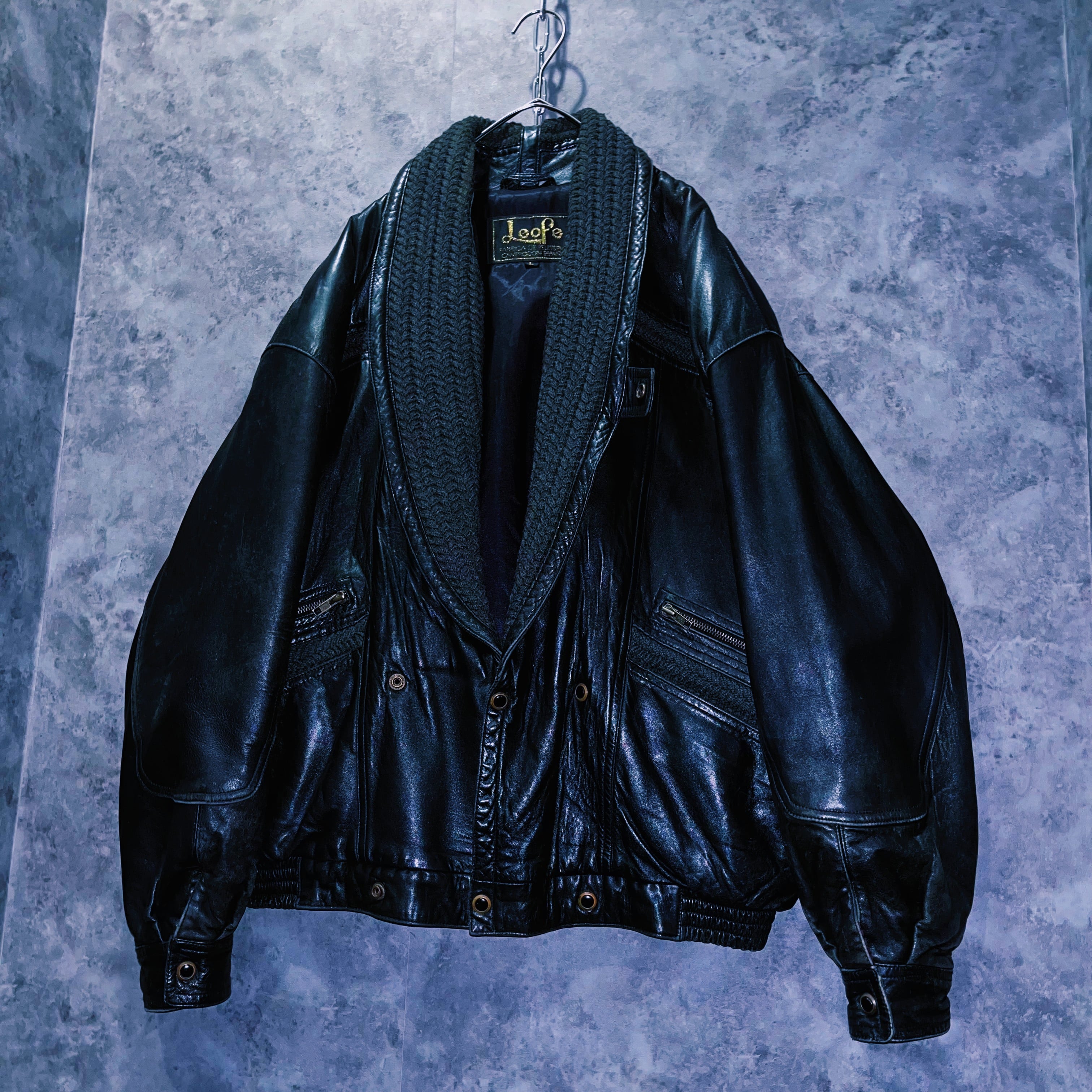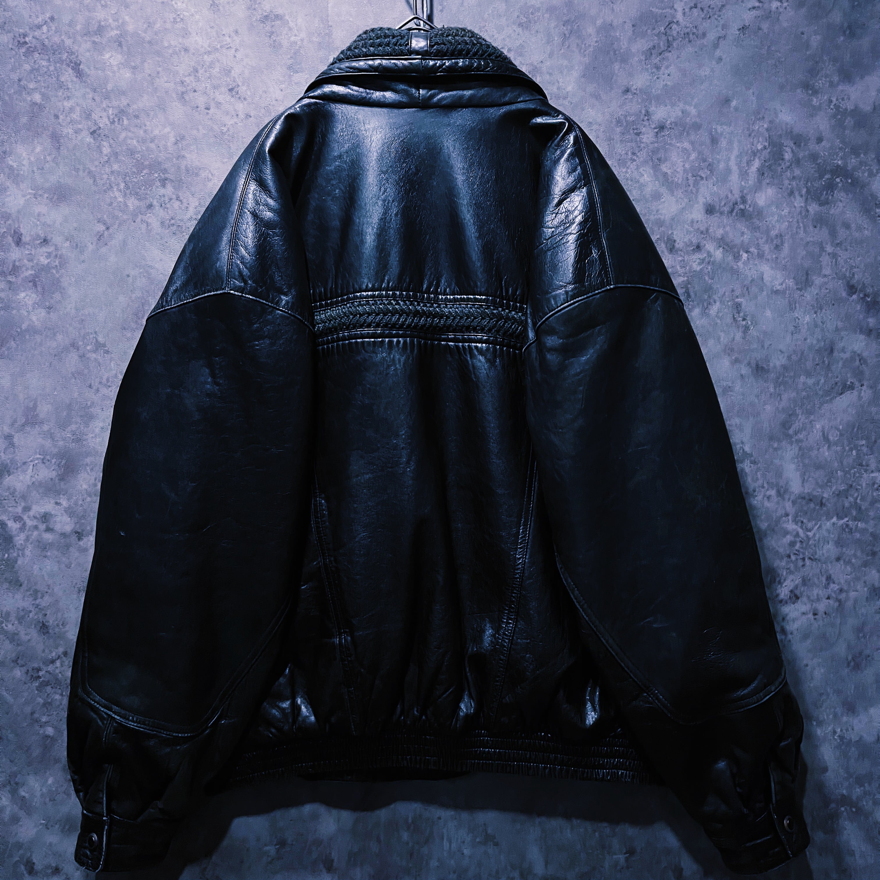 ブラックレザーの鈍い光沢に加え、モッチモチの手触り。男らしいレザーアイテムに襟の部分には綱編みで立体的な形をとったディテールが施されています。深みのあるモスグリーンカラーが渋いレザーとの相性抜群。