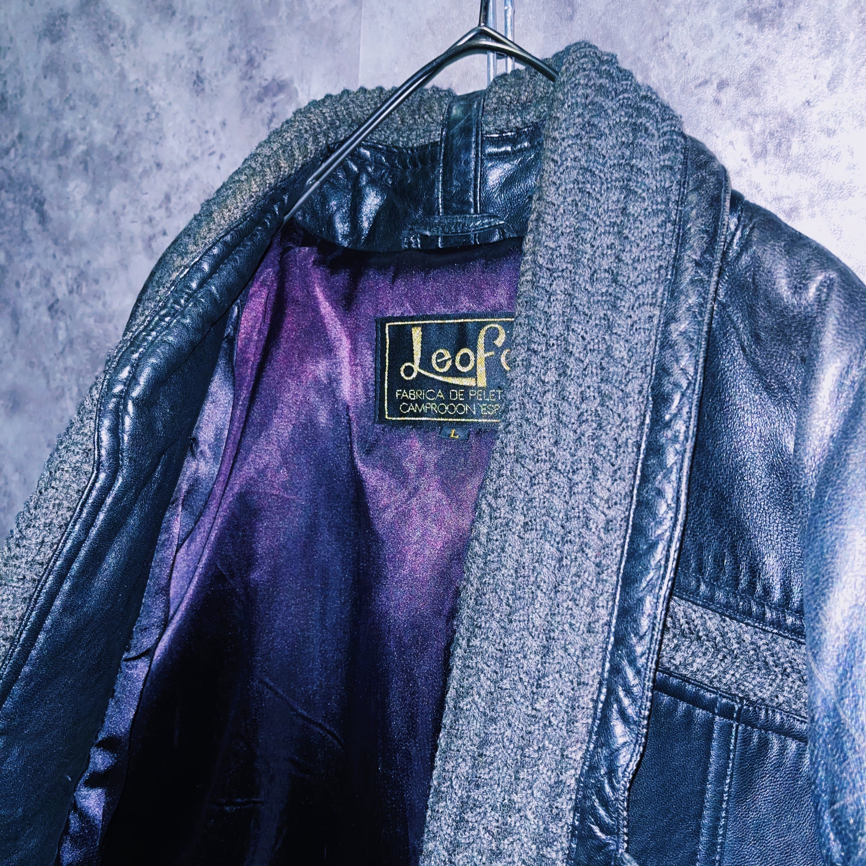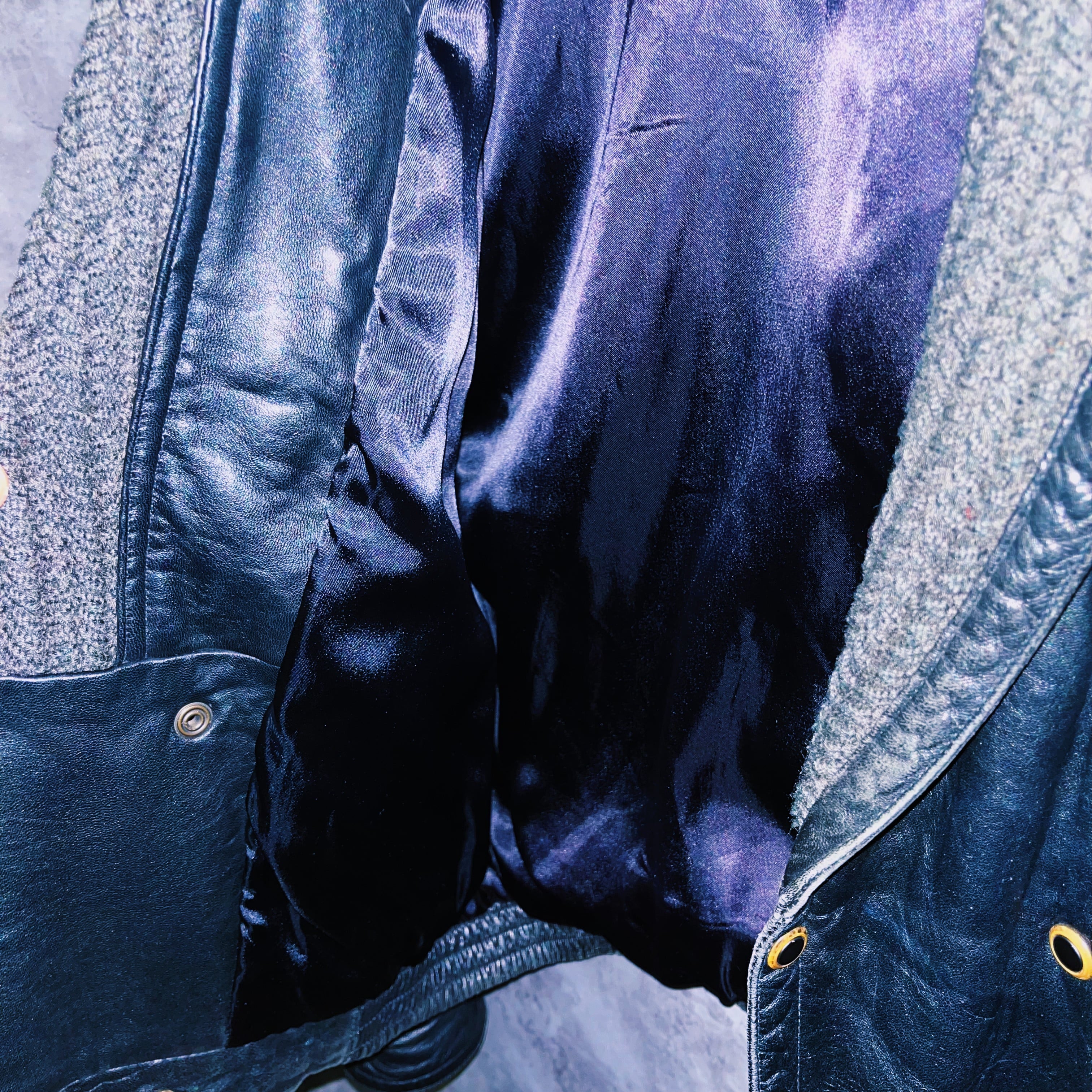 モッチモチのブラックレザーに襟をモスグリーンのコットンで切り返したデザインの一着。