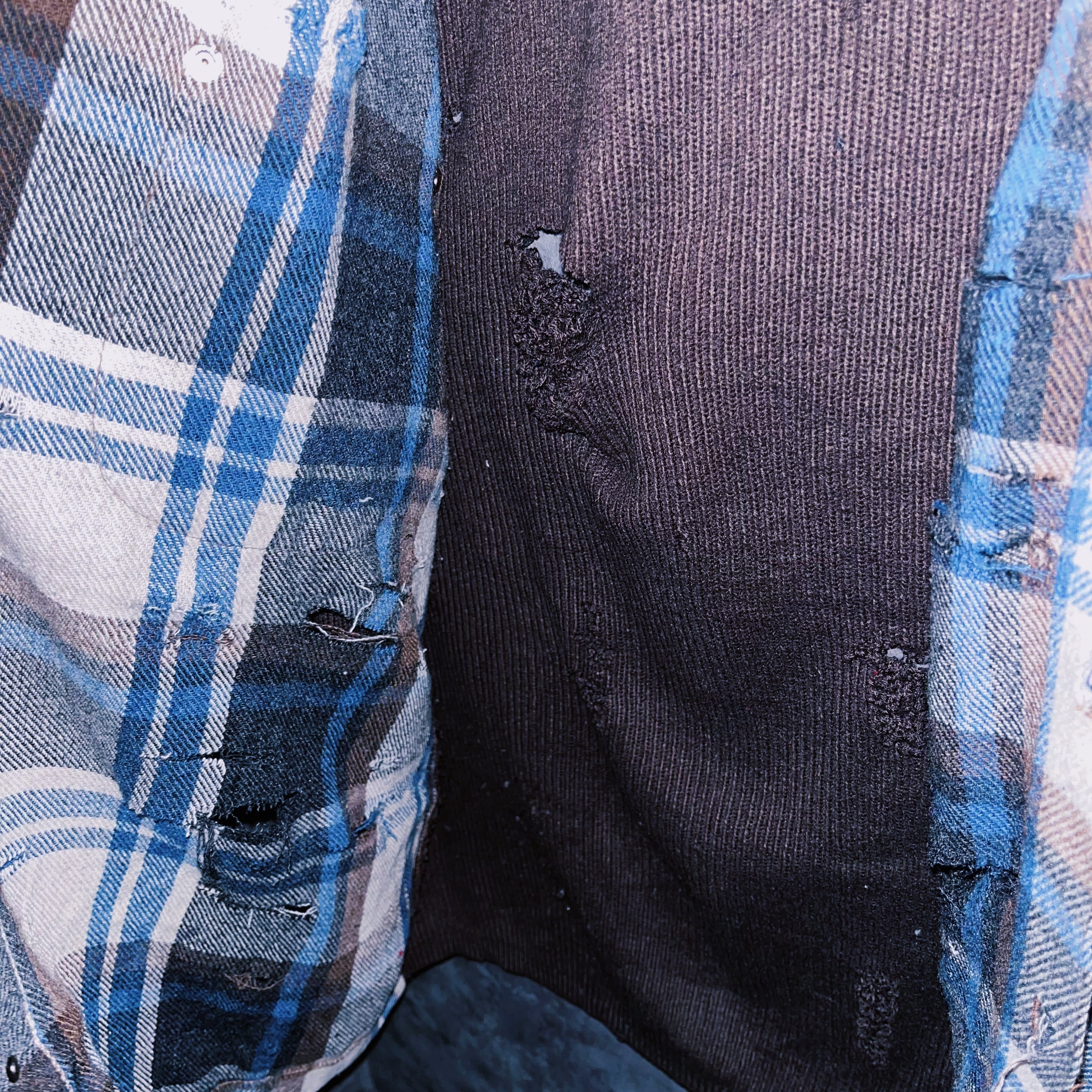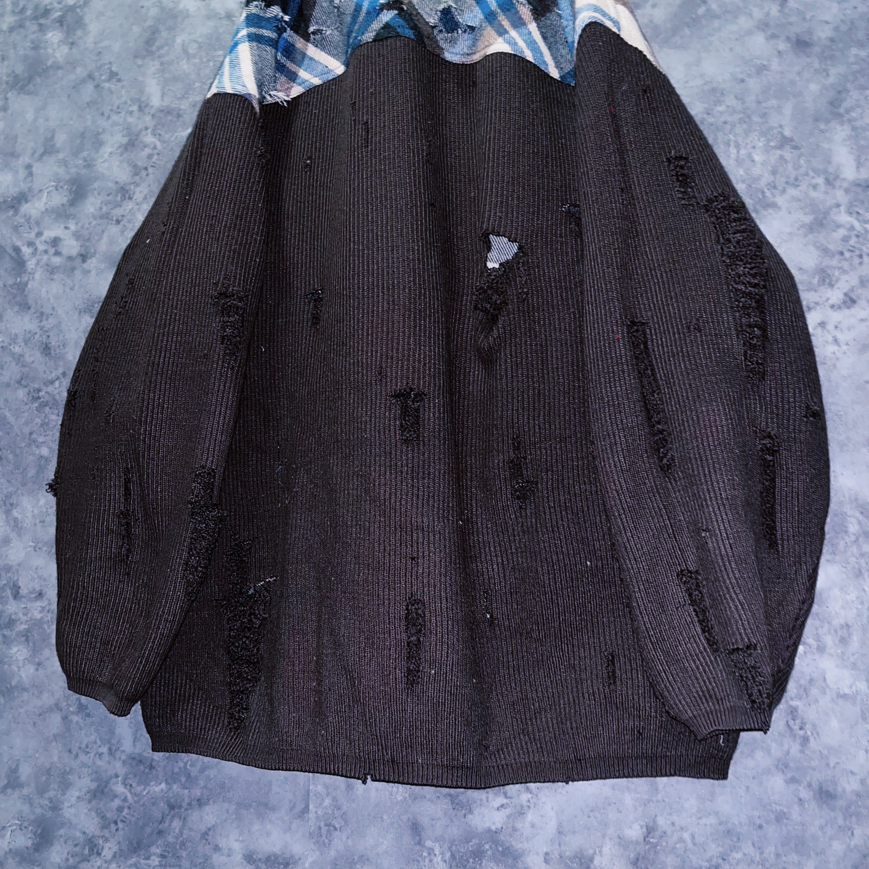 ボロカスタムを存分に楽しめる、チェック×ニットの黄金比。ボリュームのあるシルエットで一枚で柔らかく抜け感のある仕上がりになっており、スラックスと合わせればキレイめにダメージの甘辛な雰囲気を楽しめます。