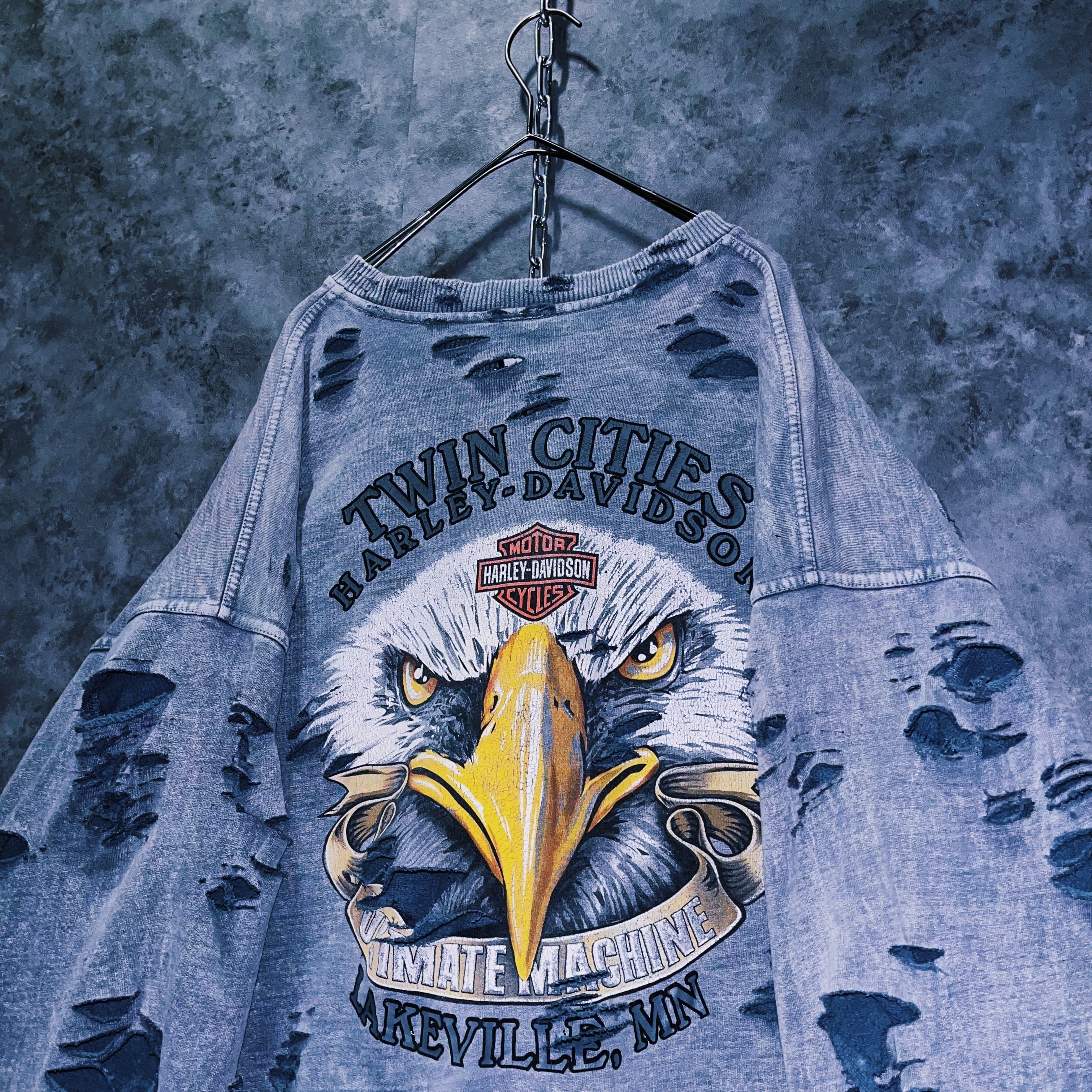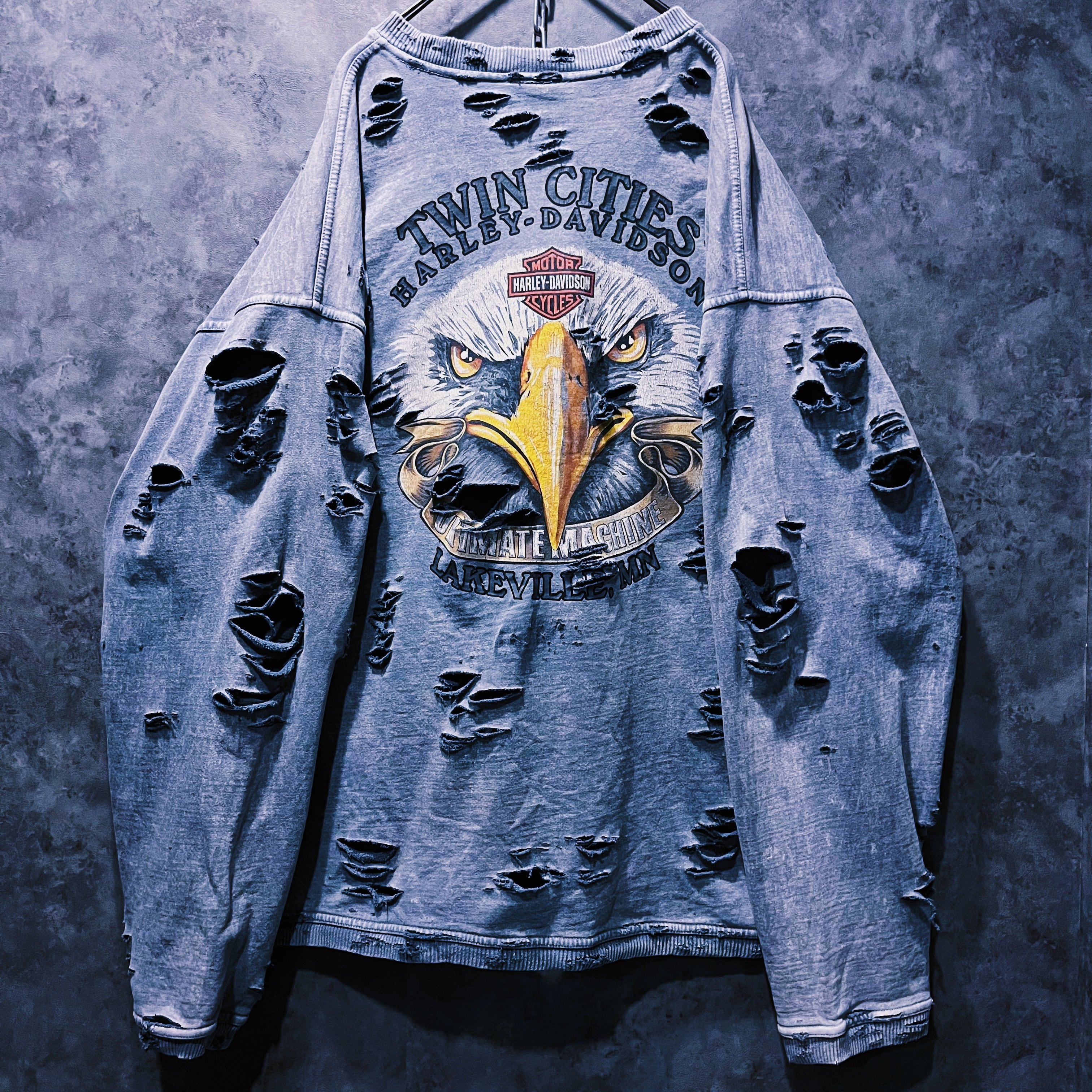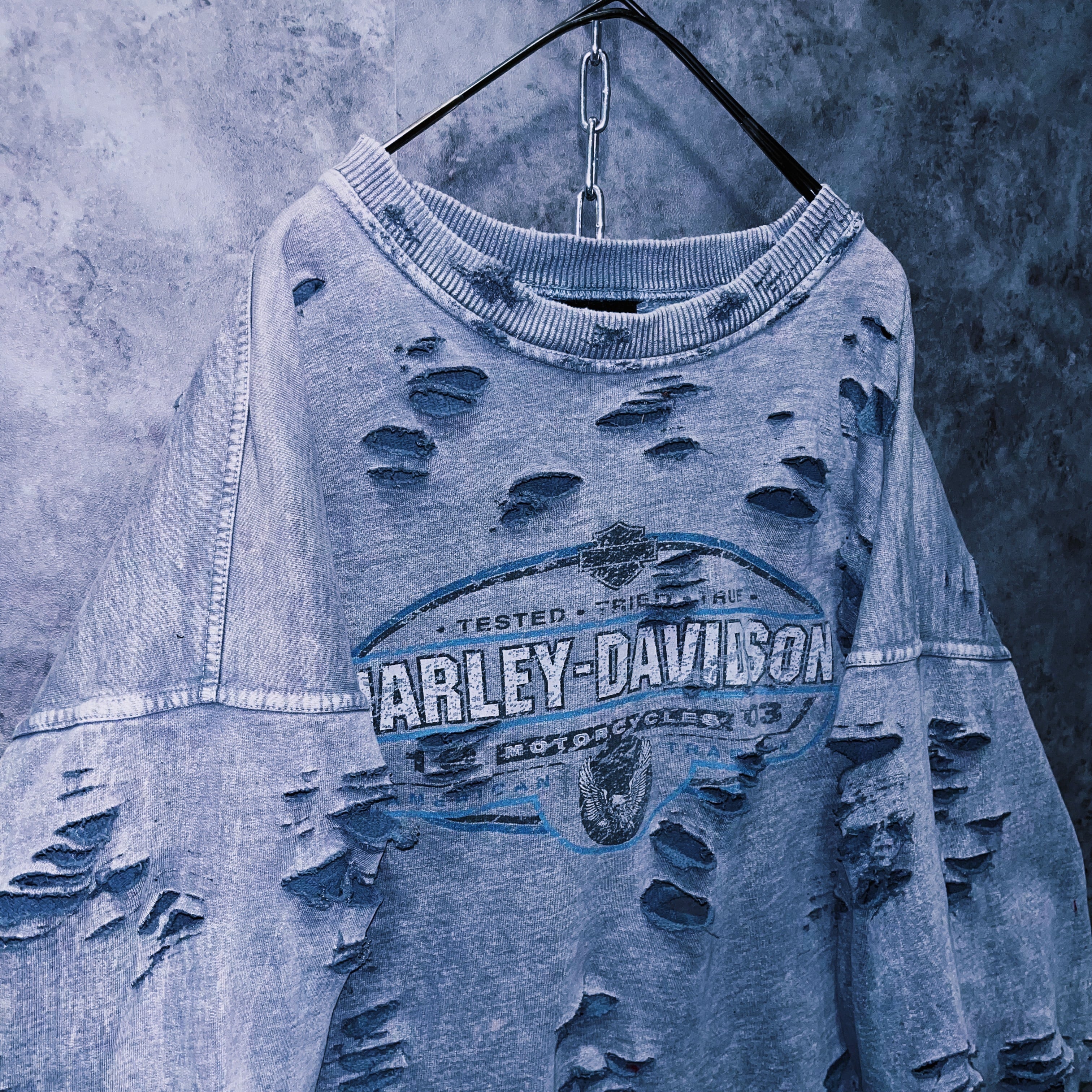当店自慢のグランジカスタムが全体に施されたことで、“Harley-Davidson”のグランジ感がより強調され、プリントのインパクトも上がったまさに大きな化学反応の結晶。