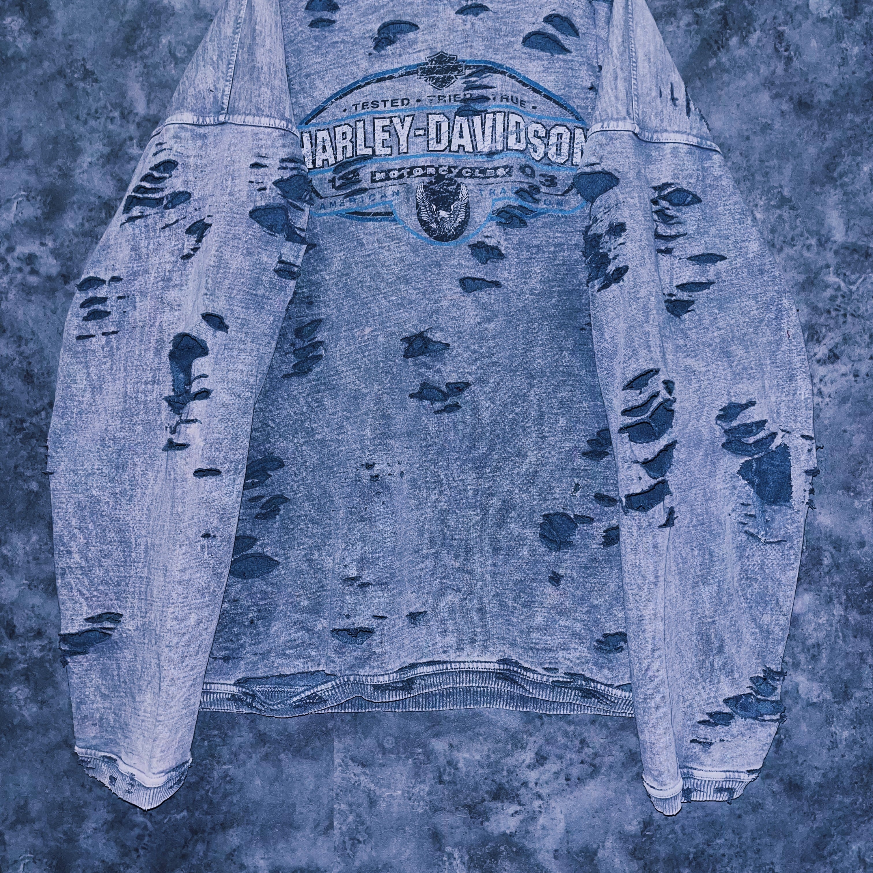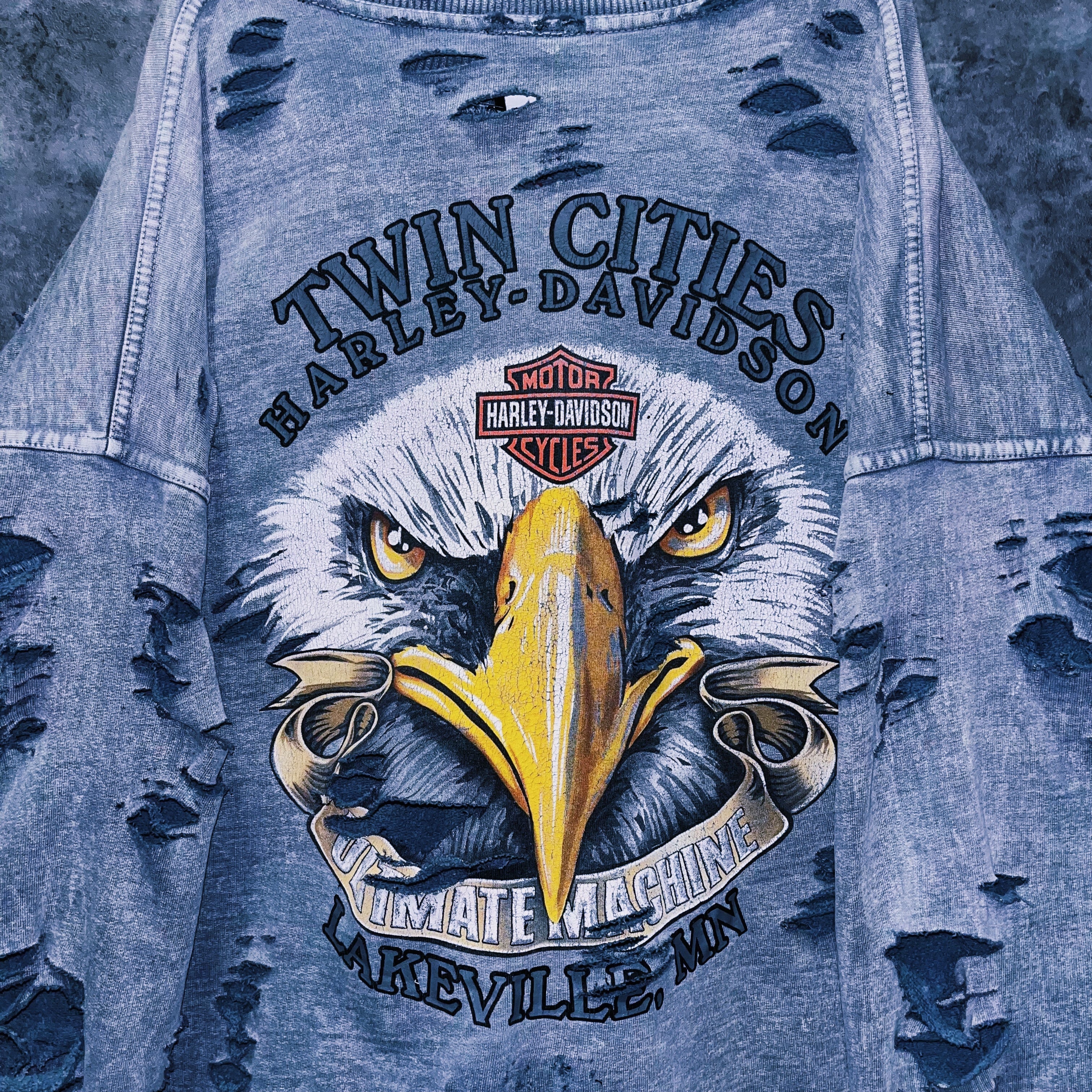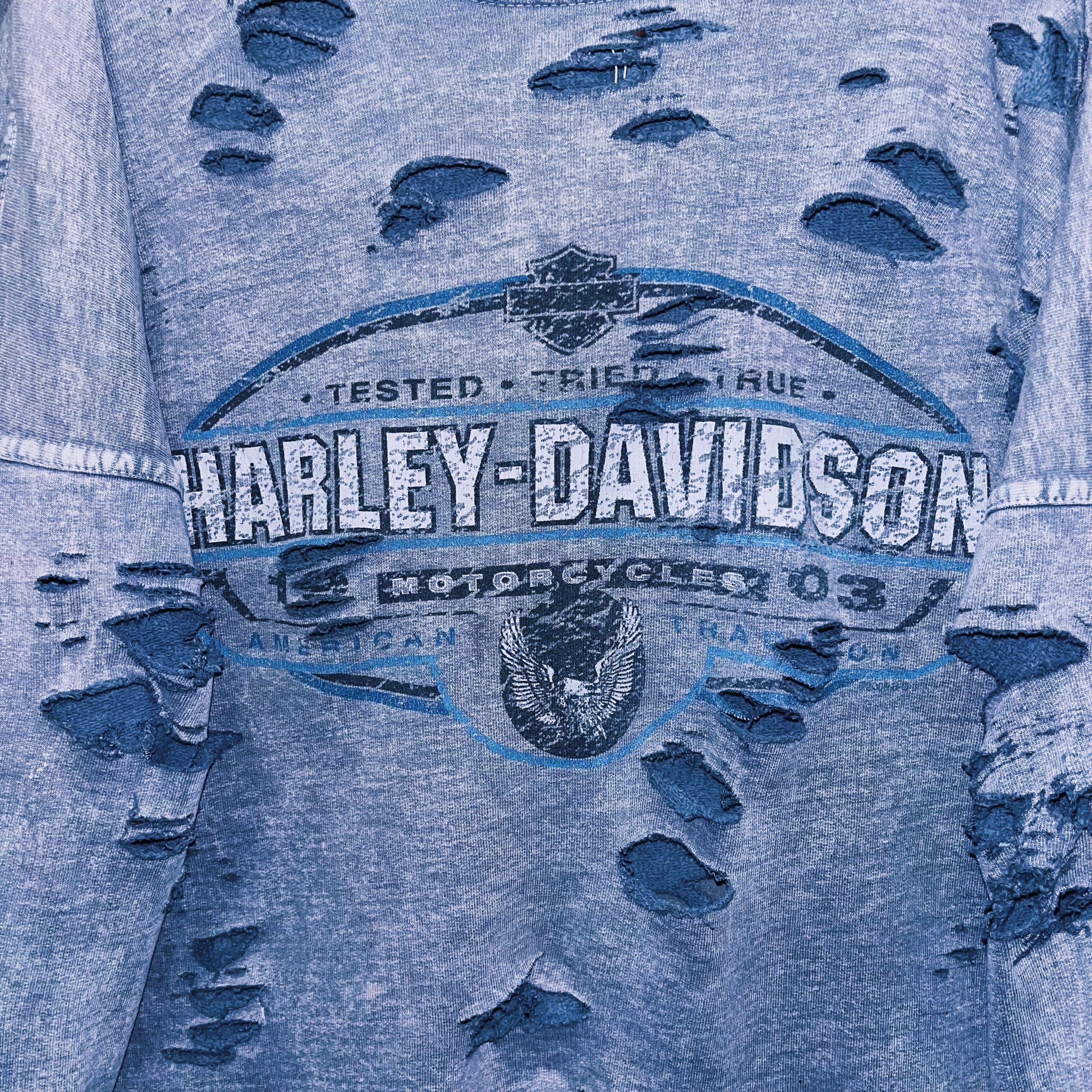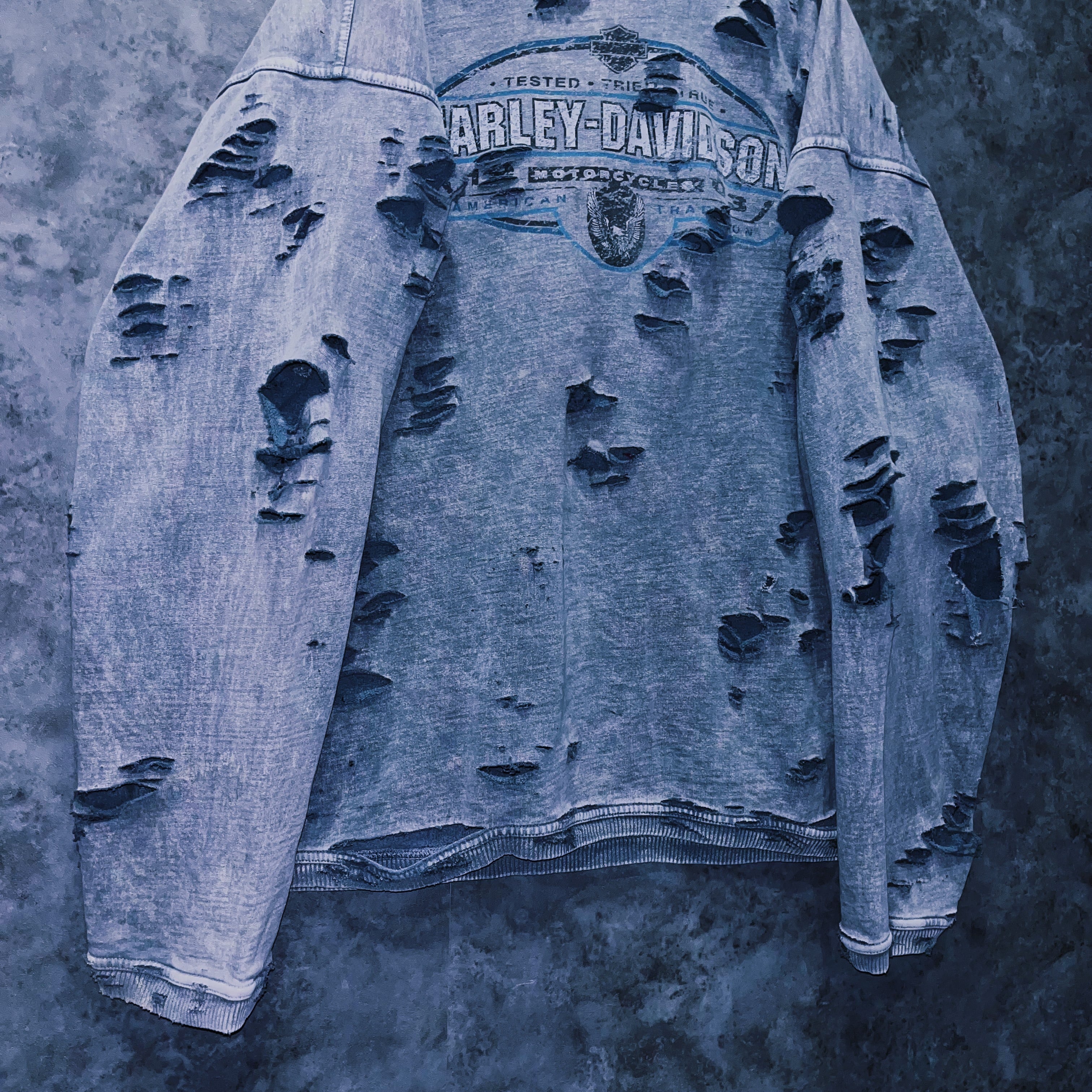 当店自慢のグランジカスタムが全体に施されたことで、“Harley-Davidson”のグランジ感がより強調され、プリントのインパクトも上がったまさに大きな化学反応の結晶。