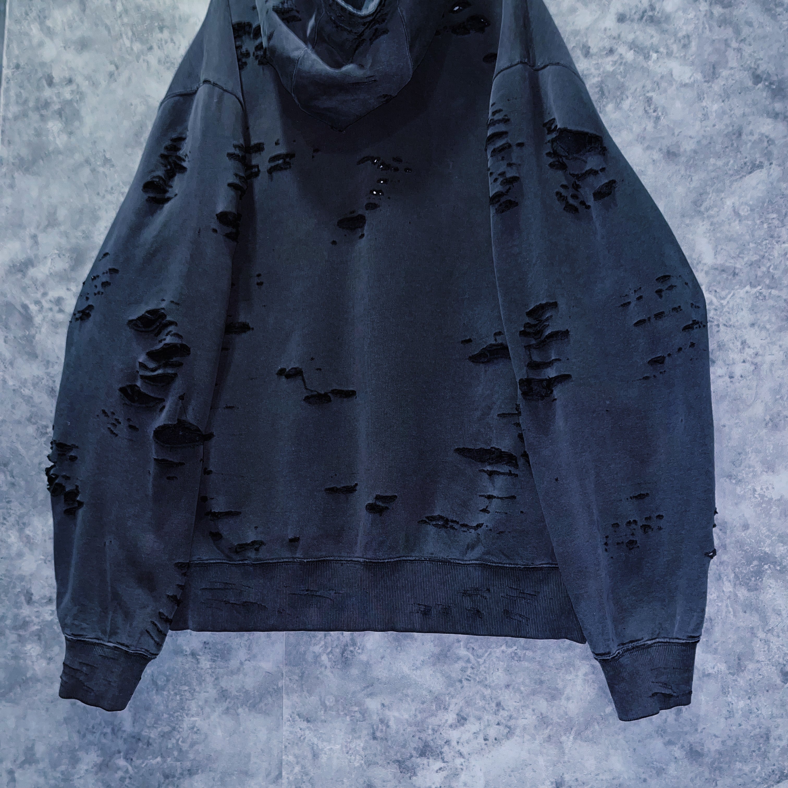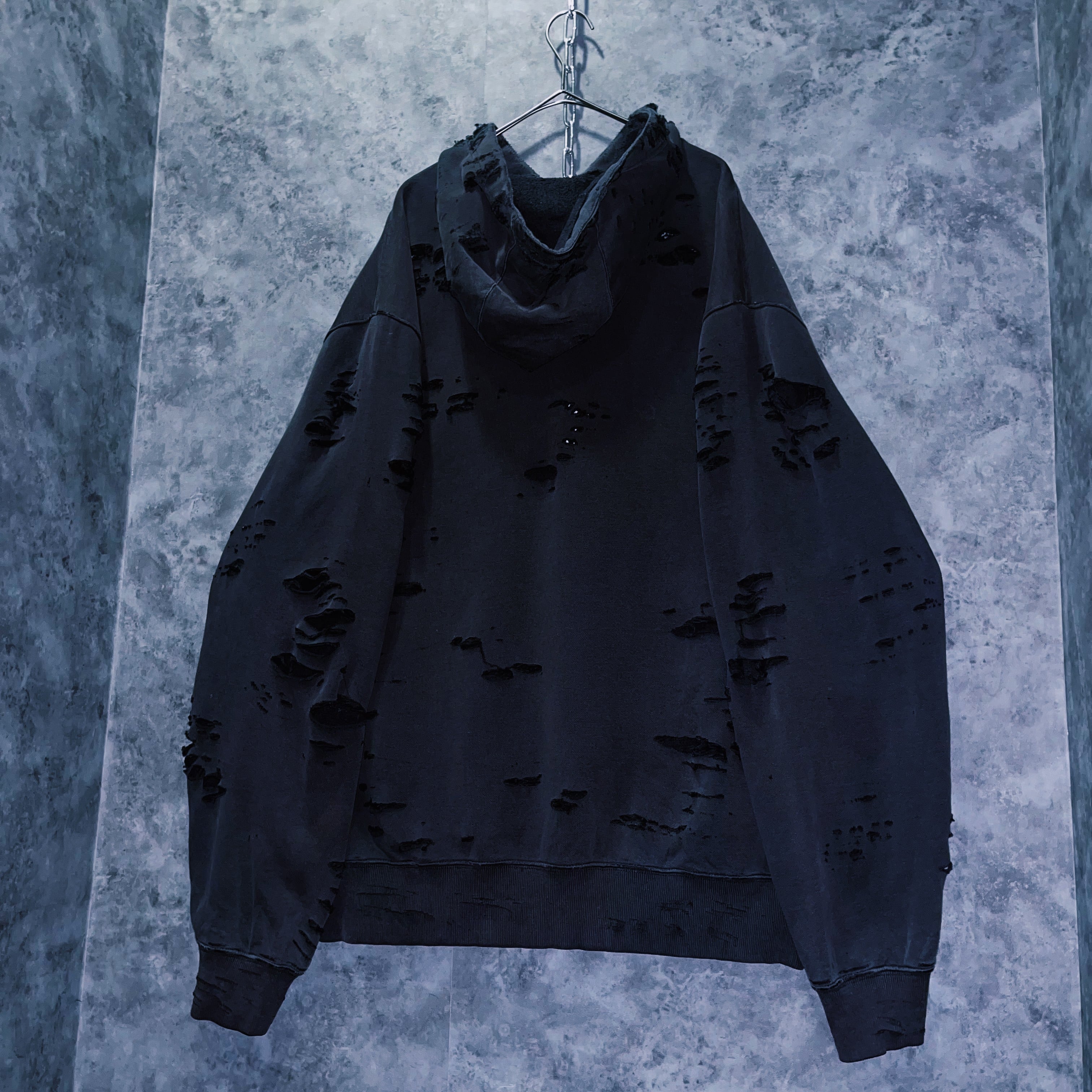 人気の高いモノクロカラーに当店自慢のダメージを全体に施した至高の逸品。ルーズなサイズ感に加えられたダメージは全体を通して絶妙な加減でデザインされ、肌見せやカラーインナーがよく映える計算され尽くしたボロカスタム。