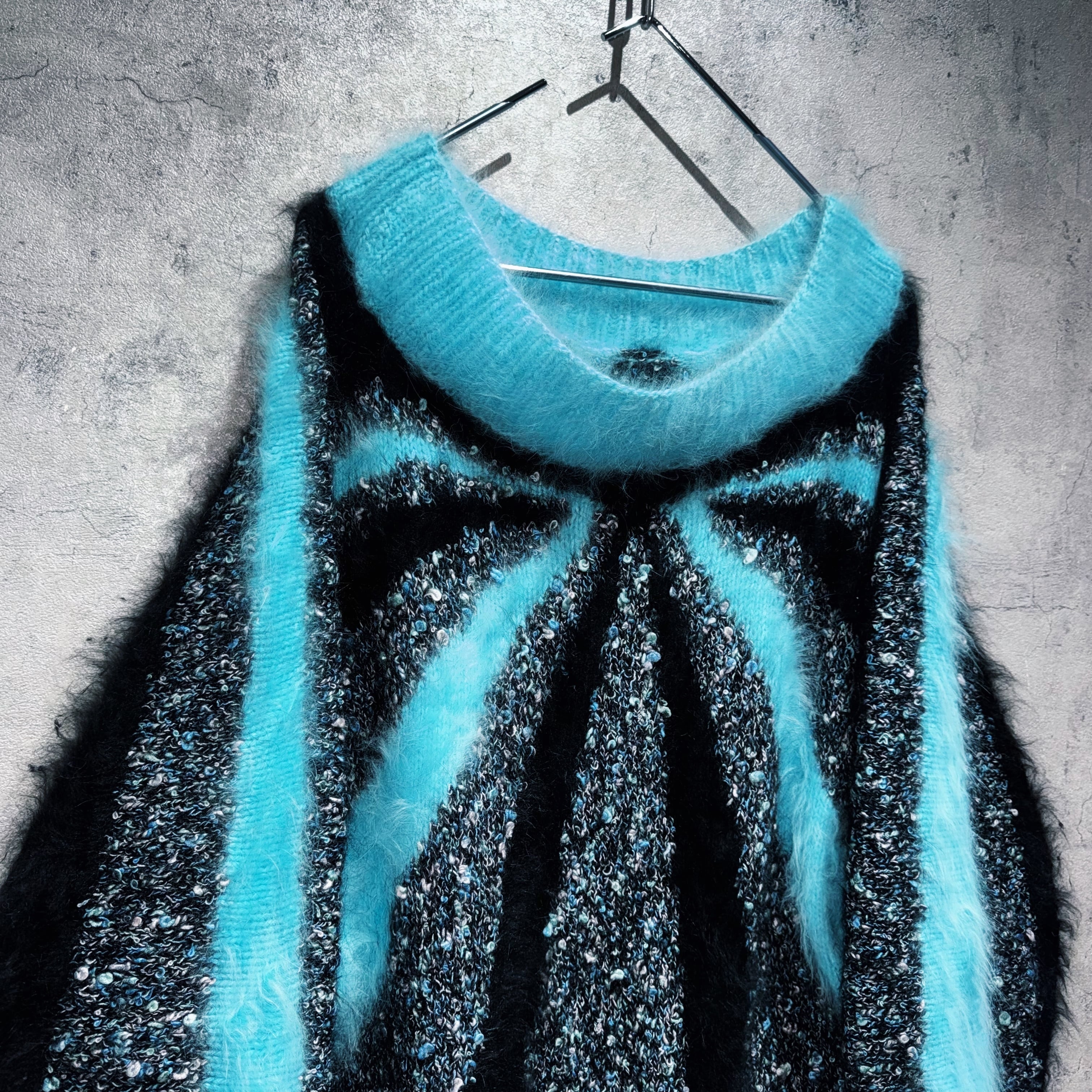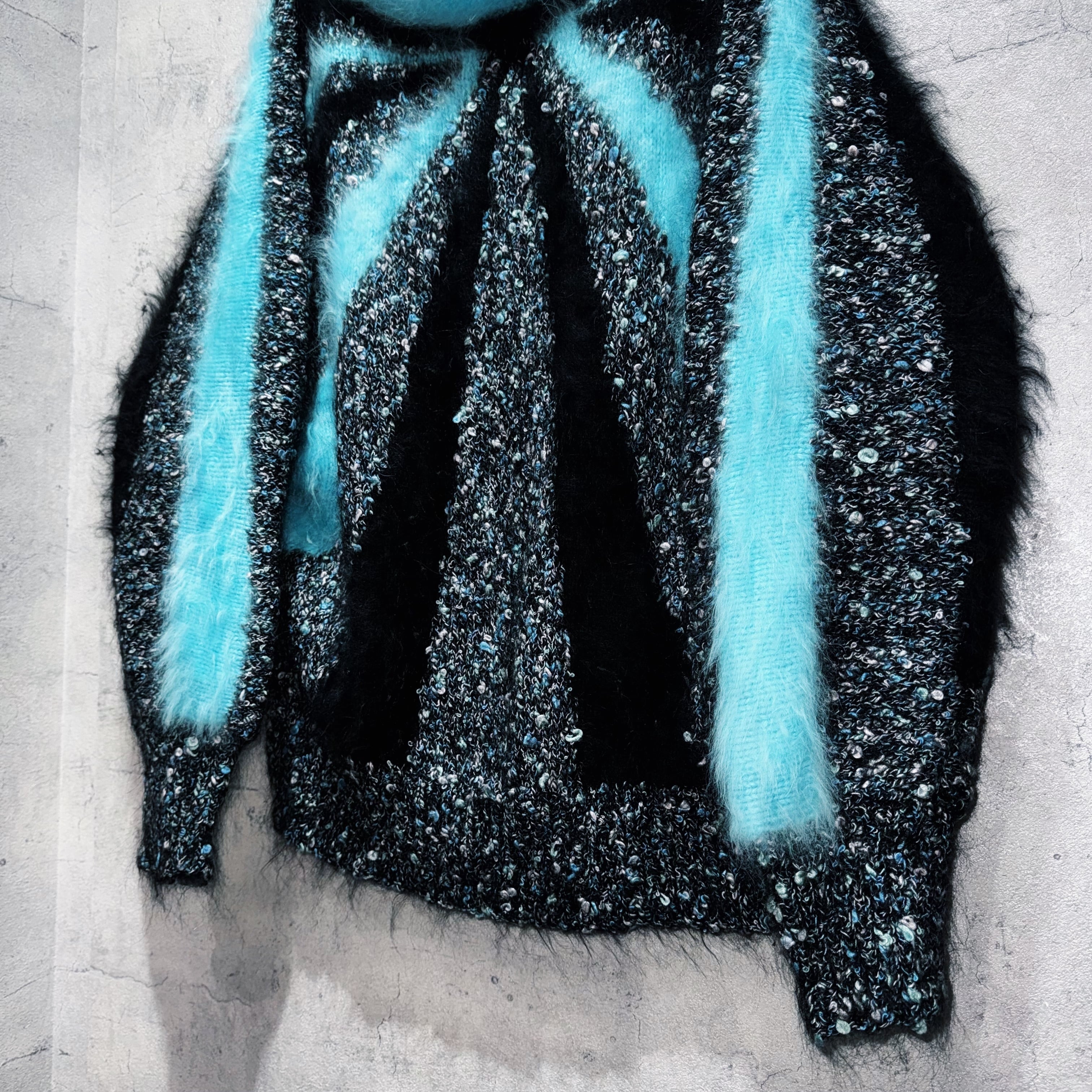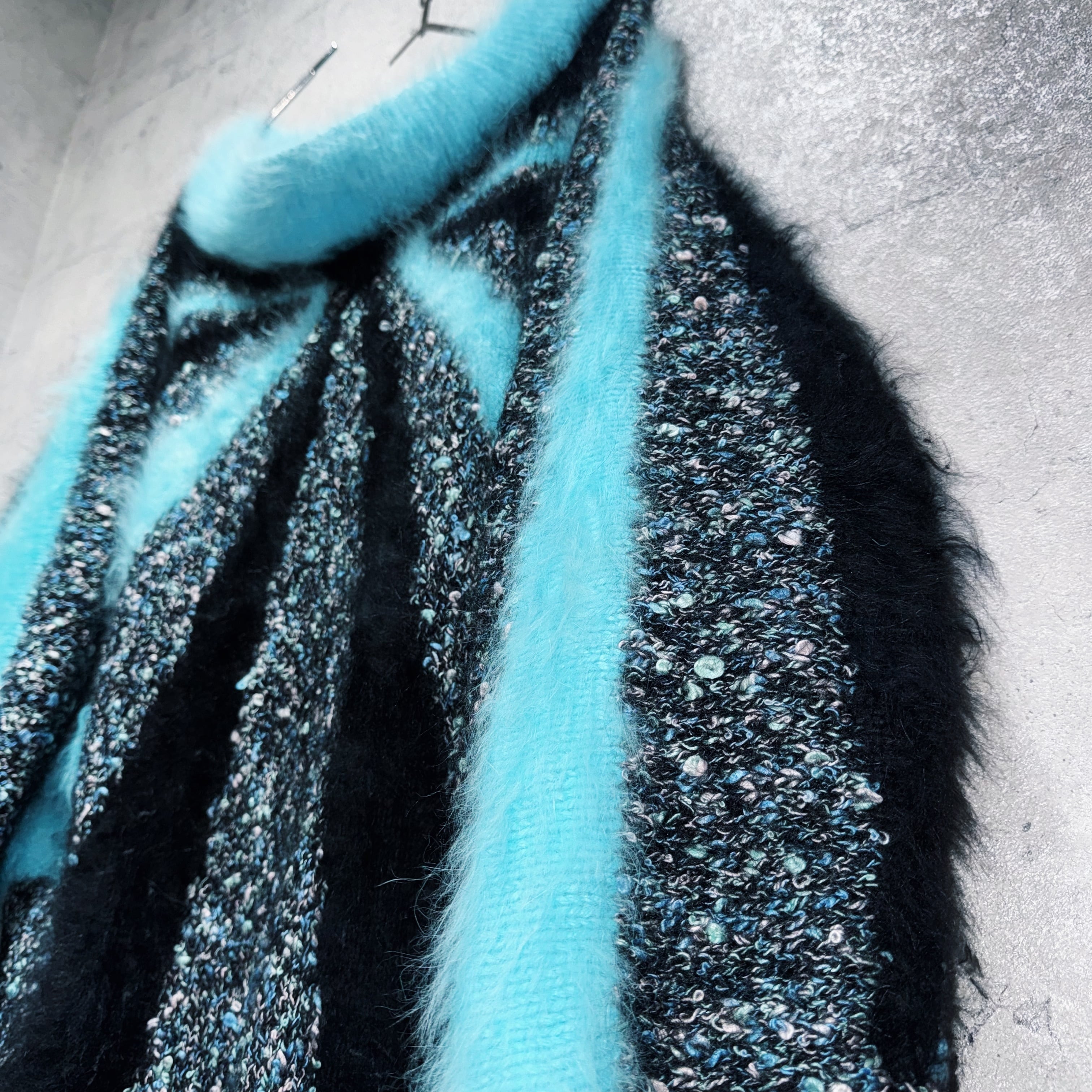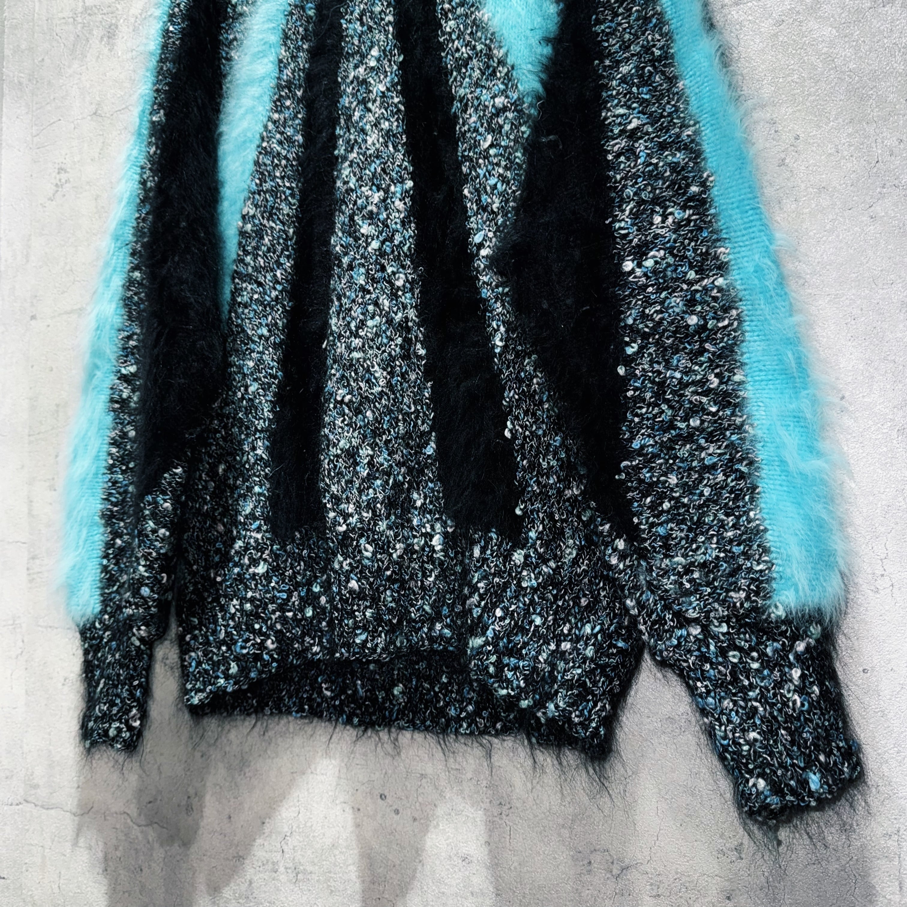 ニットの素材感も切り替わっており、ティファニーブルーとブラックカラーの所はモヘアライクになっています。