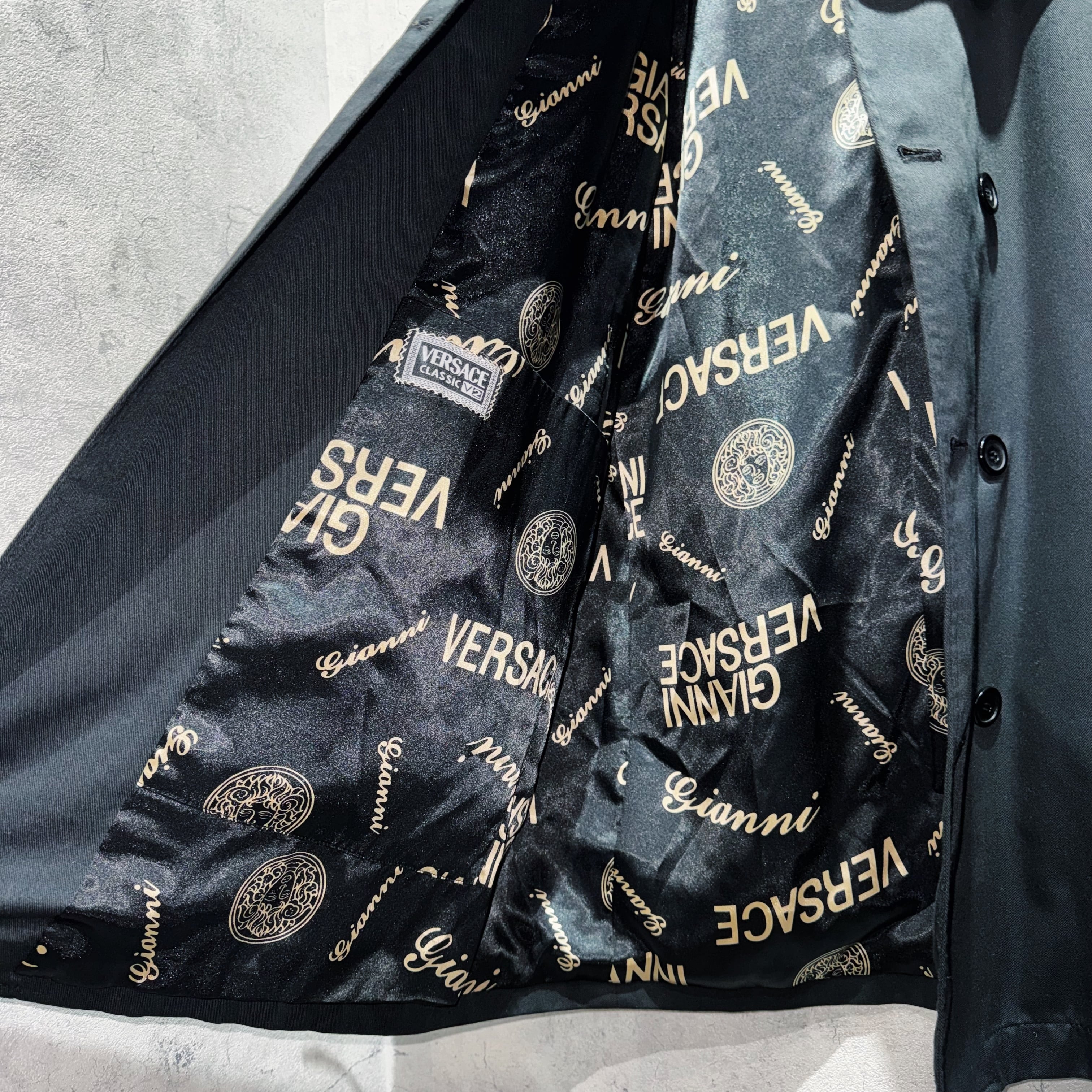 裏地にはヴェルサーチの代名詞であるメデューサのデザインと共に総柄デザインをあしらっており、裏地まで拘った極上のトレンチコート。