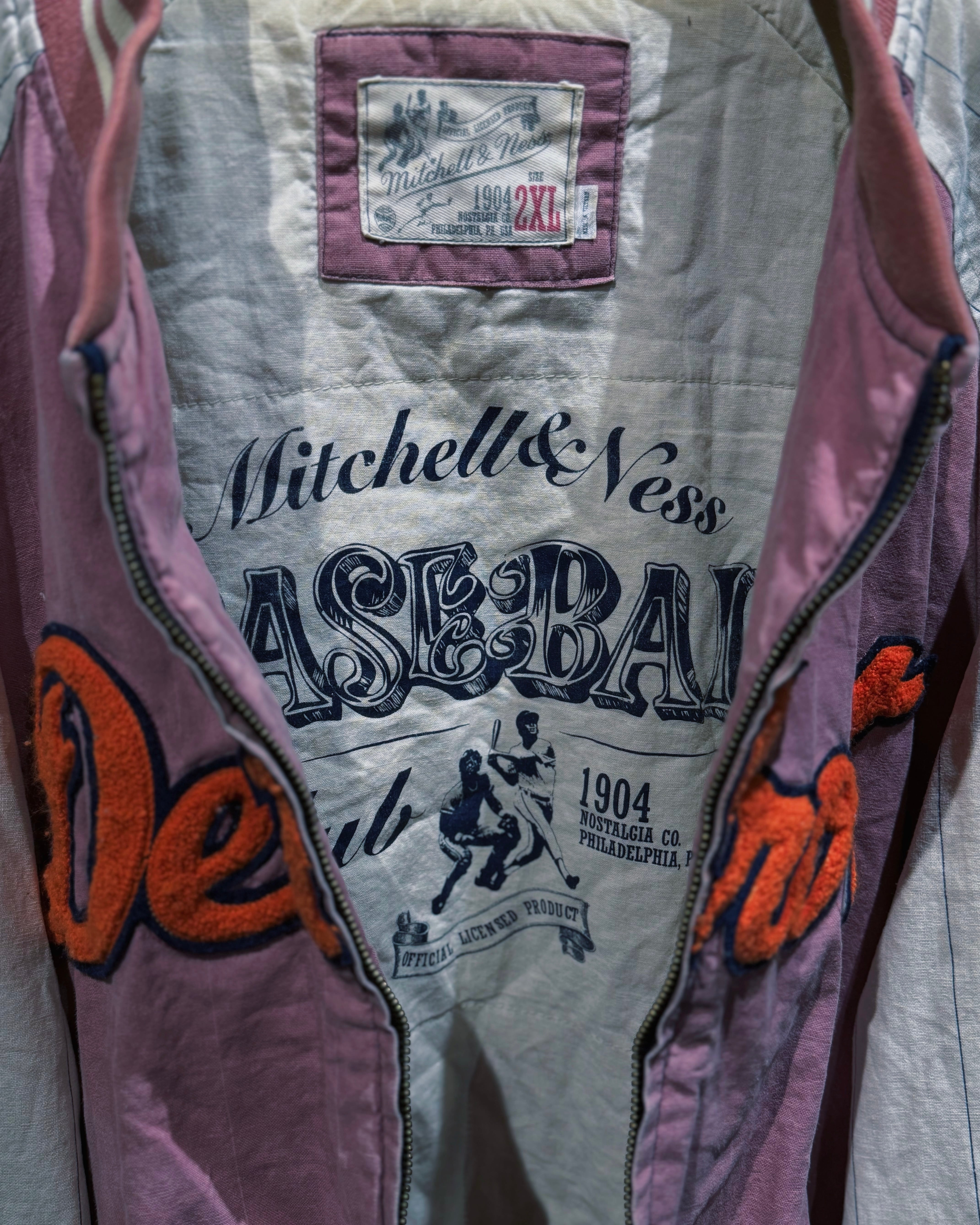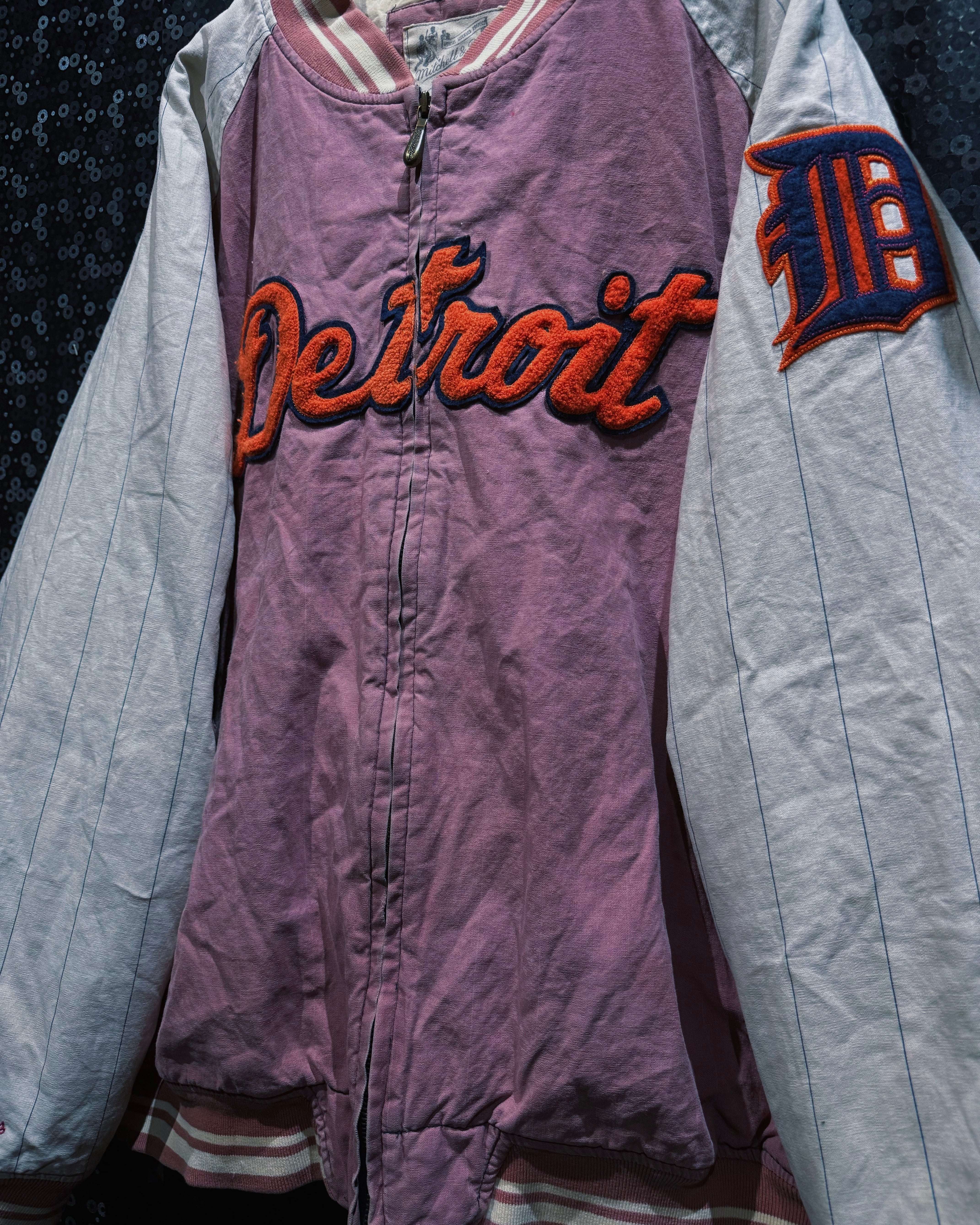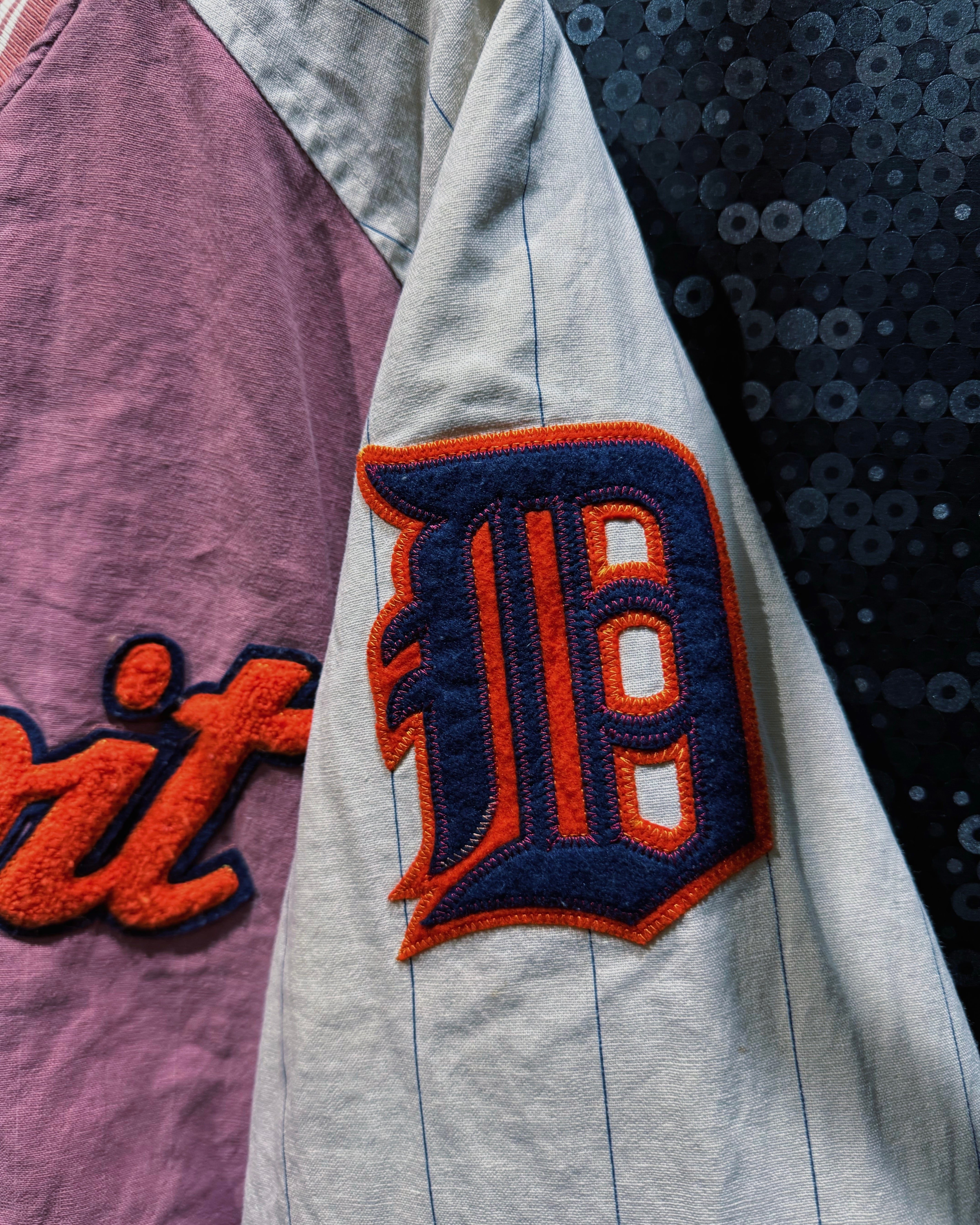 ミッチェル&ネス製の中でも極めて珍しい、ピンク×ホワイトのボディにオレンジロゴを組み合わせたDetroit Tigersスタジャン。胸のDetroitロゴはチェーンステッチによる立体刺繍で存在感抜群。