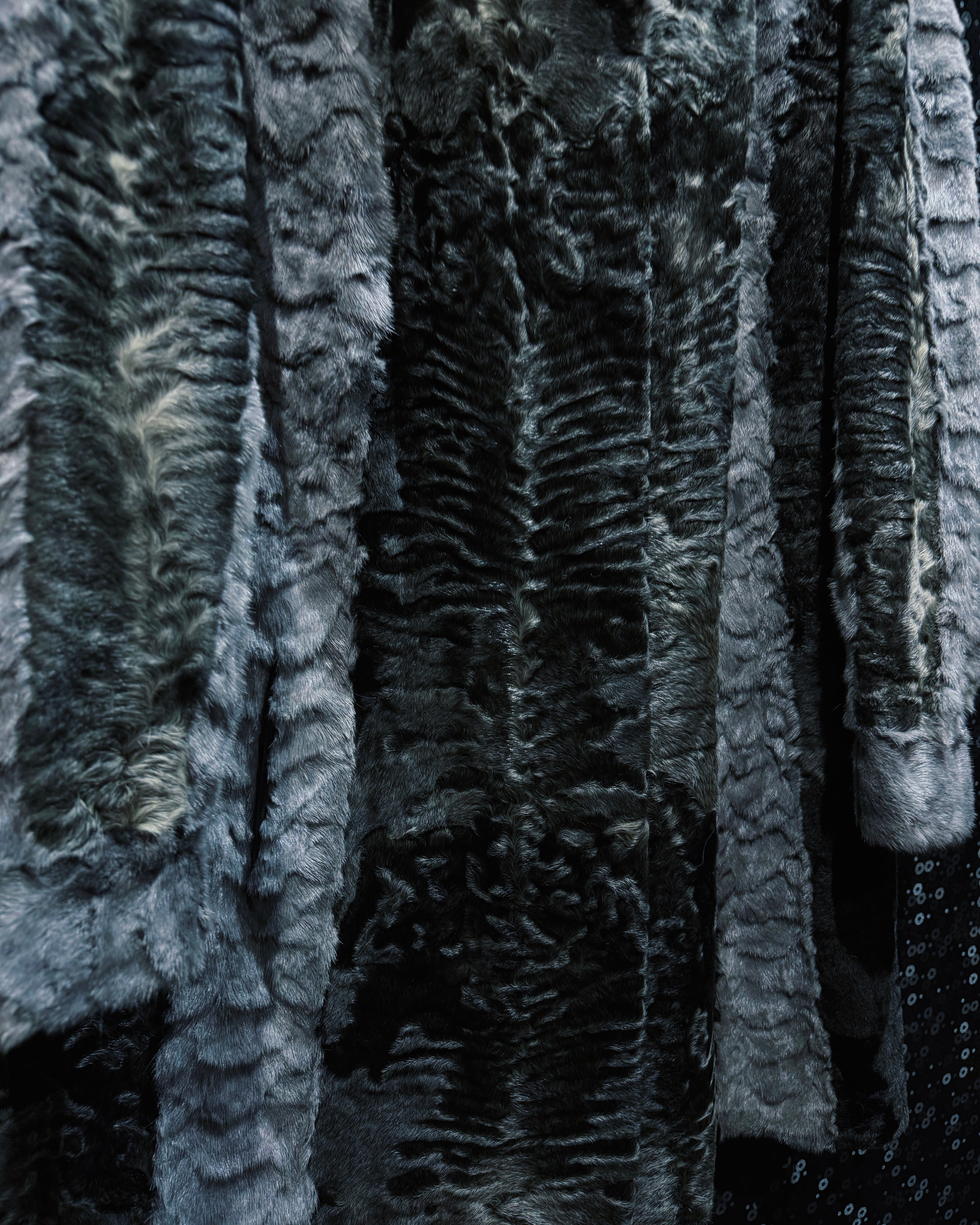 異なる毛足・表情のファーを縦にパネル状に切り替え、立体的で陰影豊かな表情を生み出すロングファーコート。