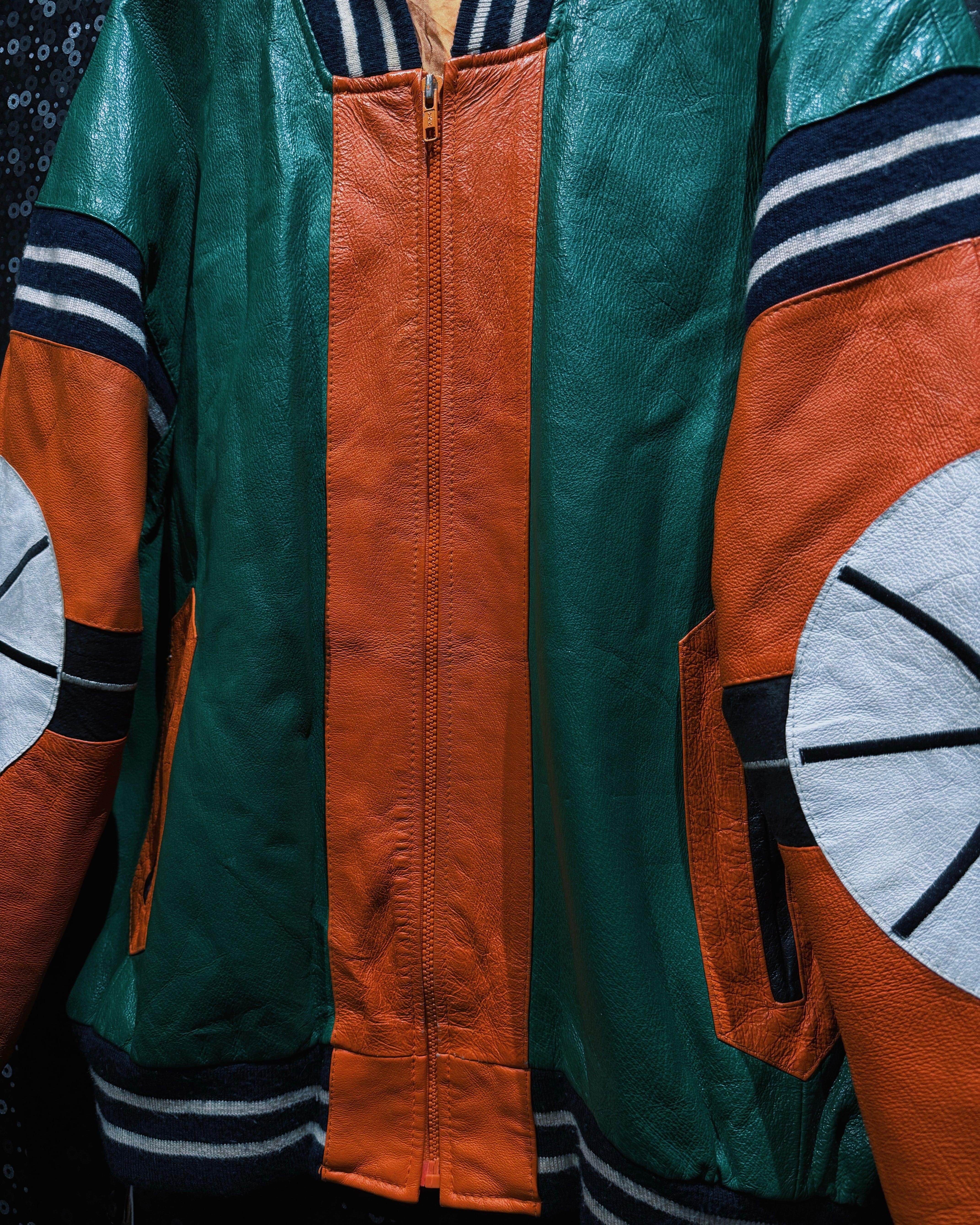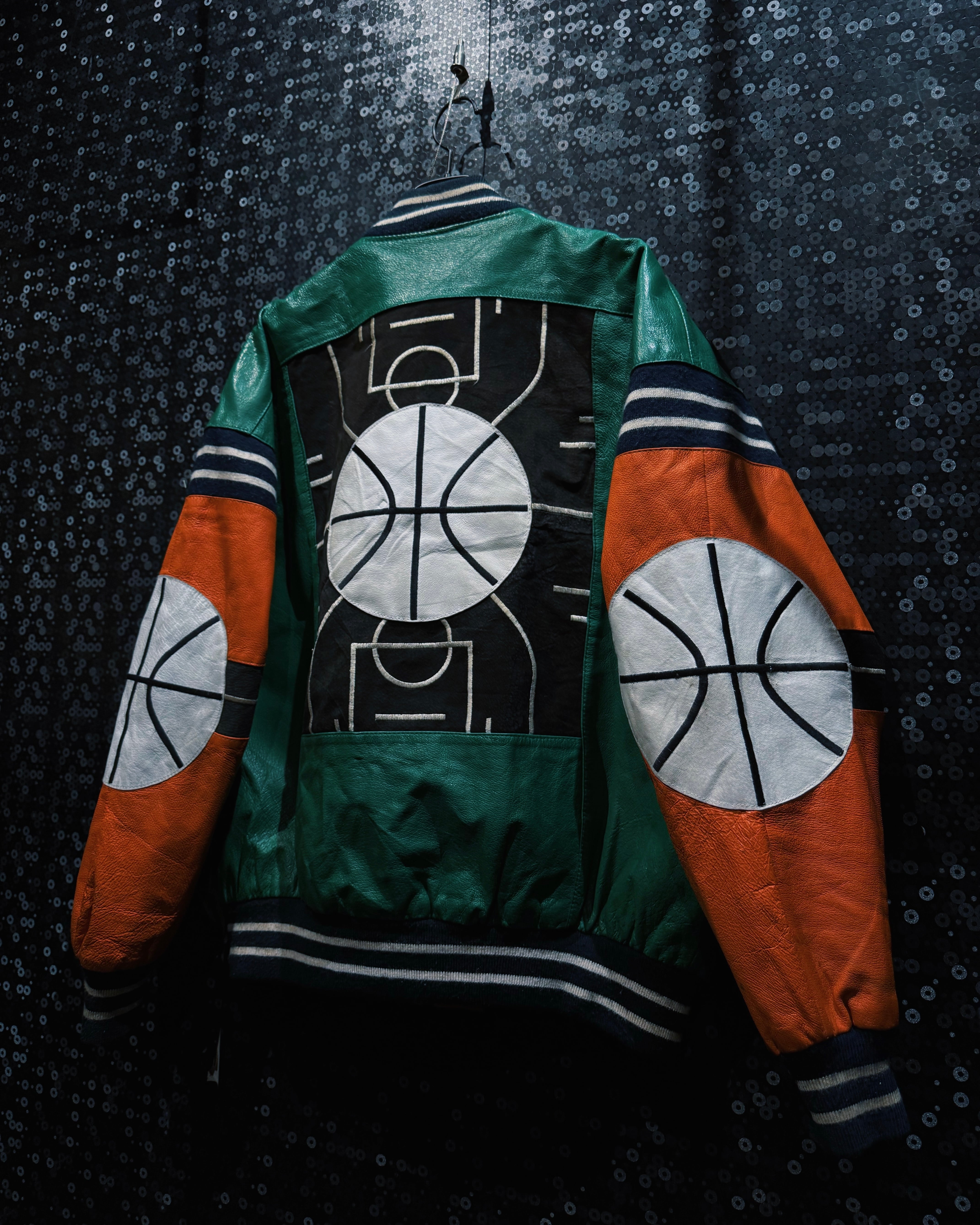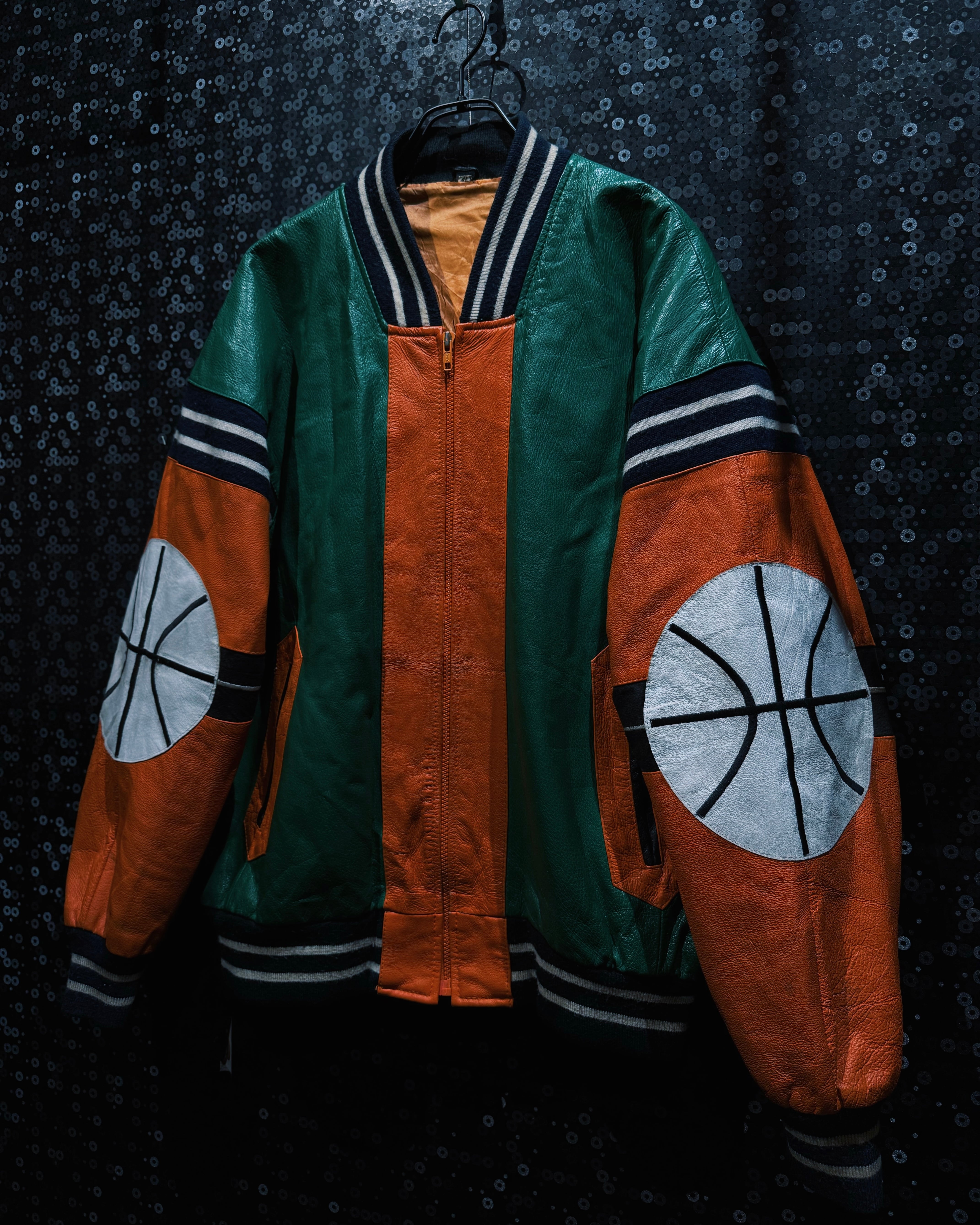 鮮やかなグリーンとオレンジレザーを大胆に切り替え、袖には巨大な“レザーバスケットボールパッチ”を配置した超アートピース級スタジャン。