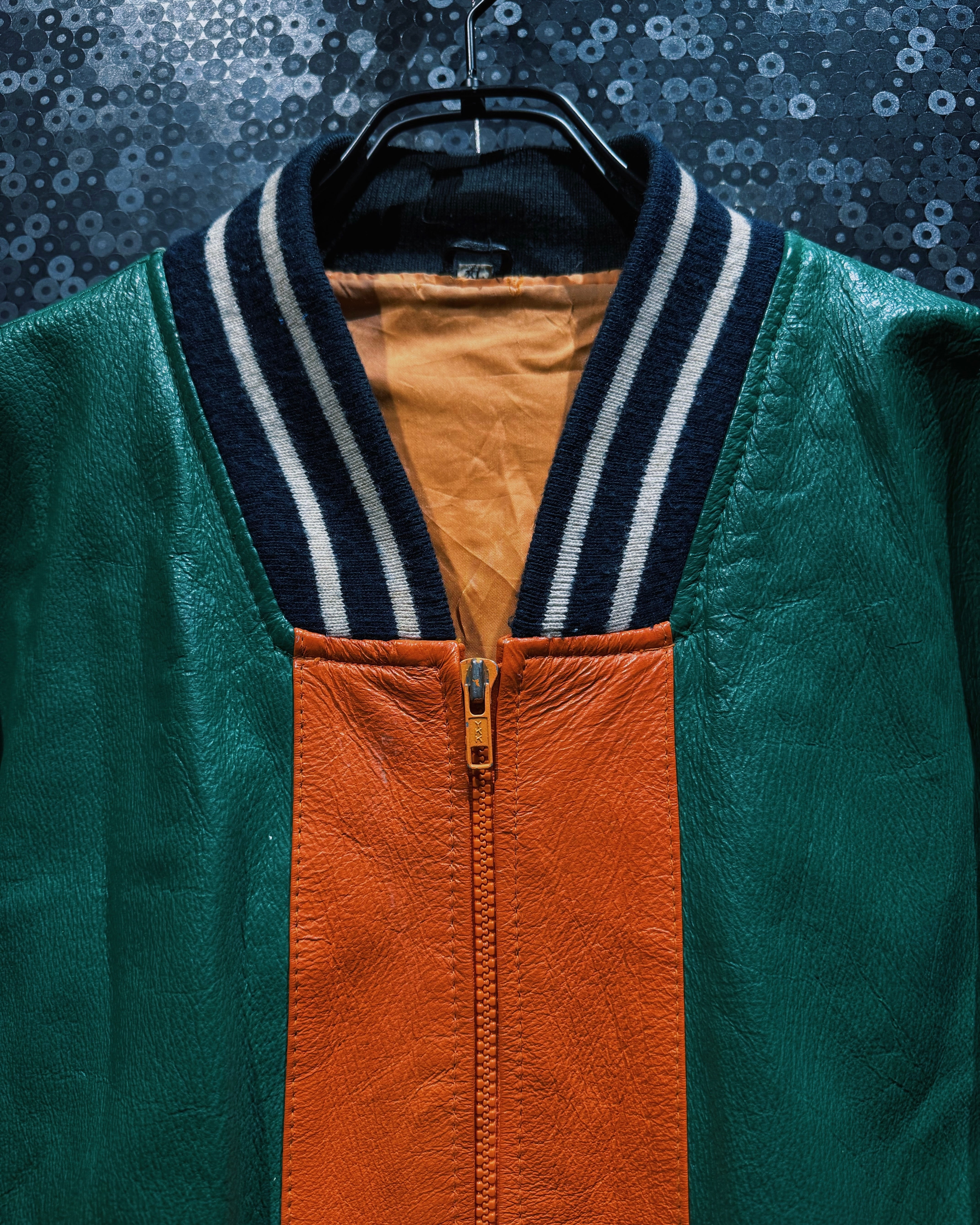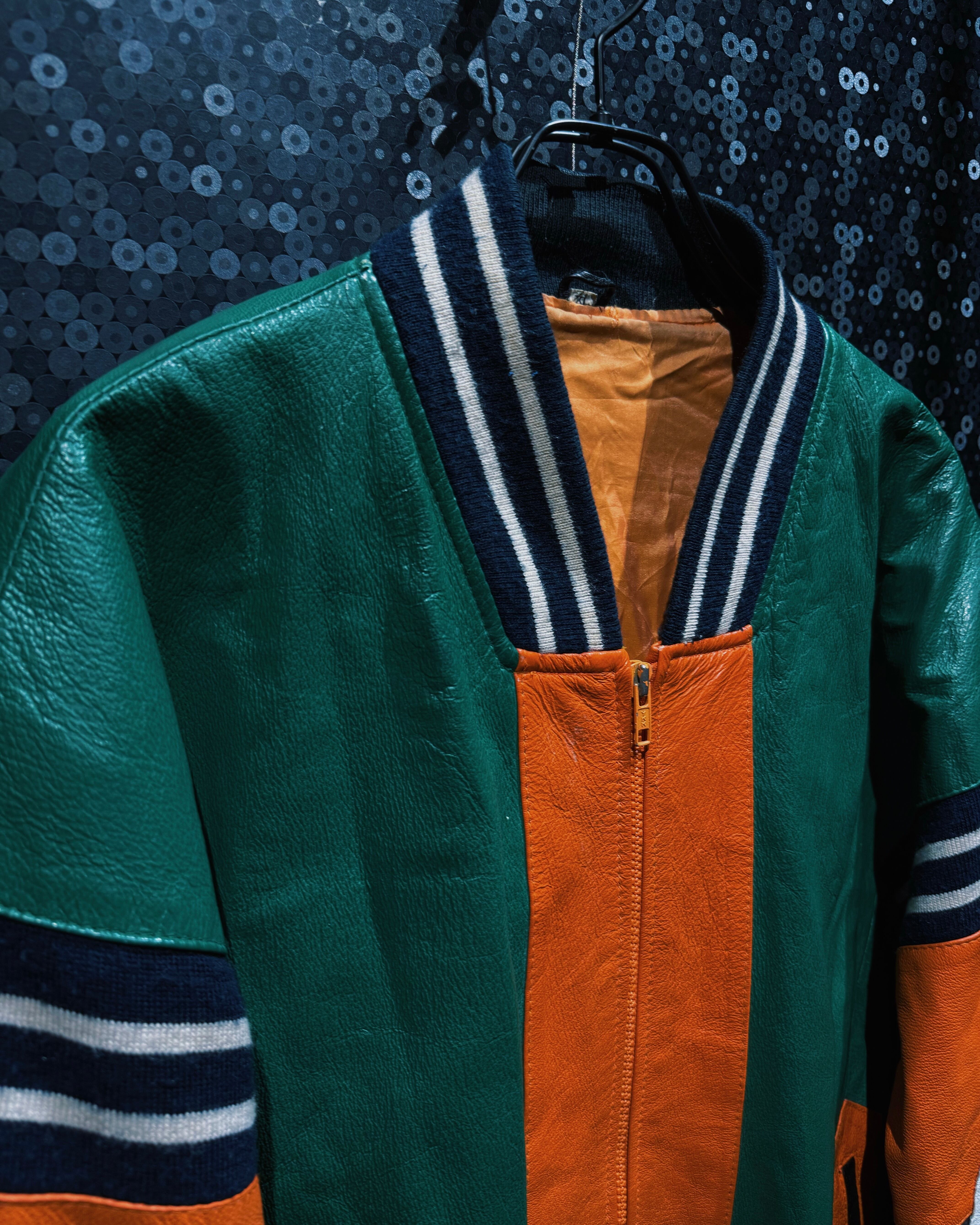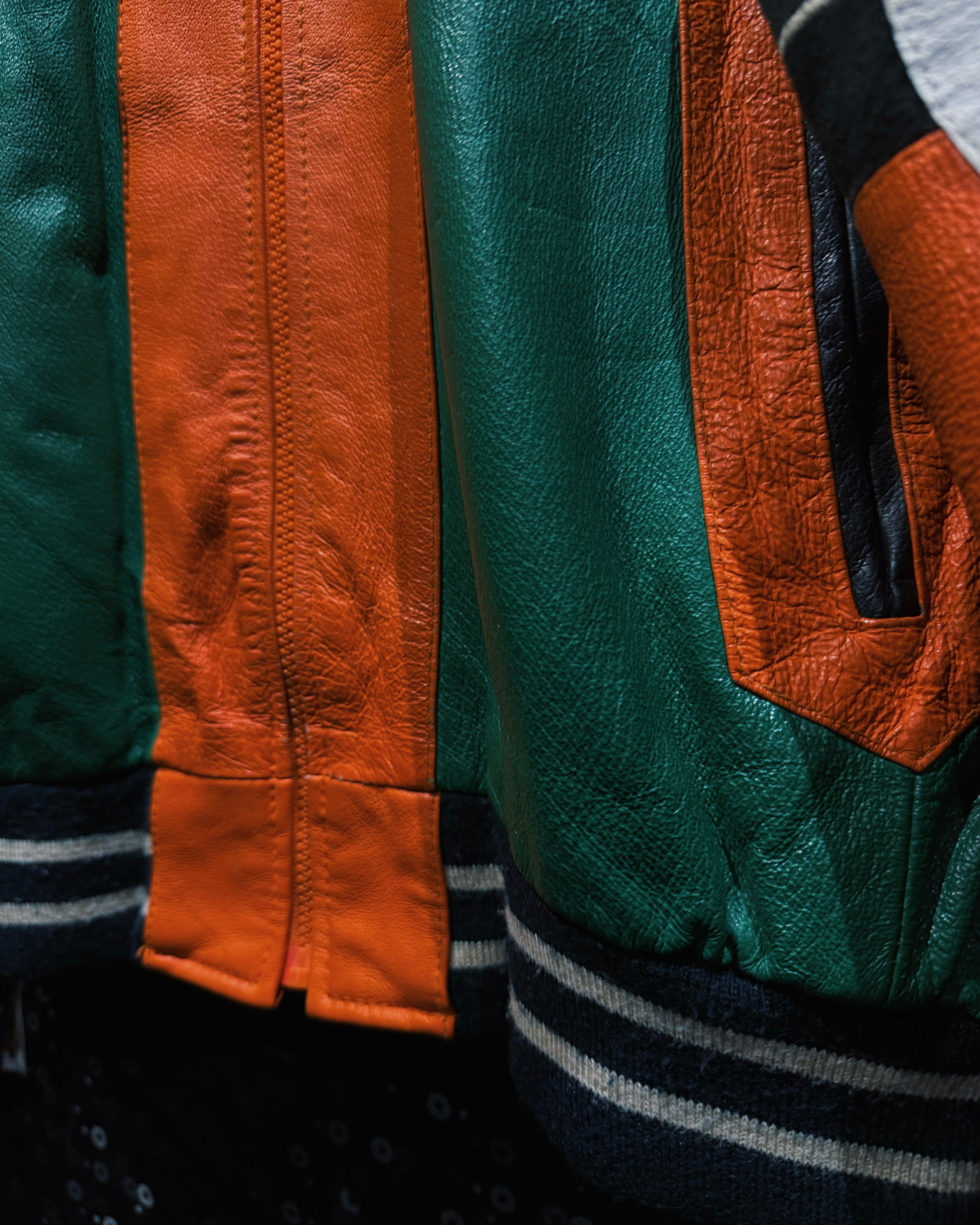鮮やかなグリーンとオレンジレザーを大胆に切り替え、袖には巨大な“レザーバスケットボールパッチ”を配置した超アートピース級スタジャン。