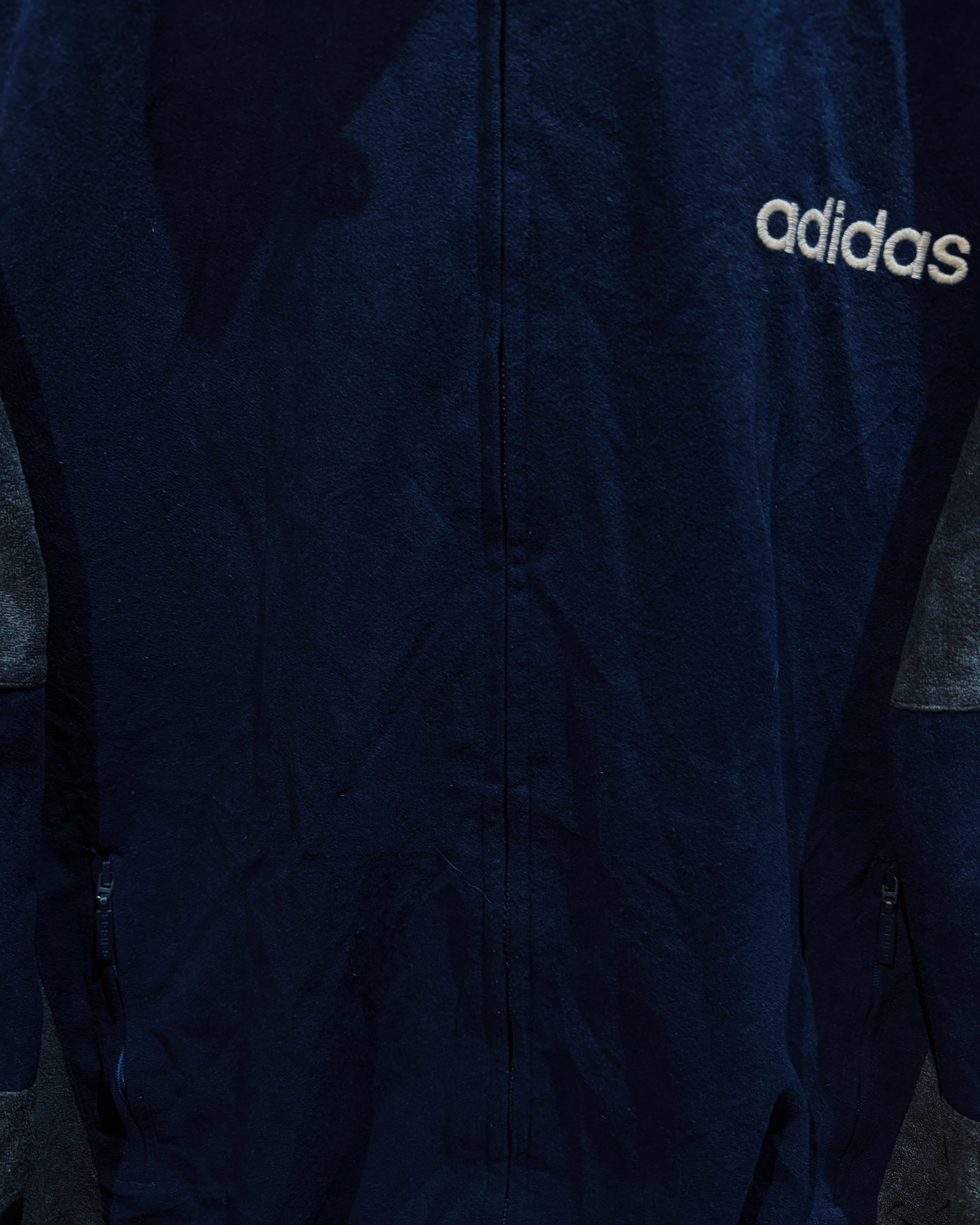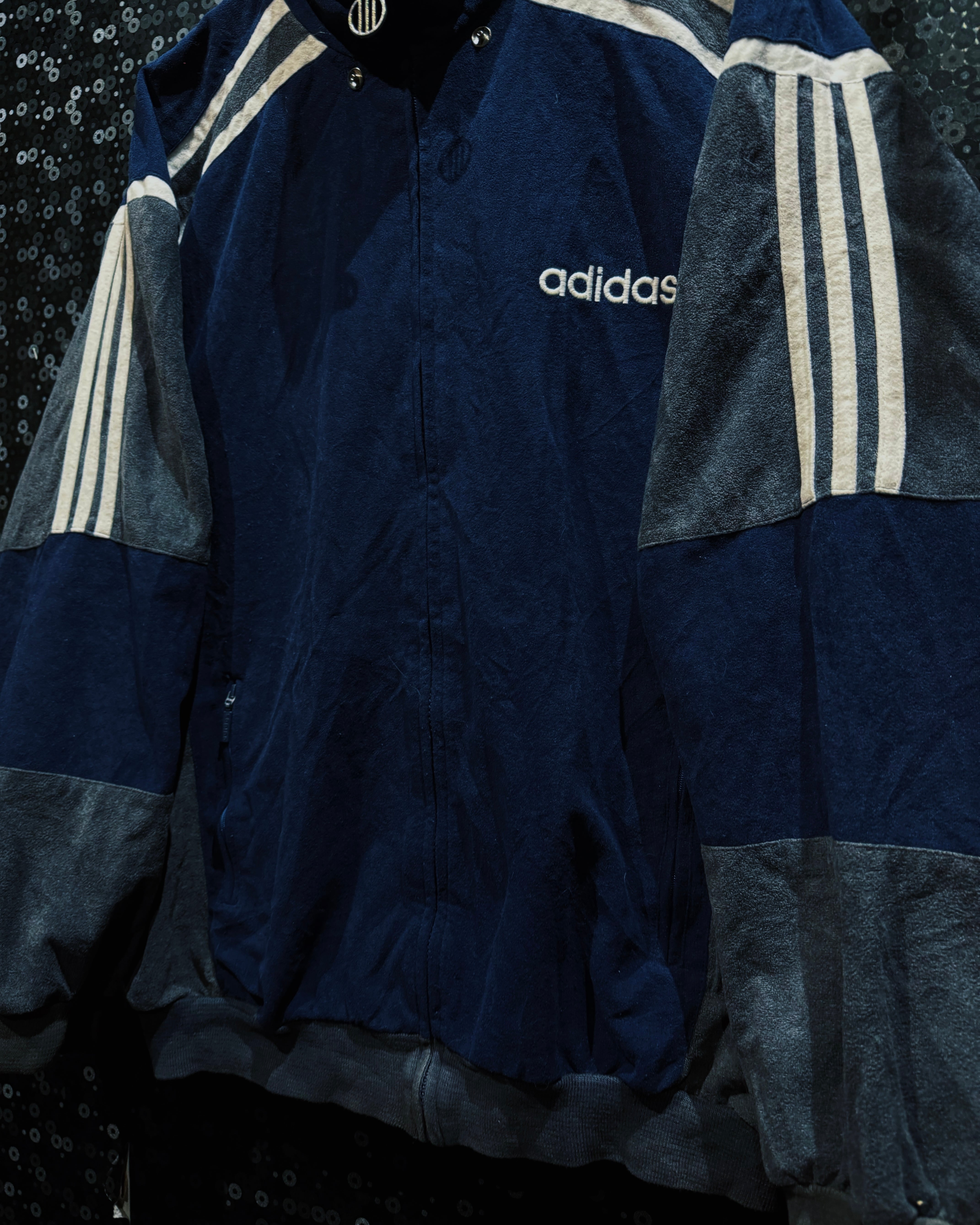 ネイビーと杢グレーが大胆に切り替えられた90s特有のスイッチングデザインが魅力のヴィンテージadidasトラックジャケット。肩から大きく走るスリーストライプは太めテープのクラシック仕様で、現行品とは明らかに違う存在感を放つポイント。