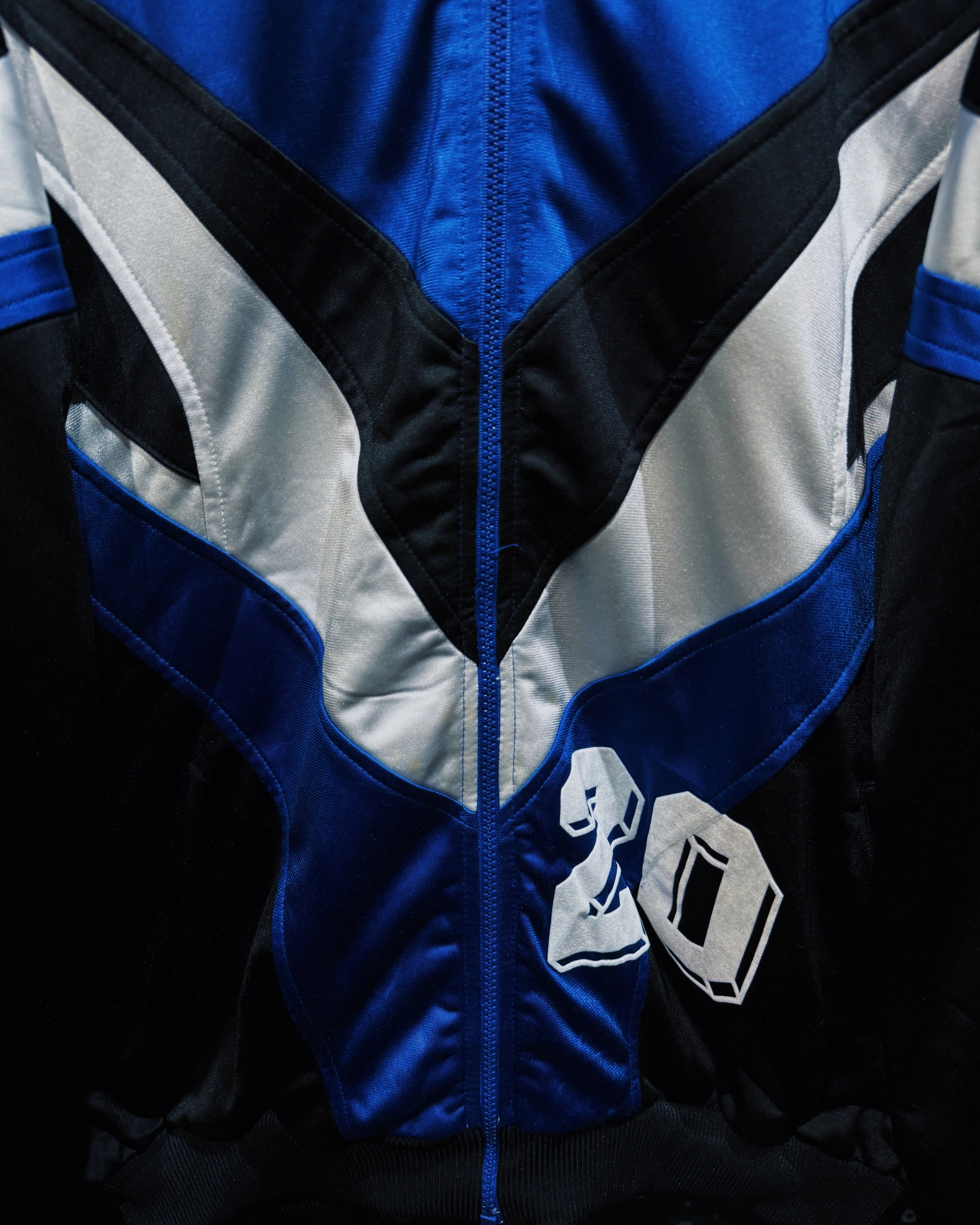 鮮烈なブルーを軸に、ブラックとホワイトのシャープな切替を複雑に組み合わせたハイデザインのトラックジャケット。胸の小ロゴだけで十分に存在感がある中、フロントの“20”プリントがアクセントとして効き、まるでユニフォームとファッションの中間のような独特のムードを放つ。