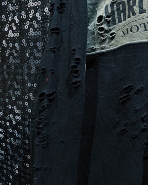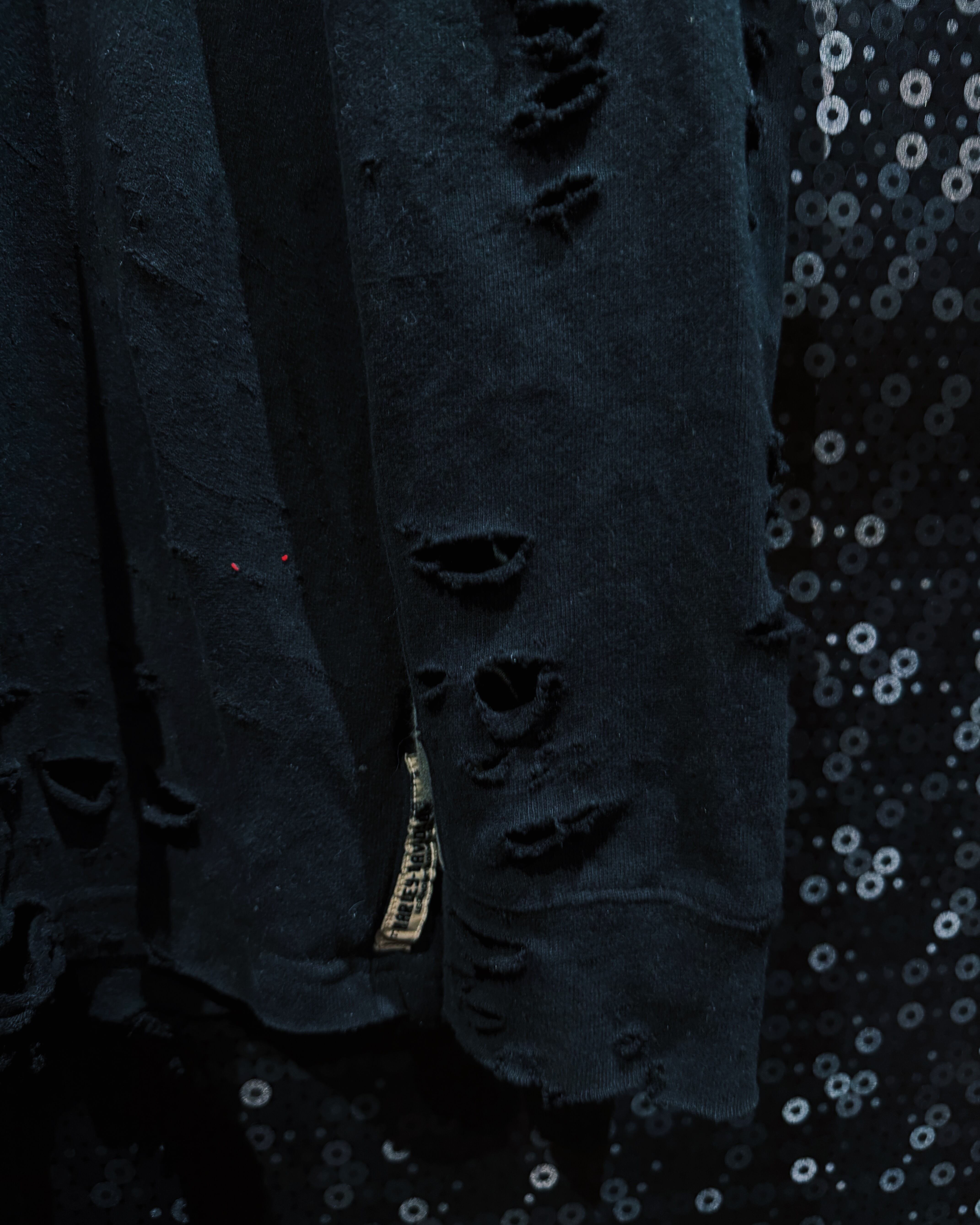 袖・裾・ネックの細かなほつれも計算されており、着るだけで空気が変わるような強烈なムードを纏う。ブラック特有の退色やくすみも自然な風合いとなり、ボロ加工をより立体的に際立たせている。無骨でありながらファッションとしても成立する、唯一無二のハーレー。