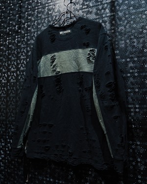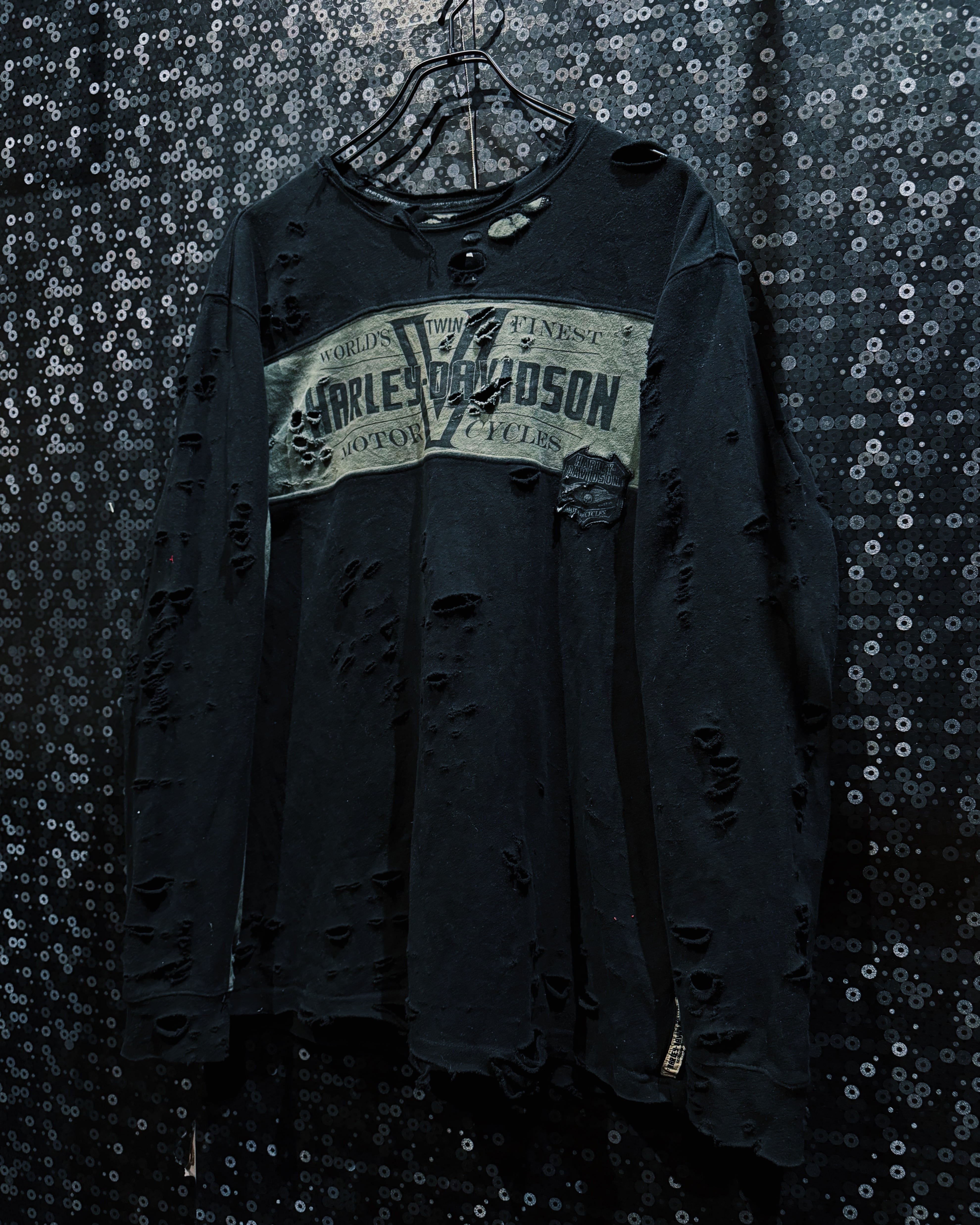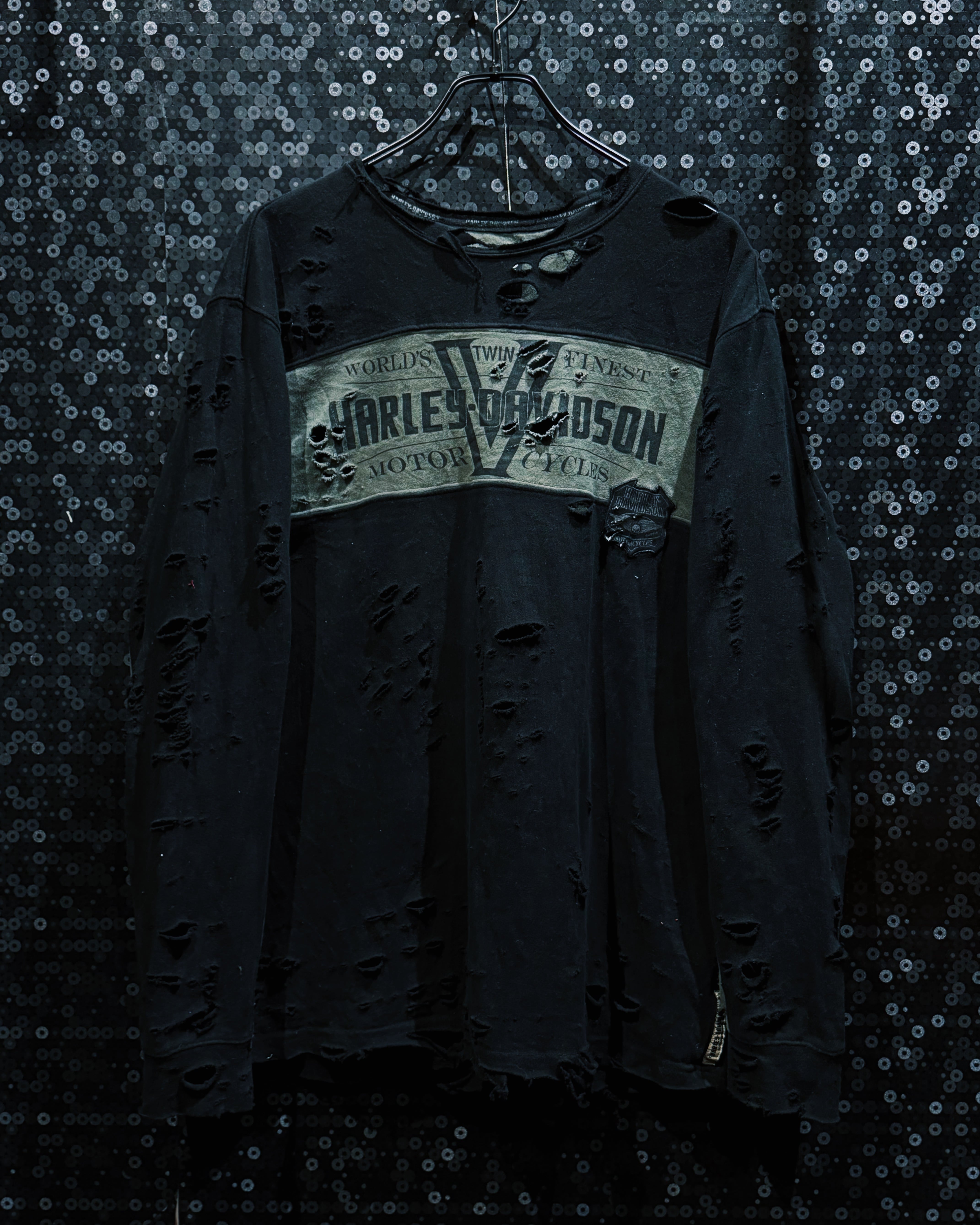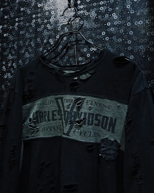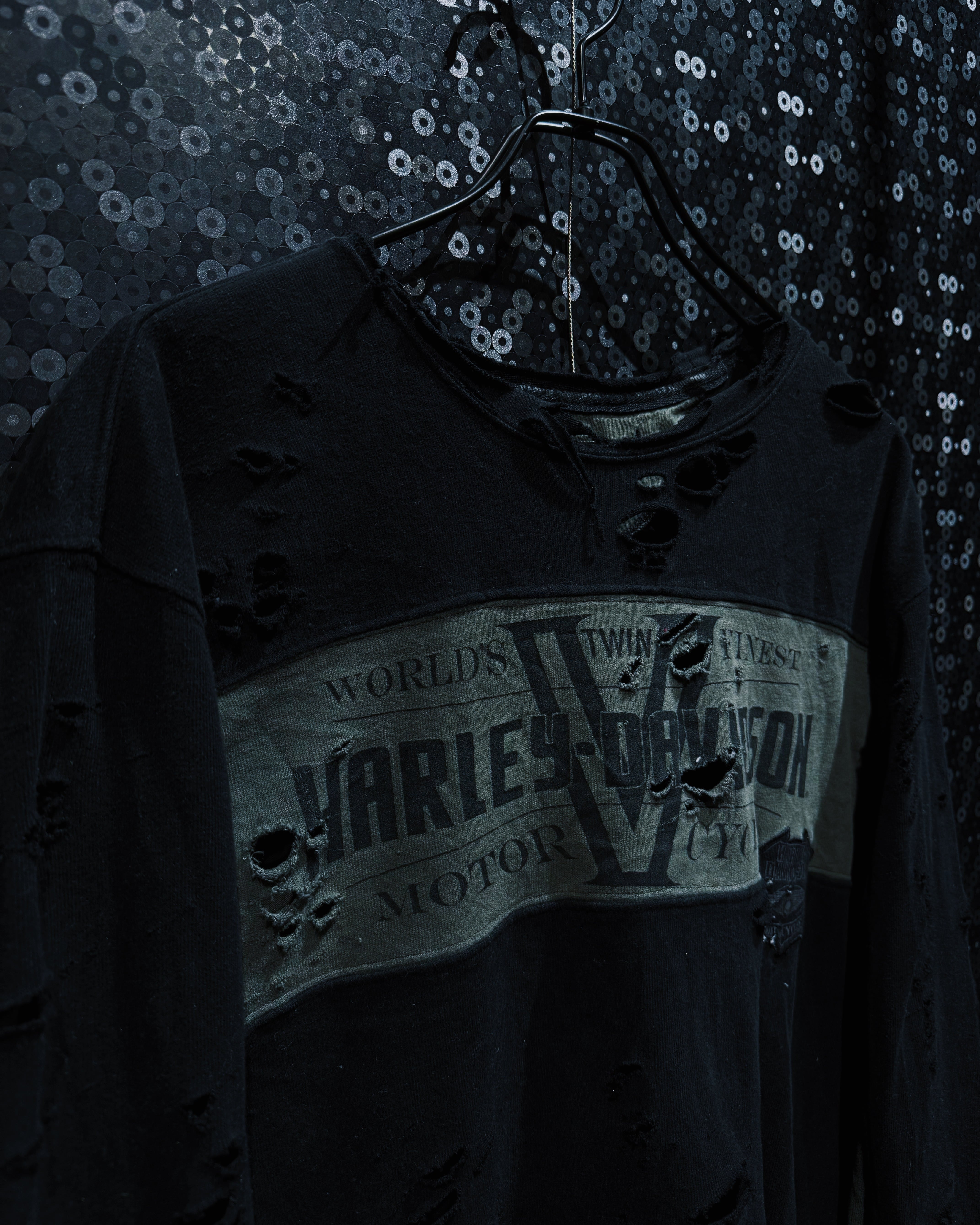 ハーレーダビッドソン特有の武骨なプリントと、重厚なブラックボディ。その両方に激しいダメージを加えることで、モーターカルチャーの野性味とグランジの荒廃美が融合した圧倒的存在感のロングスleeve。胸のグリーンパネル部分にまで破れが侵食しており、プリントの上から歴史を刻むようにダメージが走ることで“完成後にさらに旅を重ねた衣服”という独特なストーリー性を宿す。